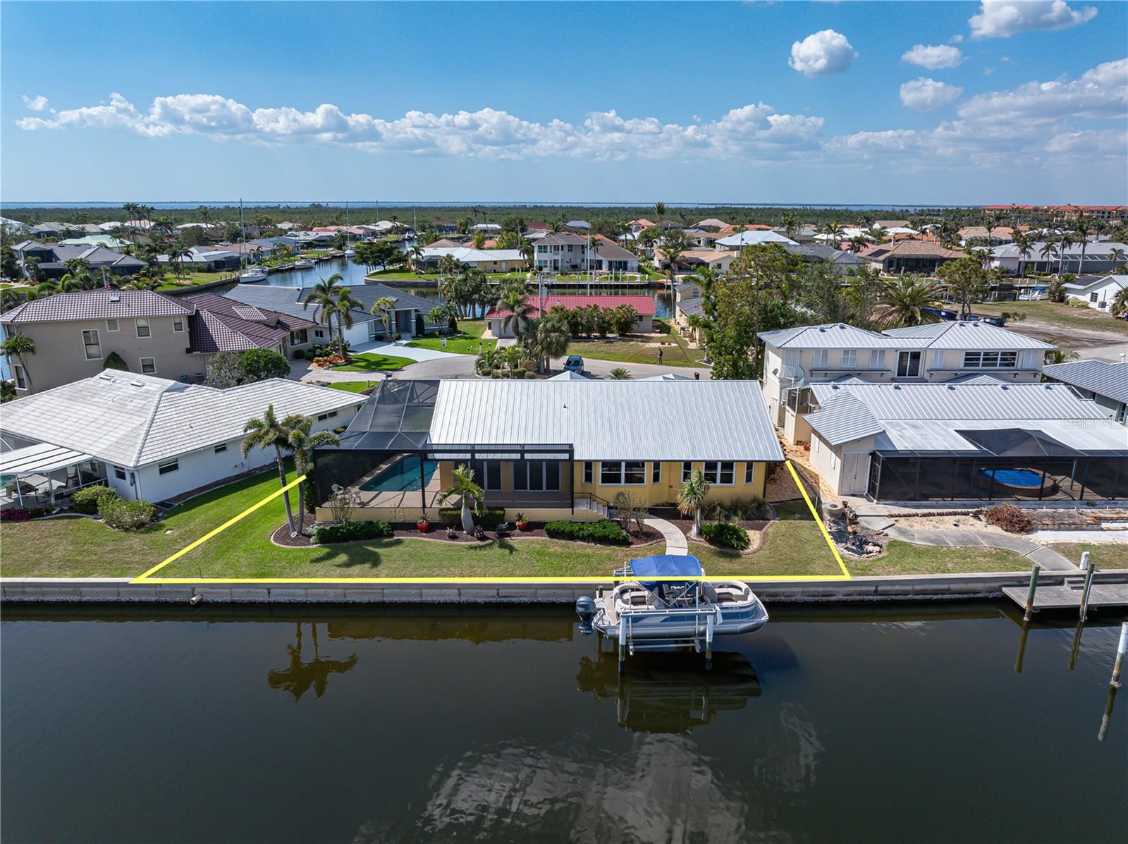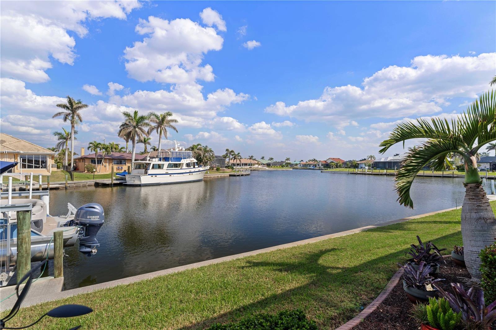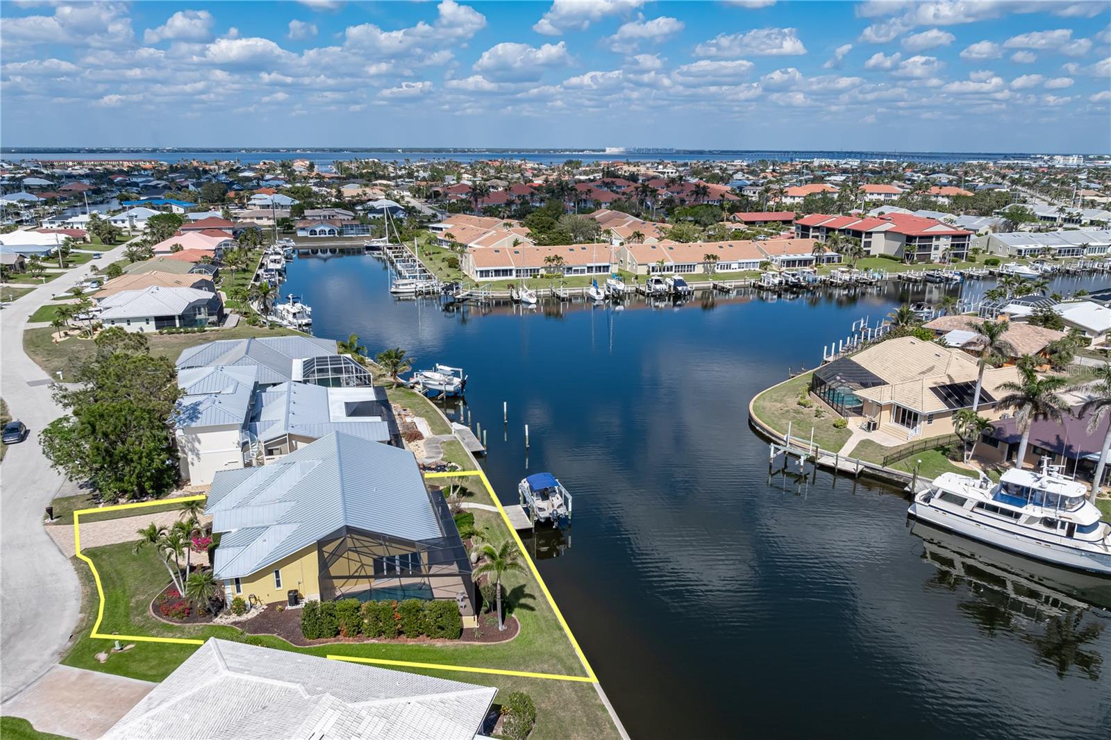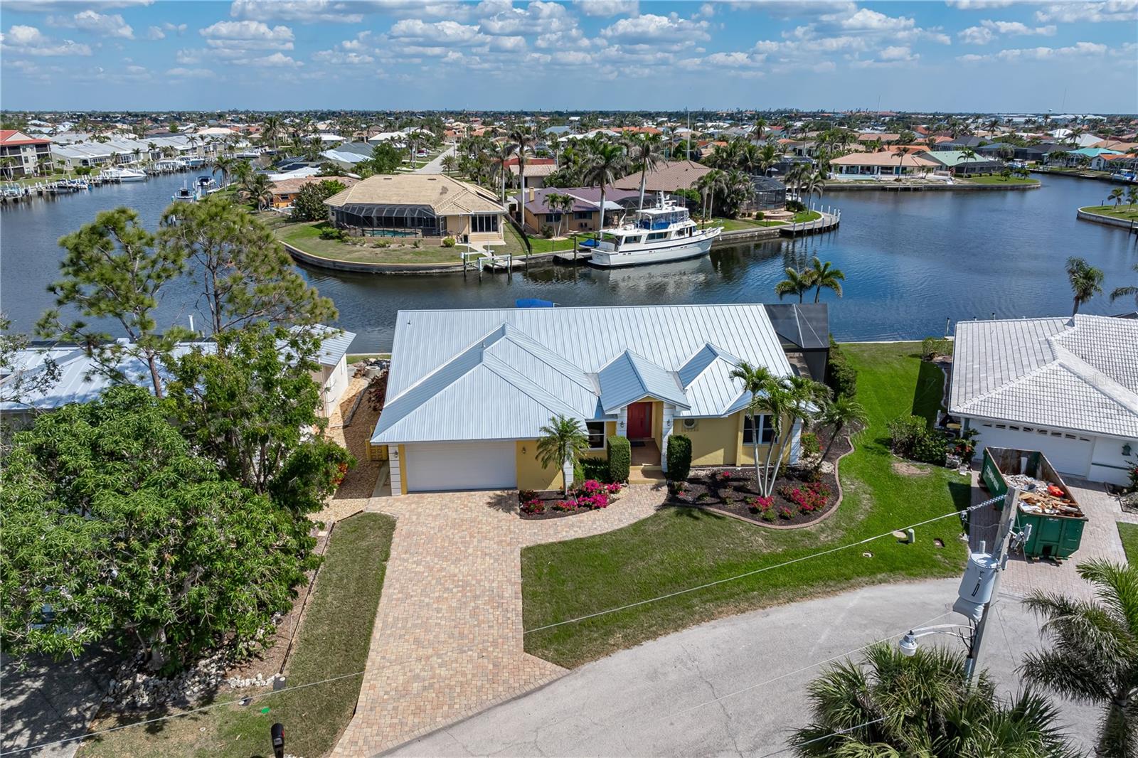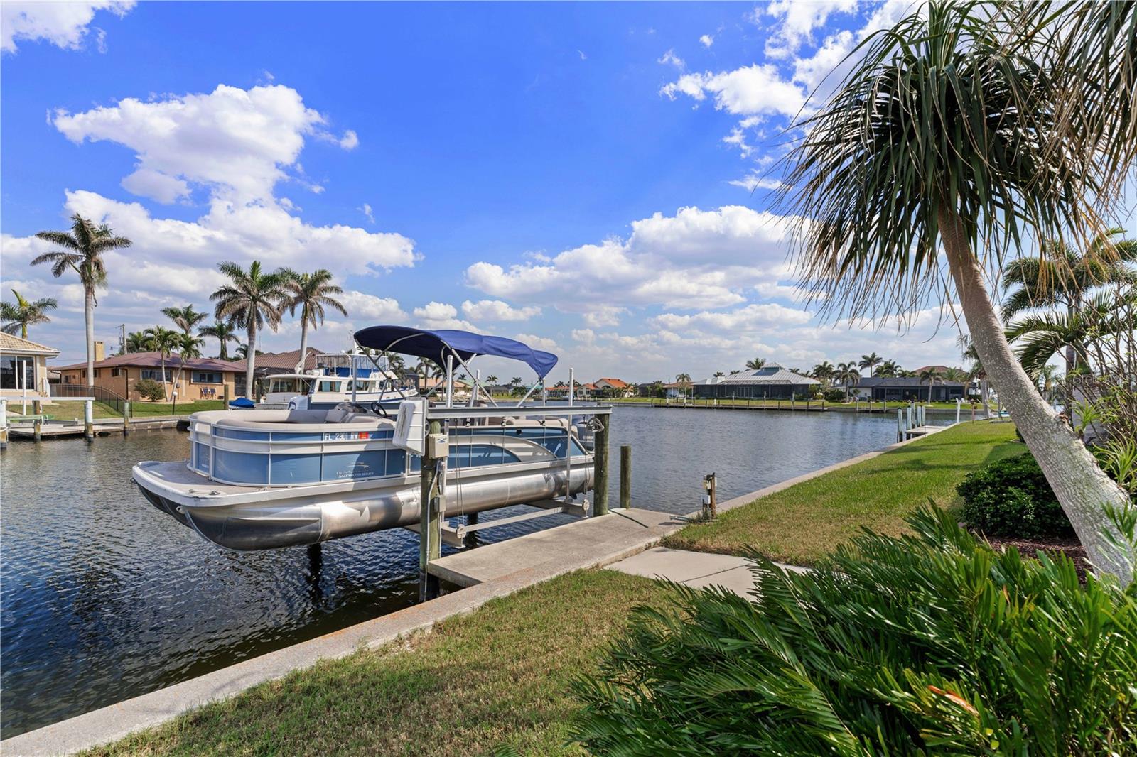 WATERFRONT LIVING IN PGI W/A FABULOUS VIEW! Check out this 3 bed/2 bath, waterfront home in Punta Gorda Isles w/NEW METAL ROOF. Property features 105ft of seawall w/a concrete dock & boat lift plus VERY QUICK SAILBOAT ACCESS to Charlotte Harbor. Enjoy stunning sunrises thanks to the desirable eastern rear exposure of the home. The home has an open floor plan w/a spacious formal dining/living room as well as a separate family room plus a Florida room w/panoramic canal views. At the heart of the home is an updated kitchen w/granite counters, wood cabinetry & NEW stainless steel appliances (2023). The adjacent breakfast area features a built-in desk, additional storage cabinets as well as a full butler's pantry for added storage space. Tons of natural light thanks to walls of sliding glass doors along the back of the home. Architectural details include soaring cathedral ceilings, large windows, tile flooring throughout the main living areas & bathrooms plus luxury vinyl plank floors in the bedrooms. The spacious master suite has an amazing view plus en-suite bath w/oversized walk-in closet. Two large guest rooms share a guest bath - one guest room features a large, walk-in closet. Outside, the lanai has a new, picture-frame pool cage (2023) surrounding the in-ground, heated pool. Pool heater new in 2022. Lounge poolside & enjoy the view from here. A concrete dock w/boat lift is steps from the back door. Water & electric hook-ups including 50amp service is available dockside. Other amenities include whole-house hurricane protection w/impact-resistant doors & windows plus Lexan panels for the accent window in the guest bath, an attached two-car garage & spray-foam attic insulation for added energy-efficiency. Home is located on a quiet cul-de-sac. Punta Gorda is a vibrant waterfront community known for its boating lifestyle, active art & music scene, and top-rated golf courses. Miles of sidewalks connect you to the rest of Punta Gorda Isles, several area parks & even historic downtown Punta Gorda. Take advantage of the active lifestyle awaiting you here: you can walk, bike or kayak to almost anywhere you'd want to go! Take the boat to dinner at nearby Fishermen's Village, Cass Cay at Burnt Store Marina or even the Isles Yacht Club. Claim your spot in paradise & start living your Florida dream here.