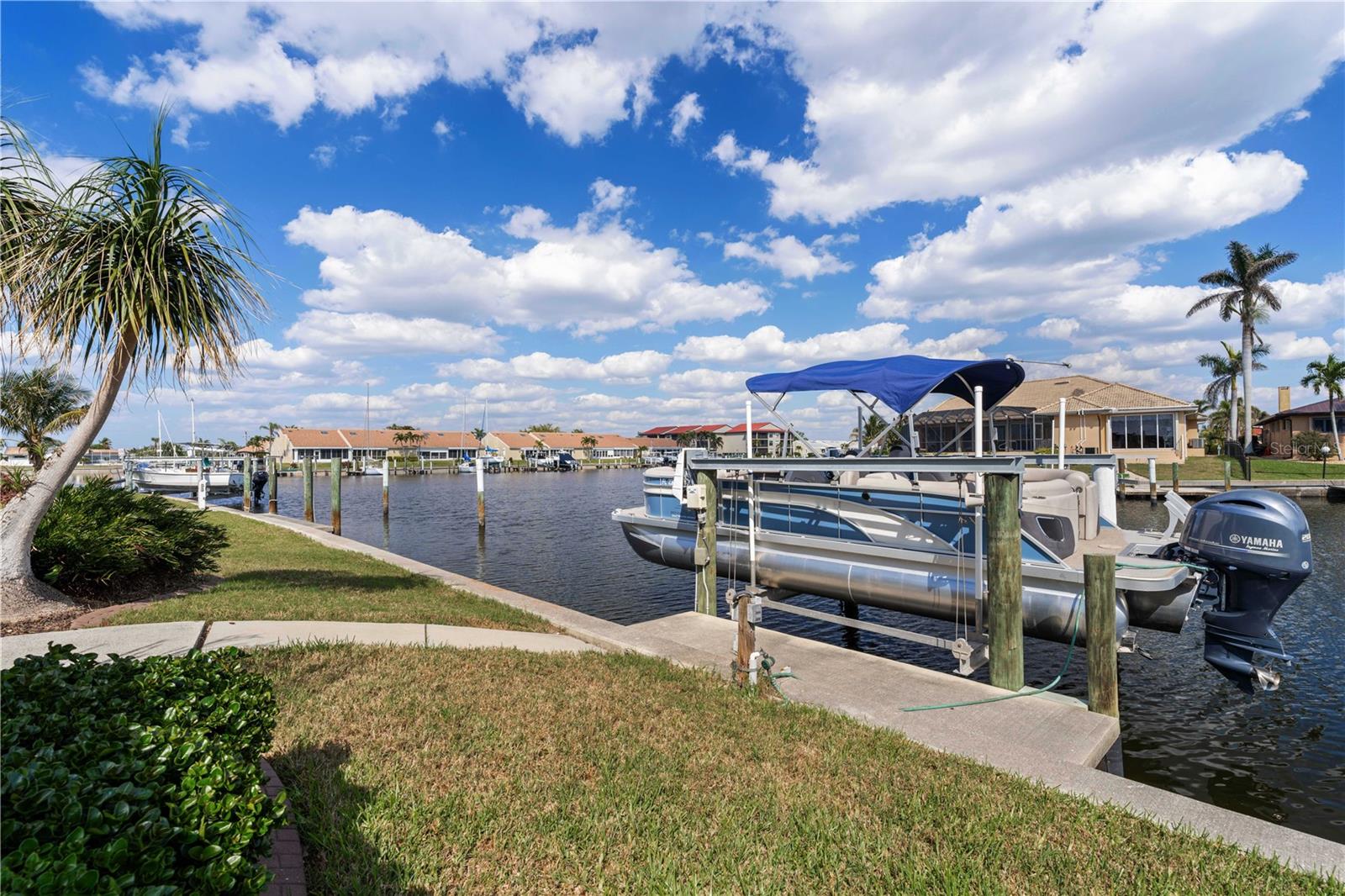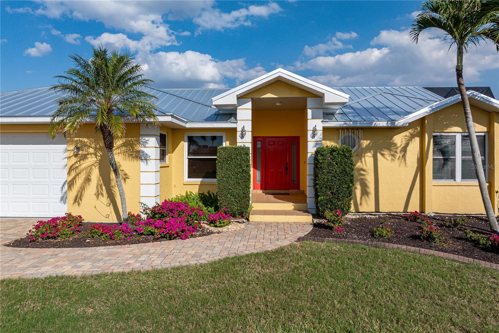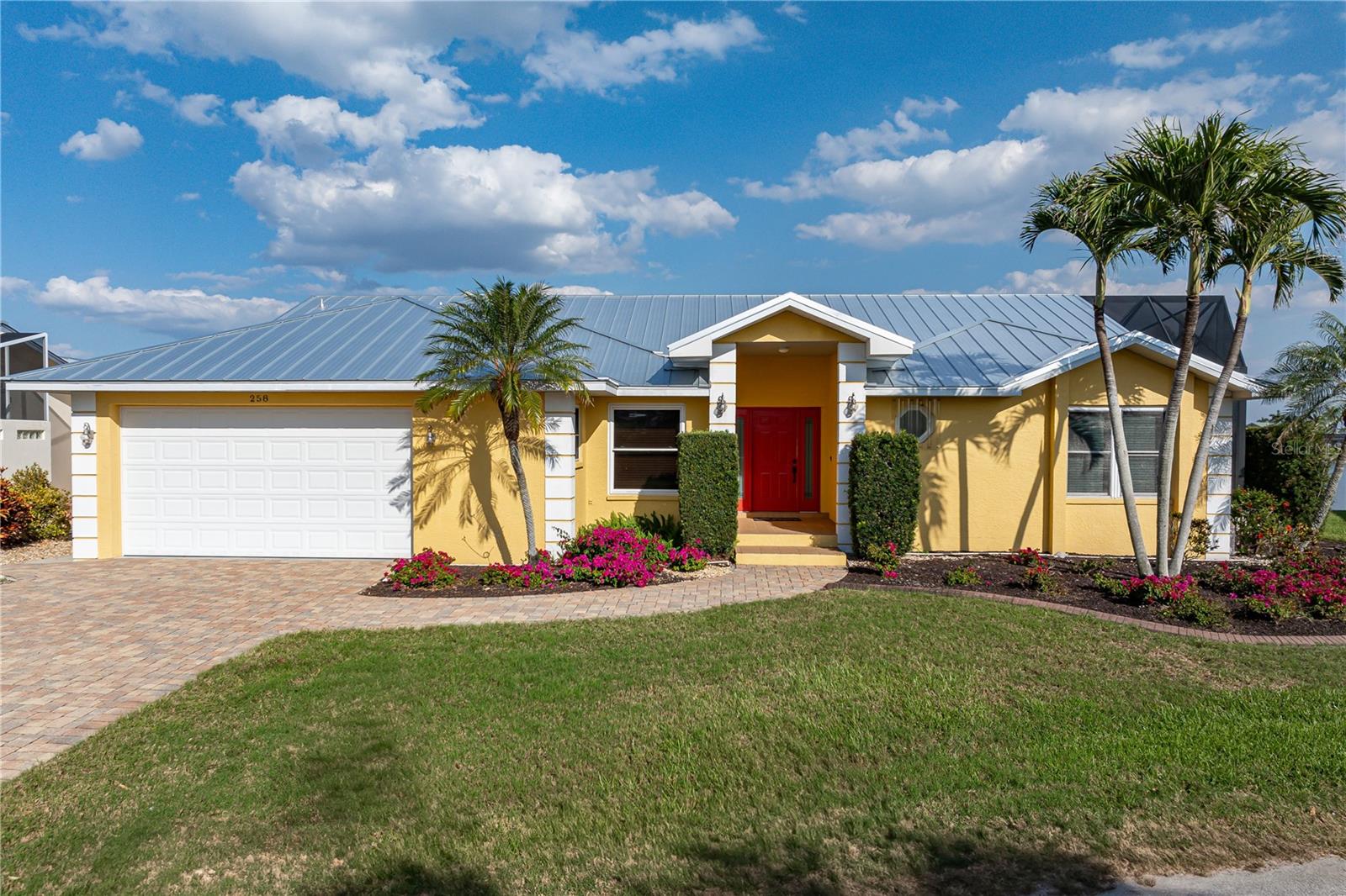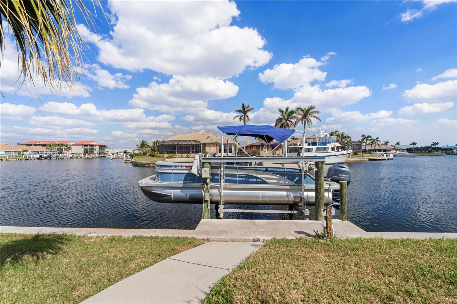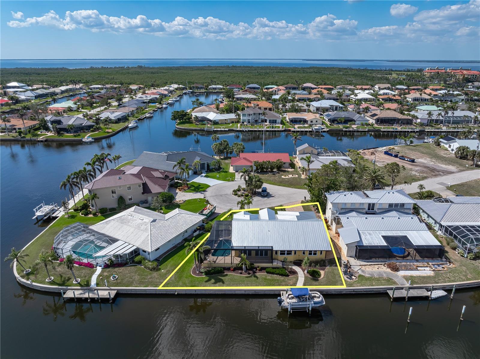 WATERFRONT LIVING IN PGI W/A FABULOUS VIEW! Check out this 3 bed/2 bath, waterfront home in Punta Gorda Isles w/NEW METAL ROOF. Property features 105ft of seawall w/a concrete dock & boat lift plus VERY QUICK SAILBOAT ACCESS to Charlotte Harbor. Enjoy stunning sunrises thanks to the desirable eastern rear exposure of the home. The home has an open floor plan w/a spacious formal dining/living room as well as a separate family room plus a Florida room w/panoramic canal views. At the heart of the home is an updated kitchen w/granite counters, wood cabinetry & NEW stainless steel appliances (2023). The adjacent breakfast area features a built-in desk, additional storage cabinets as well as a full butler's pantry for added storage space. Tons of natural light thanks to walls of sliding glass doors along the back of the home. Architectural details include soaring cathedral ceilings, large windows, tile flooring throughout the main living areas & bathrooms plus luxury vinyl plank floors in the bedrooms. The spacious master suite has an amazing view plus en-suite bath w/oversized walk-in closet. Two large guest rooms share a guest bath - one guest room features a large, walk-in closet. Outside, the lanai has a new, picture-frame pool cage (2023) surrounding the in-ground, heated pool. Pool heater new in 2022. Lounge poolside & enjoy the view from here. A concrete dock w/boat lift is steps from the back door. Water & electric hook-ups including 50amp service is available dockside. Other amenities include whole-house hurricane protection w/impact-resistant doors & windows plus Lexan panels for the accent window in the guest bath, an attached two-car garage & spray-foam attic insulation for added energy-efficiency. Home is located on a quiet cul-de-sac. Punta Gorda is a vibrant waterfront community known for its boating lifestyle, active art & music scene, and top-rated golf courses. Miles of sidewalks connect you to the rest of Punta Gorda Isles, several area parks & even historic downtown Punta Gorda. Take advantage of the active lifestyle awaiting you here: you can walk, bike or kayak to almost anywhere you'd want to go! Take the boat to dinner at nearby Fishermen's Village, Cass Cay at Burnt Store Marina or even the Isles Yacht Club. Claim your spot in paradise & start living your Florida dream here.