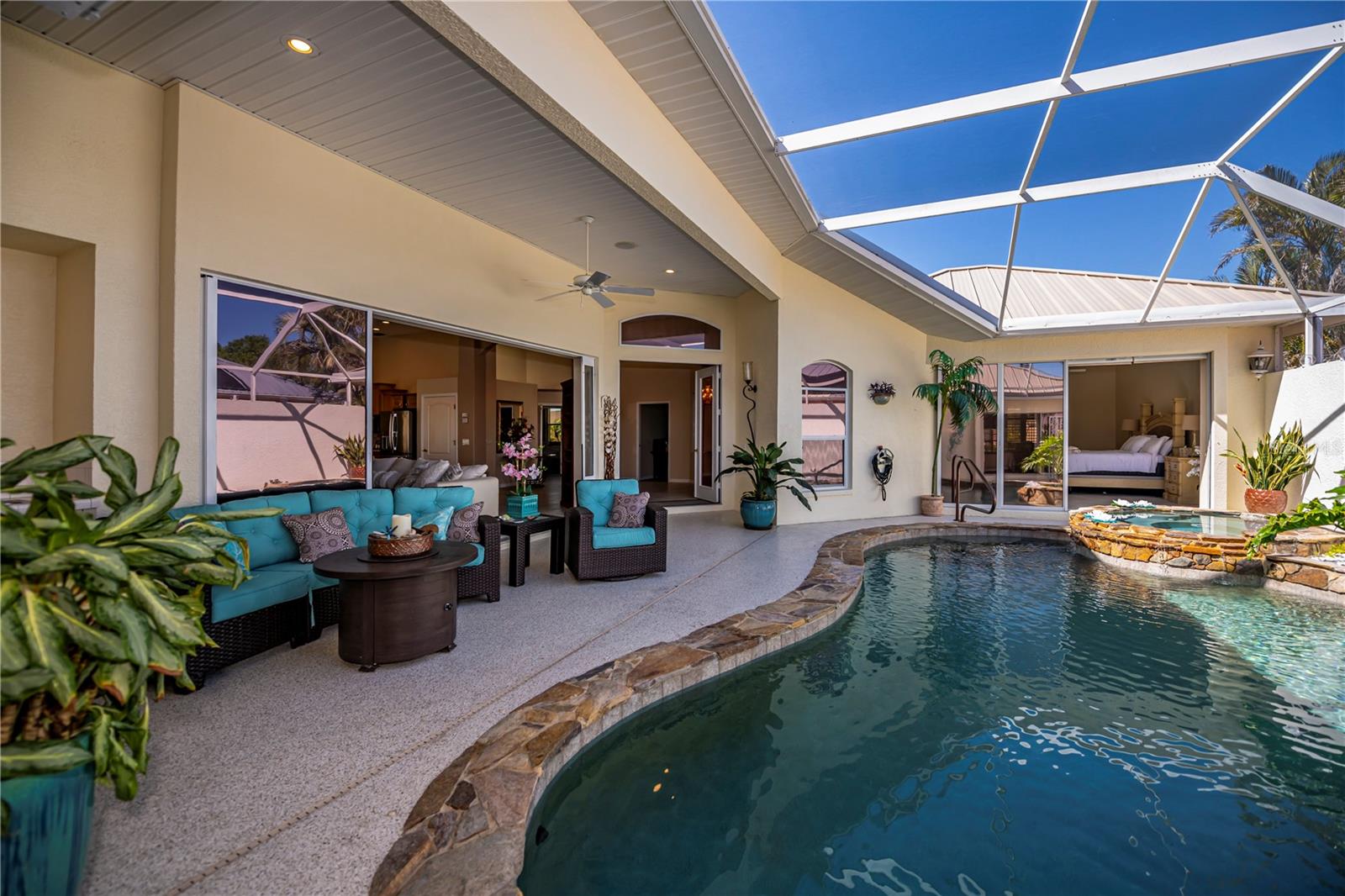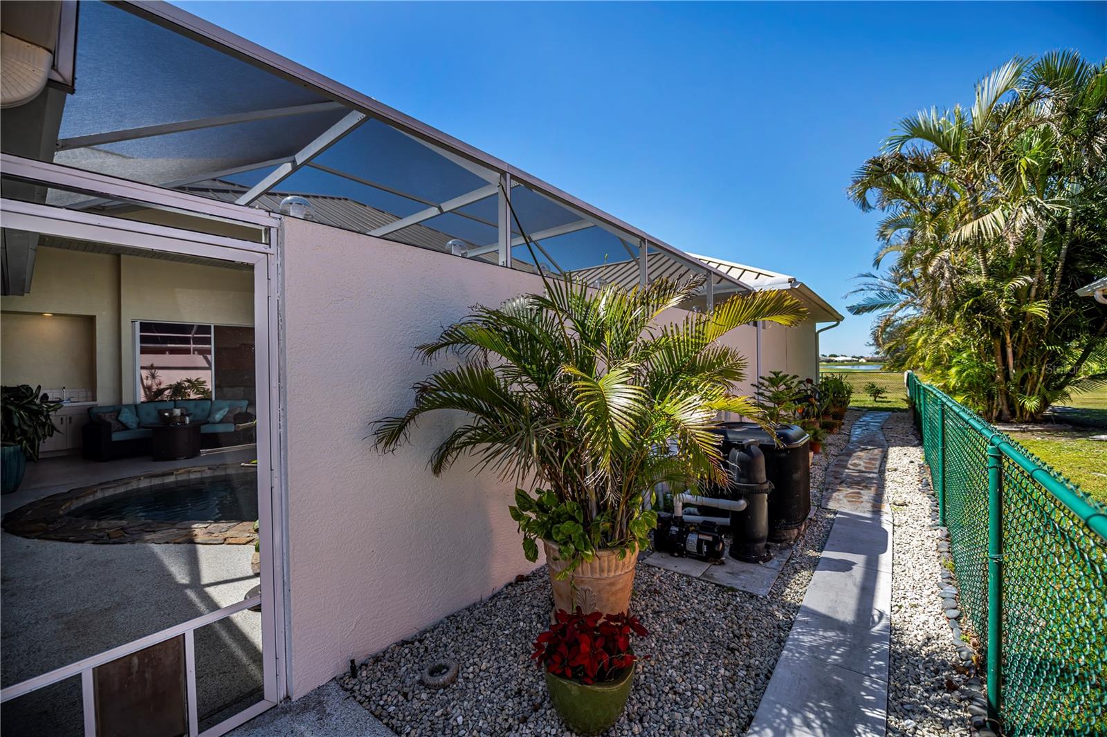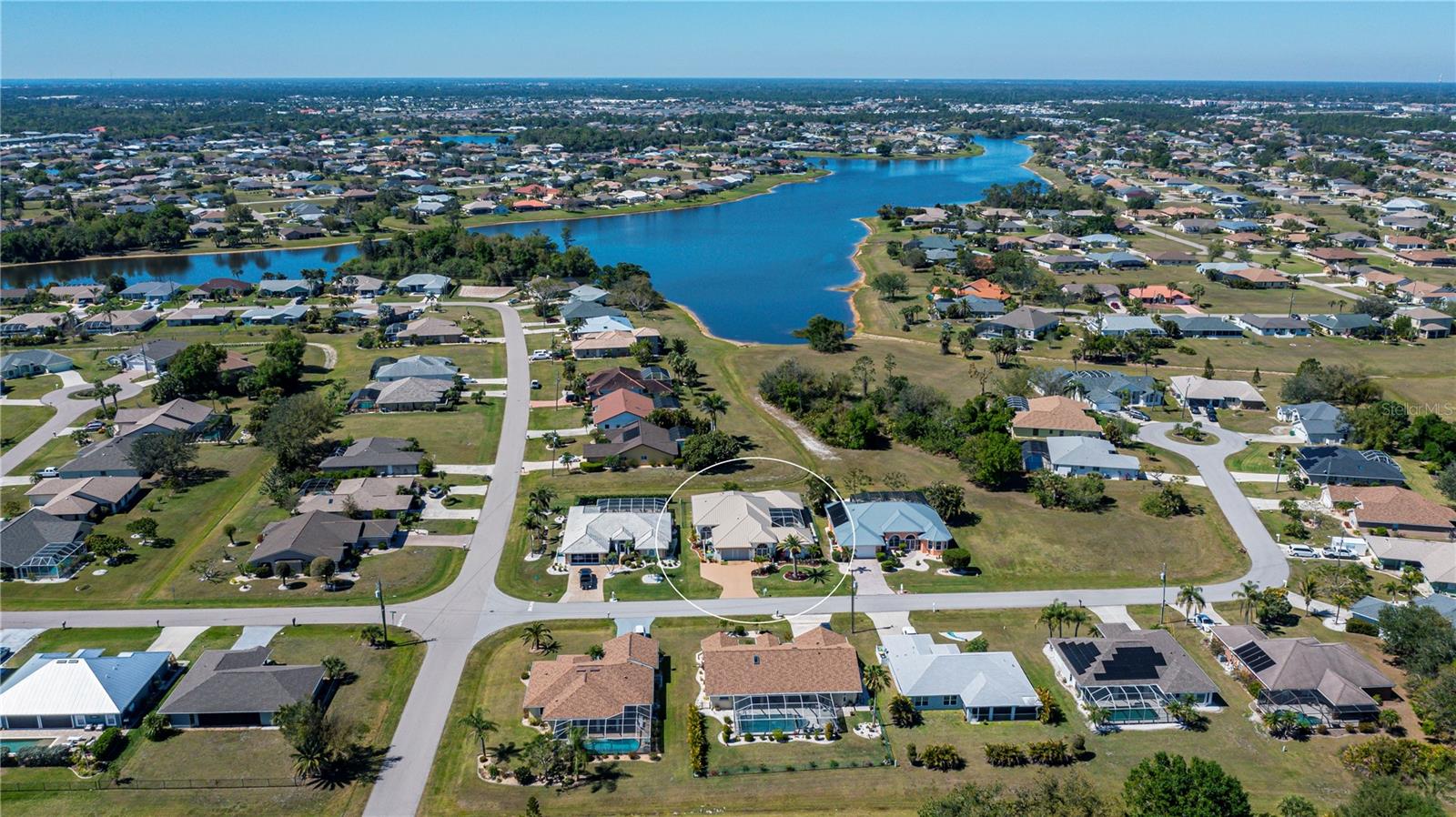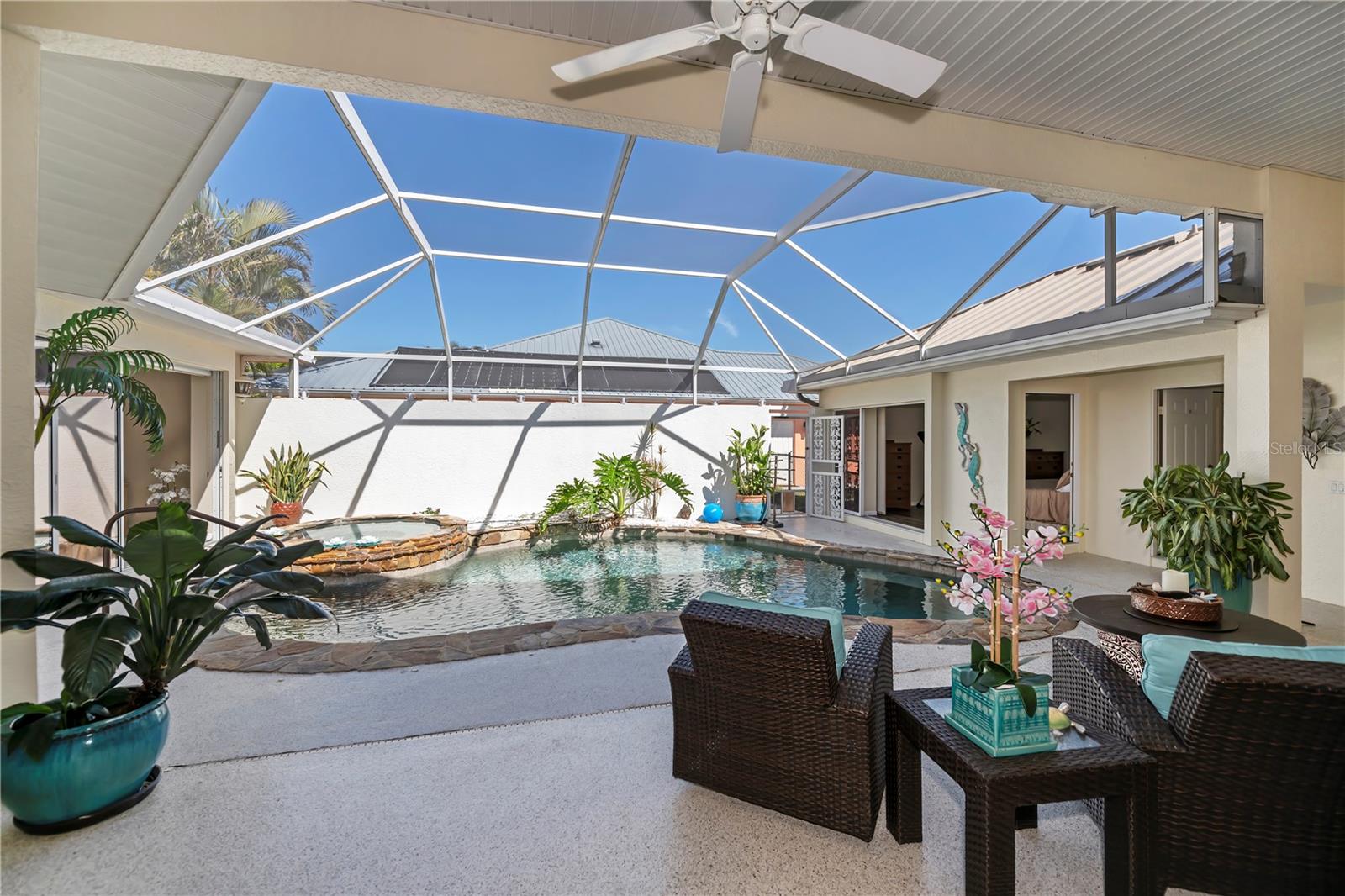 SERENE & PICTURESQUE LAKE with GREENBELT VIEWS, this CUSTOM Fero built 4/3/2 with full office COURTYARD home includes a true resort style Pool/spa and boasts an additional 1/1 stylish CASITA STYLE GUEST HOUSE! Grand curb appeal from its soaring columned entryway, sleek new metal roof, manicured landscaping,rich concrete curbing, and dimensional concrete driveway with extra side pad parking.Made for leisurely entertaining, the spa-like grandeur courtyard from both the casita or estate home delights all your senses instantly. YEAR ROUND enjoyment, the freeform pebble tec pool ( it has rotating ambiance lighting) awaits aside a large slate stone accented jacuzzi, heated perfectly while enjoying steaks on the BAR-B Jenn-Air outside kitchen ,icy cold drinks only inches away under the extensive screened zen patio..simply delightful to leave the doors wide open on either home! Double door entryway leads into this home's formal circular 12+ ft ceiling foyer, with abundant naturally lit skylight showcases the rounded corners and angular plant shelves. Leading the way gracefully from double doors to two choice guest suites and a wonderful shared bath is a spacious office.The office includes built in storage and octagon glass to foyer. All rooms are nicely appointed, with deep PANORAMIC lake/ wooded greenbelt views, high ceilings, large closets, easy care plantation shutters. The tranquil master suite is a haven of zen, spacious and sliders to the SPA/Pool and courtyard allow the comfortable enjoyments both night or day or linger lavishly soaking in the serene view of Lake Zappa. Large walk in closet and rich ensuite bath gives endless pampering opportunities in your jetted tub under the stars, so much to enjoy.This open plan features a sensational family room with double crowned coffered ceiling and seamlessly connects to the Courtyard as sets of sliders easily brings the outside in.The kitchen is a chefs delight, CORIAN COUNTERTOPS, tall kitchen cabinets including a full pantry, tile backsplash, stainless appliances, breakfast bar and separate dining are crowned with corner sunburst windows. Inside laundry, whole house surge protector, tinted windows, Hunter Douglas shades, freshly painted inside and out, sono music system, fenced yard, reverse osmosis, UV light Hepa ac system, new pool pumps, accordion hurricane shutters, and a FULL 1/1 mother- in -law suite/CASITA presents ENDLESS OPPORTUNITIES FOR INCOME, convenience and peace of mind! On a quiet cul-de-sac-road in desirable deed restricted community with low yearly HOA of Deep Creek …NOT IN A FLOOD ZONE, opportunity knocks! Embrace the Florida lifestyle and experience this exceptional residence close to dining, beaches, PG airport. Take the next step towards making this incredible property yours by scheduling a viewing today.