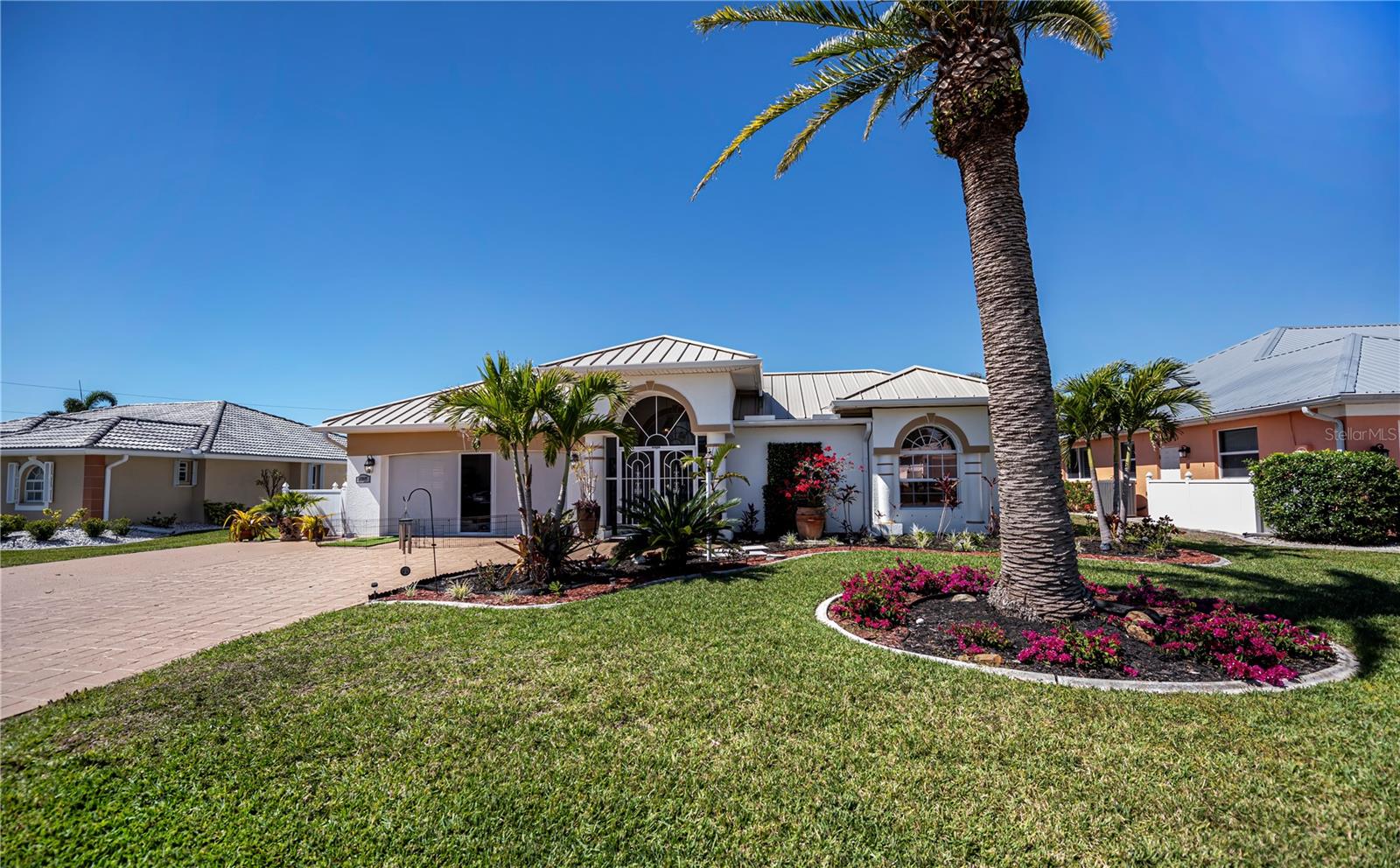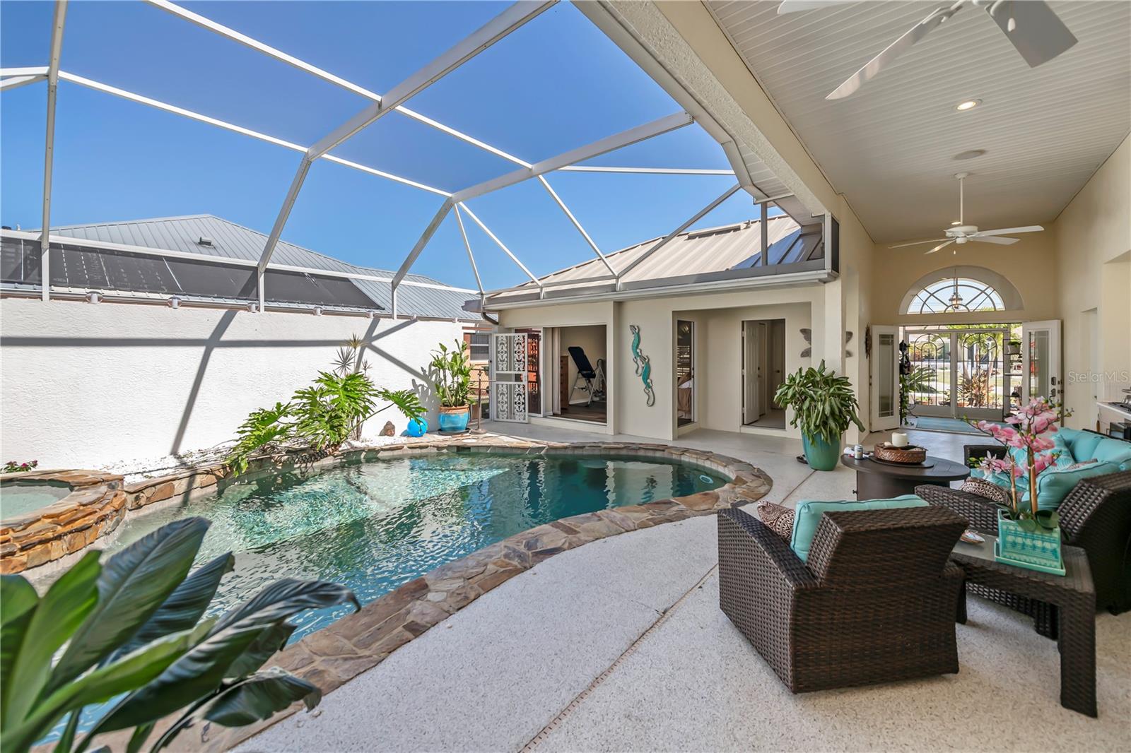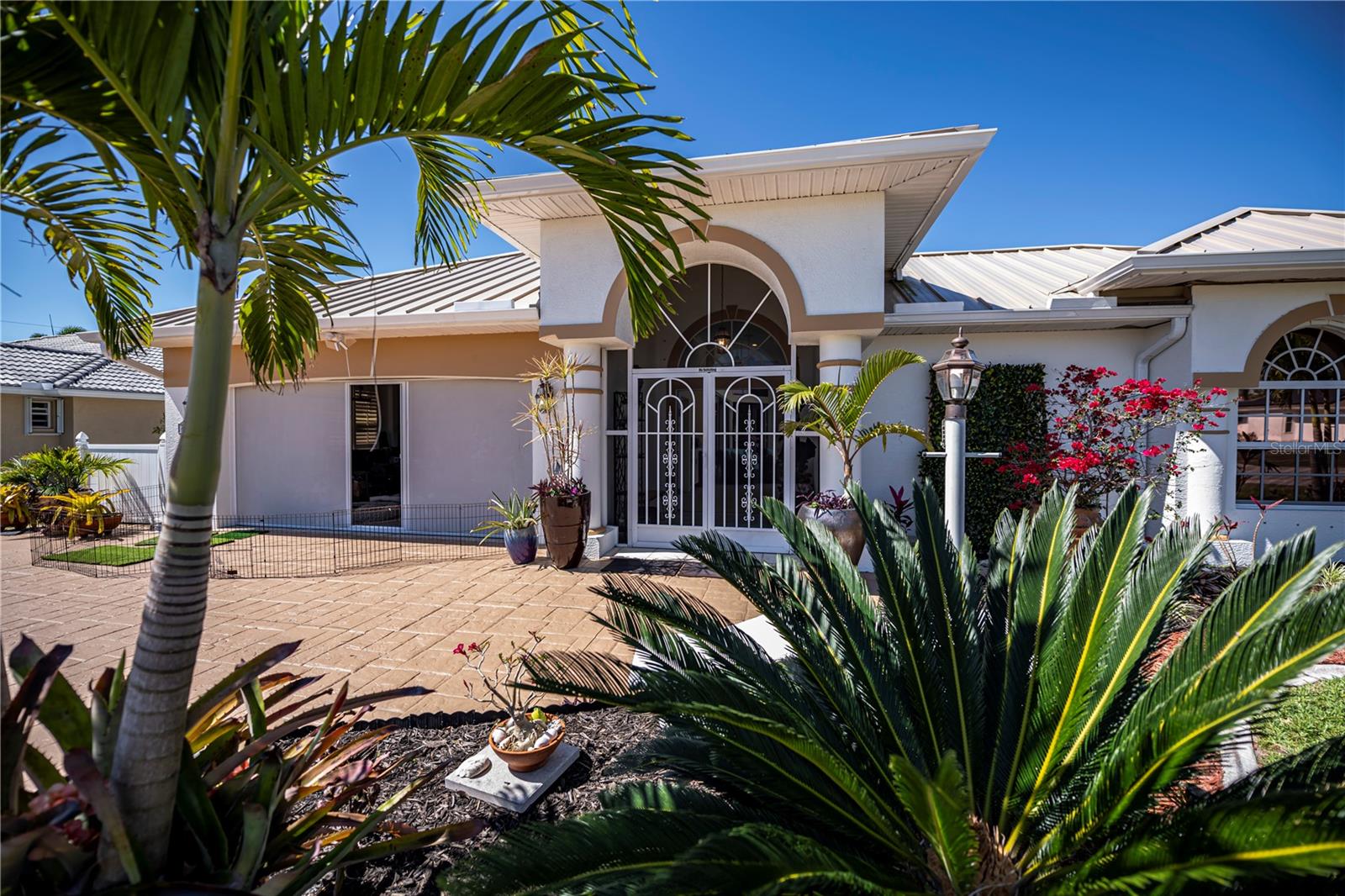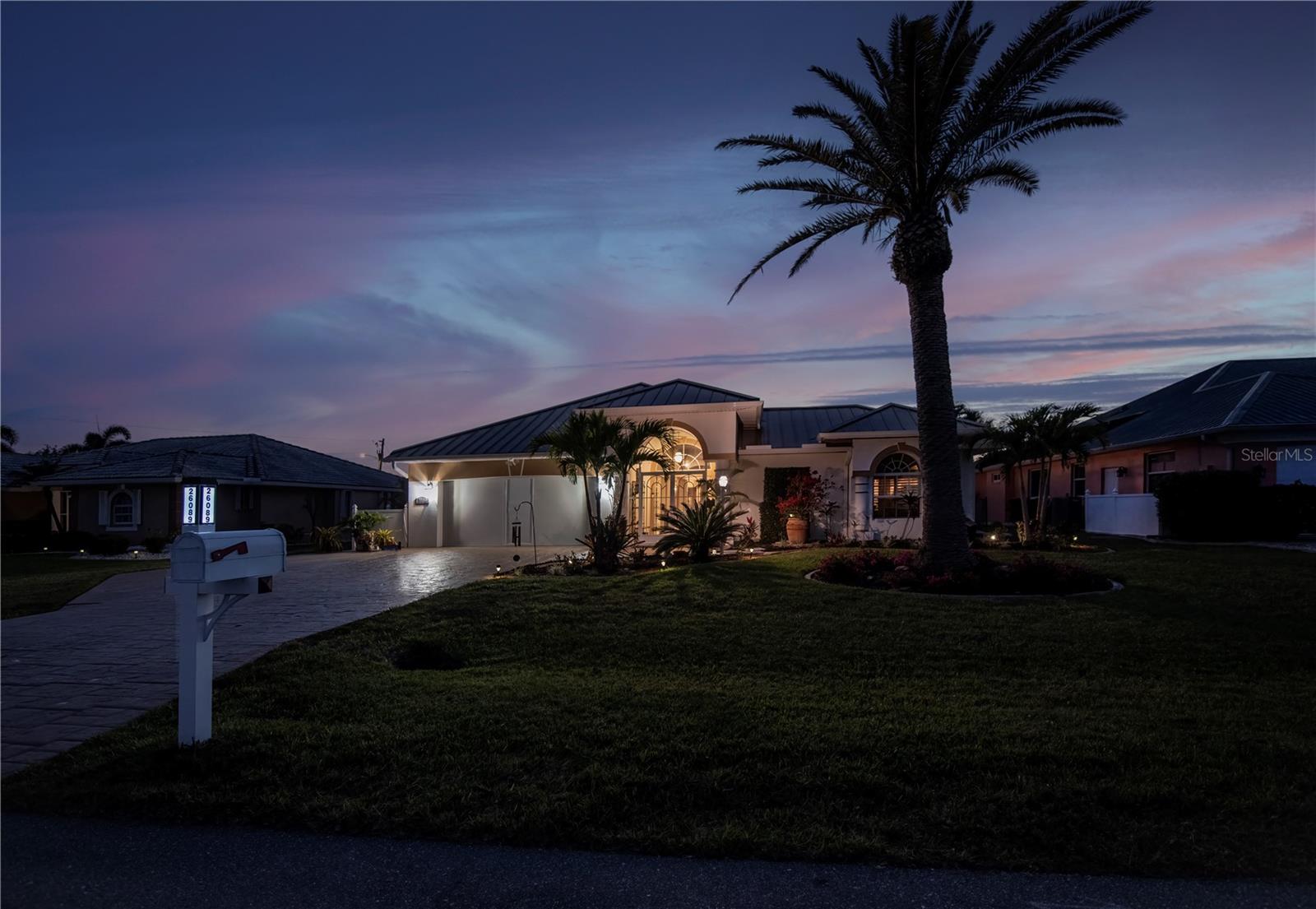 SERENE & PICTURESQUE LAKE with GREENBELT VIEWS, this CUSTOM Fero built 4/3/2 with full office COURTYARD home includes a true resort style Pool/spa and boasts an additional 1/1 stylish CASITA STYLE GUEST HOUSE! Grand curb appeal from its soaring columned entryway, sleek new metal roof, manicured landscaping,rich concrete curbing, and dimensional concrete driveway with extra side pad parking.Made for leisurely entertaining, the spa-like grandeur courtyard from both the casita or estate home delights all your senses instantly. YEAR ROUND enjoyment, the freeform pebble tec pool ( it has rotating ambiance lighting) awaits aside a large slate stone accented jacuzzi, heated perfectly while enjoying steaks on the BAR-B Jenn-Air outside kitchen ,icy cold drinks only inches away under the extensive screened zen patio..simply delightful to leave the doors wide open on either home! Double door entryway leads into this home's formal circular 12+ ft ceiling foyer, with abundant naturally lit skylight showcases the rounded corners and angular plant shelves. Leading the way gracefully from double doors to two choice guest suites and a wonderful shared bath is a spacious office.The office includes built in storage and octagon glass to foyer. All rooms are nicely appointed, with deep PANORAMIC lake/ wooded greenbelt views, high ceilings, large closets, easy care plantation shutters. The tranquil master suite is a haven of zen, spacious and sliders to the SPA/Pool and courtyard allow the comfortable enjoyments both night or day or linger lavishly soaking in the serene view of Lake Zappa. Large walk in closet and rich ensuite bath gives endless pampering opportunities in your jetted tub under the stars, so much to enjoy.This open plan features a sensational family room with double crowned coffered ceiling and seamlessly connects to the Courtyard as sets of sliders easily brings the outside in.The kitchen is a chefs delight, CORIAN COUNTERTOPS, tall kitchen cabinets including a full pantry, tile backsplash, stainless appliances, breakfast bar and separate dining are crowned with corner sunburst windows. Inside laundry, whole house surge protector, tinted windows, Hunter Douglas shades, freshly painted inside and out, sono music system, fenced yard, reverse osmosis, UV light Hepa ac system, new pool pumps, accordion hurricane shutters, and a FULL 1/1 mother- in -law suite/CASITA presents ENDLESS OPPORTUNITIES FOR INCOME, convenience and peace of mind! On a quiet cul-de-sac-road in desirable deed restricted community with low yearly HOA of Deep Creek …NOT IN A FLOOD ZONE, opportunity knocks! Embrace the Florida lifestyle and experience this exceptional residence close to dining, beaches, PG airport. Take the next step towards making this incredible property yours by scheduling a viewing today.