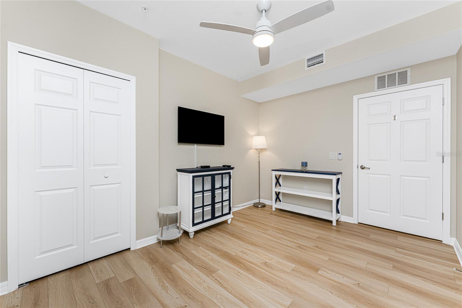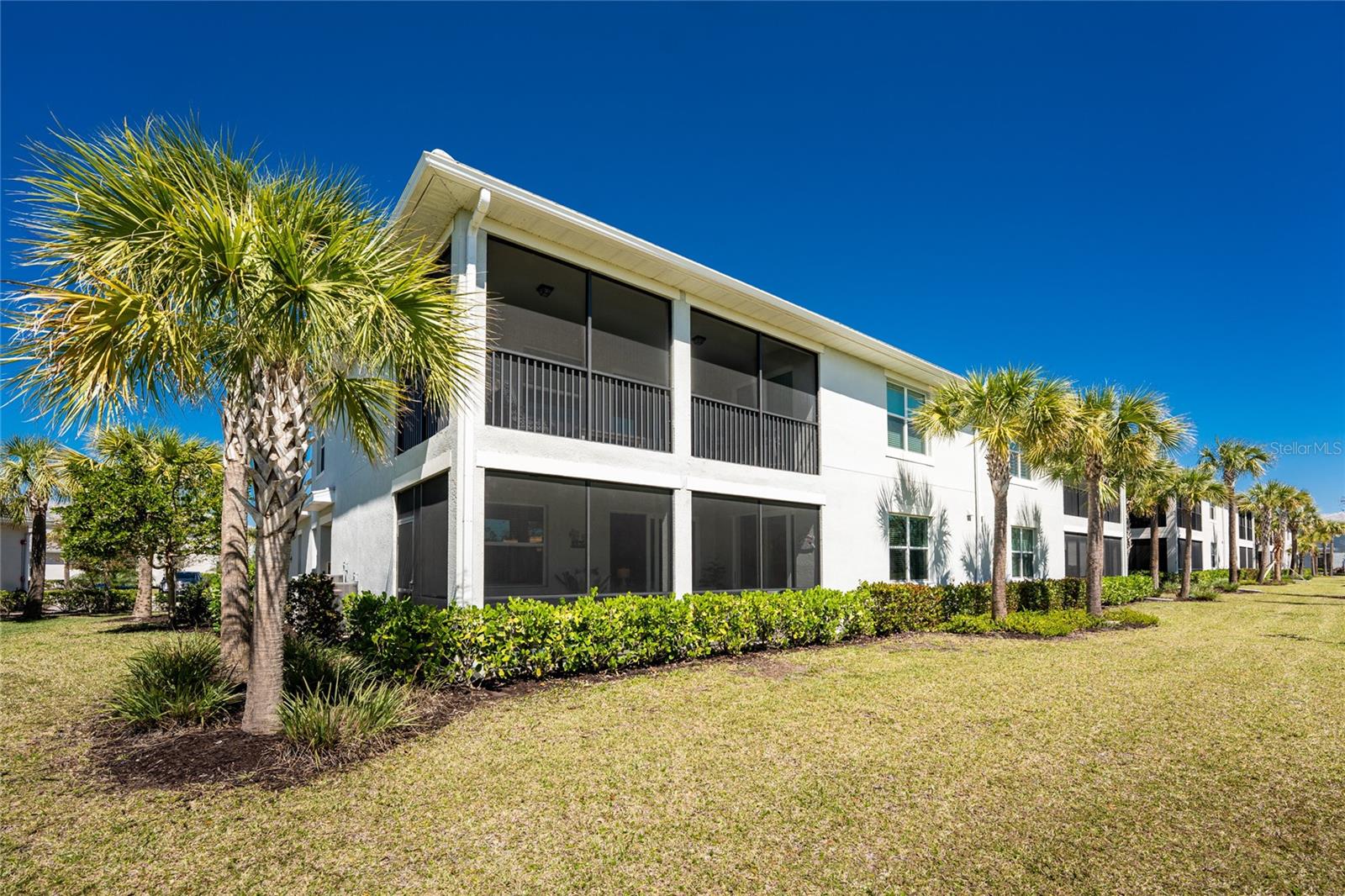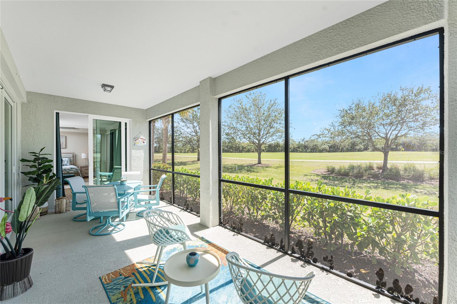 Move right in and begin living the resort lifestyle including GOLF MEMBERSHIP that you’ve been dreaming of in this first floor coach home! Nestled on fairway number five within the gated resort community of Heritage Landing Golf and Country Club, this TURNKEY coach home exudes sophistication and comfort! As you enter, you are greeted by a spacious interior that reflects the essence of Florida living. Diamond set tile and soothing custom paint tones run throughout this open floor plan, and creates a seamless flow from room to room. Brand new Luxury vinyl flooring has been added to all of the bedrooms blending perfectly with the tile. The sliding glass impact doors and windows perfectly showcase the stunning views and the golf course and preserve beyond. One of the highlights of this home is the expansive kitchen, a culinary haven for any enthusiast. Adorned with crisp shaker style cabinets granite countertops, stainless steel appliances, a generously sized flush-level island, and handsome accent lighting - it is impressive in both form and function. The spacious owner’s suite boasts sliding doors to the screened lanai with custom window treatments, dual walk-in closets, and a bath with split vanities and large tiled shower. Two cheerful guest rooms are finished with decorative fans and are ready to comfortably accommodate overnight guests, where a pocket door closes off the guest wing, creating a private oasis for friends and family. The attached two car garage gives owners the convenience of living in a single family home, with none of the maintenance! A stroll down the street will take you to the Heritage Landing amenity area which boasts a state-of-the-art fitness center, fitness classes, a resort-style pool with tiki bar and the newly opened Clubhouse restaurant - truly an environment that encourages an active and healthy lifestyle. Additionally, the full-service spa, tennis courts, pickleball facilities, and bocce courts add to the array of options. Move-in and start enjoying the luxurious lifestyle that Heritage Landing has to offer, where every detail has been thoughtfully curated to elevate your living experience.