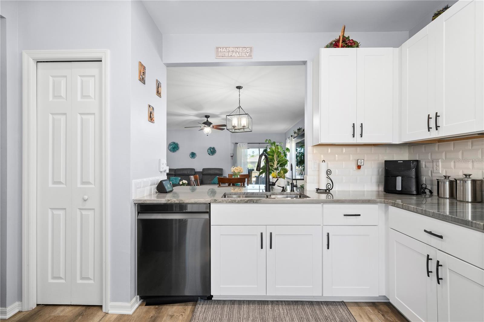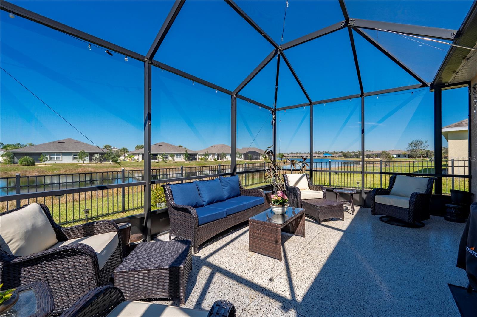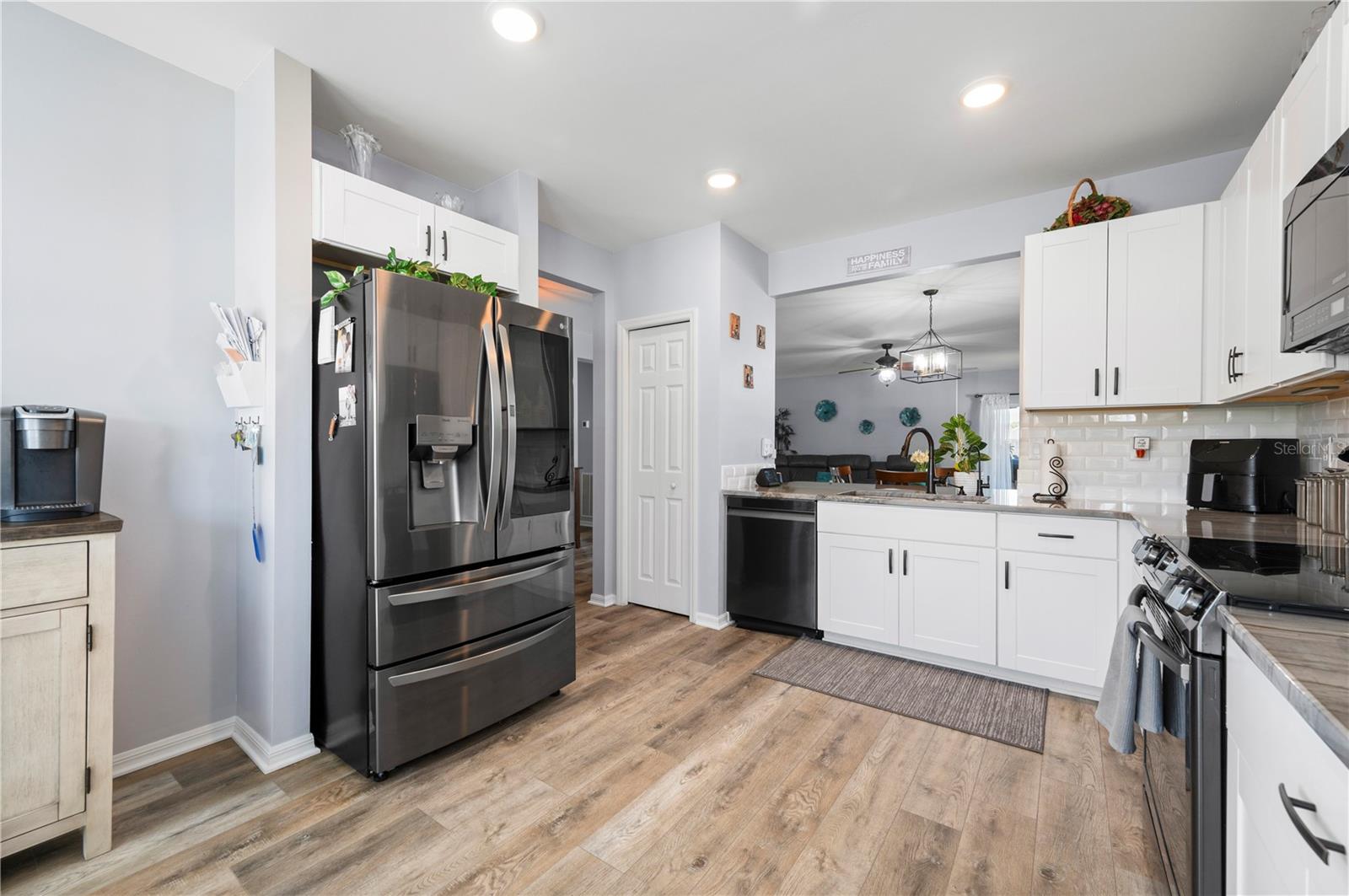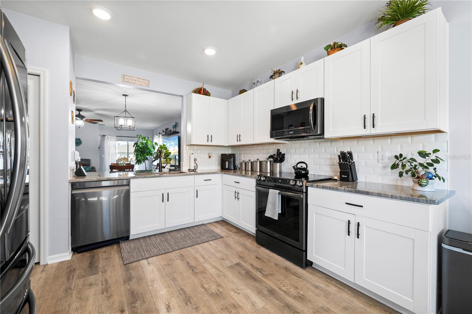 STUNNING LAKEFRONT HOME in WATERFORD ESTATES! Welcome to this beautifully updated 3-bedroom, 2-bathroom home in the highly sought-after gated community of Waterford Estates. This home offers a spacious and open split-floor plan, featuring luxury vinyl flooring and fresh carpet. The great room is filled with natural light and opens to an extended lanai with epoxy-finished floors, screening, and serene lake views—perfect for relaxing or entertaining. Enjoy 78 FEET of lake frontage and the convenience of a spacious fenced-in yard! The kitchen is a chef’s dream, boasting quartzite countertops, Samsung stainless steel appliances, a water softener, a reverse osmosis tank, a touchless faucet, and ample cabinet space. An eat-in dining area with bay windows overlooks the front yard, creating an inviting space for meals. The primary suite offers a true retreat boasting an en-suite bath featuring dual sinks, walk-in closet with built-in shelving, a linen closet, and a walk-in shower. Two additional guest bedrooms provide comfortable accommodations for family and visitors. The laundry room is thoughtfully designed with barn doors, built-in shelving, and LG appliances. Step outside to your fenced backyard oasis, where you can enjoy peaceful water views from your generous 14x20 sized lanai. Additional upgrades include a re-roof in 2022, gutters, and a screened front entry. Living in Waterford Estates means access to resort-style amenities, including two heated community pools, pickleball and bocce ball courts, and a clubhouse with a fitness center, billiards, and a card room. Ideally located near I-75 and Punta Gorda Airport, this home is minutes from historic downtown Punta Gorda, offering easy access to shopping, dining, entertainment, and scenic walking/biking paths. Don't miss your chance to own this exceptional lakefront home in one of Punta Gorda’s premier communities. Schedule your private showing today!