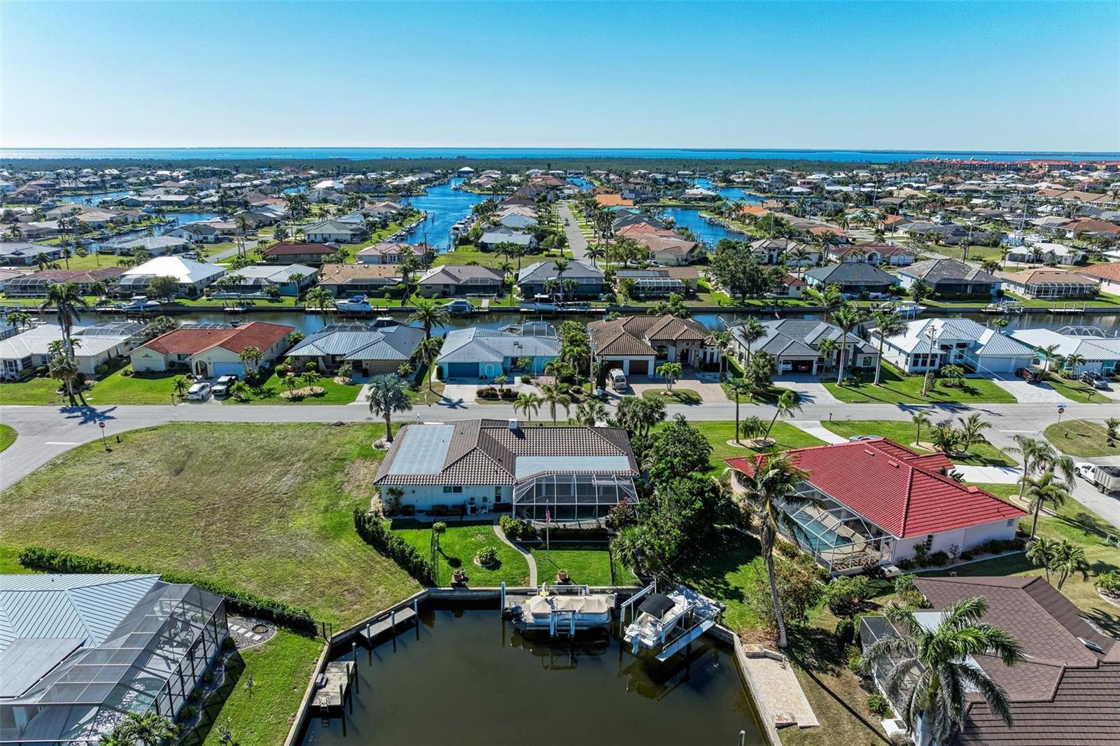 Welcome to Your Dream Waterfront Retreat in Punta Gorda Isles! This stunning home offers two spacious bedrooms and two bathrooms, encompassing over 2,300 square feet of thoughtfully designed living space. Perfect for enthusiasts, the impressive 51 x 16-foot ATTACHED RV GARAGE and additional 2-car garage have been recently renovated with NEW HURRICANE RATED GARAGE DOORS, FRESH PAINT, AND SLEEK EPOXY FLOORING, providing ample space for your RV or classic car collection. The main garage gives you two more spaces and has NEW GARAGE DOOR and epoxy flooring covering another 440 sqft. This meticulously maintained home features HURRICANE IMPACT WINDOWS, NEW ROOF, TWO-ZONE AIR CONDITIONING SYSTEMS INSTALLED IN 2021, a RESURFACED POOL, and all NEW KITCHEN APPLIANCES. The FRESHLY PAINTED EXTERIOR makes a striking first impression and beautifully complements the surrounding landscape. Inside, you’re greeted by an abundance of natural light in the great room, featuring soaring cathedral ceilings, gorgeous large diagonal porcelain tiles, and a cozy fireplace—ideal for gatherings and relaxation. The primary suite is a calming retreat, accessed through charming French doors. This tranquil oasis offers 270 square feet of comfort, a spacious walk-in closet with built-ins, and a beautiful bathroom complete with dual sinks, a Jacuzzi tub, and a PRIVATE OUTDOOR SHOWER. The gourmet kitchen is a focal point of the home, showcasing elegant wood cabinets adorned with crown molding, stunning new quartz countertops, and HIGH-END STAINLESS-STEEL APPLIANCES, including a range hood and pot filler over the induction cooktop. Enjoy seamless indoor-outdoor living as the family room opens to a screened lanai and a HEATED SALTWATER POOL, perfect for soaking in the breathtaking canal views. With 60 feet of water frontage, a solid seawall, and a 30 x 7-foot dock equipped with a 6,000-pound BOAT LIFT, you’ll have quick and easy access to the open waters of Charlotte Harbor. Convenience is key with an indoor laundry room equipped with a utility sink, and a spacious two-car garage providing plenty of room for vehicles and storage, all accessible via a charming circular driveway. Additionally, there’s a versatile room that can serve as an office or overflow guest accommodation when needed. Don’t miss your chance to make this exquisite property your own!