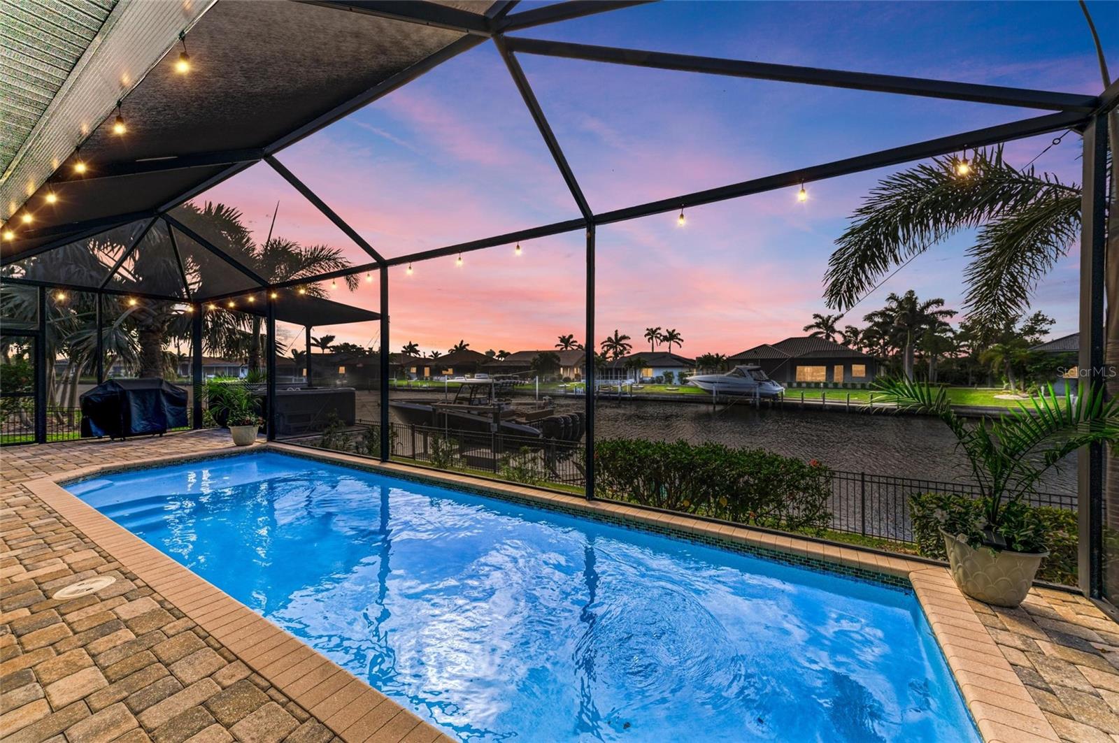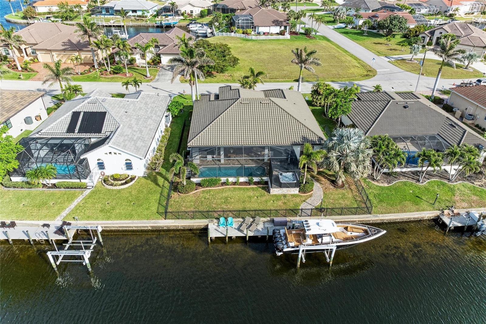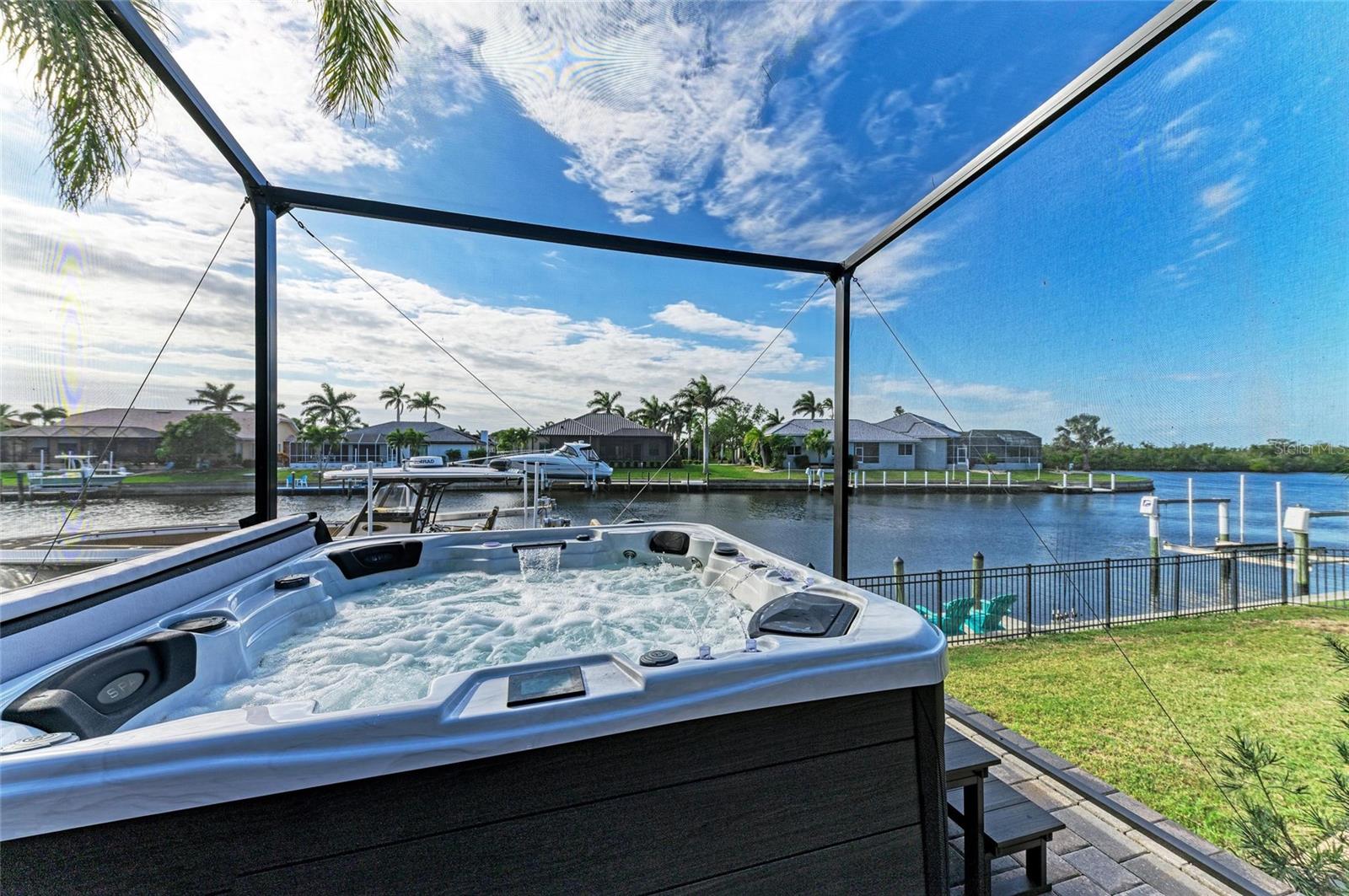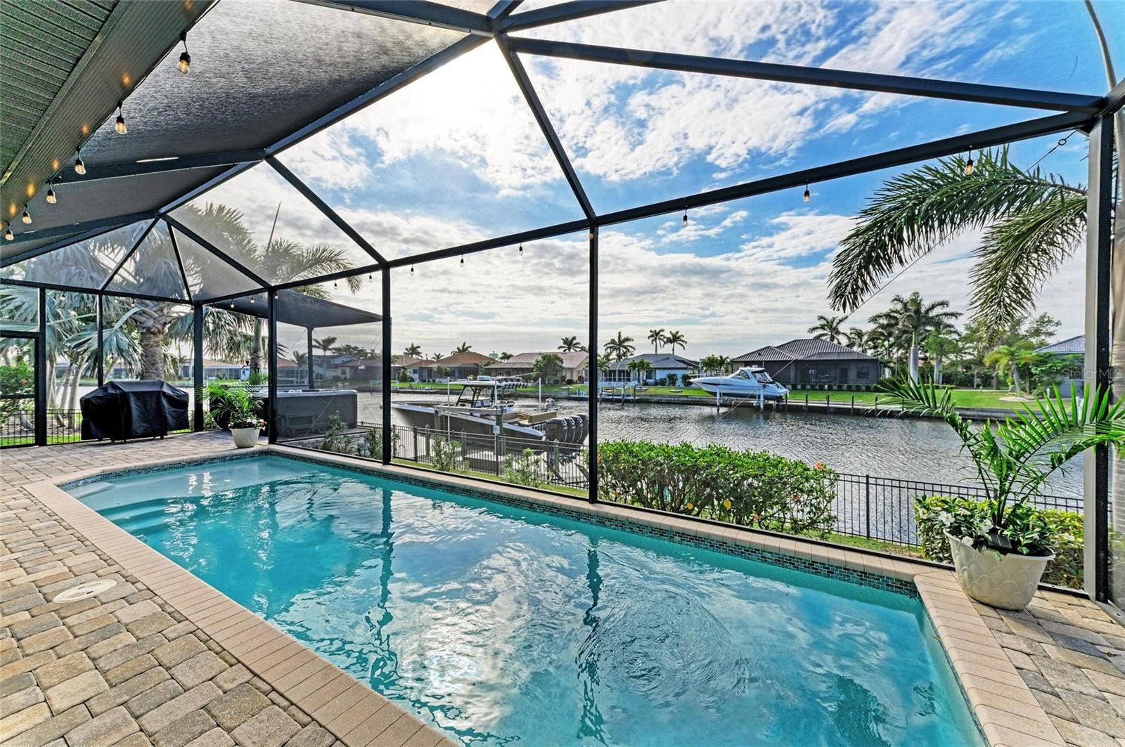 INCREDIBLE VIEWS & LUXURIOUS APPOINTMENTS await from this STUNNINGLY REMODELED 3-bedroom, 2-bathroom + den pool home with an oversized 2 car garage, a DESIRED SOUTHERN EXPOSURE, and a great dock/newly added 16,000lb lift with GULF ACCESS & NO BRIDGES. SELLER FINANCING AVAILABLE! From the outside, notice how high and dry the home is naturally, along with beautiful landscaping, upgraded pavers, added soffit lighting, and a welcoming front porch. Inside the double door entry, step into the ideal coastal design with upgrades recently added to include new light fixtures, luxury vinyl plank flooring, plantation shutters, custom cabinetry, quartz counters, new GE Cafe appliances, custom trim work including a coffered ceiling, and more. Enjoy a thoughtfully designed floor plan, with the den/office at the front of the home, a spacious great room open to the large kitchen with breakfast bar, and the connected dining room. The laundry room, with similar updates is great for extra storage and near the pantry and connection to the garage with fantastic storage. On the right side of the home, the primary suite is a stunning retreat, with an en-suite bathroom with separate soaking tub, dual vanities, a private water closet, a Roman shower, dual walk-in closets with built in organizers and a huge bedroom with private lanai access. On the other side of the home, find two beautiful guest bedrooms with great closets and natural light, and a shared/updated guest bathroom near the main living spaces. Outside on the lanai, enjoy a stunning space, with both covered and open relaxation areas, a newly added summer kitchen with beverage bar, and a fantastic added hot tub with Edison lights, all inside the upgraded lanai/cage with panoramic openings. The fenced backyard is fabulous and you can follow the added paver sidewalk down to the beautiful dock with lift and extra space for chairs/storage. This home has impact windows/doors (except the aquarium glass which has shutters) and is in amazing condition. Do not miss out on living your best SWFL life here, nearby to great golf within the neighborhood at Twin Isles Country Club, and also near to the PGD airport, just a short ride away, along with amazing restaurants, shopping, festivals, weekly farmers markets, and more! BE SURE TO CLICK THE FULL VIRTUAL TOUR LINKS FOR DETAILS and schedule your showing today!
