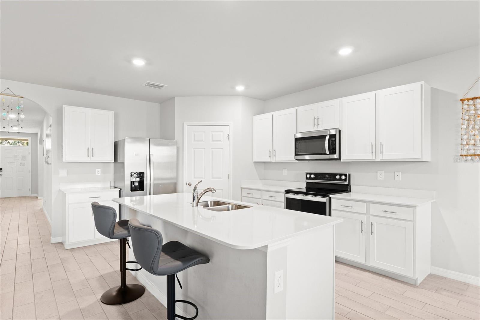 This beautifully designed Tradition Series Madison floor plan offers 4 bedrooms and 3 bathrooms, along with a 3-car garage. Its contemporary features include quartz countertops in both the kitchen and bathrooms, faux wood blinds, and a Smart Home package. The kitchen comes fully equipped with Whirlpool stainless steel appliances, including a washer and dryer. Inside, you'll find stunning plank tile flooring throughout, with carpet in the bedrooms. The exterior features a charming paver driveway, entry walkway, and lanai. An irrigation system keeps your lawn lush and healthy year-round. The secluded Primary suite boasts a spacious primary bathroom and an expansive walk-in closet. Additional highlights blinds on all windows, a full irrigation system, and an electric garage door with opener. Located near Fishermen’s Village and Historic Downtown Punta Gorda, this home offers a vibrant lifestyle with access to arts, entertainment, world-class fishing, boating, fine dining, and scenic parks. You're also just a short drive from the breathtaking SWFL Gulf beaches. This move-in ready home, fully furnished and with all the modern features you need. Don't miss out—schedule your private showing today!