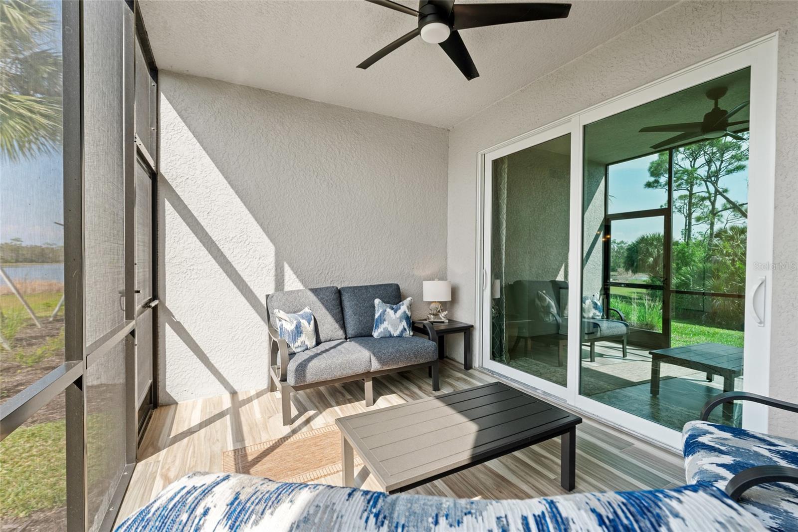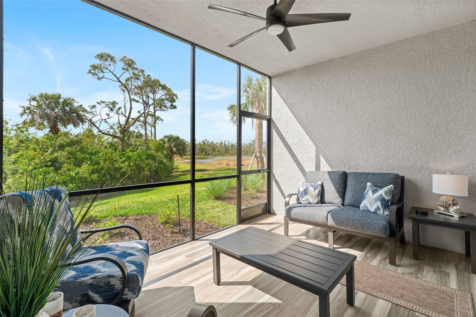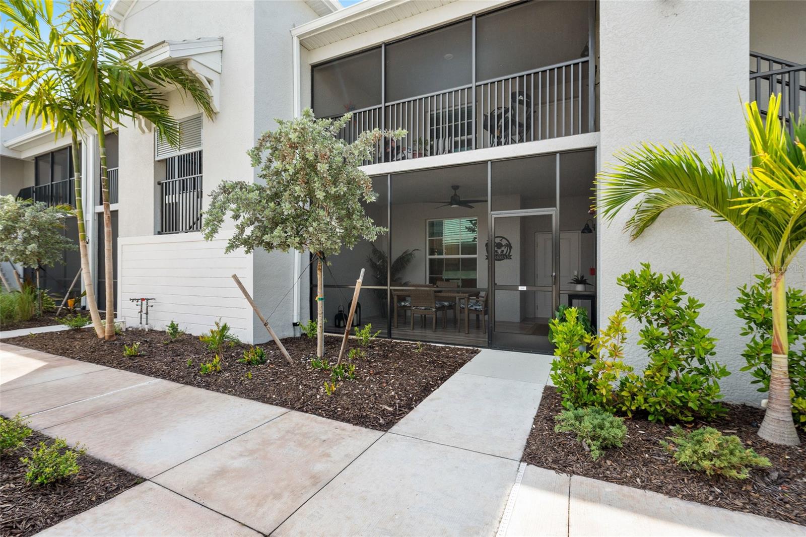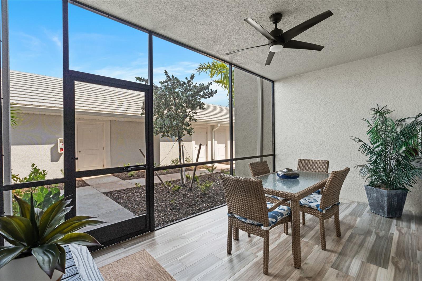 Elegant First-Floor Arabella Veranda with Stunning Upgrades. Step into refined living with this beautifully upgraded first-floor Veranda in the highly sought-after Heritage Landing Golf & Country Club. From the moment you enter, you'll appreciate the thoughtful enhancements that make this home both functional and elegant. The foyer welcomes you with custom white cabinetry topped with granite countertop, offering both style and additional storage. The well-appointed kitchen features even more added cabinetry, a coffee bar with a granite countertop, crisp white quartz surfaces, a stylish backsplash, and stainless steel appliances. Throughout the home, high-end lighting and fans create a sophisticated ambiance, complemented by fresh paint & custom wainscoting to several rooms for an extra touch of polish. The open floor plan with split bedrooms is perfect for entertaining, while the den with French doors provides the flexibility for extra guest space or a home office. The spacious primary suite boasts two walk-in closets and an en-suite bath featuring dual sinks, added cabinetry, and a tiled walk-in shower with a glass enclosure. Even the laundry room has been upgraded with added cabinetry. Relax and entertain on the west-facing lanai, offering tranquil sunset views. Both front and rear lanais have been upgraded with plank tile. Enjoy peace of mind and security with impact-resistant doors and windows, plus a no-flood-zone location. Your private one-car garage is located just across from your front lanai, and a satellite pool is next door for added convenience. This home comes with a Social Membership, allowing you to experience resort-style living at Heritage Landing. Enjoy the resort pool with a shallow beach entry and lap swimming area. The tiki bar is conveniently located inside the gated pool area. Tennis, pickleball, and bocce ball courts are nextdoor. The fitness center is at the cutting edge with saunas, locker rooms, and full service spa. Conveniently located near downtown, Fisherman’s Village, PG Airport, I-75, shopping, dining, and more. Don’t miss this opportunity to own an elegant, upgraded Veranda in a premier community. Call today to schedule a showing and see these great amenities.