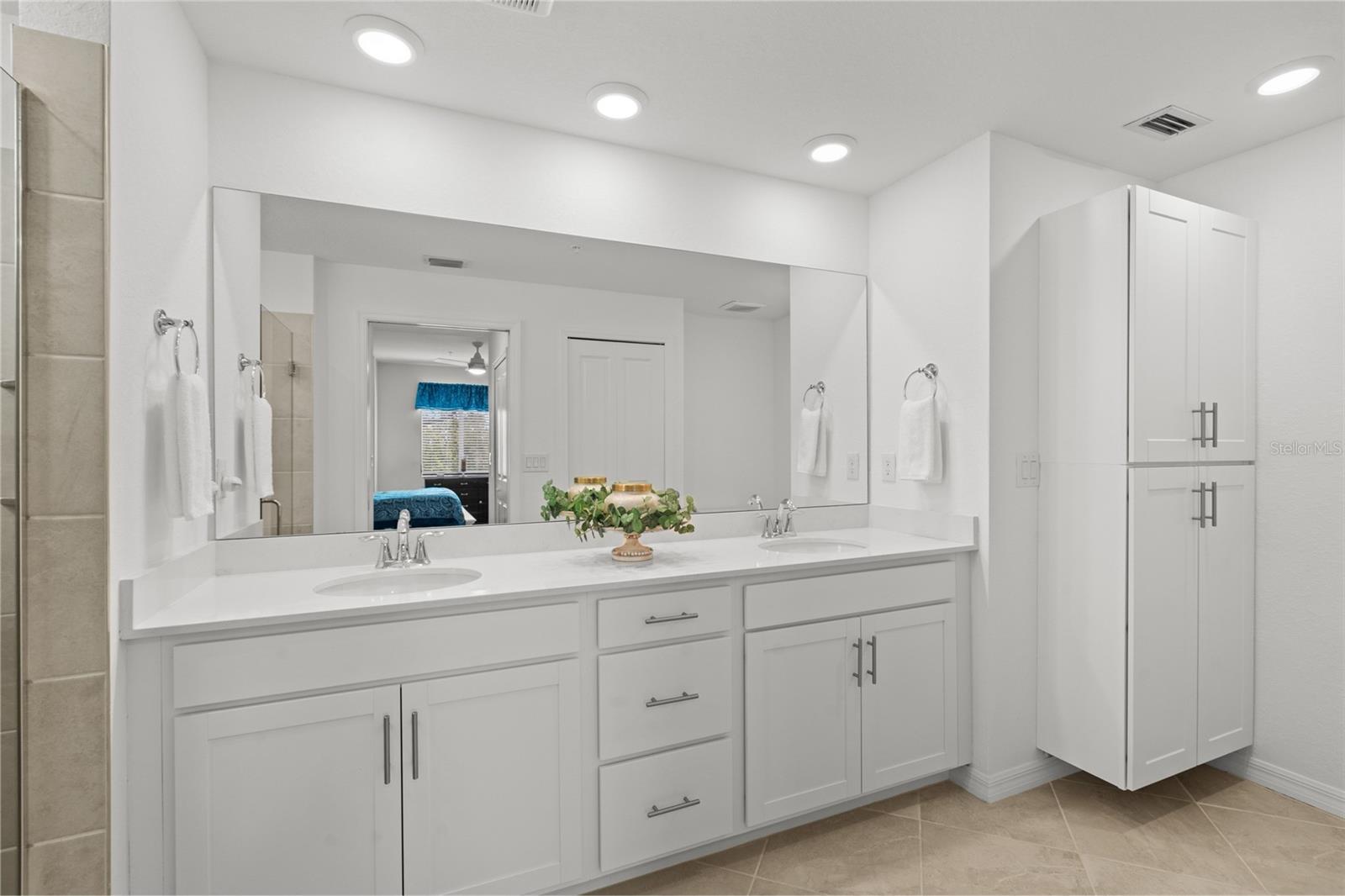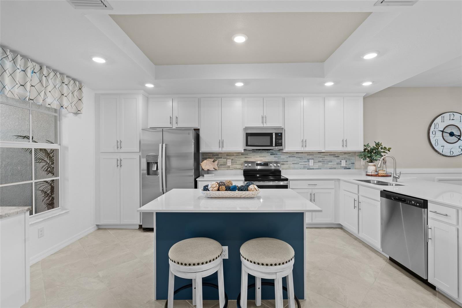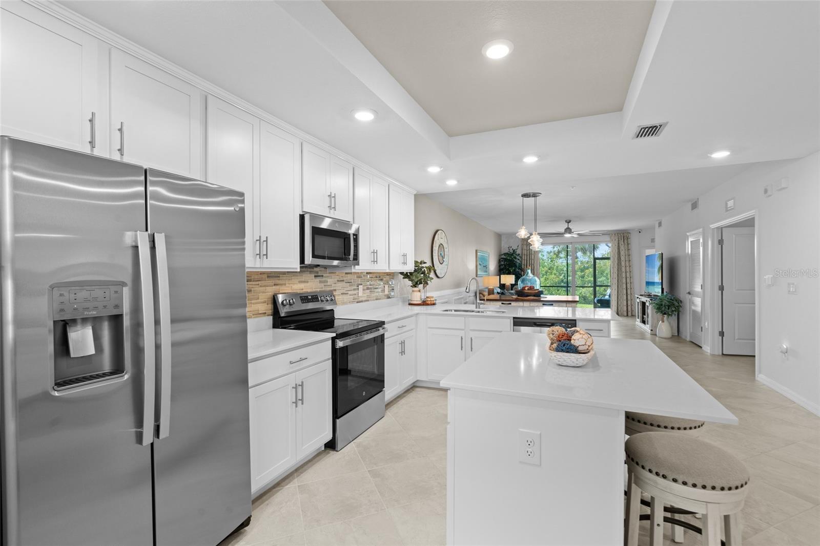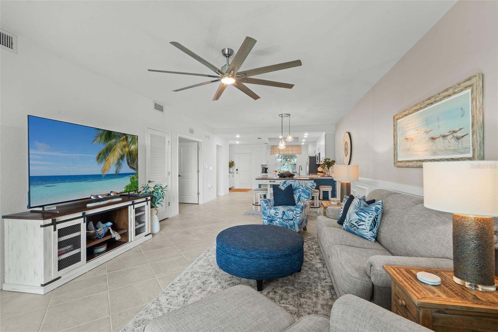 Elegant First-Floor Arabella Veranda with Stunning Upgrades. Step into refined living with this beautifully upgraded first-floor Veranda in the highly sought-after Heritage Landing Golf & Country Club. From the moment you enter, you'll appreciate the thoughtful enhancements that make this home both functional and elegant. The foyer welcomes you with custom white cabinetry topped with granite countertop, offering both style and additional storage. The well-appointed kitchen features even more added cabinetry, a coffee bar with a granite countertop, crisp white quartz surfaces, a stylish backsplash, and stainless steel appliances. Throughout the home, high-end lighting and fans create a sophisticated ambiance, complemented by fresh paint & custom wainscoting to several rooms for an extra touch of polish. The open floor plan with split bedrooms is perfect for entertaining, while the den with French doors provides the flexibility for extra guest space or a home office. The spacious primary suite boasts two walk-in closets and an en-suite bath featuring dual sinks, added cabinetry, and a tiled walk-in shower with a glass enclosure. Even the laundry room has been upgraded with added cabinetry. Relax and entertain on the west-facing lanai, offering tranquil sunset views. Both front and rear lanais have been upgraded with plank tile. Enjoy peace of mind and security with impact-resistant doors and windows, plus a no-flood-zone location. Your private one-car garage is located just across from your front lanai, and a satellite pool is next door for added convenience. This home comes with a Social Membership, allowing you to experience resort-style living at Heritage Landing. Enjoy the resort pool with a shallow beach entry and lap swimming area. The tiki bar is conveniently located inside the gated pool area. Tennis, pickleball, and bocce ball courts are nextdoor. The fitness center is at the cutting edge with saunas, locker rooms, and full service spa. Conveniently located near downtown, Fisherman’s Village, PG Airport, I-75, shopping, dining, and more. Don’t miss this opportunity to own an elegant, upgraded Veranda in a premier community. Call today to schedule a showing and see these great amenities.