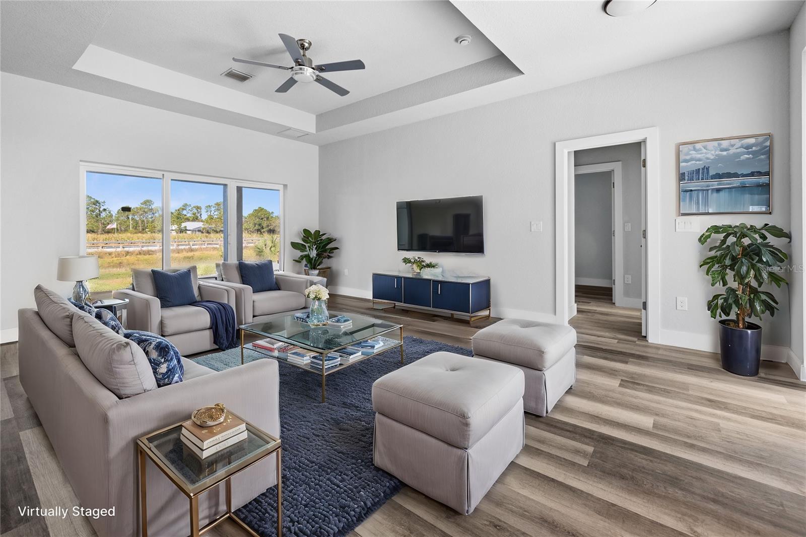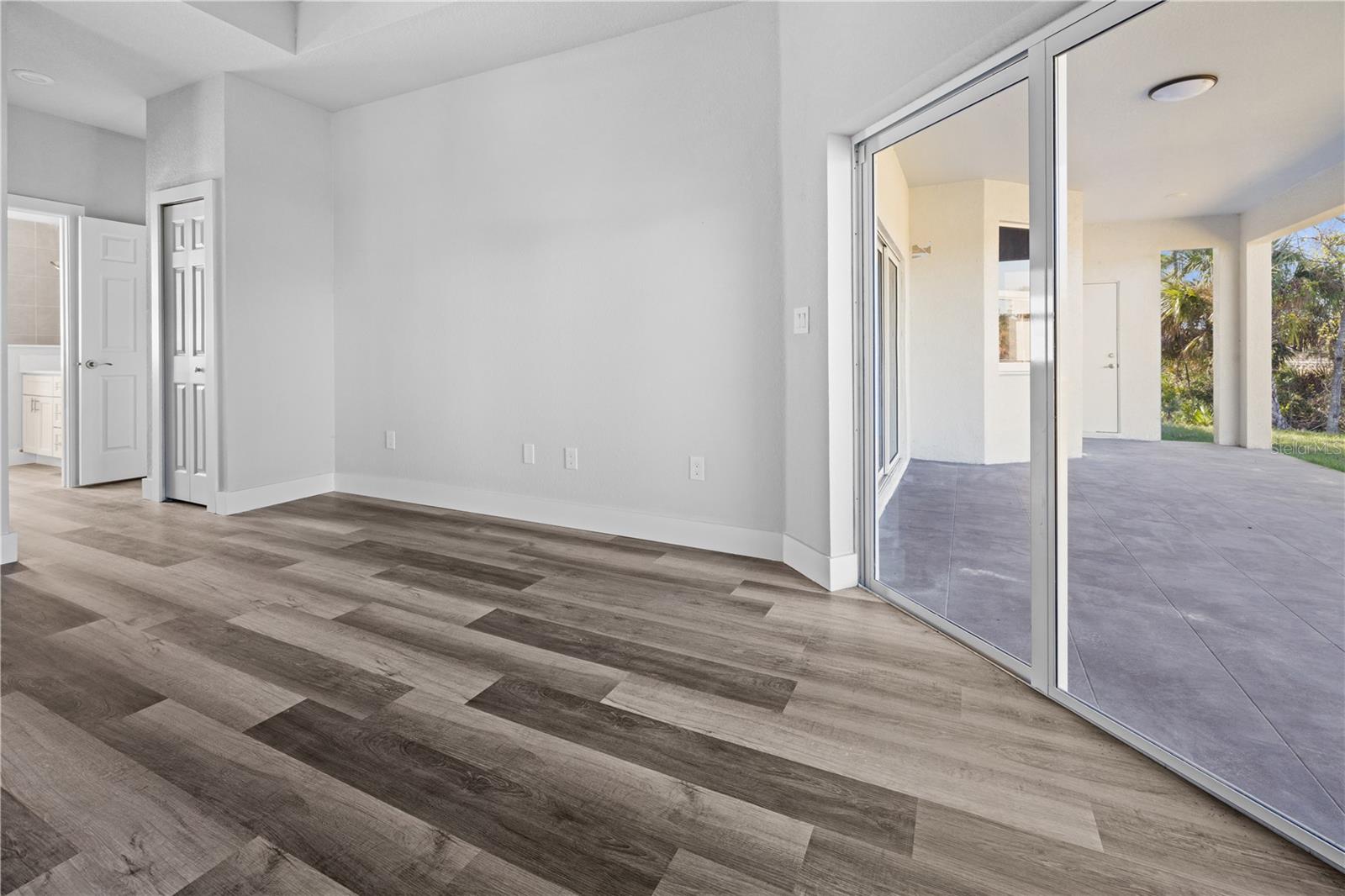 One or more photo(s) has been virtually staged. MOTIVATED SELLER. Ready to Move-in, NO FLOOD ZONE, SAVING IN INSURANCE COSTS. This stunning 3-bedroom, 2-bathroom home is equipped with IMPACT WINDOWS AND DOORS for added security and peace of mind during the hurricane season. Inside, you’ll find durable, scratch-resistant, and water-resistant high-quality vinyl flooring throughout. The open-concept design with 9-foot ceilings creates a spacious and airy atmosphere, with crown molding in the living room and master bedroom complemented by abundant natural light. The kitchen boasts beautiful all-wood cabinetry with soft-close hinges, quartz countertops, stainless steel appliances, and a pantry with pull-out drawers. The layout also includes a cozy breakfast nook with water view to the lake (the lake did not flooded during the last storms) and a separate formal dining area, offering great opportunities for customization. The split floor plan provides convenient access to the lanai from three different areas, and both the lanai and front entryway are finished with stylish tile flooring. You will have the opportunity to install your outside kitchen. The master suite features a luxurious in suite bathroom with a walk-in shower, a large soaking tub, double sinks with quartz countertops, a linen closet, and both his-and-her closets. Additional upgrades include a buried power line, a smart thermostat, and thoughtful extras like a utility sink and a water softener. Don’t miss your chance to see this incredible home. CLOSE IT AND BUILD YOUR PRIVATE POOL IN YOUR OVERSIZED BACK YARD– schedule your private showing today before it’s gone!