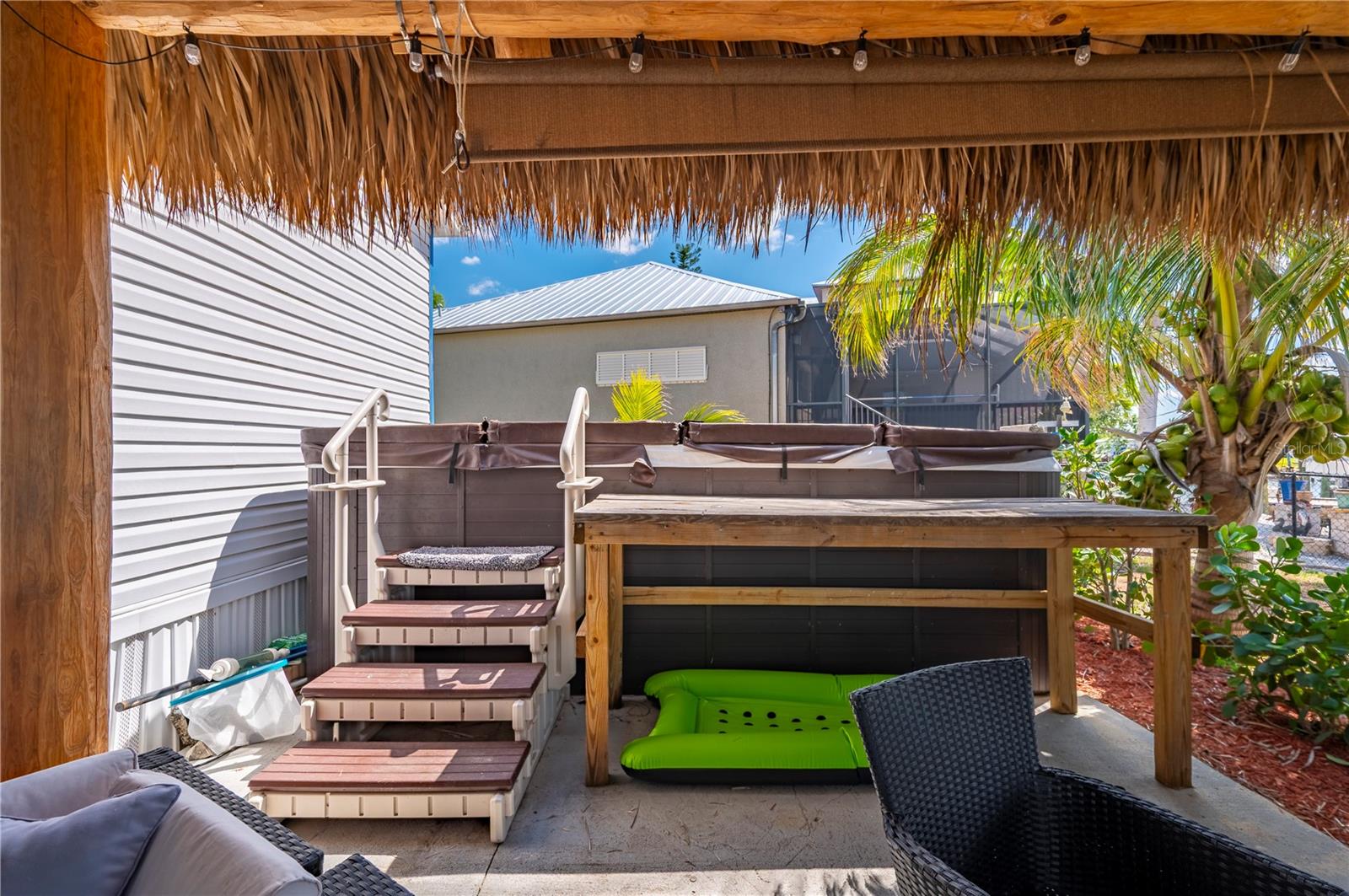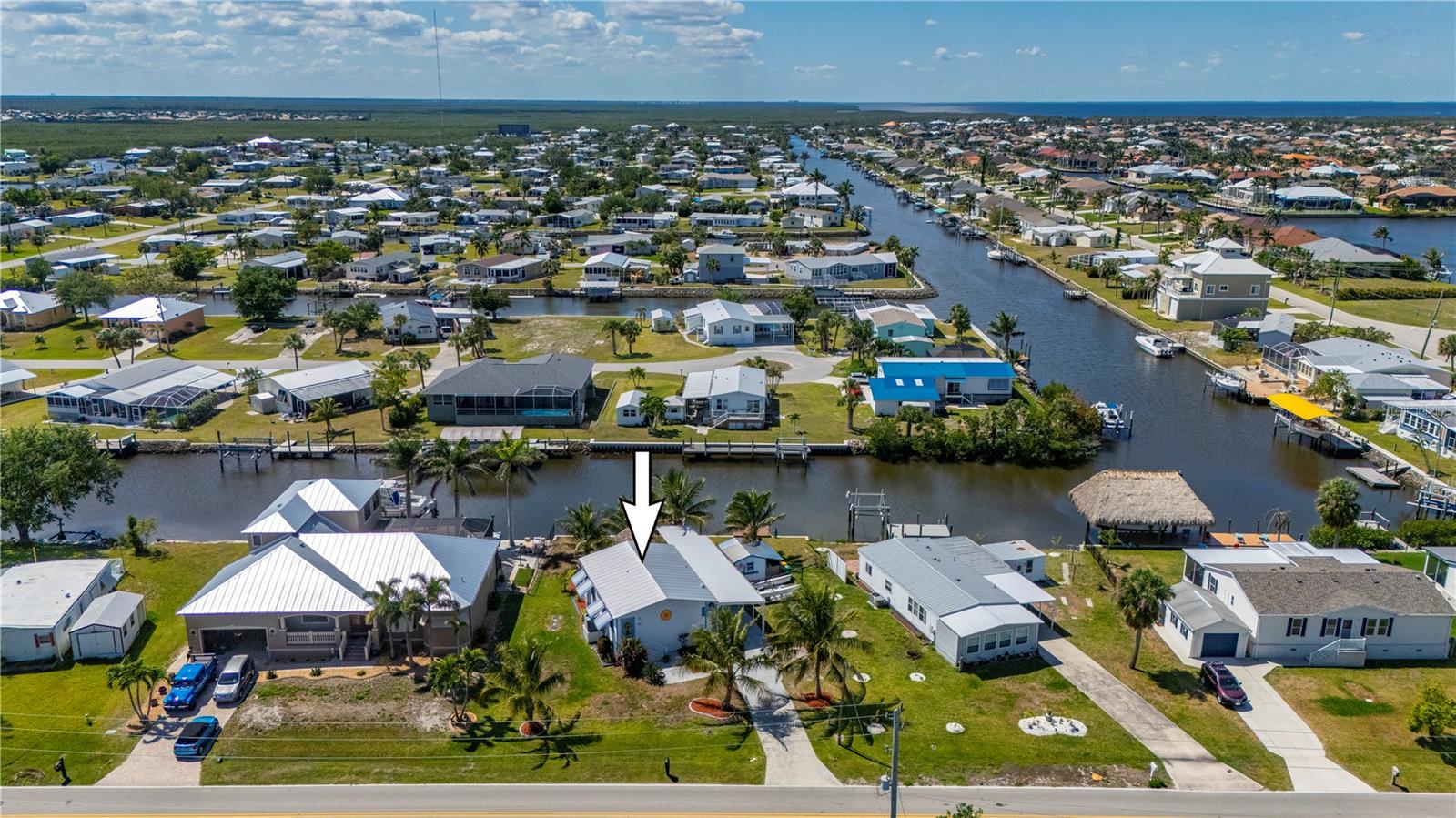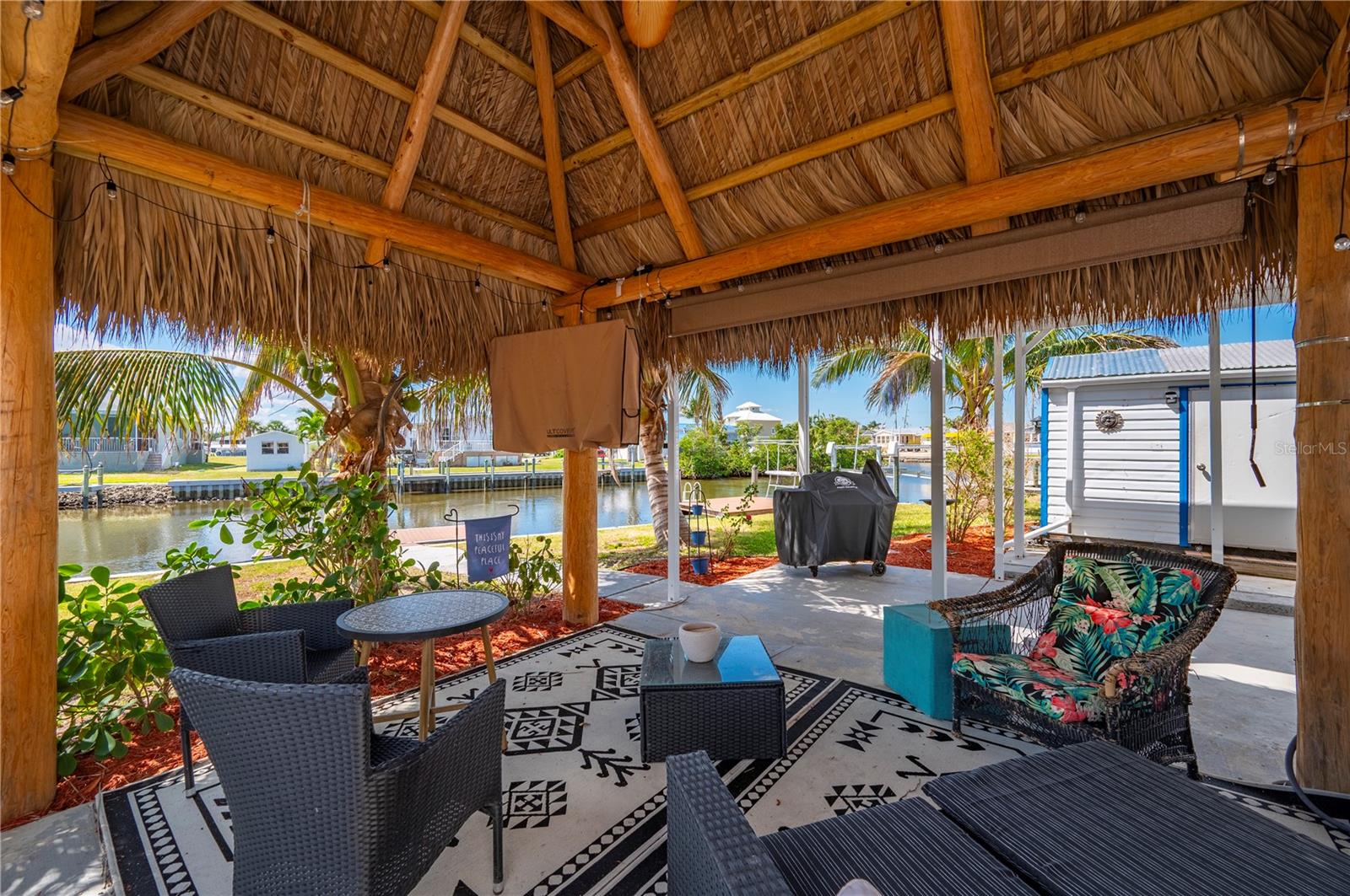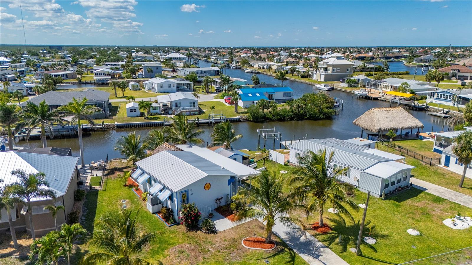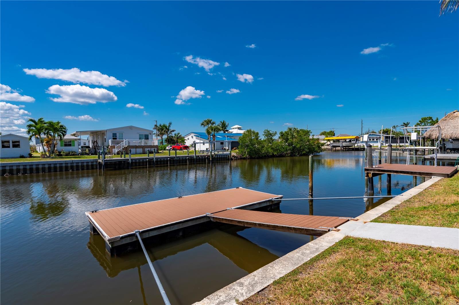 Welcome to your own slice of paradise, a well-maintained 2 bedroom, 2 bath waterfront home that perfectly blends the relaxed Florida Keys lifestyle with the convenience of small-town living. Nestled in a quiet, tropical setting, this property offers the best of both worlds: the peaceful ambiance of coastal living, with easy access to everyday essentials like shops, restaurants, schools, and healthcare facilities just minutes away. The home is set on sailboat-access water that leads directly to Charlotte Harbor and the Gulf Islands, making it a dream for boating enthusiasts and nature lovers alike. Coconut palms and lush, tropical landscaping surround the property, creating a serene, resort-style atmosphere. Framed beneath the canopy of these mature palms, a charming tiki hut offers the perfect outdoor retreat for entertaining guests or simply unwinding with a cool drink in hand. Enjoy the convenience of a private swim spa with a resistance feature-ideal for early morning exercise or a soothing evening soak. A floating dock equipped with a fish cleaning station makes it easy to cast a line and enjoy fresh catches right from your backyard. For those who enjoy DIY projects or gardening, a spacious metal shed offers ample storage for tools, boating equipment, or hobby supplies. Inside, the home is equally inviting. The open-concept layout is perfect for entertaining, while the kitchen features wine refrigerator, granite countertops complementing the rich wood cabinetry, and plenty of counter space for cooking and gathering with friends. Large windows fill the living space with natural light, enhancing the warm, coastal feel throughout. A carport with insulated roof provides covered parking with enough room for both your vehicle and a boat, adding even more function and value to this already exceptional property with no deed restrictions or HOA. Located just minutes from downtown Punta Gorda, you’ll enjoy quick access to the weekend farmers market, scenic waterfront parks, and miles of bike trails. The renowned Fishermen’s Village is also nearby, offering a variety of quaint boutiques, waterfront dining, boat rentals, and year-round events. If you’ve been dreaming of a Florida Keys-inspired lifestyle, complete with boating, fishing, and palm-lined tranquility-but don’t want to sacrifice the conveniences of in-town living-this is a rare opportunity you won’t want to miss.