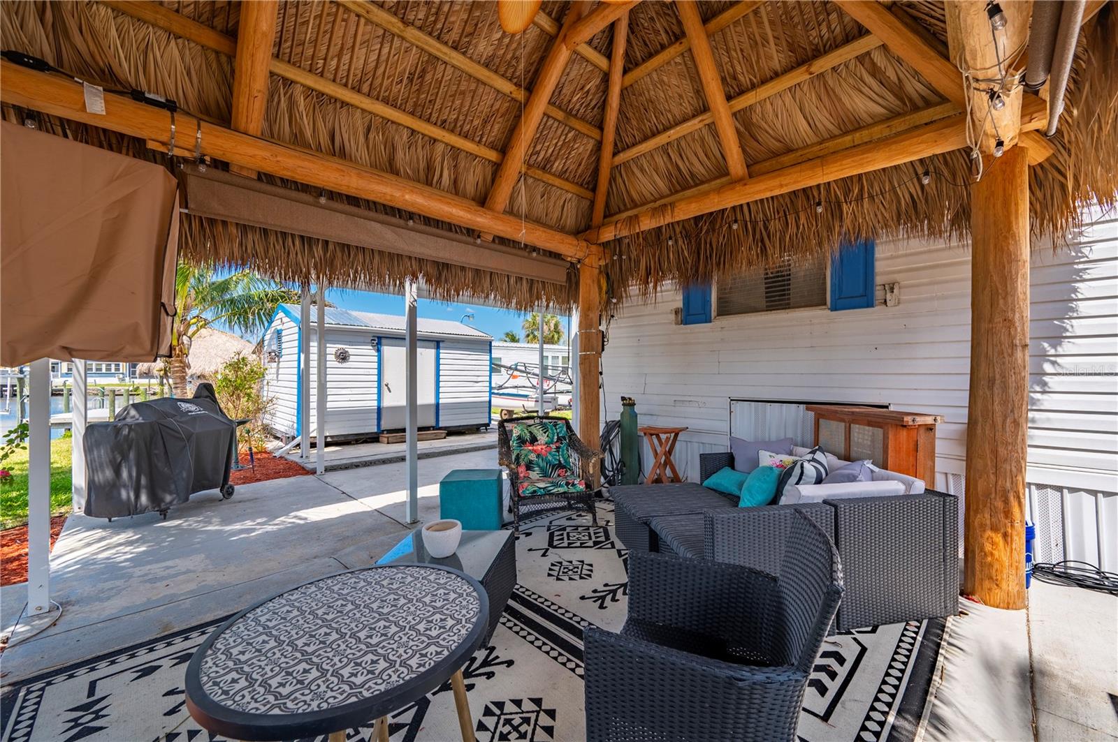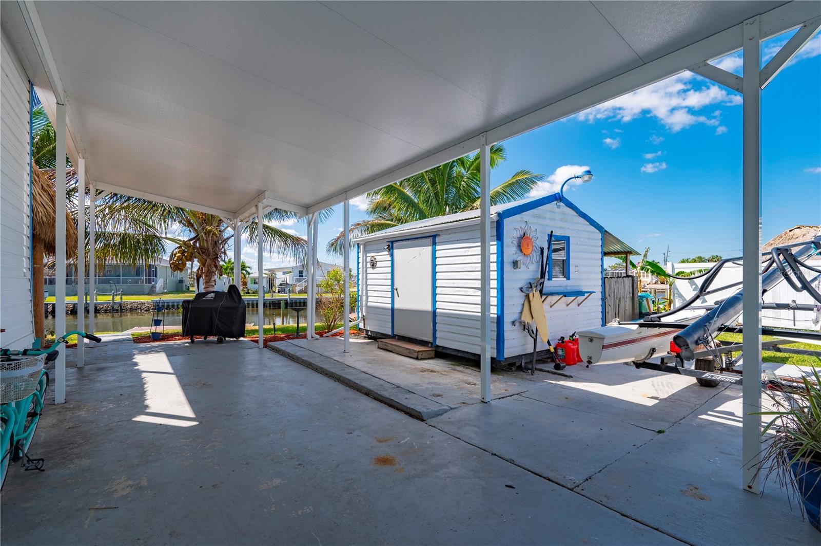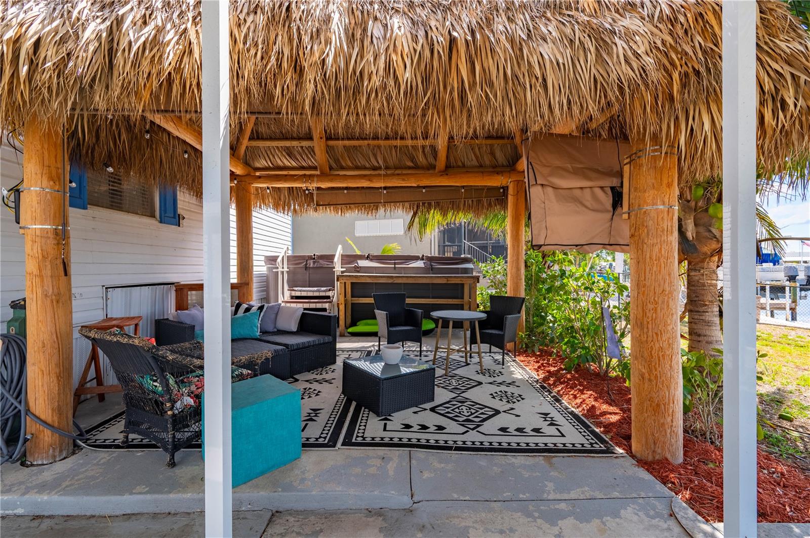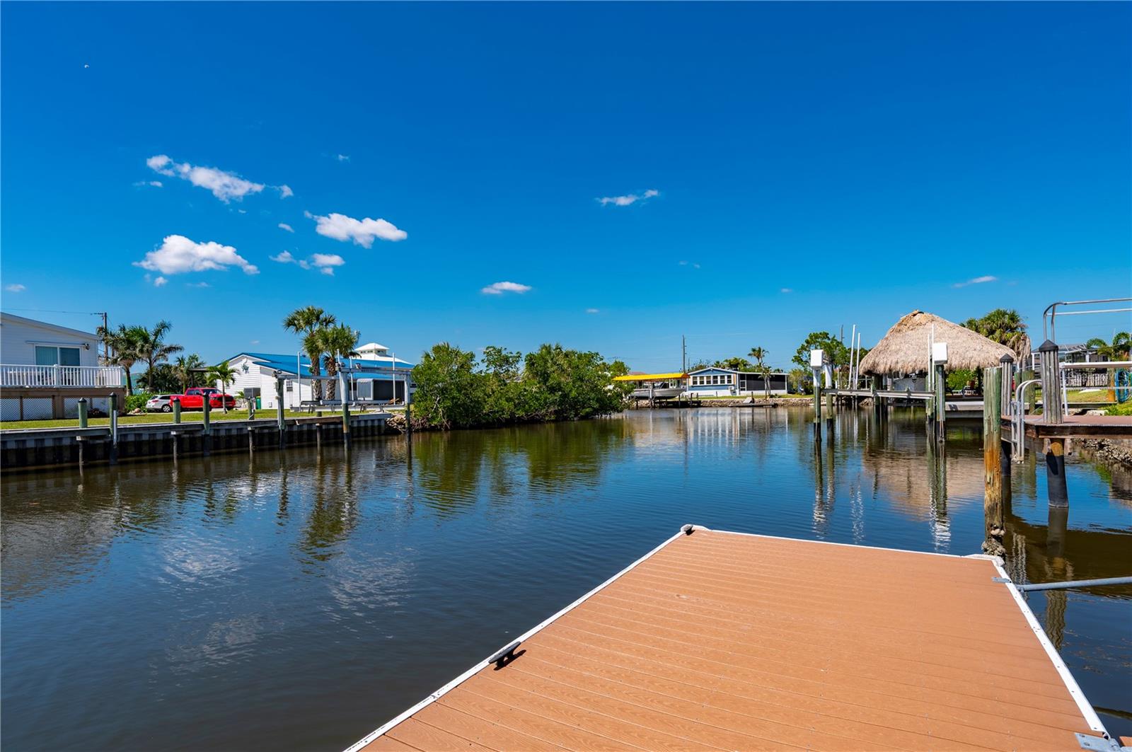 Welcome to your own slice of paradise, a well-maintained 2 bedroom, 2 bath waterfront home that perfectly blends the relaxed Florida Keys lifestyle with the convenience of small-town living. Nestled in a quiet, tropical setting, this property offers the best of both worlds: the peaceful ambiance of coastal living, with easy access to everyday essentials like shops, restaurants, schools, and healthcare facilities just minutes away. The home is set on sailboat-access water that leads directly to Charlotte Harbor and the Gulf Islands, making it a dream for boating enthusiasts and nature lovers alike. Coconut palms and lush, tropical landscaping surround the property, creating a serene, resort-style atmosphere. Framed beneath the canopy of these mature palms, a charming tiki hut offers the perfect outdoor retreat for entertaining guests or simply unwinding with a cool drink in hand. Enjoy the convenience of a private swim spa with a resistance feature-ideal for early morning exercise or a soothing evening soak. A floating dock equipped with a fish cleaning station makes it easy to cast a line and enjoy fresh catches right from your backyard. For those who enjoy DIY projects or gardening, a spacious metal shed offers ample storage for tools, boating equipment, or hobby supplies. Inside, the home is equally inviting. The open-concept layout is perfect for entertaining, while the kitchen features wine refrigerator, granite countertops complementing the rich wood cabinetry, and plenty of counter space for cooking and gathering with friends. Large windows fill the living space with natural light, enhancing the warm, coastal feel throughout. A carport with insulated roof provides covered parking with enough room for both your vehicle and a boat, adding even more function and value to this already exceptional property with no deed restrictions or HOA. Located just minutes from downtown Punta Gorda, you’ll enjoy quick access to the weekend farmers market, scenic waterfront parks, and miles of bike trails. The renowned Fishermen’s Village is also nearby, offering a variety of quaint boutiques, waterfront dining, boat rentals, and year-round events. If you’ve been dreaming of a Florida Keys-inspired lifestyle, complete with boating, fishing, and palm-lined tranquility-but don’t want to sacrifice the conveniences of in-town living-this is a rare opportunity you won’t want to miss.