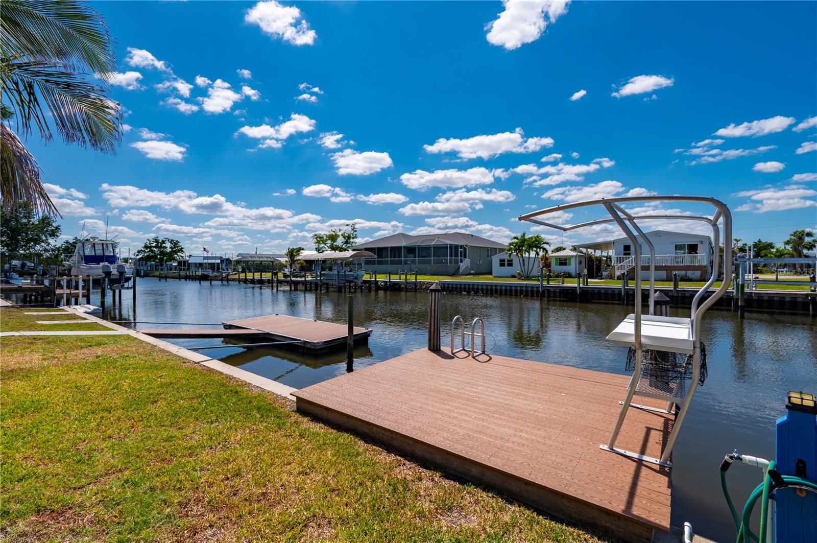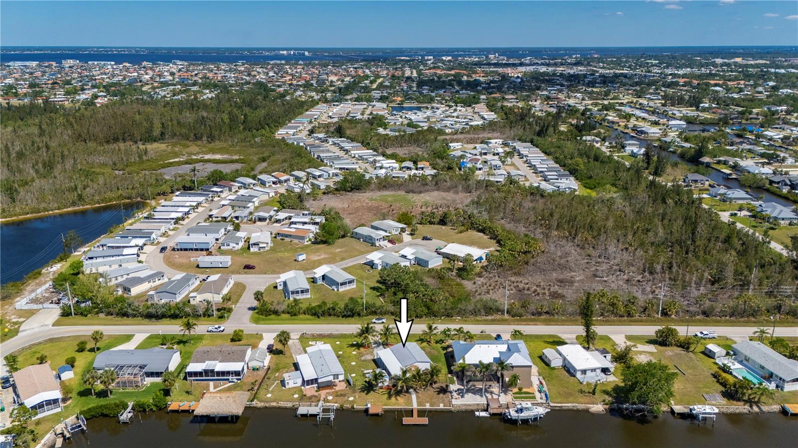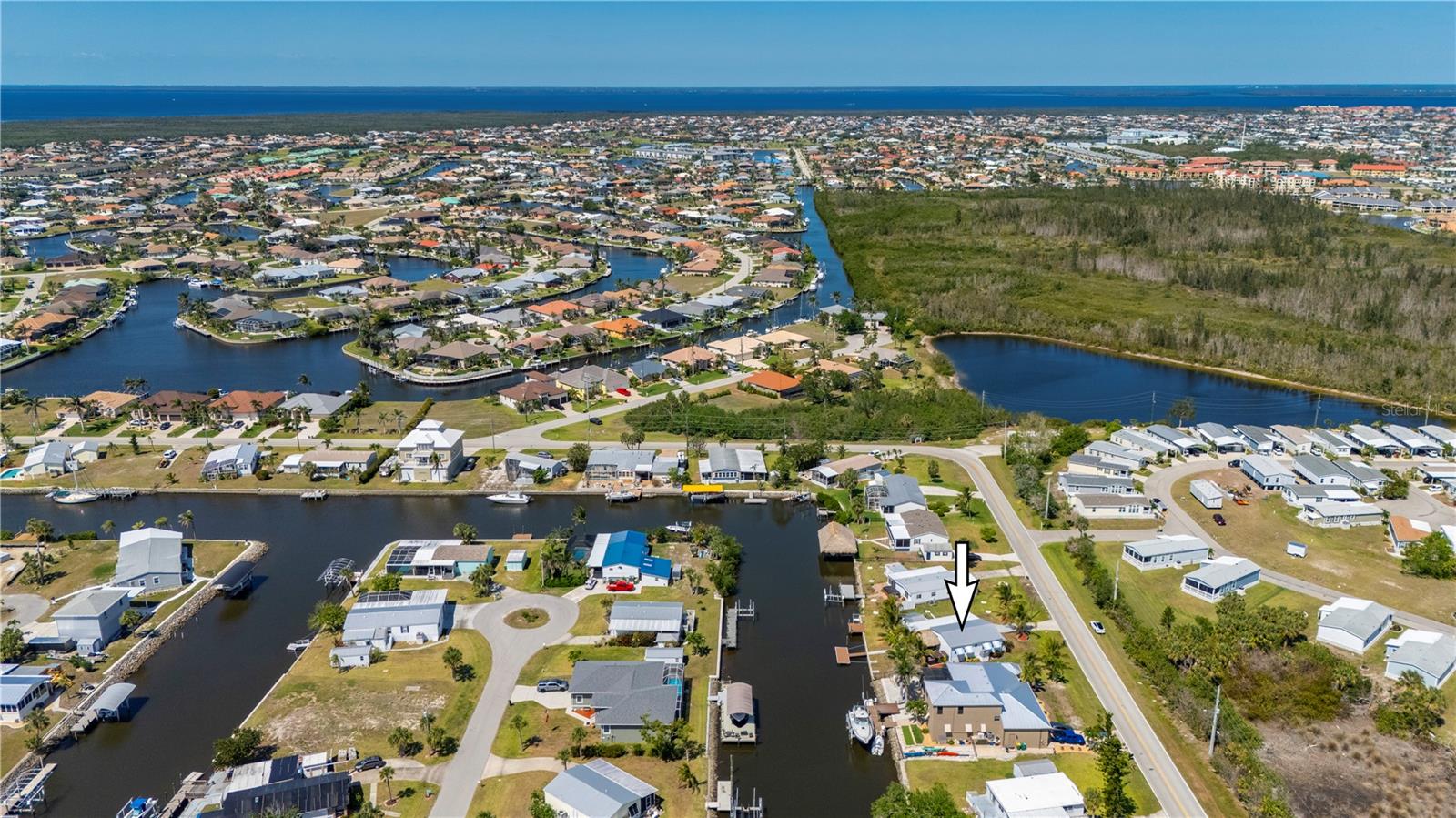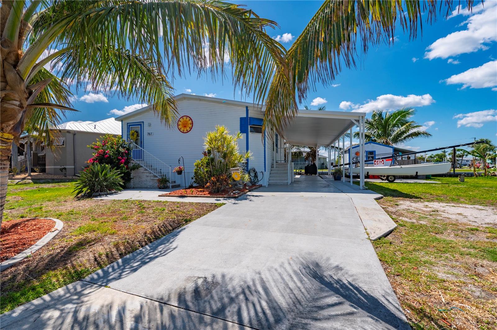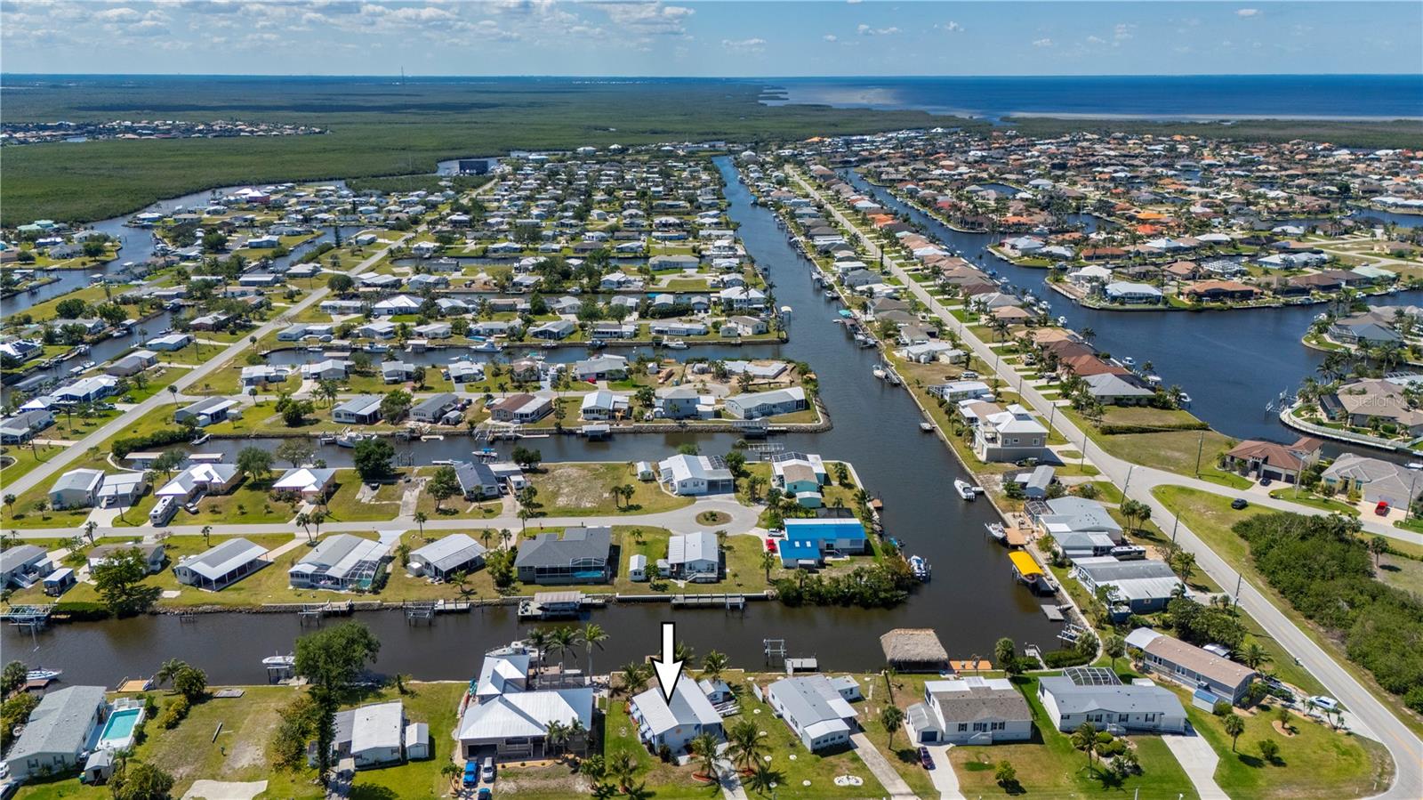 Welcome to your own slice of paradise, a well-maintained 2 bedroom, 2 bath waterfront home that perfectly blends the relaxed Florida Keys lifestyle with the convenience of small-town living. Nestled in a quiet, tropical setting, this property offers the best of both worlds: the peaceful ambiance of coastal living, with easy access to everyday essentials like shops, restaurants, schools, and healthcare facilities just minutes away. The home is set on sailboat-access water that leads directly to Charlotte Harbor and the Gulf Islands, making it a dream for boating enthusiasts and nature lovers alike. Coconut palms and lush, tropical landscaping surround the property, creating a serene, resort-style atmosphere. Framed beneath the canopy of these mature palms, a charming tiki hut offers the perfect outdoor retreat for entertaining guests or simply unwinding with a cool drink in hand. Enjoy the convenience of a private swim spa with a resistance feature-ideal for early morning exercise or a soothing evening soak. A floating dock equipped with a fish cleaning station makes it easy to cast a line and enjoy fresh catches right from your backyard. For those who enjoy DIY projects or gardening, a spacious metal shed offers ample storage for tools, boating equipment, or hobby supplies. Inside, the home is equally inviting. The open-concept layout is perfect for entertaining, while the kitchen features wine refrigerator, granite countertops complementing the rich wood cabinetry, and plenty of counter space for cooking and gathering with friends. Large windows fill the living space with natural light, enhancing the warm, coastal feel throughout. A carport with insulated roof provides covered parking with enough room for both your vehicle and a boat, adding even more function and value to this already exceptional property with no deed restrictions or HOA. Located just minutes from downtown Punta Gorda, you’ll enjoy quick access to the weekend farmers market, scenic waterfront parks, and miles of bike trails. The renowned Fishermen’s Village is also nearby, offering a variety of quaint boutiques, waterfront dining, boat rentals, and year-round events. If you’ve been dreaming of a Florida Keys-inspired lifestyle, complete with boating, fishing, and palm-lined tranquility-but don’t want to sacrifice the conveniences of in-town living-this is a rare opportunity you won’t want to miss.