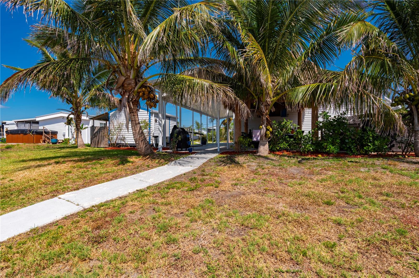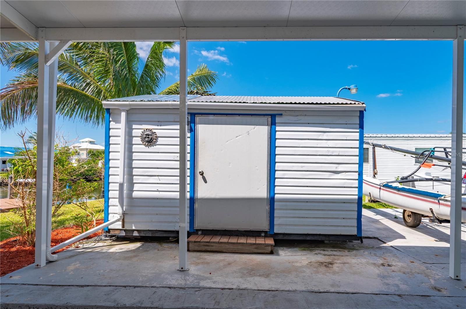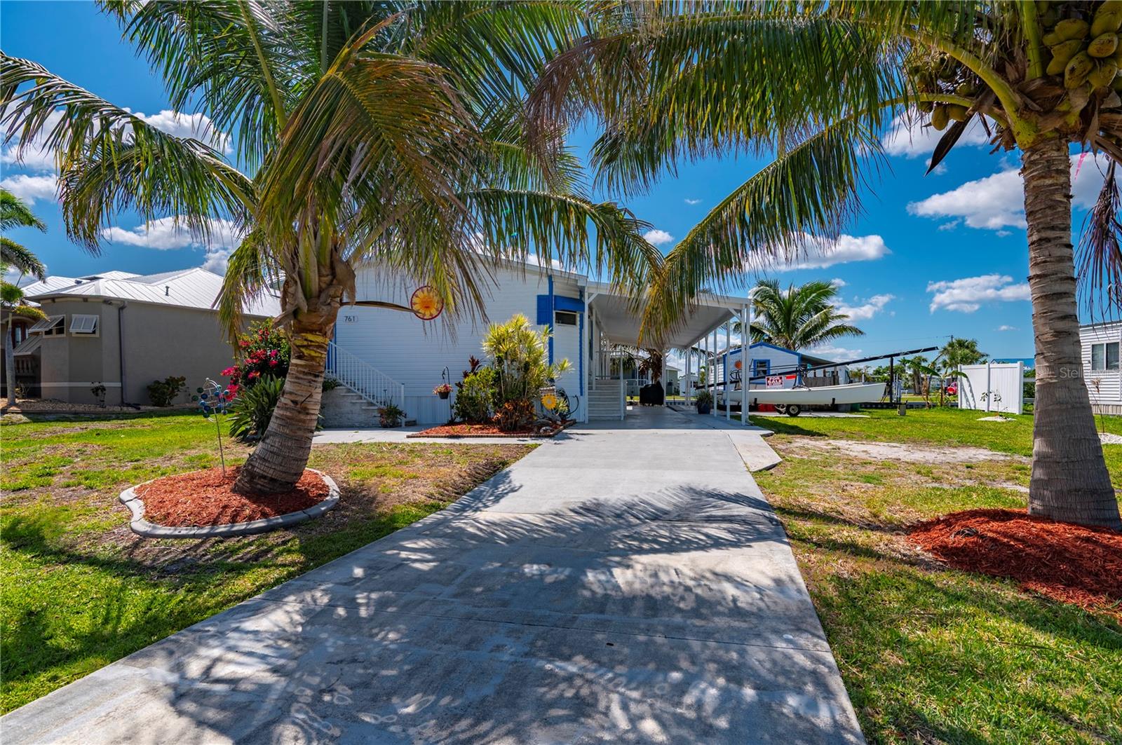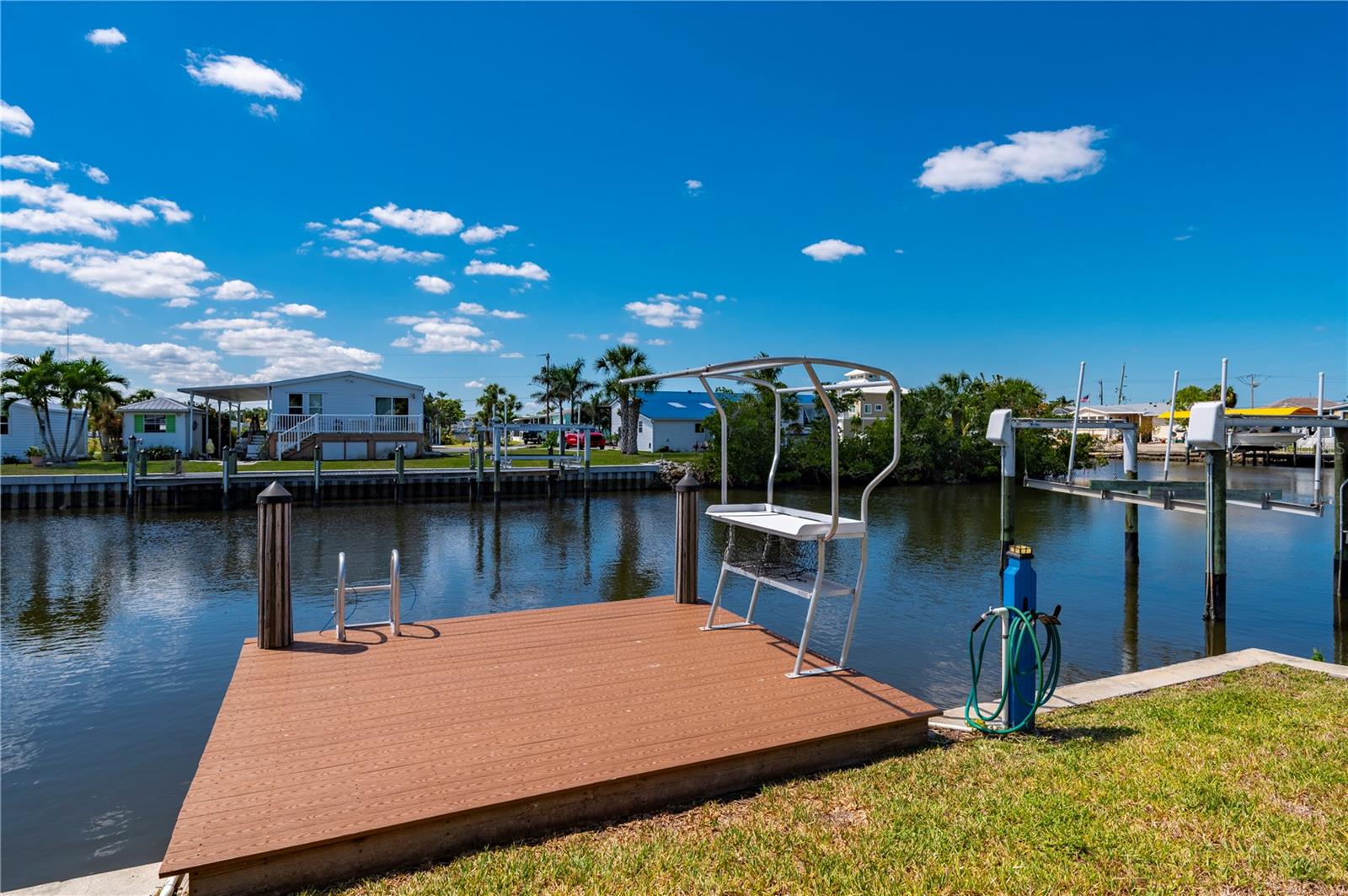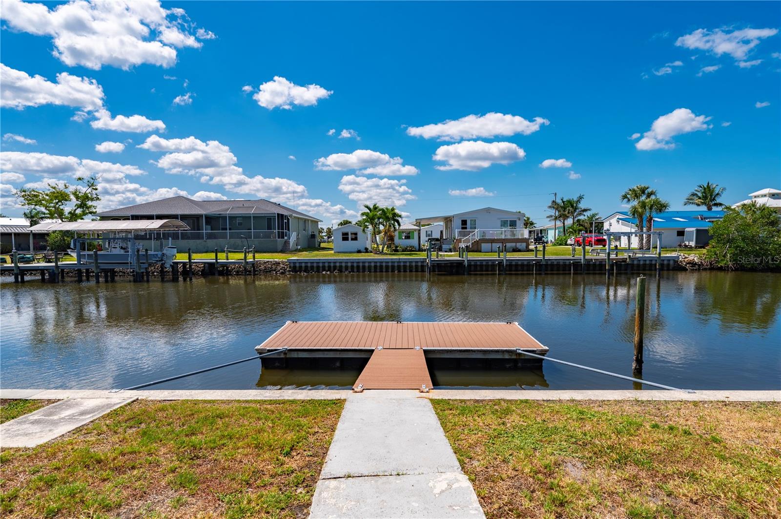 Welcome to your own slice of paradise, a well-maintained 2 bedroom, 2 bath waterfront home that perfectly blends the relaxed Florida Keys lifestyle with the convenience of small-town living. Nestled in a quiet, tropical setting, this property offers the best of both worlds: the peaceful ambiance of coastal living, with easy access to everyday essentials like shops, restaurants, schools, and healthcare facilities just minutes away. The home is set on sailboat-access water that leads directly to Charlotte Harbor and the Gulf Islands, making it a dream for boating enthusiasts and nature lovers alike. Coconut palms and lush, tropical landscaping surround the property, creating a serene, resort-style atmosphere. Framed beneath the canopy of these mature palms, a charming tiki hut offers the perfect outdoor retreat for entertaining guests or simply unwinding with a cool drink in hand. Enjoy the convenience of a private swim spa with a resistance feature-ideal for early morning exercise or a soothing evening soak. A floating dock equipped with a fish cleaning station makes it easy to cast a line and enjoy fresh catches right from your backyard. For those who enjoy DIY projects or gardening, a spacious metal shed offers ample storage for tools, boating equipment, or hobby supplies. Inside, the home is equally inviting. The open-concept layout is perfect for entertaining, while the kitchen features wine refrigerator, granite countertops complementing the rich wood cabinetry, and plenty of counter space for cooking and gathering with friends. Large windows fill the living space with natural light, enhancing the warm, coastal feel throughout. A carport with insulated roof provides covered parking with enough room for both your vehicle and a boat, adding even more function and value to this already exceptional property with no deed restrictions or HOA. Located just minutes from downtown Punta Gorda, you’ll enjoy quick access to the weekend farmers market, scenic waterfront parks, and miles of bike trails. The renowned Fishermen’s Village is also nearby, offering a variety of quaint boutiques, waterfront dining, boat rentals, and year-round events. If you’ve been dreaming of a Florida Keys-inspired lifestyle, complete with boating, fishing, and palm-lined tranquility-but don’t want to sacrifice the conveniences of in-town living-this is a rare opportunity you won’t want to miss.