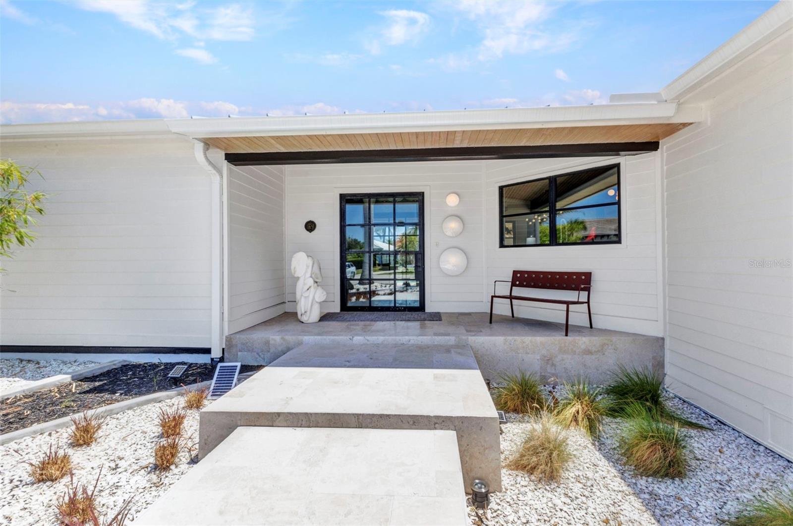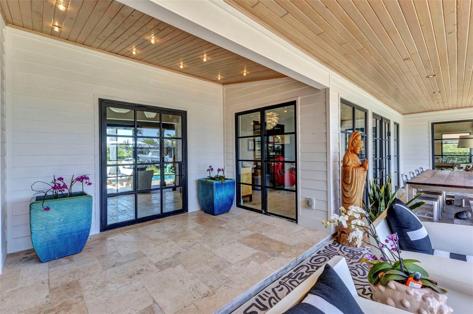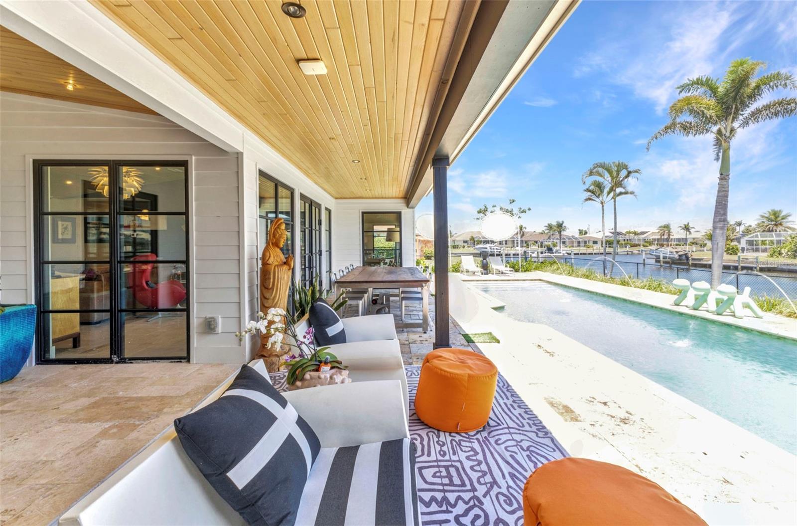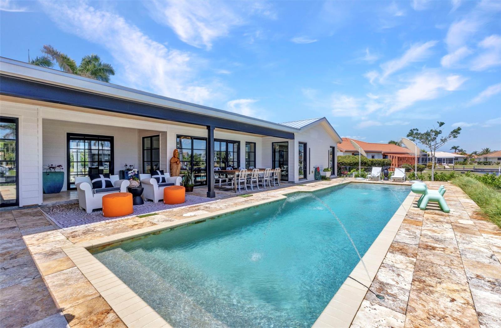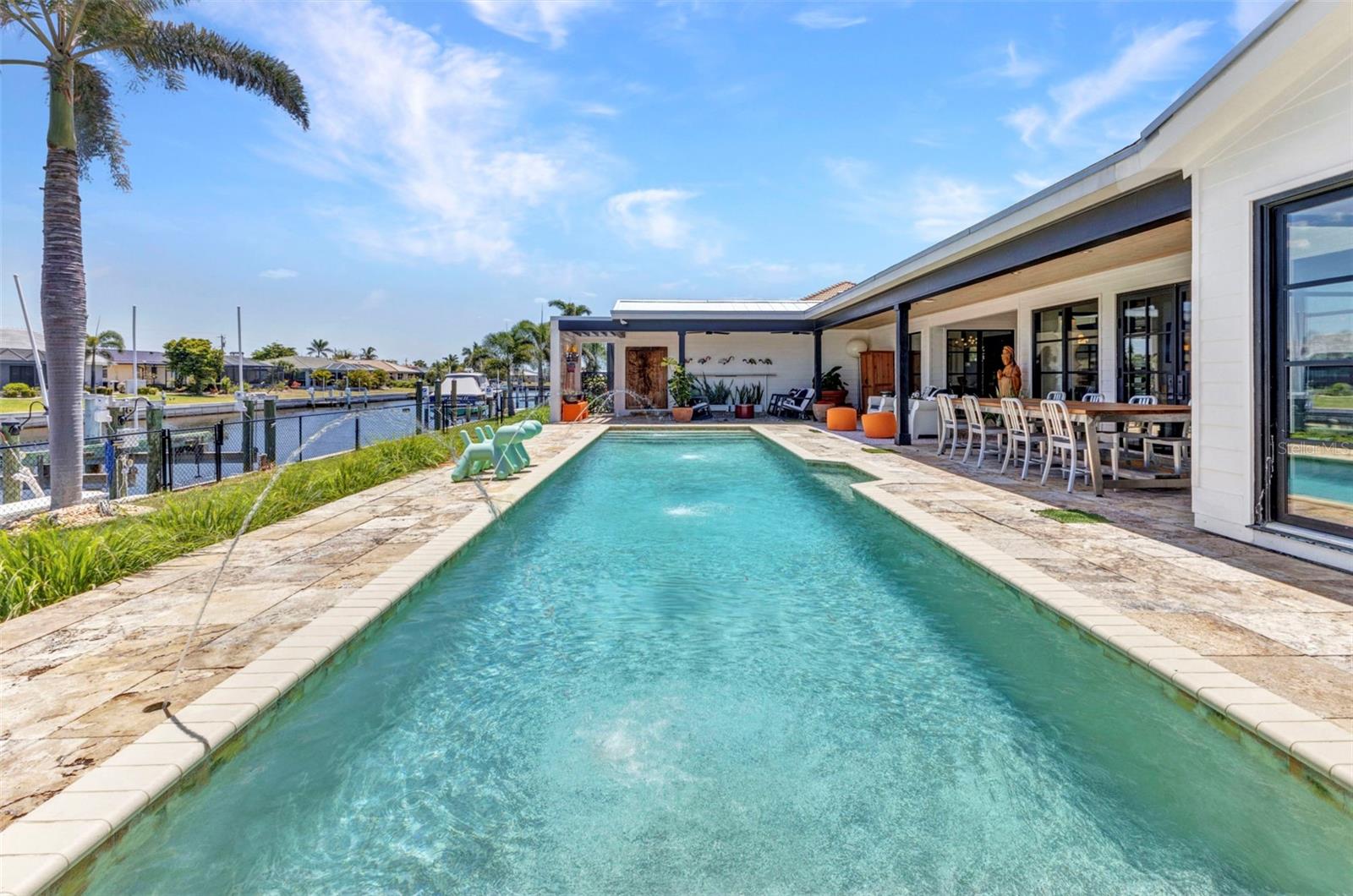 ... ALL THE THINGS! Exquisite Custom Rebuild – Modern Coastal Elegance with Unmatched Structural Integrity. Completely reimagined from the slab up in 2023/2024, this 3-bedroom, 2-bath home offers 2,675 square feet of luxury living with a focus on strength, sophistication, and seamless indoor-outdoor living. Built atop a 4-course stem wall at 9.6' elevation, this residence boasts unparalleled structural integrity with a standing seam metal roof (2024) tied to the foundation via threaded steel rods every 18 inches. Step through one of the two custom steel hurricane-impact pivot doors into a stunning interior featuring vaulted cypress ceilings and French-pattern cream travertine marble flooring. Entertain effortlessly in the chef’s kitchen with JennAir, Bosch, and Fisher Paykel appliances featuring 2 dishwashers, gas range, double wall ovens, warming drawer, a hidden pantry with a second Bosch refrigerator, custom cabinetry, two expansive islands topped with Carrera marble and Brazilian granite, and a striking Picasso-inspired tile backsplash. Walnut live-edge shelving and Picasso inspired wall paper adds a bespoke touch. The open-concept design extends to a spectacular covered lanai with a flat roof (2024), tan travertine marble flooring, and gas hookup ready for a future outdoor kitchen and plenty of shady and sunny seating areas. Overlooking the lanai is a 50’ saltwater lap pool with 4 decorative jets, new variable speed pump (2024), new actuator for pool jets, 2 LED color lights (2024), and electric heater with new control panel (2024), Aqui Link for wireless connection to all pool equipment. Built for resilience and comfort, the home includes: Whole-house 24KW Generac generator (auto switchover) powered by an in-ground 250-gallon LP tank, Hardie Board cement siding and soffits and hurricane-impact windows and doors throughout house, Two AC units with Reme-Halo filters and UV light (2023 & 2024), and two on-demand hot water heaters (electric 2023, LP gas 2024), HALO whole-house water filtration system which will function carefree until 2033, Advanced security system with cameras, audio, and DVD backup Retreat to the luxurious primary suite with a Kohler rain shower, Kohler handheld shower, custom tilework, an infrared sauna and expansive custom cabinetry with his and hers walk in closets. Guest bedrooms and bathroom feature equally high-end finishes and built-in storage. Guest bath has edgeless glass door and Kohler rain shower a private water closet, and large linen closet with built-ins, Outdoors, enjoy the professionally landscaped backyard (fully fenced) maintained by Beautiful Boundaries. Boaters will appreciate the 30’ dock with 30,000 lb boat lift and all-new 2024 electrical. The 32' x 22' garage includes epoxy flooring, wall waterproofing extending up 3', overhead storage, a workshop in a 3rd bay, and a hurricane-rated, custom Clopay door. Sellers are offering a 1 year home warranty for appliances and pool equipment. Buy with confidence. Truly move-in ready, this meticulously designed home delivers peace of mind, exceptional taste, and every modern convenience. Schedule your private showing today.