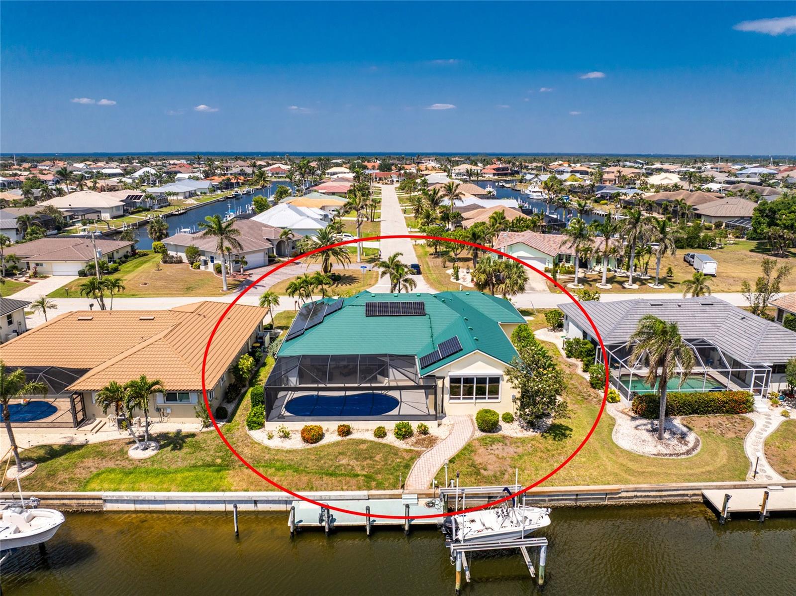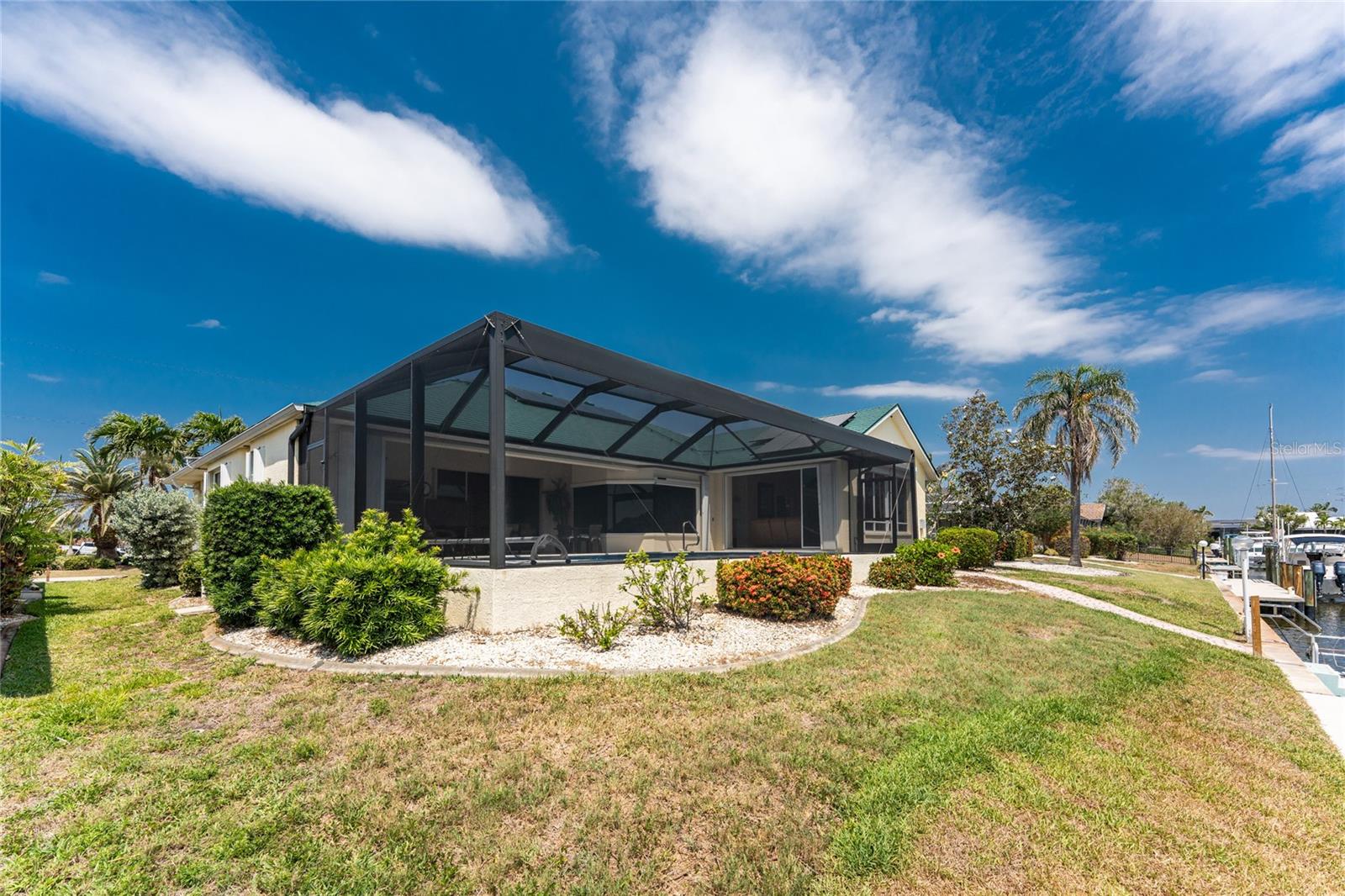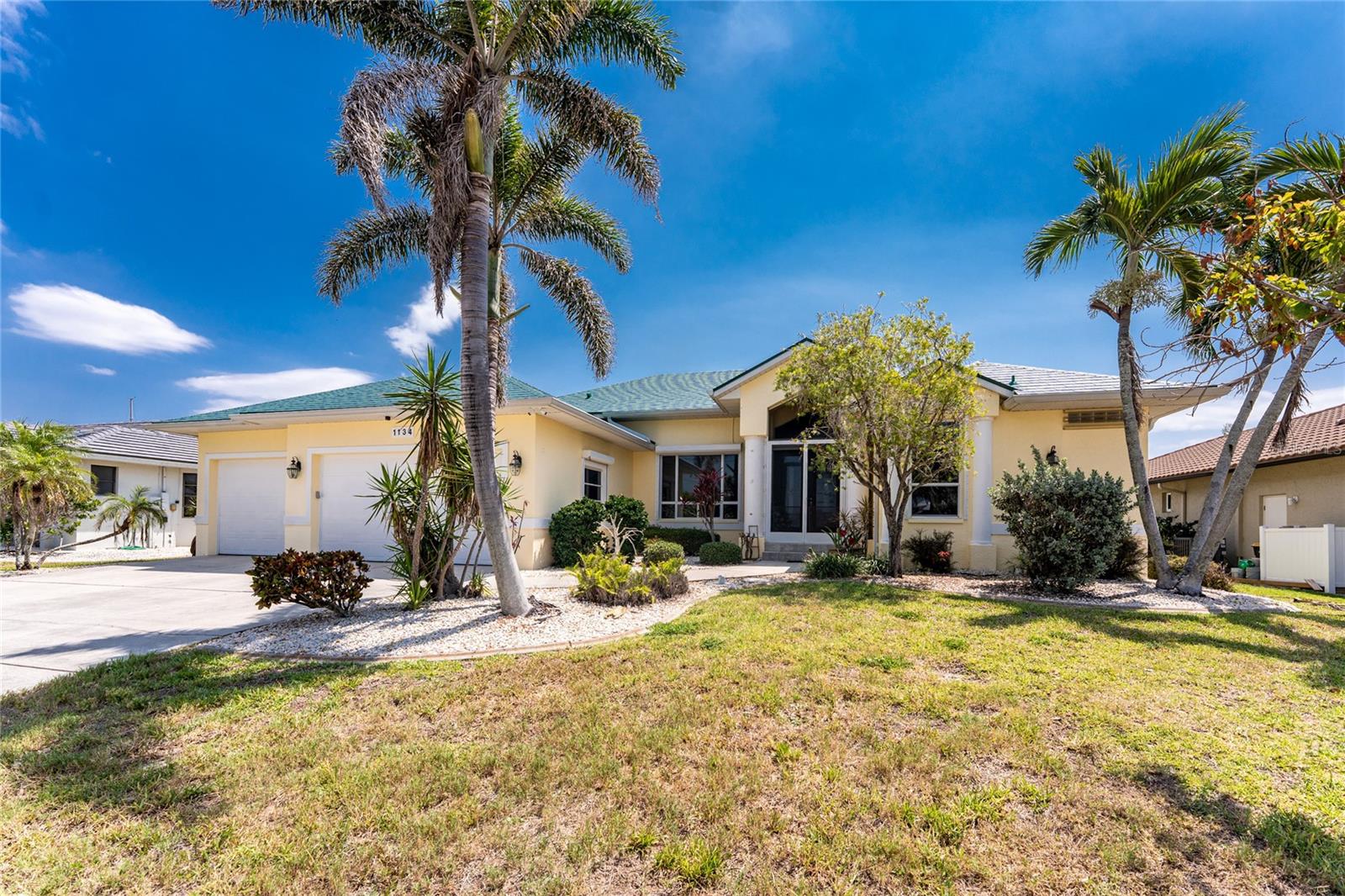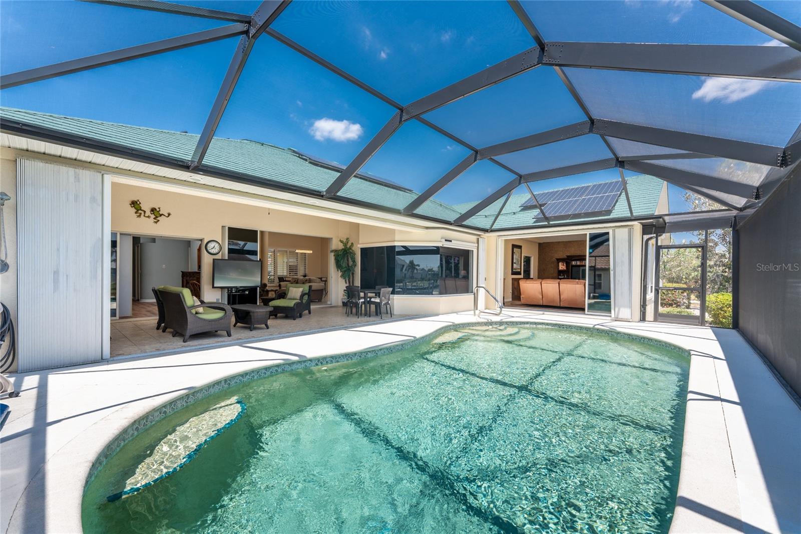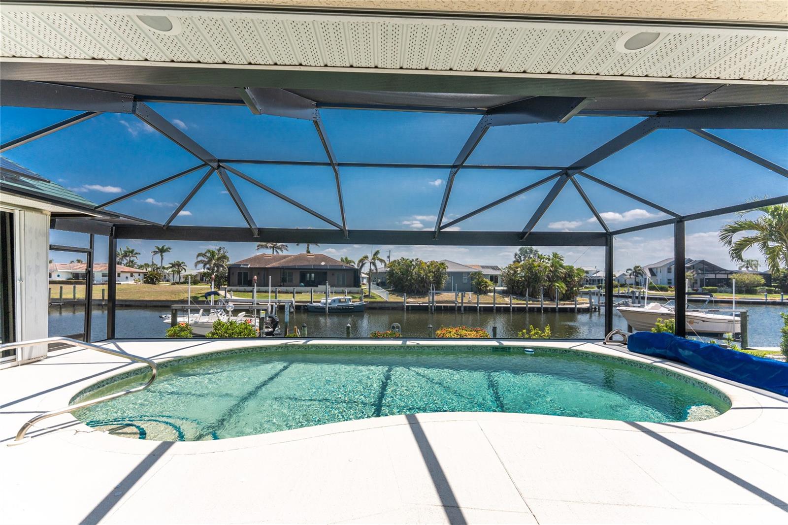 Impressive WATERFRONT home with INTERSECTING CANAL VIEW located in the desirable deed restricted community of PUNTA GORDA ISLES. QUICK SAILBOAT ACCESS to Charlotte Harbor and on to the Gulf of Mexico. This light and bright Towles custom home offers 3 Bedrooms 2.5 Bathrooms and attached oversized 3 Car Garage. ***This home was COMPLETELY REMODELED in 2022 (kitchen), 2023,2024*** There is an open and split bedroom floor plan with a Great Room, Family Room, well appointed Kitchen, separate Dining Room, Inside Laundry and screened Lanai. The Great Room features tile flooring, cathedral ceiling, plant shelves, pocket sliding glass doors to the Lanai and opens to the Kitchen. The stunning Kitchen offers wood cabinets, quartz counters and backsplash, breakfast bar, great storage and counter space, and stainless appliances. Appliances include double door refrigerator, oven/range with induction cooktop, TWO built in microwaves, dishwasher. There is also a Dining Area with aquarium glass offering an expansive view of the pool and water. The spacious Family Room features a cathedral ceiling, a wall of windows with water view, sliding glass doors to the lanai, luxury vinyl plank flooring. The Inside Laundry has a front loading washer, front loading dryer, cabinets and sink. The Master Bedroom suite is very spacious and offers a tray ceiling, walk in custom closets, luxury vinyl plank flooring, lanai access via sliding glass doors and private bathroom. The bathroom features dual sinks, vanity area, jetted tub and walk in shower with glass block. There are two generous sized bedrooms with double closets, one is currently being used as an office. The guest bathroom has a long vanity and tub/shower combination. Your living space extends to the screened Lanai with picture window screens (2023) to maximize the view. large covered area, heated (heat pump) inground pool, plenty of deck for sunbathing, half bath and FABULOUS WATER VIEWS. Continue to the waterfront with 85 foot concrete seawall maintained by the city of Punta Gorda, 30 foot concrete dock with water and electric and 20,000 lb boat lift. Other features include hurricane shutters, double door glass entry with transom window and double screen doors, plantation shutters, soaring ceilings, aluminum roof with slate embossed pattern and 50 year warranty, charging station with 220 outlet for electric vehicles in the garage, rain gutters, trees/landscaped, professionally installed Lorex security system with 3 cameras (driveway, front entrance, boat lifts). The aluminum roof panels interlock and are fastened in place with aluminum ring nails (no rusting). Utilities are city water and sewer. There are deed restrictions but NO HOA. Per owner: The 30 year Samsung solar panels provide whole house electricity during daylight hours, FPL bill runs approximately $65/ month in the winter. (average $46.72 for the last 12 months) The solar panels are paid for- No loan. This home is minutes from Golf, Fishermen's Village, the Visual Art Center and historic downtown Punta Gorda shopping, dining, medical care, waterfront parks, boat ramps, walking and biking paths, art galleries, Charlotte Harbor Event Center, weekend farmer and artisan markets, downtown weekend events and more. This is a beautiful home in a great community!