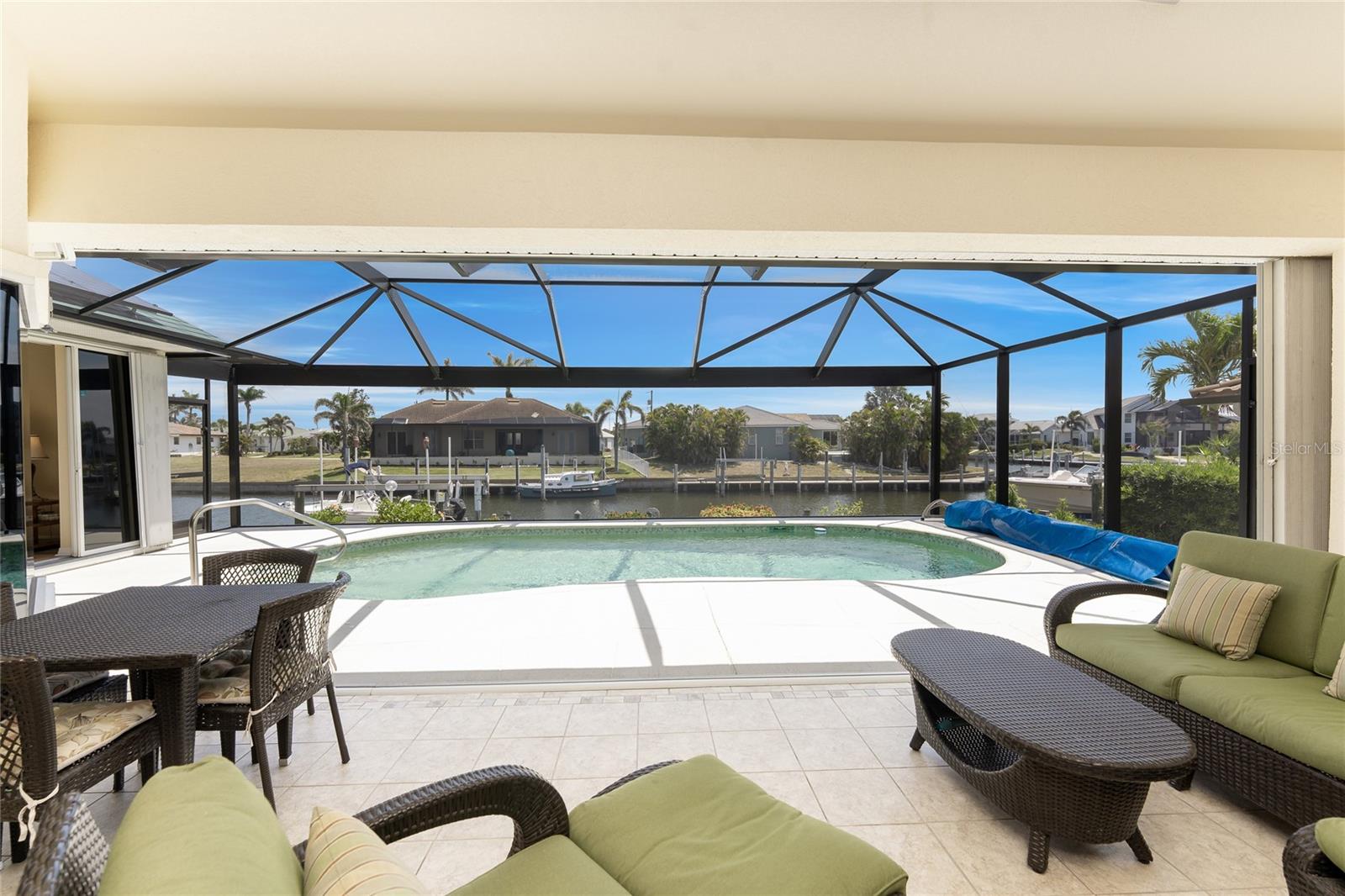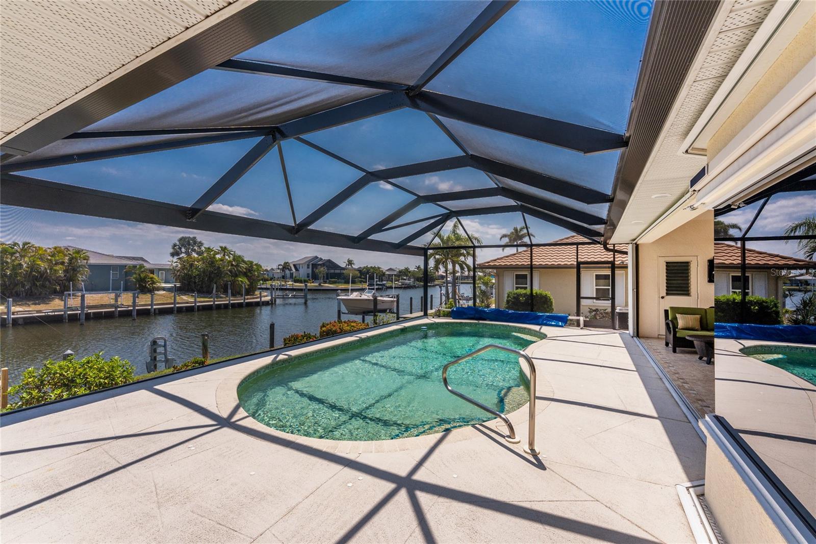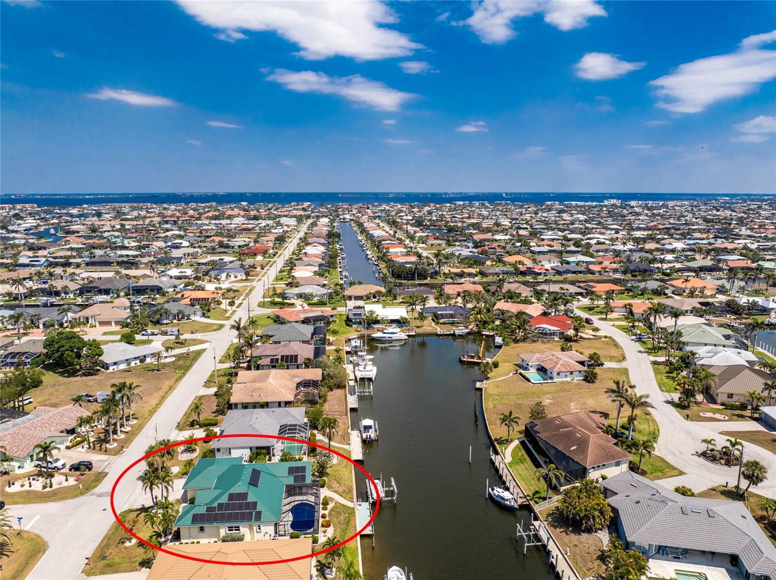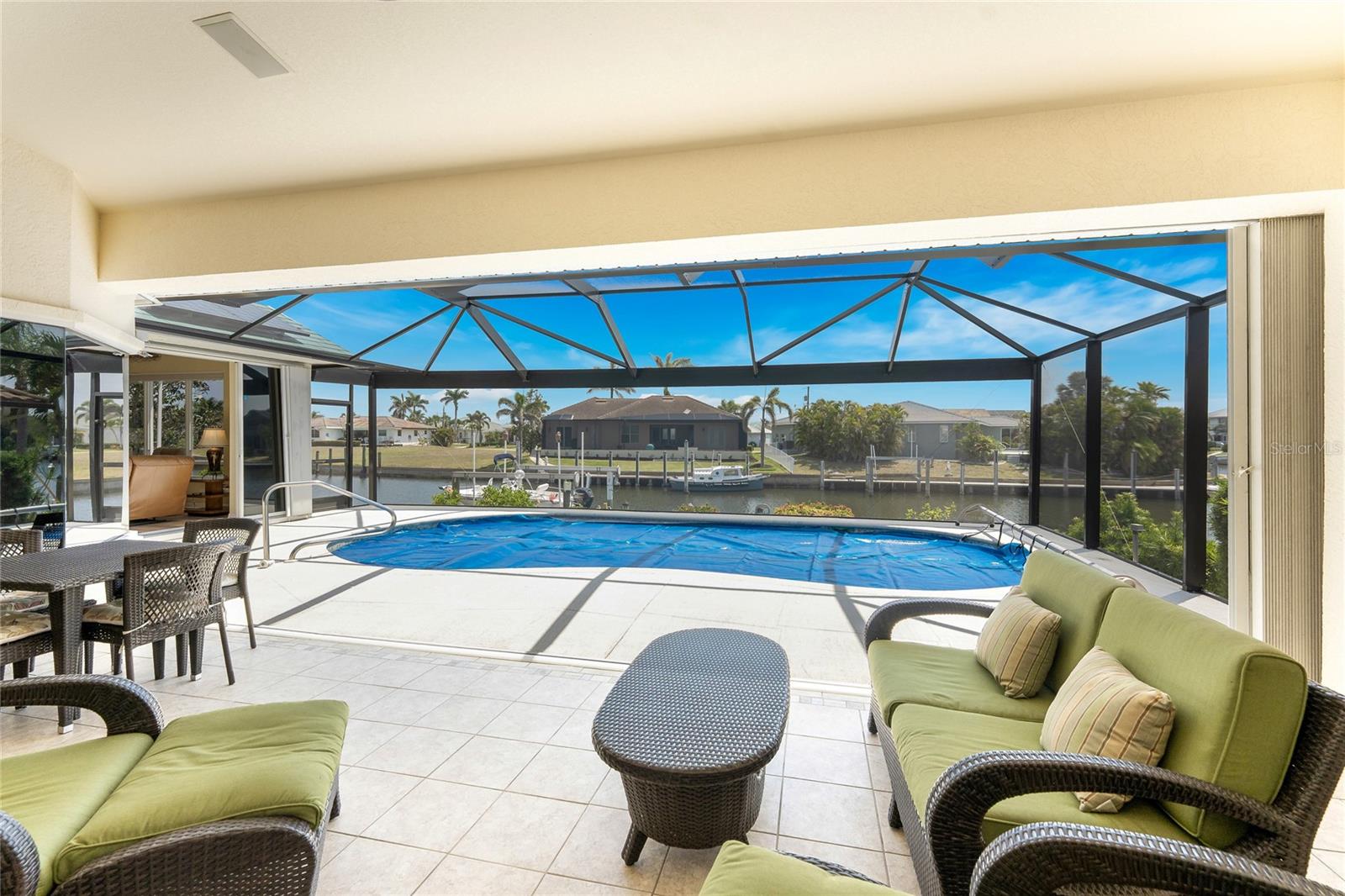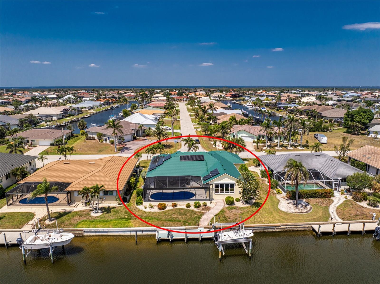 Impressive WATERFRONT home with INTERSECTING CANAL VIEW located in the desirable deed restricted community of PUNTA GORDA ISLES. QUICK SAILBOAT ACCESS to Charlotte Harbor and on to the Gulf of Mexico. This light and bright Towles custom home offers 3 Bedrooms 2.5 Bathrooms and attached oversized 3 Car Garage. ***This home was COMPLETELY REMODELED in 2022 (kitchen), 2023,2024*** There is an open and split bedroom floor plan with a Great Room, Family Room, well appointed Kitchen, separate Dining Room, Inside Laundry and screened Lanai. The Great Room features tile flooring, cathedral ceiling, plant shelves, pocket sliding glass doors to the Lanai and opens to the Kitchen. The stunning Kitchen offers wood cabinets, quartz counters and backsplash, breakfast bar, great storage and counter space, and stainless appliances. Appliances include double door refrigerator, oven/range with induction cooktop, TWO built in microwaves, dishwasher. There is also a Dining Area with aquarium glass offering an expansive view of the pool and water. The spacious Family Room features a cathedral ceiling, a wall of windows with water view, sliding glass doors to the lanai, luxury vinyl plank flooring. The Inside Laundry has a front loading washer, front loading dryer, cabinets and sink. The Master Bedroom suite is very spacious and offers a tray ceiling, walk in custom closets, luxury vinyl plank flooring, lanai access via sliding glass doors and private bathroom. The bathroom features dual sinks, vanity area, jetted tub and walk in shower with glass block. There are two generous sized bedrooms with double closets, one is currently being used as an office. The guest bathroom has a long vanity and tub/shower combination. Your living space extends to the screened Lanai with picture window screens (2023) to maximize the view. large covered area, heated (heat pump) inground pool, plenty of deck for sunbathing, half bath and FABULOUS WATER VIEWS. Continue to the waterfront with 85 foot concrete seawall maintained by the city of Punta Gorda, 30 foot concrete dock with water and electric and 20,000 lb boat lift. Other features include hurricane shutters, double door glass entry with transom window and double screen doors, plantation shutters, soaring ceilings, aluminum roof with slate embossed pattern and 50 year warranty, charging station with 220 outlet for electric vehicles in the garage, rain gutters, trees/landscaped, professionally installed Lorex security system with 3 cameras (driveway, front entrance, boat lifts). The aluminum roof panels interlock and are fastened in place with aluminum ring nails (no rusting). Utilities are city water and sewer. There are deed restrictions but NO HOA. Per owner: The 30 year Samsung solar panels provide whole house electricity during daylight hours, FPL bill runs approximately $65/ month in the winter. (average $46.72 for the last 12 months) The solar panels are paid for- No loan. This home is minutes from Golf, Fishermen's Village, the Visual Art Center and historic downtown Punta Gorda shopping, dining, medical care, waterfront parks, boat ramps, walking and biking paths, art galleries, Charlotte Harbor Event Center, weekend farmer and artisan markets, downtown weekend events and more. This is a beautiful home in a great community!