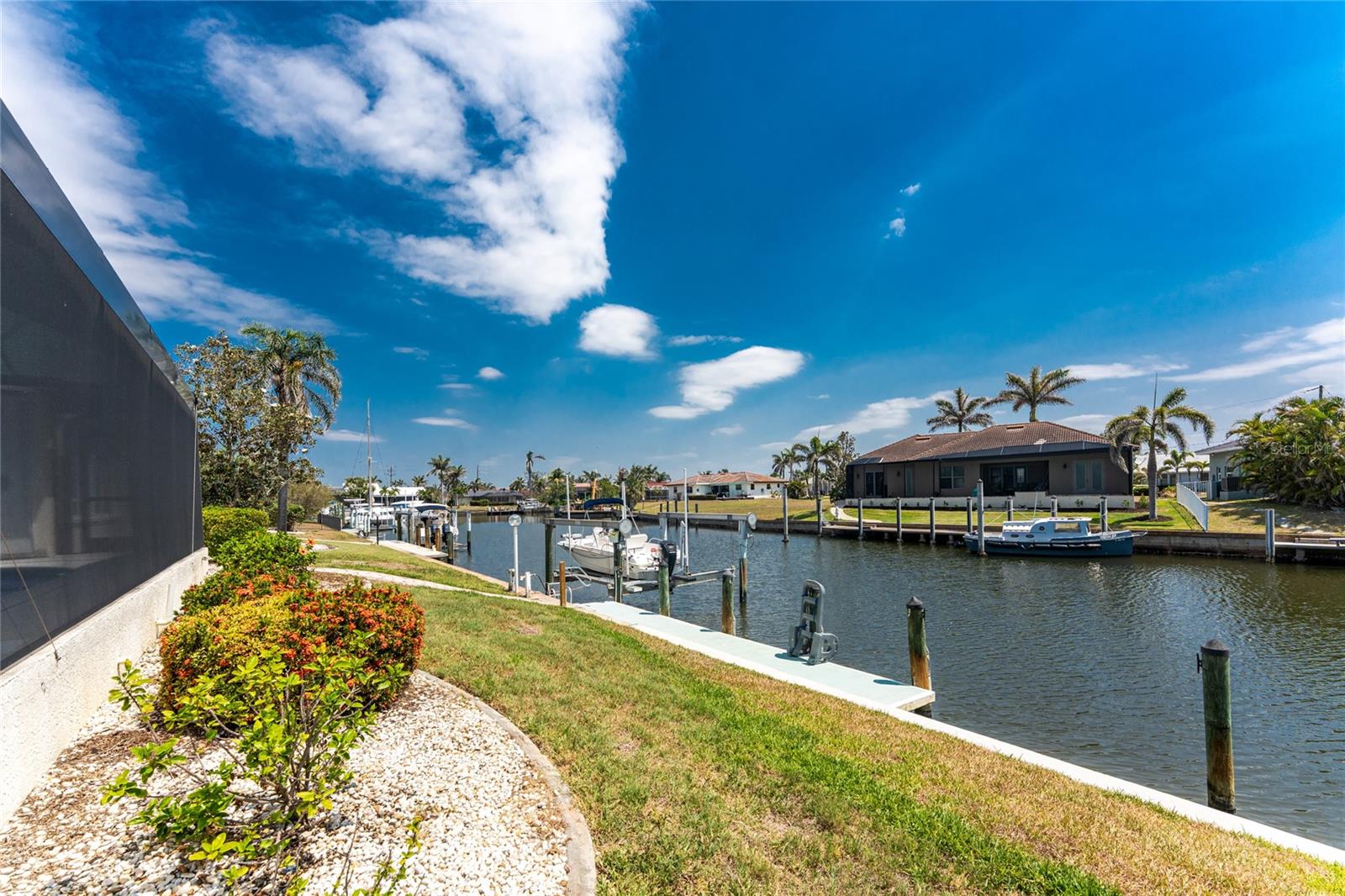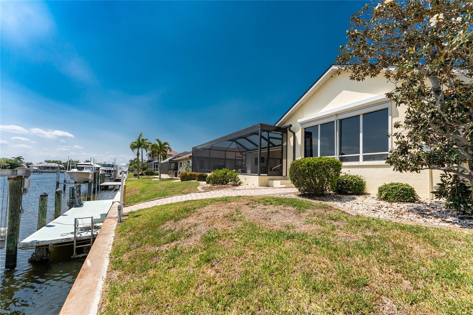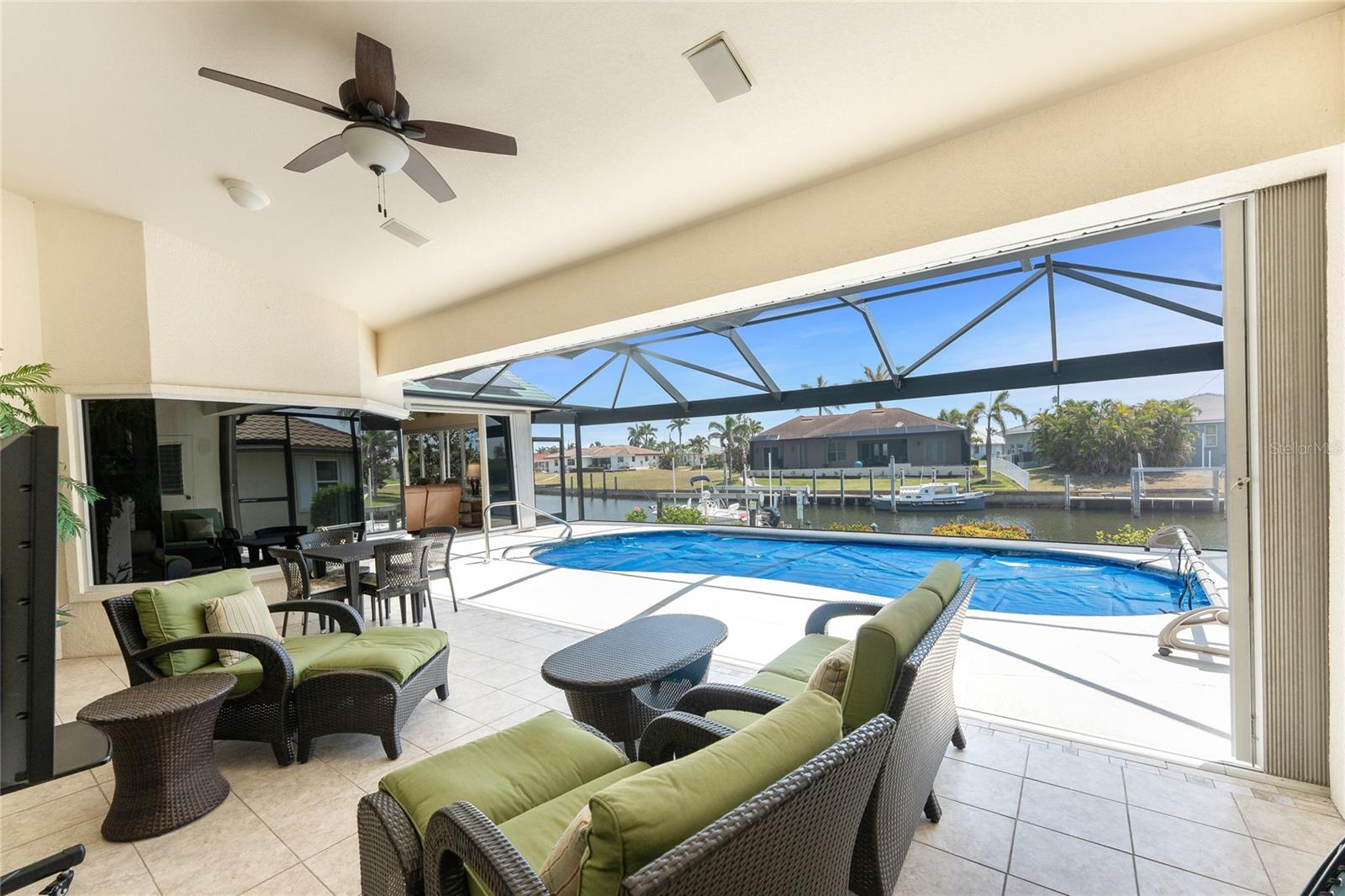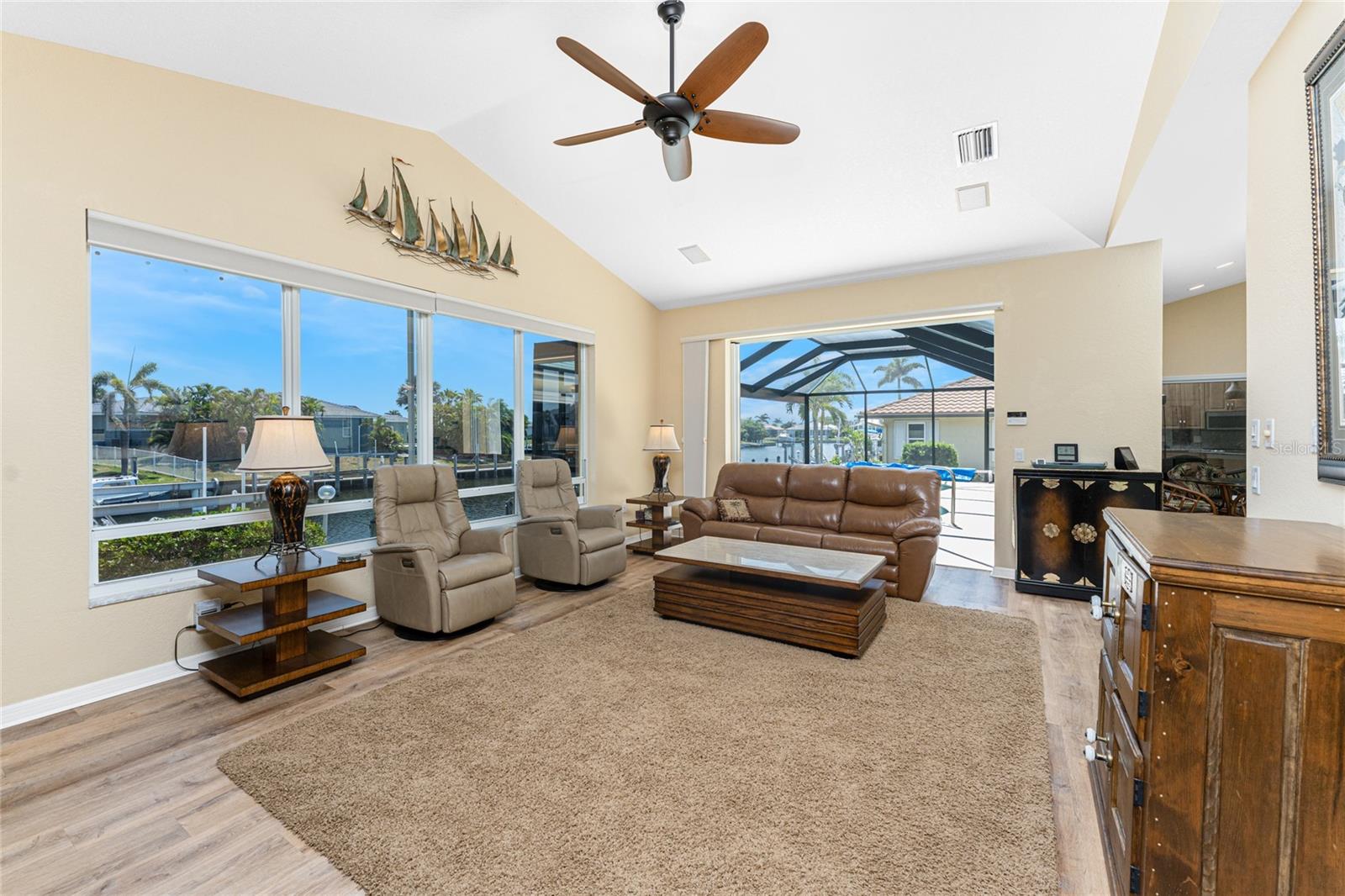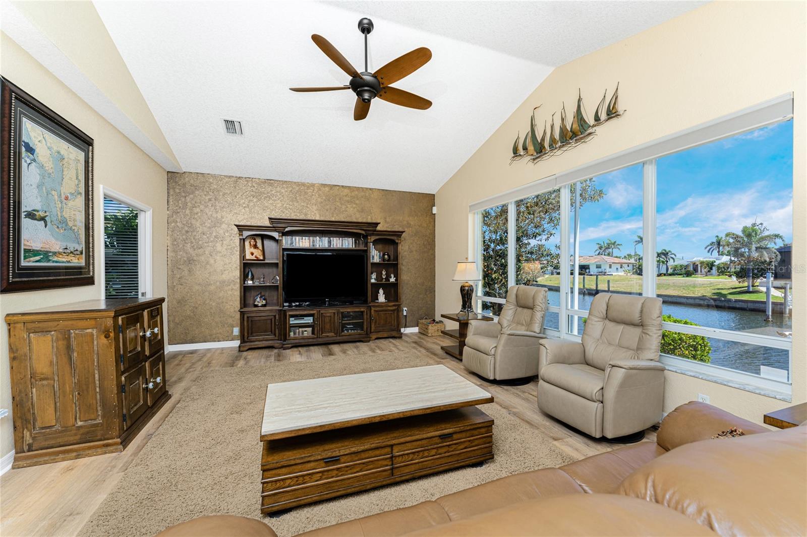 Impressive WATERFRONT home with INTERSECTING CANAL VIEW located in the desirable deed restricted community of PUNTA GORDA ISLES. QUICK SAILBOAT ACCESS to Charlotte Harbor and on to the Gulf of Mexico. This light and bright Towles custom home offers 3 Bedrooms 2.5 Bathrooms and attached oversized 3 Car Garage. ***This home was COMPLETELY REMODELED in 2022 (kitchen), 2023,2024*** There is an open and split bedroom floor plan with a Great Room, Family Room, well appointed Kitchen, separate Dining Room, Inside Laundry and screened Lanai. The Great Room features tile flooring, cathedral ceiling, plant shelves, pocket sliding glass doors to the Lanai and opens to the Kitchen. The stunning Kitchen offers wood cabinets, quartz counters and backsplash, breakfast bar, great storage and counter space, and stainless appliances. Appliances include double door refrigerator, oven/range with induction cooktop, TWO built in microwaves, dishwasher. There is also a Dining Area with aquarium glass offering an expansive view of the pool and water. The spacious Family Room features a cathedral ceiling, a wall of windows with water view, sliding glass doors to the lanai, luxury vinyl plank flooring. The Inside Laundry has a front loading washer, front loading dryer, cabinets and sink. The Master Bedroom suite is very spacious and offers a tray ceiling, walk in custom closets, luxury vinyl plank flooring, lanai access via sliding glass doors and private bathroom. The bathroom features dual sinks, vanity area, jetted tub and walk in shower with glass block. There are two generous sized bedrooms with double closets, one is currently being used as an office. The guest bathroom has a long vanity and tub/shower combination. Your living space extends to the screened Lanai with picture window screens (2023) to maximize the view. large covered area, heated (heat pump) inground pool, plenty of deck for sunbathing, half bath and FABULOUS WATER VIEWS. Continue to the waterfront with 85 foot concrete seawall maintained by the city of Punta Gorda, 30 foot concrete dock with water and electric and 20,000 lb boat lift. Other features include hurricane shutters, double door glass entry with transom window and double screen doors, plantation shutters, soaring ceilings, aluminum roof with slate embossed pattern and 50 year warranty, charging station with 220 outlet for electric vehicles in the garage, rain gutters, trees/landscaped, professionally installed Lorex security system with 3 cameras (driveway, front entrance, boat lifts). The aluminum roof panels interlock and are fastened in place with aluminum ring nails (no rusting). Utilities are city water and sewer. There are deed restrictions but NO HOA. Per owner: The 30 year Samsung solar panels provide whole house electricity during daylight hours, FPL bill runs approximately $65/ month in the winter. (average $46.72 for the last 12 months) The solar panels are paid for- No loan. This home is minutes from Golf, Fishermen's Village, the Visual Art Center and historic downtown Punta Gorda shopping, dining, medical care, waterfront parks, boat ramps, walking and biking paths, art galleries, Charlotte Harbor Event Center, weekend farmer and artisan markets, downtown weekend events and more. This is a beautiful home in a great community!