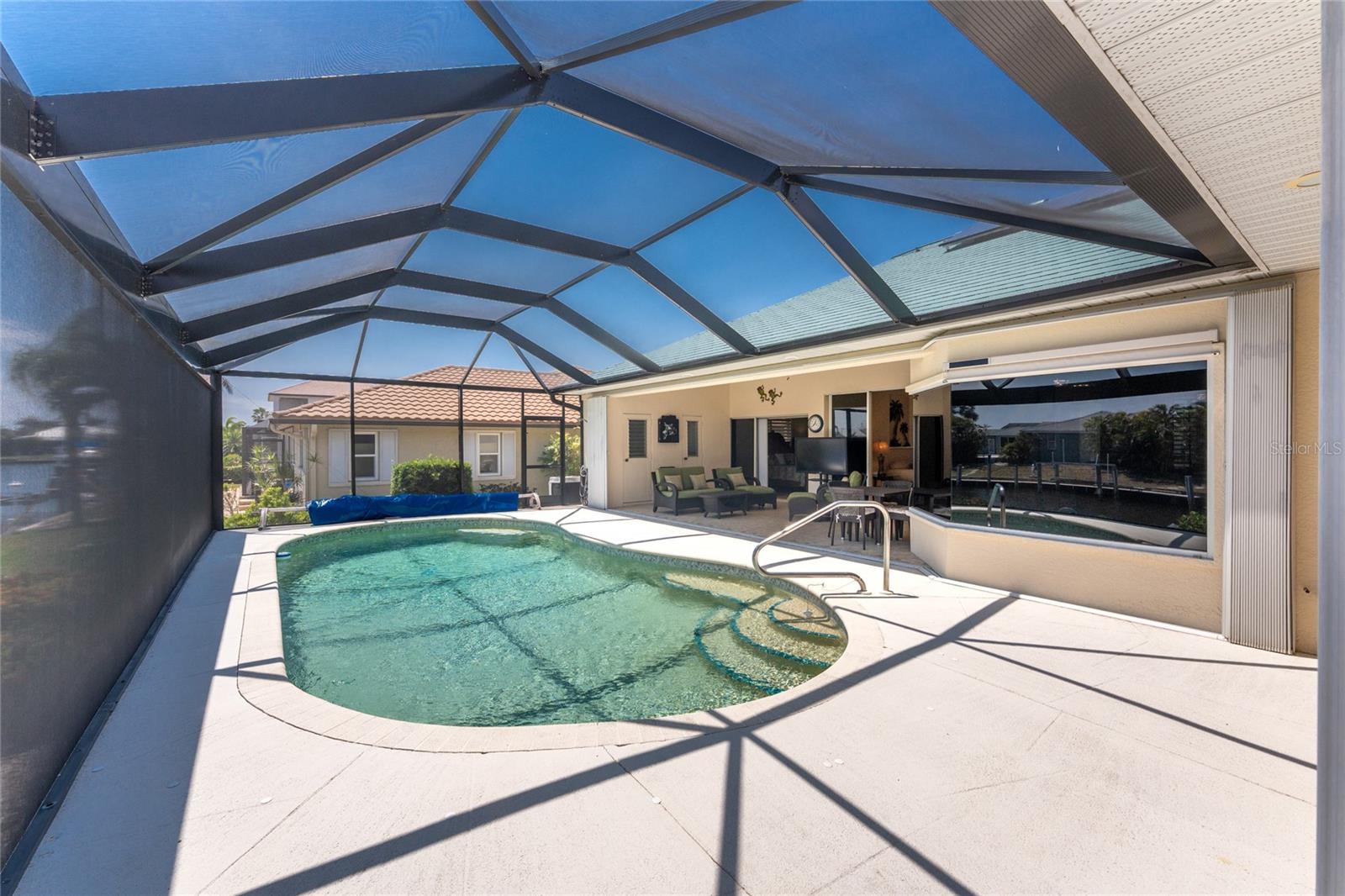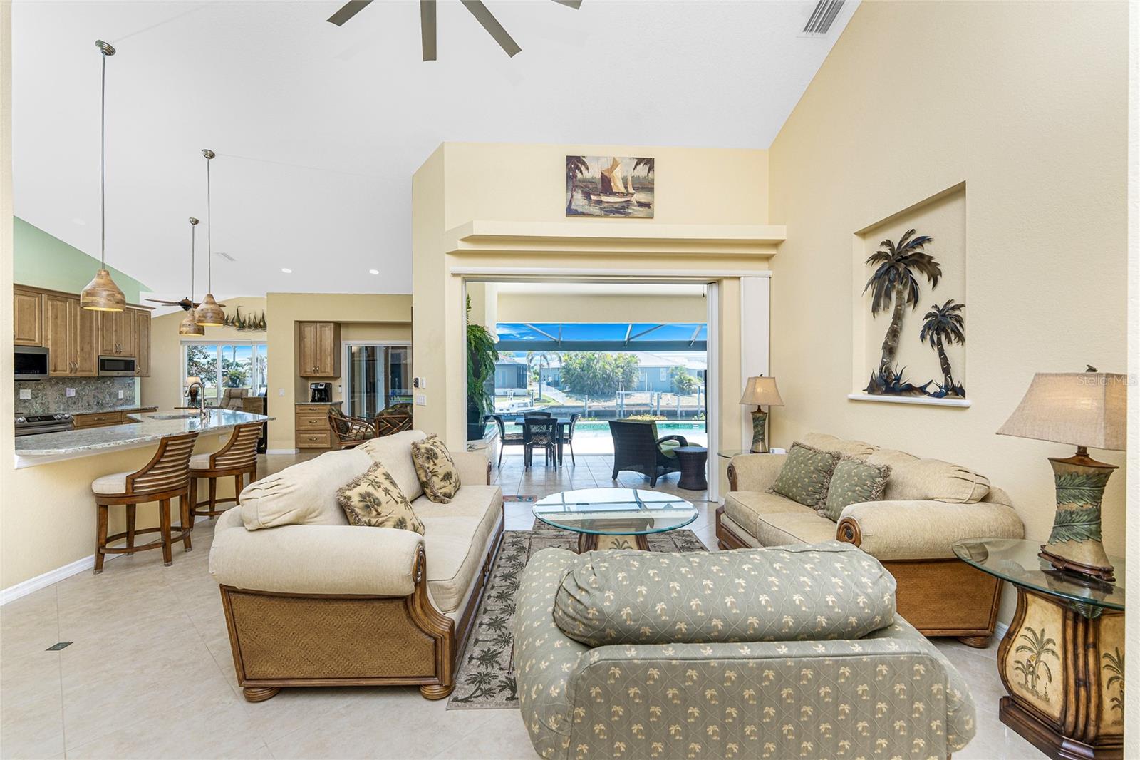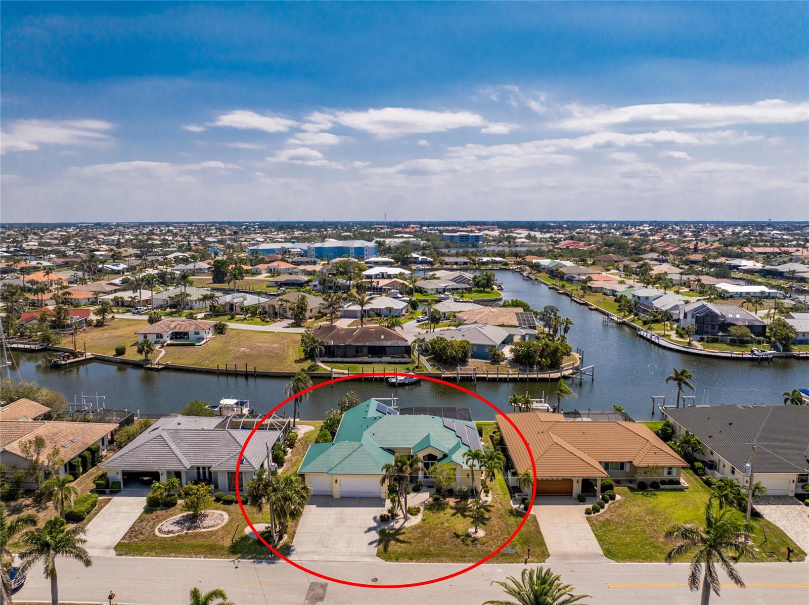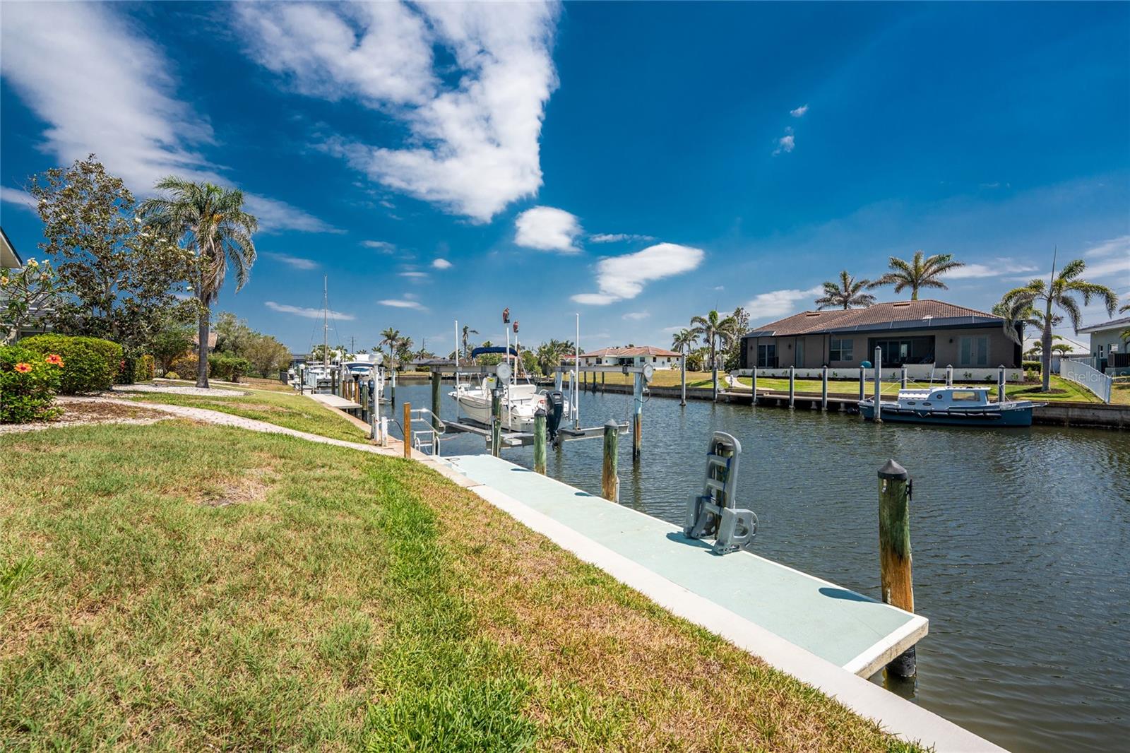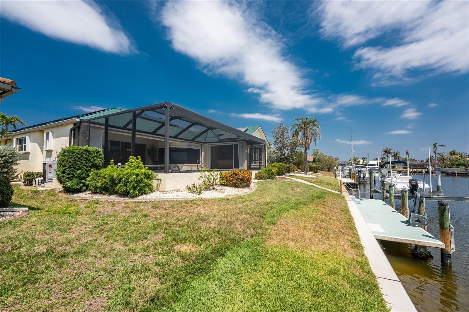 Impressive WATERFRONT home with INTERSECTING CANAL VIEW located in the desirable deed restricted community of PUNTA GORDA ISLES. QUICK SAILBOAT ACCESS to Charlotte Harbor and on to the Gulf of Mexico. This light and bright Towles custom home offers 3 Bedrooms 2.5 Bathrooms and attached oversized 3 Car Garage. ***This home was COMPLETELY REMODELED in 2022 (kitchen), 2023,2024*** There is an open and split bedroom floor plan with a Great Room, Family Room, well appointed Kitchen, separate Dining Room, Inside Laundry and screened Lanai. The Great Room features tile flooring, cathedral ceiling, plant shelves, pocket sliding glass doors to the Lanai and opens to the Kitchen. The stunning Kitchen offers wood cabinets, quartz counters and backsplash, breakfast bar, great storage and counter space, and stainless appliances. Appliances include double door refrigerator, oven/range with induction cooktop, TWO built in microwaves, dishwasher. There is also a Dining Area with aquarium glass offering an expansive view of the pool and water. The spacious Family Room features a cathedral ceiling, a wall of windows with water view, sliding glass doors to the lanai, luxury vinyl plank flooring. The Inside Laundry has a front loading washer, front loading dryer, cabinets and sink. The Master Bedroom suite is very spacious and offers a tray ceiling, walk in custom closets, luxury vinyl plank flooring, lanai access via sliding glass doors and private bathroom. The bathroom features dual sinks, vanity area, jetted tub and walk in shower with glass block. There are two generous sized bedrooms with double closets, one is currently being used as an office. The guest bathroom has a long vanity and tub/shower combination. Your living space extends to the screened Lanai with picture window screens (2023) to maximize the view. large covered area, heated (heat pump) inground pool, plenty of deck for sunbathing, half bath and FABULOUS WATER VIEWS. Continue to the waterfront with 85 foot concrete seawall maintained by the city of Punta Gorda, 30 foot concrete dock with water and electric and 20,000 lb boat lift. Other features include hurricane shutters, double door glass entry with transom window and double screen doors, plantation shutters, soaring ceilings, aluminum roof with slate embossed pattern and 50 year warranty, charging station with 220 outlet for electric vehicles in the garage, rain gutters, trees/landscaped, professionally installed Lorex security system with 3 cameras (driveway, front entrance, boat lifts). The aluminum roof panels interlock and are fastened in place with aluminum ring nails (no rusting). Utilities are city water and sewer. There are deed restrictions but NO HOA. Per owner: The 30 year Samsung solar panels provide whole house electricity during daylight hours, FPL bill runs approximately $65/ month in the winter. (average $46.72 for the last 12 months) The solar panels are paid for- No loan. This home is minutes from Golf, Fishermen's Village, the Visual Art Center and historic downtown Punta Gorda shopping, dining, medical care, waterfront parks, boat ramps, walking and biking paths, art galleries, Charlotte Harbor Event Center, weekend farmer and artisan markets, downtown weekend events and more. This is a beautiful home in a great community!