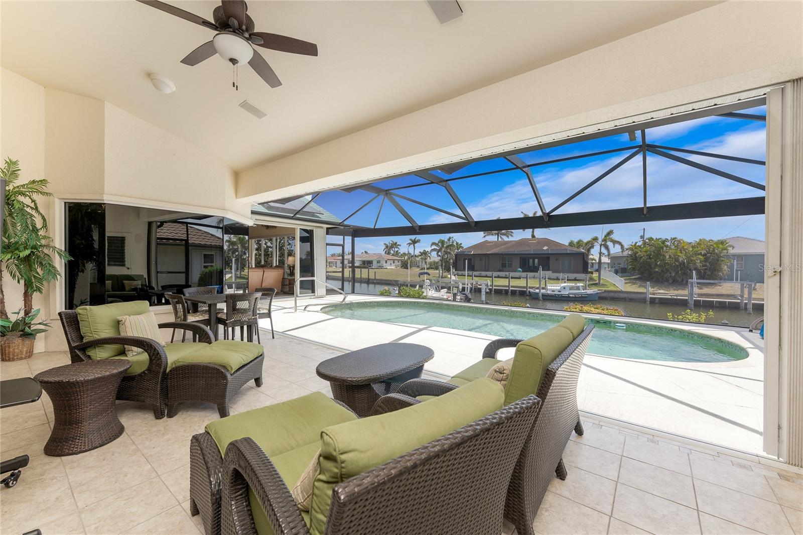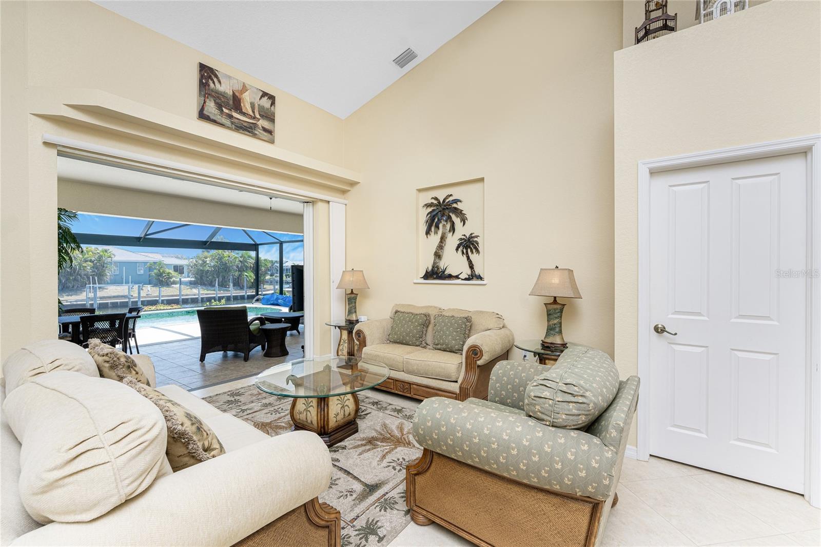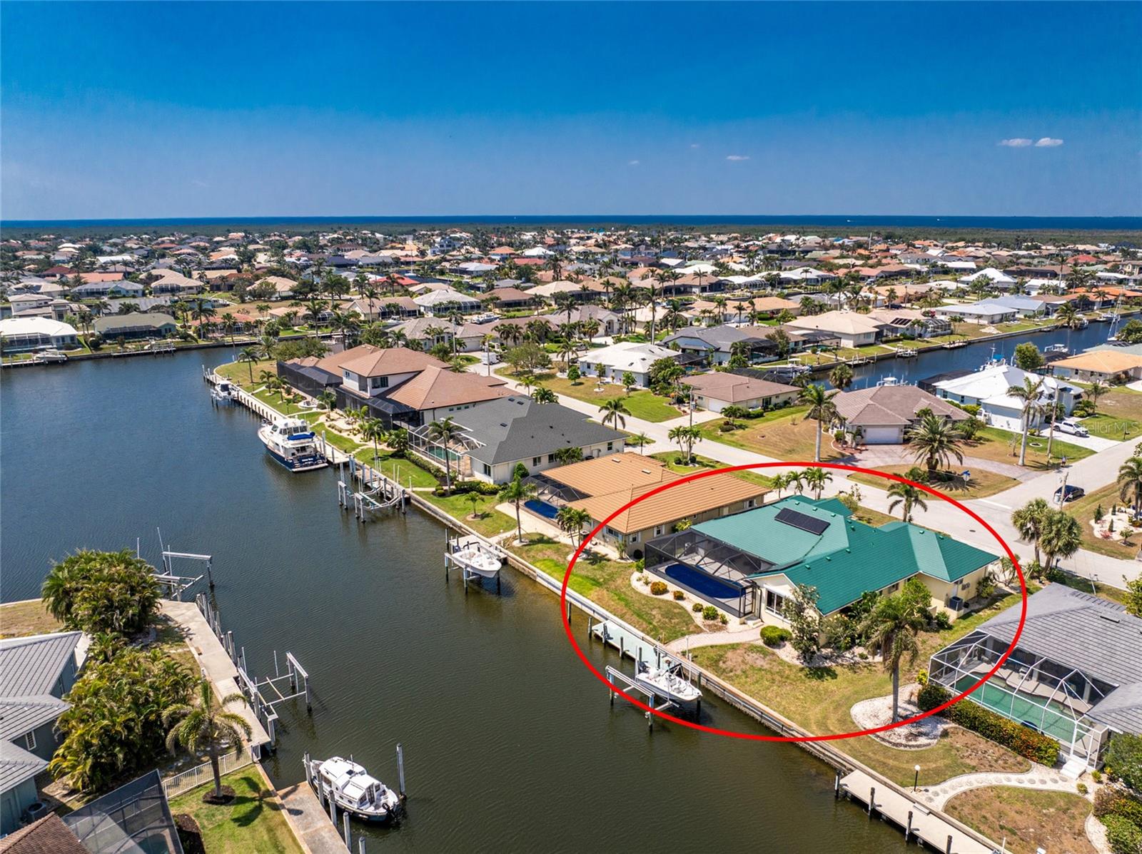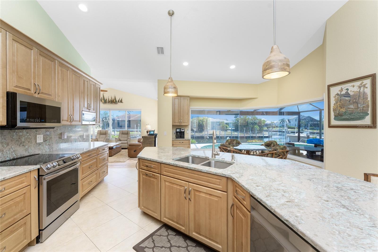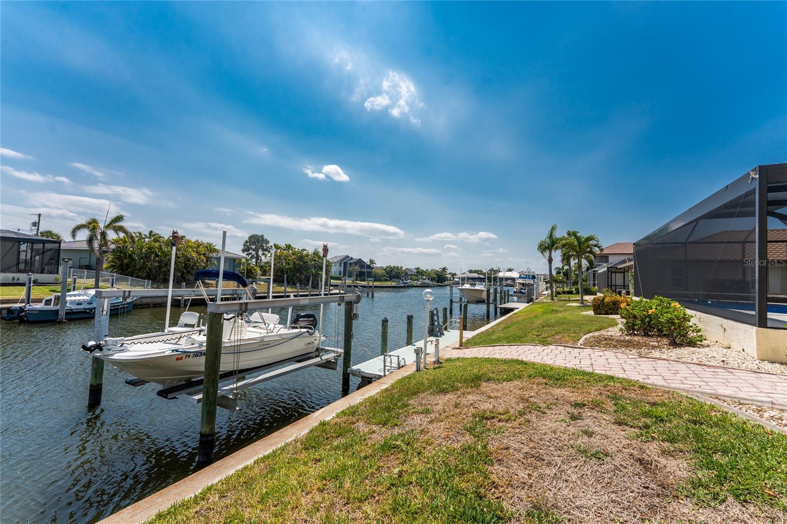 Impressive WATERFRONT home with INTERSECTING CANAL VIEW located in the desirable deed restricted community of PUNTA GORDA ISLES. QUICK SAILBOAT ACCESS to Charlotte Harbor and on to the Gulf of Mexico. This light and bright Towles custom home offers 3 Bedrooms 2.5 Bathrooms and attached oversized 3 Car Garage. ***This home was COMPLETELY REMODELED in 2022 (kitchen), 2023,2024*** There is an open and split bedroom floor plan with a Great Room, Family Room, well appointed Kitchen, separate Dining Room, Inside Laundry and screened Lanai. The Great Room features tile flooring, cathedral ceiling, plant shelves, pocket sliding glass doors to the Lanai and opens to the Kitchen. The stunning Kitchen offers wood cabinets, quartz counters and backsplash, breakfast bar, great storage and counter space, and stainless appliances. Appliances include double door refrigerator, oven/range with induction cooktop, TWO built in microwaves, dishwasher. There is also a Dining Area with aquarium glass offering an expansive view of the pool and water. The spacious Family Room features a cathedral ceiling, a wall of windows with water view, sliding glass doors to the lanai, luxury vinyl plank flooring. The Inside Laundry has a front loading washer, front loading dryer, cabinets and sink. The Master Bedroom suite is very spacious and offers a tray ceiling, walk in custom closets, luxury vinyl plank flooring, lanai access via sliding glass doors and private bathroom. The bathroom features dual sinks, vanity area, jetted tub and walk in shower with glass block. There are two generous sized bedrooms with double closets, one is currently being used as an office. The guest bathroom has a long vanity and tub/shower combination. Your living space extends to the screened Lanai with picture window screens (2023) to maximize the view. large covered area, heated (heat pump) inground pool, plenty of deck for sunbathing, half bath and FABULOUS WATER VIEWS. Continue to the waterfront with 85 foot concrete seawall maintained by the city of Punta Gorda, 30 foot concrete dock with water and electric and 20,000 lb boat lift. Other features include hurricane shutters, double door glass entry with transom window and double screen doors, plantation shutters, soaring ceilings, aluminum roof with slate embossed pattern and 50 year warranty, charging station with 220 outlet for electric vehicles in the garage, rain gutters, trees/landscaped, professionally installed Lorex security system with 3 cameras (driveway, front entrance, boat lifts). The aluminum roof panels interlock and are fastened in place with aluminum ring nails (no rusting). Utilities are city water and sewer. There are deed restrictions but NO HOA. Per owner: The 30 year Samsung solar panels provide whole house electricity during daylight hours, FPL bill runs approximately $65/ month in the winter. (average $46.72 for the last 12 months) The solar panels are paid for- No loan. This home is minutes from Golf, Fishermen's Village, the Visual Art Center and historic downtown Punta Gorda shopping, dining, medical care, waterfront parks, boat ramps, walking and biking paths, art galleries, Charlotte Harbor Event Center, weekend farmer and artisan markets, downtown weekend events and more. This is a beautiful home in a great community!