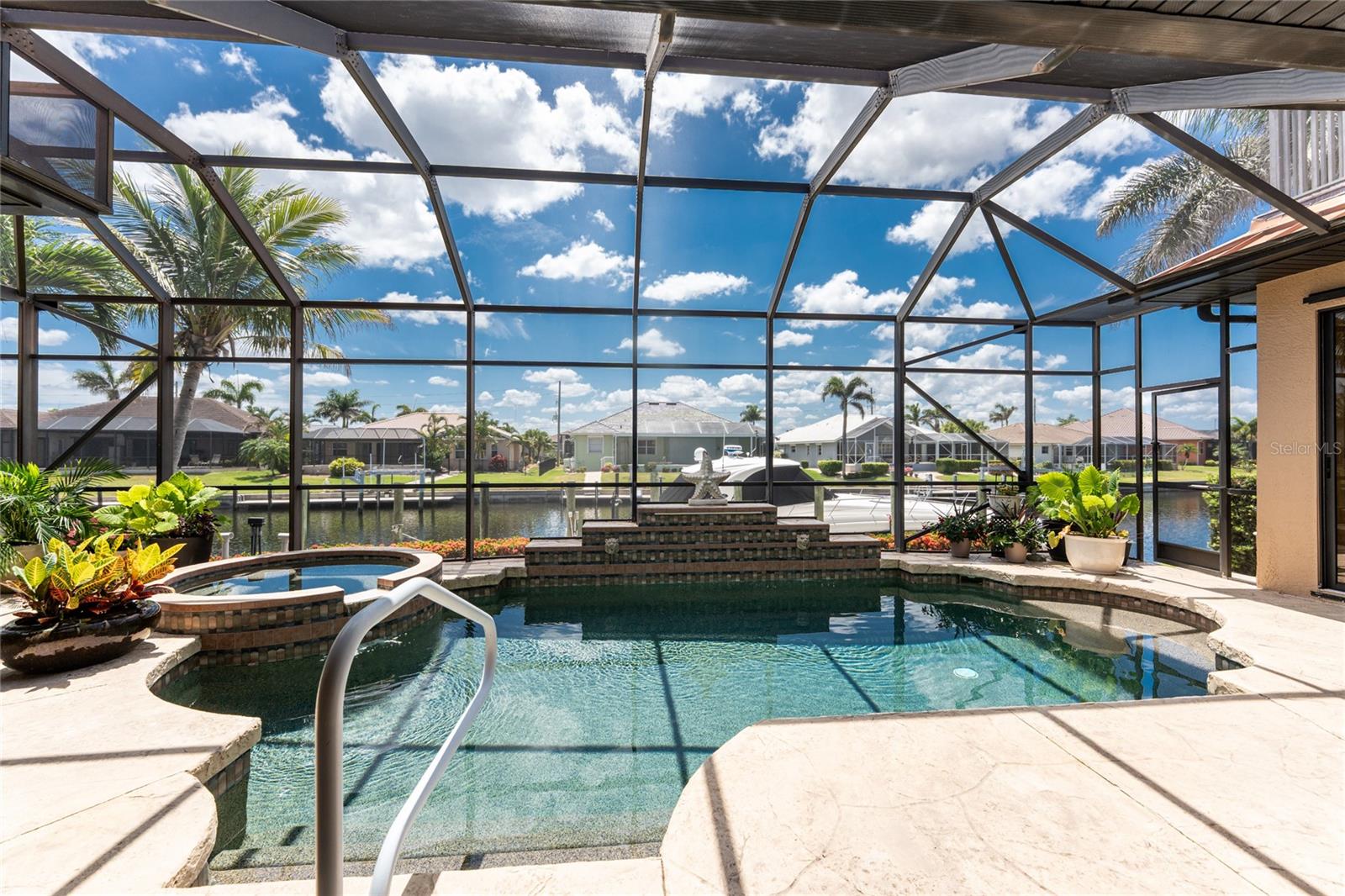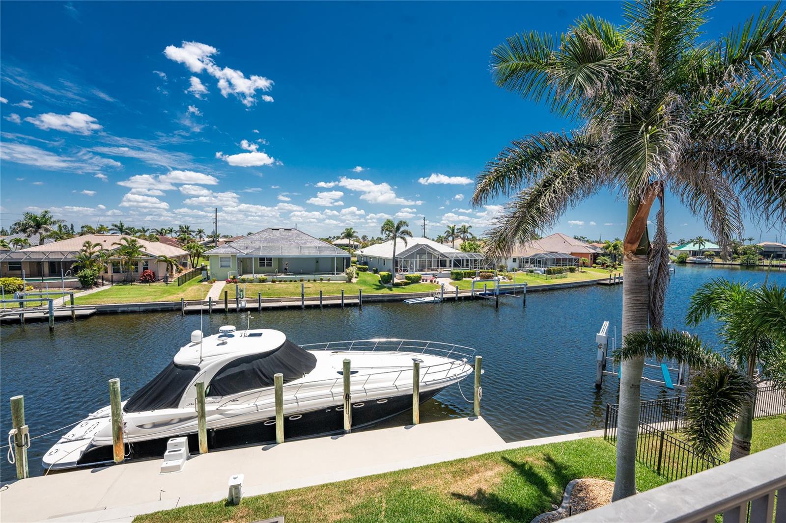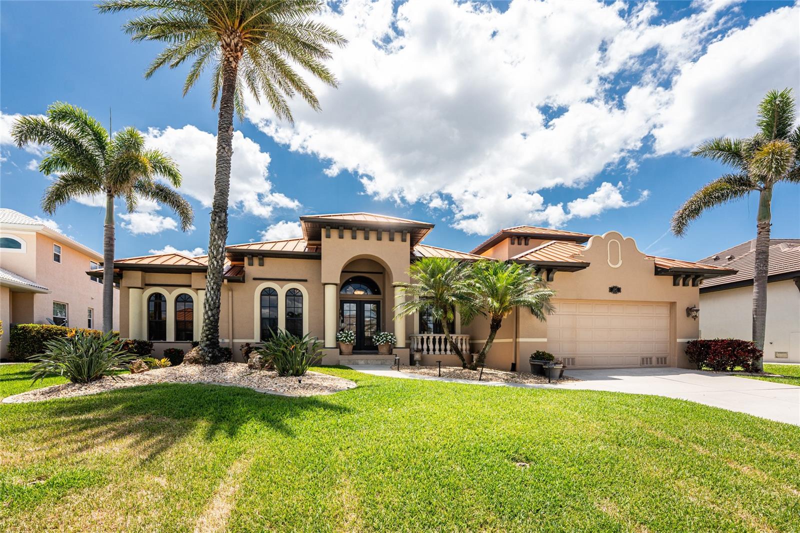Stunning WATERFRONT custom pool home located in desirable deed restricted PUNTA GORDA ISLES. SAILBOAT ACCESS to Charlotte Harbor and on to the Gulf from the 97 FOOT concrete seawall (maintained by the city of Punta Gorda) and 82 FOOT concrete DOCK with 50 amp service and Slidemoors that were rebuilt in 2023. This 3 Bedroom, 2 full Bathroom and 2 half Bathroom home with attached 2 Car Garage has gorgeous design features throughout the home. There is a Great Room, separate Dining Room, well appointed Kitchen, Study/Den with 2 large windows, Inside Laundry and Bonus Room on the second floor. The Great Room features diagonal lay 18 inch tile flooring, double tray ceiling, zero corner sliding glass doors lead to the Lanai. There is a separate Dining Room with large windows with transom windows, tray ceiling and French doors to balcony. The Kitchen features stone counters, wood cabinets with crown molding and some with glass doors, tile backsplash, breakfast bar, double sink, large island, large pantry closet, stainless appliances. Appliances include French door refrigerator, oven/range with gas cooktop/hood, dishwasher, built in microwave and oven. The large Dining area in the Kitchen has aquarium glass overlooking the pool and water and access to the lanai via sliding glass doors. The Inside Laundry has a washer, dryer, cabinet with sink, 2 large windows and shelf. There is a Bonus Room on the second floor currently used as a media room, wet bar with under counter refrigerator, sink, stone counter and wood cabinet. A glass door leads to a 14x14 open covered porch with extensive water views. The bedrooms are on the first floor. The Master Bedroom suite offers a tray ceiling, sliding glass doors to the lanai, walk in closet and private bathroom. The Bathroom features two large antique style his and hers vanities with sinks, stone counters and wood mirrors. There is a garden tub and walk in shower. There are two generous sized guest bedrooms with double closets and storage above. Your living space extends to the screened Lanai. The covered area has tile flooring, ceiling fan, half bath, and summer Kitchen with gas grill, hood, under counter refrigerator and sink. There is an outdoor shower, saltwater inground pool and spa with variable speed pump and fabulous water views. Other features include ** NEW METAL ROOF AUG 2024**, hurricane shutters, water softener, Mediterranean style architecture, lush tropical landscaping, rain gutters, double door entry with transom window, tile floors throughout the living areas, carpet in the bedrooms, recirculating pump on the hot water system, 14 foot ceilings, 8 foot doors. Second floor door and windows are storm resistant- hurricane shutters for other openings. There are two A/C systems- one for the first floor and a unit with variable speed motor for the second floor. are city water and sewer. There are deed restrictions but NO HOA. This home is 5 minutes from Golf and 10 minutes from Fishermen's Village and historic downtown Punta Gorda shopping, dining, medical care, waterfront parks, boat ramps, walking and biking paths, art galleries, Charlotte Harbor Event Center, weekend farmer and artisan markets, downtown events and more!