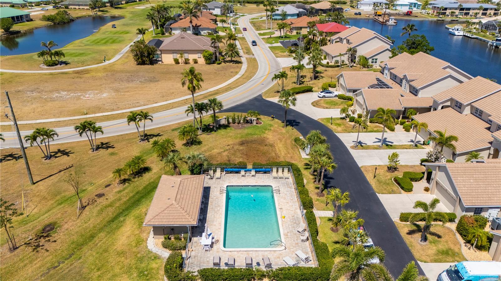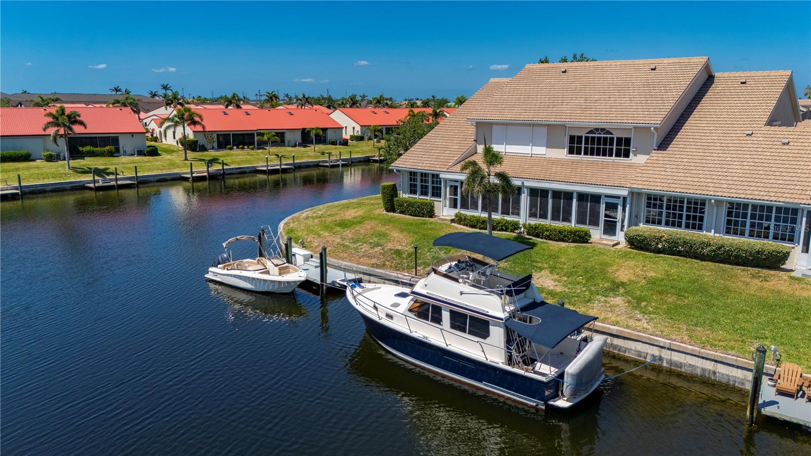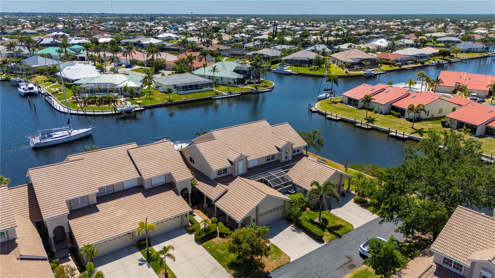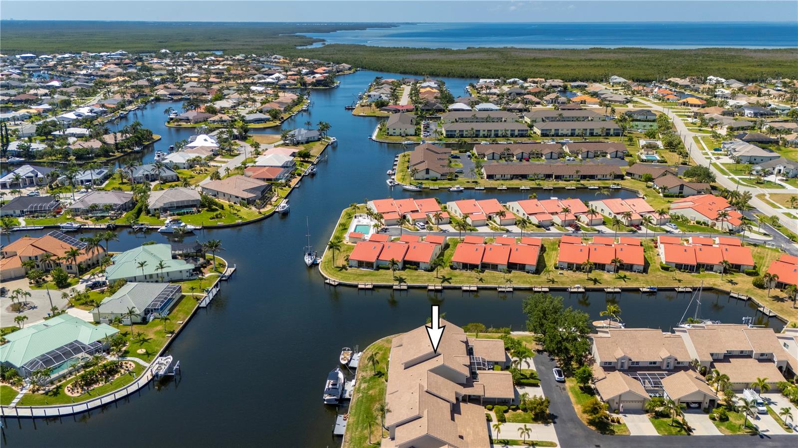 One or more photo(s) has been virtually staged. THE TIME IS NOW to get a GREAT DEAL, on this updated townhouse style PUNTA GORDA ISLES condo with GREAT WATERFRONT VIEWS, and GREAT BOATING ACCESS. Everything is GREAT in Punta Gorda, especially in this NAVIGABLE WATERFRONT 3/2.5/2 condo with a private spa. You'll REACH OPEN WATER in less than 15 minutes. EXPANSIVE VIEW of the intersecting canals make this unit the one to call home. East Facing Great Room gets flooded with Florida Sunshine. There's a built-in down draft Jenn-Aire Grill in the 4 season sunroom/lanai. The SECOND lanai space is a private screened courtyard lanai off the FIRST FLOOR MASTER SUITE and it's where you'll find the in-ground heated SPA. Exit to the spa from either the updated master bathroom or the spacious master bedroom, both rooms lead into the private courtyard lanai. The updated kitchen features solid wood cabinetry, granite counters, breakfast bar with solid surface countertop and two built-in desks. There is a formal dining room for entertaining. Indoor Laundry Room with adjacent storage room. A 1/2 bath on the first floor. Upstairs you'll enjoy the second story waterfront views from the OPEN LOFT SPACE... an awesome spot for a home office or fitness room. The upstairs also features two guest bedrooms with a jack-and-jill style full bathroom between them. Easy-peasy electric powered hurricane roll-down shutters. Community amenities include the in-ground, heated swimming pool and restrooms at the pool area. The entire complex had new TILE ROOFING installed (Aug '23) The DEEDED DOCK has POWER and WATER and space enough for up to a 35 foot vessel. Harbor Landings HOA has approved the installation of boat lifts! St. Andrews South Golf Course is across the street and their clubhouse is less than a mile away. The Isles Yacht Club is only 2 miles away. Grocery shopping is only 4 miles away. There is always something happening in Punta Gorda. PGI property owners can also join the Punta Gorda Isles Civic Association and its many, varied clubs such as social groups like Newcomers, Just for Fun and Paradise Friends, fishing club (earn a master fisherman designation), garden club, boating club, bridge and mahjong. The Punta Gorda area has multiple golf courses within easy distance, tennis, pickleball, hiking and biking routes, Hounds on Henry dog park, public boat ramps at Ponce Park and Marina Park, weekend farmer markets, Visual Arts Center, Charlotte County Event Center, Charlotte County Library, award winning restaurants and much more. Call today and start to Live the Gulf Life!