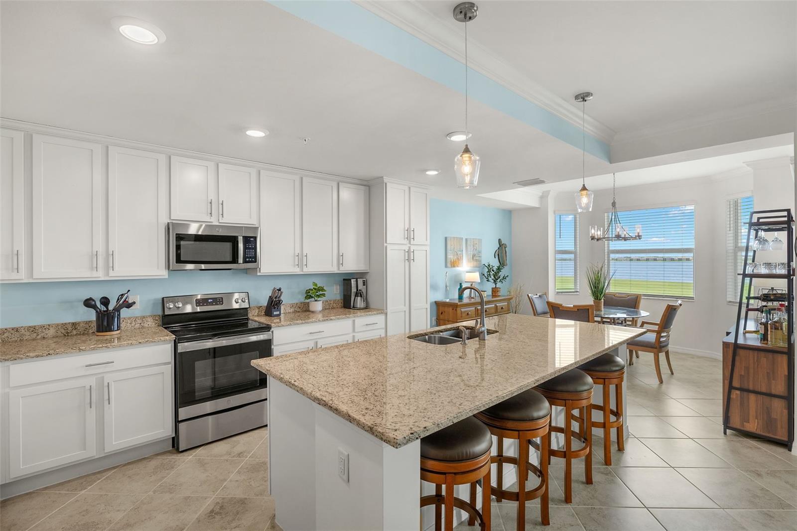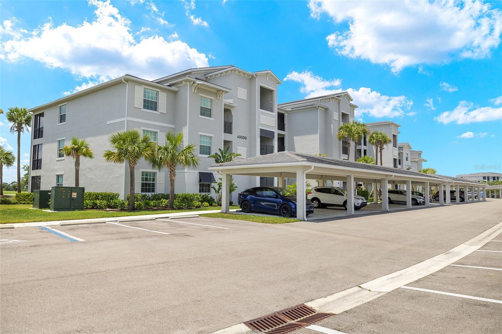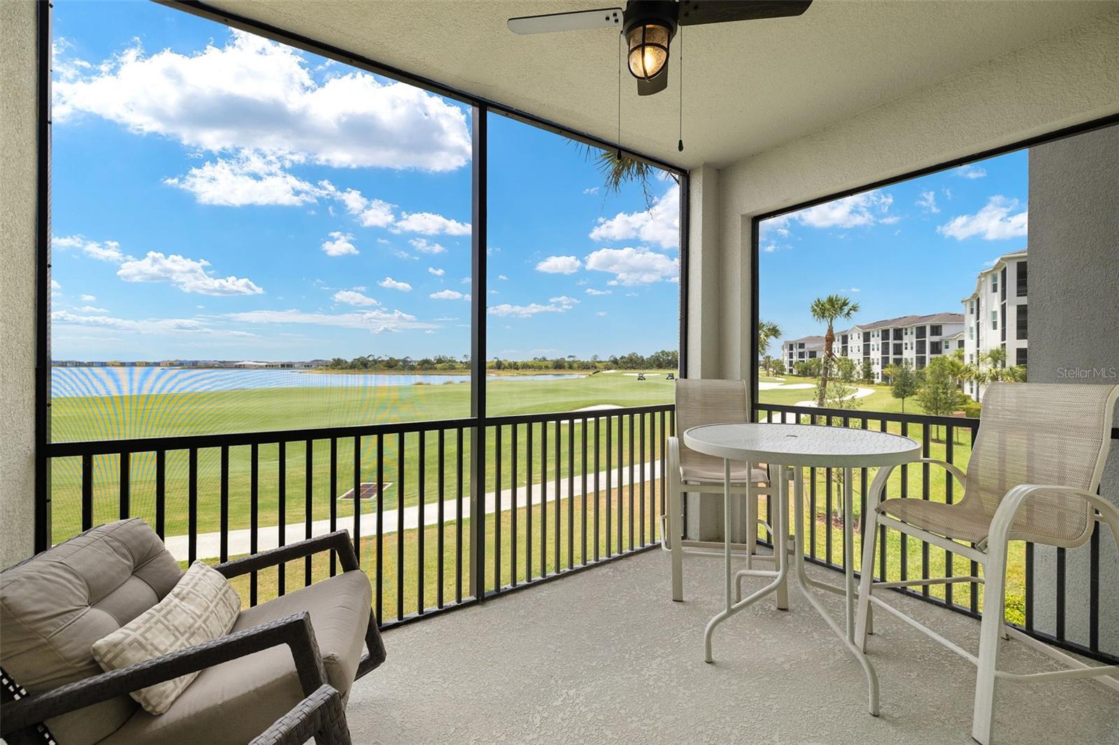 Here's your opportunity to embrace year-round golf within Babcock National because this unit has the GOLF MEMBERSHP INCLUDED! Just bring yourself and your suitcase because this home is being sold turnkey-furnished. This floor plan is known as the "Birkdale". This model comes with 2 bedrooms, 2 bathrooms, about 1,200 square feet of living space, an exterior storage unit AND a 1-car covered parking space. Additionally, this unit is accessible by the stairs or the common elevator. Walking inside and through the main hallway, you'll head right into your open kitchen which overlooks the living room and lanai. Finishes included in your main living spaces include everything from sleek granite countertops with an oversized island, stainless steel appliances, crown molding, tile flooring, white cabinetry, updated paint schemes and updated ceiling fixtures. With bay windows in the eat-in kitchen and sliding glass doors in the living room, you have the luxury of enjoying golf course & water views without even stepping outside! Outside, you have your very own screened-in lanai with panoramic views. Views that are hard to beat. Sellers also added a ceiling fan out there for additional cooling! Back on the opposite (entry) side of the condo, you have your 2 spacious bedrooms and bathrooms. Your primary bedroom offers a large walk-in closet, linen closet, and a beautifully tiled walk-in shower. Your guest bedroom has a closet and it's own nearby bathroom. It's maintained and it's move-in ready! Just outside of your home and within the community, you have an array of amenities at your fingertips. There's the 18-hole championship golf course, resort-style pool with lap lanes & a spa, tiki bar, pickleball & bocce courts, a state-of-the-art fitness center, tennis center, a clubhouse w/ dining, and more. Not only that but Founder’s Square within Babcock Ranch, hosts food trucks every weekend with entertainment, markets, music, etc. Living at Babcock means more than just residing—it's a vibrant lifestyle. Your neighbors are waiting! Come check out what the community and lifestyle is all about!