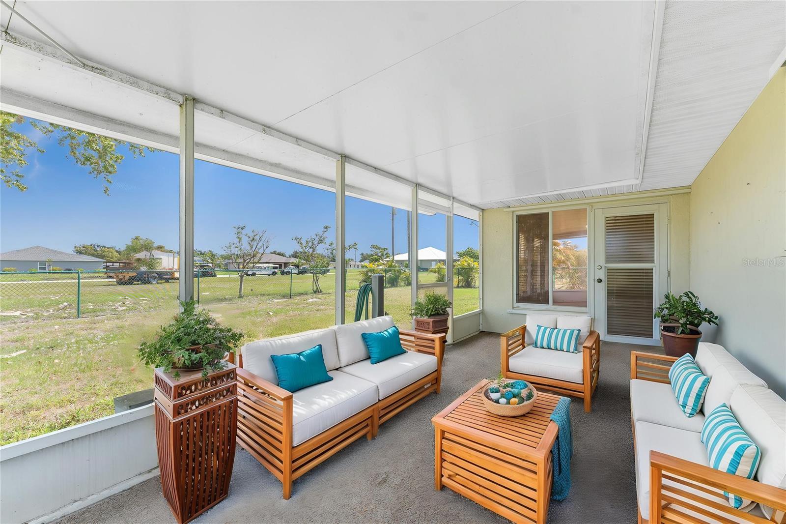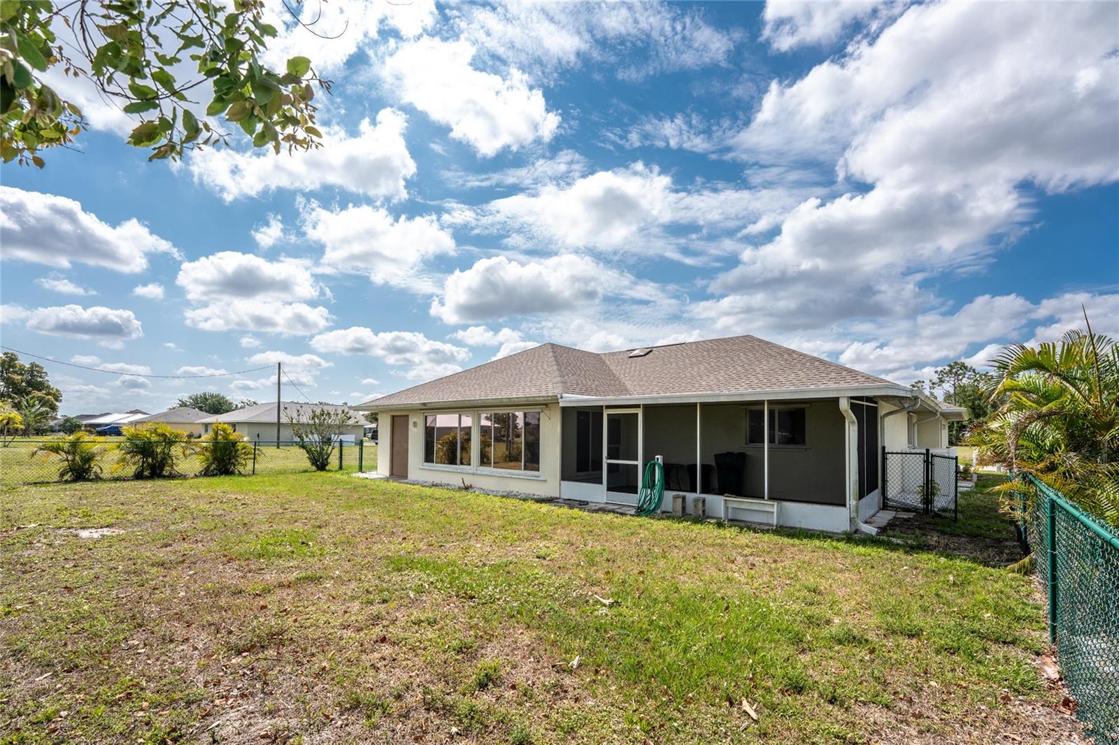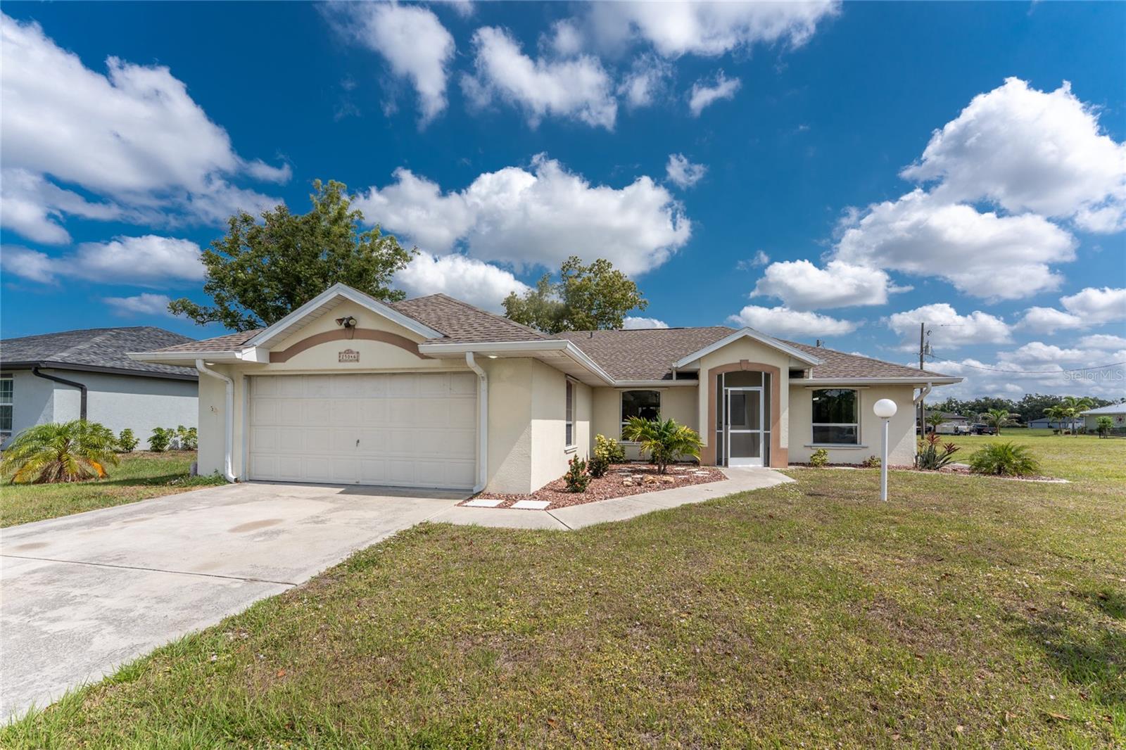 One or more photo(s) has been virtually staged. Welcome to 25046 Doredo Drive, this charming home is nestled in the peaceful, deed-restricted community of Burnt Store Village in Punta Gorda. With a very attractive offer price, this inviting residence blends comfort, style, and the allure of Florida living in a welcoming neighborhood. Built in 1996 and a 2023 ROOF, this home offers 1,525 square feet under air, featuring three bedrooms, two bathrooms, and a spacious 22’ x 22’ two-car garage. Inside, you’ll find a thoughtfully designed open floor plan with a desirable split-bedroom layout and a combination of tile and carpet flooring throughout. Natural light filters through the many windows, all outfitted with blinds for privacy. High ceilings and a skylight add to the airy feel, complemented by ceiling fans found throughout the home. The kitchen features granite countertops, Samsung stainless steel appliances, a large pantry closet, and a pass-through to the living area is perfect for entertaining. An eat-in dinette area framed by an arched window and ceiling fan creates the ideal setting for casual meals. The great room boasts high ceilings and opens seamlessly to the window lined Florida Room, providing outdoor views and abundant natural light. From here, you can access the additional screened lanai, an ideal spot for relaxing. The primary suite is a peaceful retreat with fresh paint, new carpet, a large walk-in closet with built-in shelves, and ceiling fan. The en-suite bathroom includes a single sink vanity, comfort height commode, and a fully tiled walk-in shower with a door. Guests will enjoy their own roomy bedrooms with a walk-in closet, ceiling fan, and a nearby full bath with a tub/shower combination and single sink vanity. A dedicated laundry room with washer and dryer provides convenience, while numerous exterior features add value and peace of mind. These include hurricane storm shutters, a brand-new roof and gutters (2023), fenced yard with a designated vinyl enclosure for trash receptacles, stone-mulched landscaping with concrete curbed beds, screened entry with a tiled front porch, and a skeeter-beater screen for the garage door. Burnt Store Village offers a sense of community with a park with a gazebo and a walking path around a maintained lake and also includes basketball court and a playground. Social gatherings like the chili cook-off and ice cream social bring neighbors together, and nature enthusiasts will enjoy birdwatching and the abundant Florida wildlife. Plus, downtown Punta Gorda’s dining, shopping, and entertainment are just minutes away, along with essentials like Publix and Home Depot. This home offers the ideal Florida lifestyle—affordable, comfortable, and connected to nature and community. Don’t miss your opportunity to make 25046 Doredo Drive your new home!