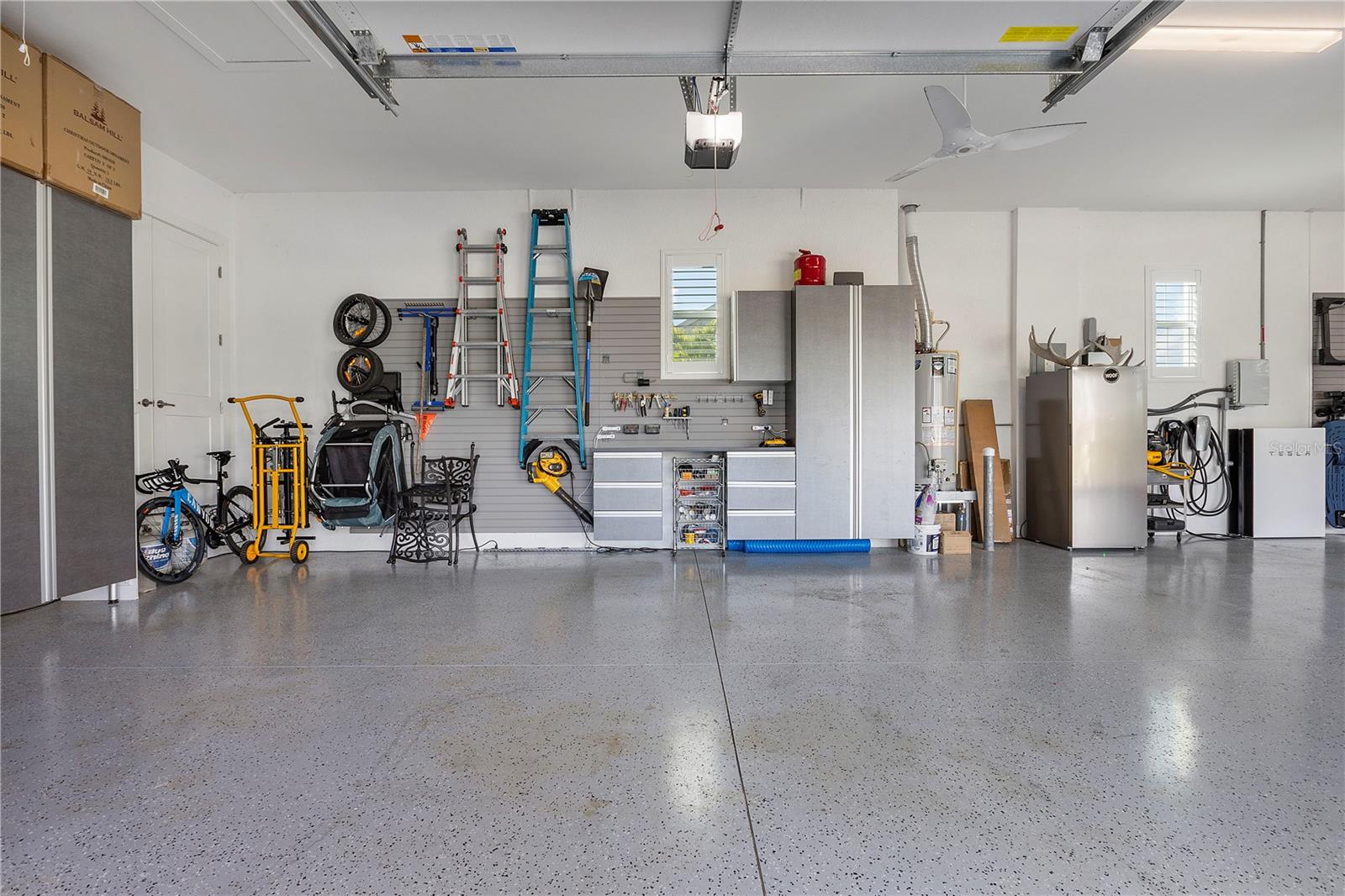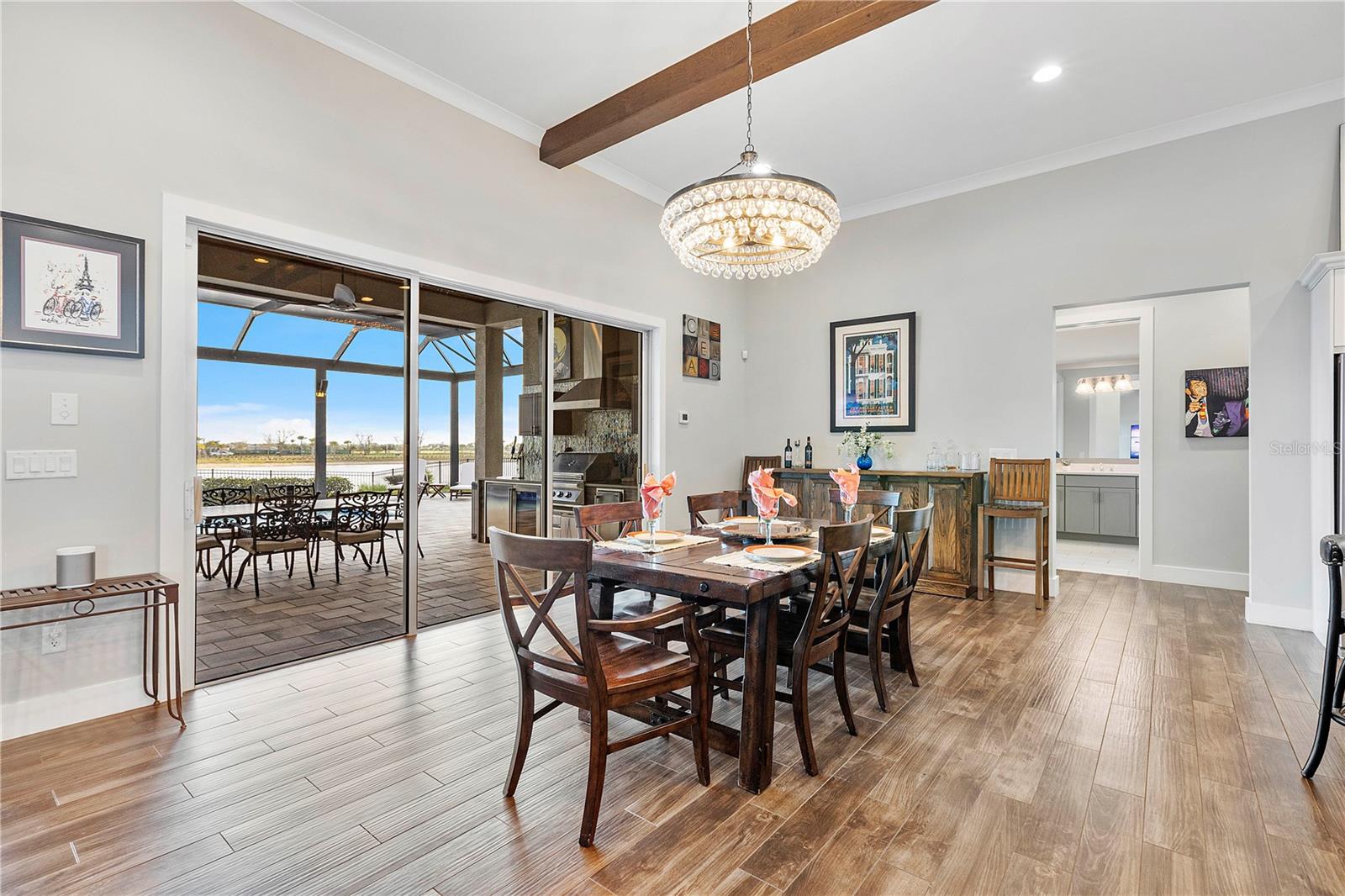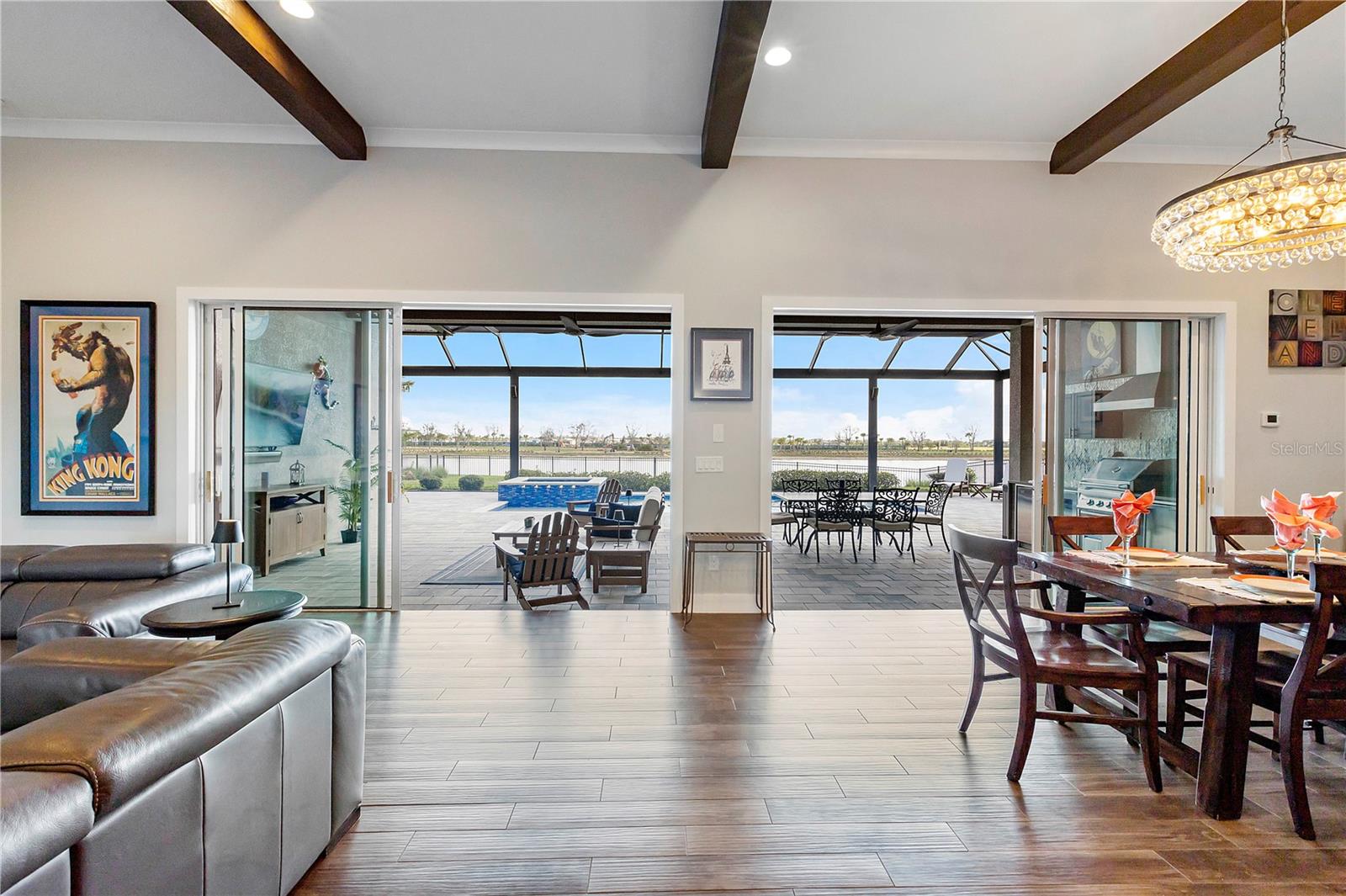 Welcome to your dream home in Babcock Ranch! This stunning single-family home features 4 bedrooms, two and a half baths, and a three-car+ garage. The home is equipped with a solar array on the roof, which powers two EV charging stations and includes two Tesla Powerwalls. The in-ground pool with a spa is perfect for relaxing and entertaining, while the waterfront location offers serene views and a peaceful atmosphere. Inside, you'll be impressed by the supersized quartz countertops, expanded surfaces, extra cabinetry, upgraded stainless steel appliances, and wood-like plank tile flooring in the main living areas. The great room boasts a beamed volume ceiling, creating a spacious and inviting atmosphere—perfect for entertaining. The master bedroom suite serves as a true retreat, featuring a custom bath with a separate shower and custom closets for added luxury. From the bedroom, step outside to the enlarged panoramic screened lanai, complete with a custom outdoor kitchen—ideal for enjoying the Florida sunshine year-round. With impact windows throughout, you can rest easy knowing your home is protected during inclement weather, while remote-controlled Storm Smart roll-down screens provide additional protection. This home boasts countless upgrades, making it truly desirable. Walk to Founders Square, where you can enjoy markets, entertainment, food trucks, art fairs, family movies, and more. The square also features a wellness center, restaurants, and other amenities coming soon on Bee Street. Babcock Ranch has gained worldwide recognition for withstanding storms, and its sustainability has attracted homeowners from all over. Don't miss your chance to own this exceptional property in Babcock Ranch—schedule a showing today and make this house your forever home!