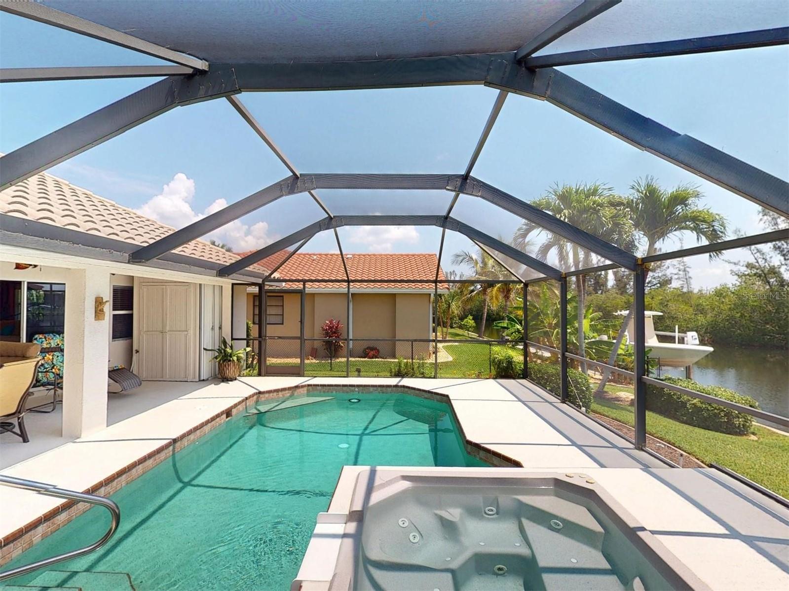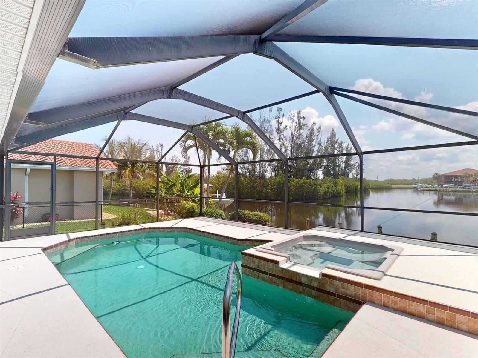 You will be mesmerized by the view of the basin and estuary, birds and butterflies along with manatees, turtles and fish that capture the beauty of Florida nature. The landscaping has utilized tropical native plants and is beautifully lush. Hop on your boat from your lift and concrete dock for SAILBOAT ACCESS to Charlotte Harbor and on to the Gulf. All of this viewed from this stunning home that captures views of the water from almost every room. The great room with formal dining area is has pocketing sliders leading to the spacious covered lanai and an additional covered area only limited for use by your imagination. The great room also leads to the remodeled kitchen with granite counters and kitchen aid appliances, where the view from the kitchen nook is perfect for sipping your morning beverage and taking in the soul soothing view of nature. The primary bedroom is spacious with enough room for a desk or sitting area, the walk in closet customized for storage and organization, the en-suite bath is an oasis of comfort. The two additional bedrooms and bath are on the other side of the home off of a hall for privacy. The heated pool and spa provide the finishing touch on paradise! The two car garage has built in storage shelves and the laundry room large with additional cabinetry. And a bonus- the concrete sea wall is maintained by the city of Punta Gorda!!! This little cul de sac has million dollar plus homes all around! Lot next door available mls C7489164 with an additional concrete dock if you wanted more space. The home has been lovingly maintained and updated by the owners….click on the video tour to talk a walk through what may be your next home.