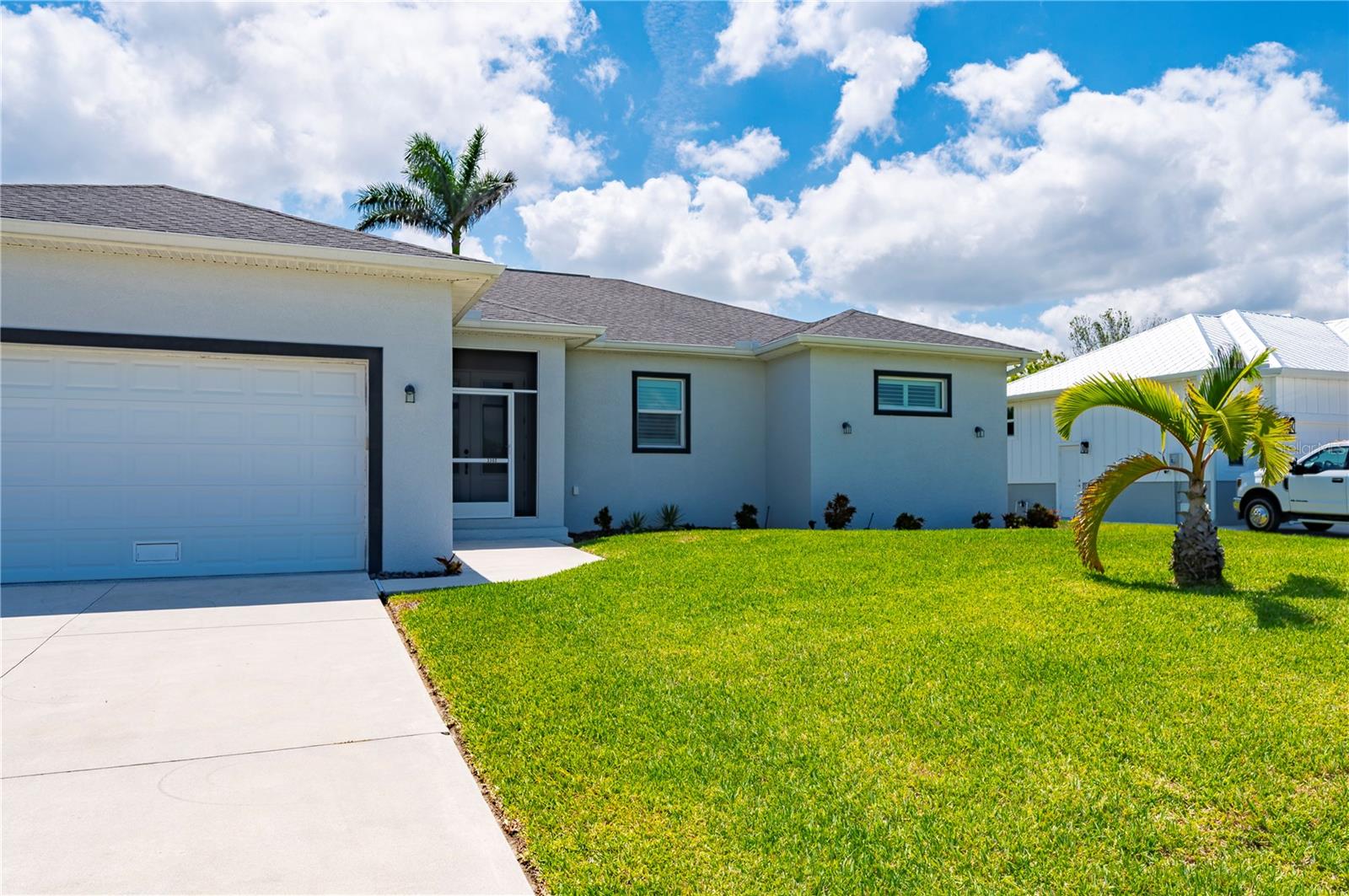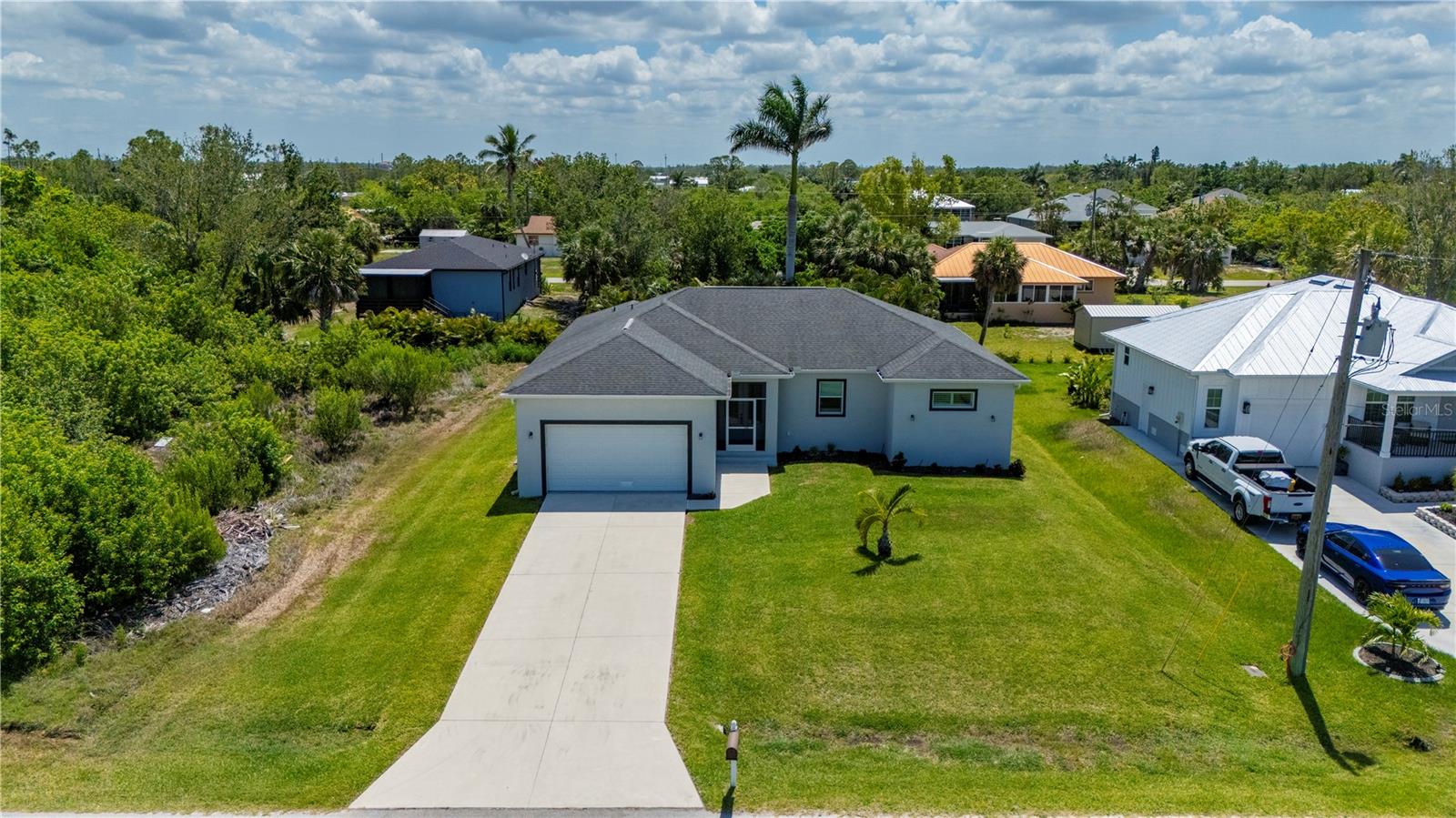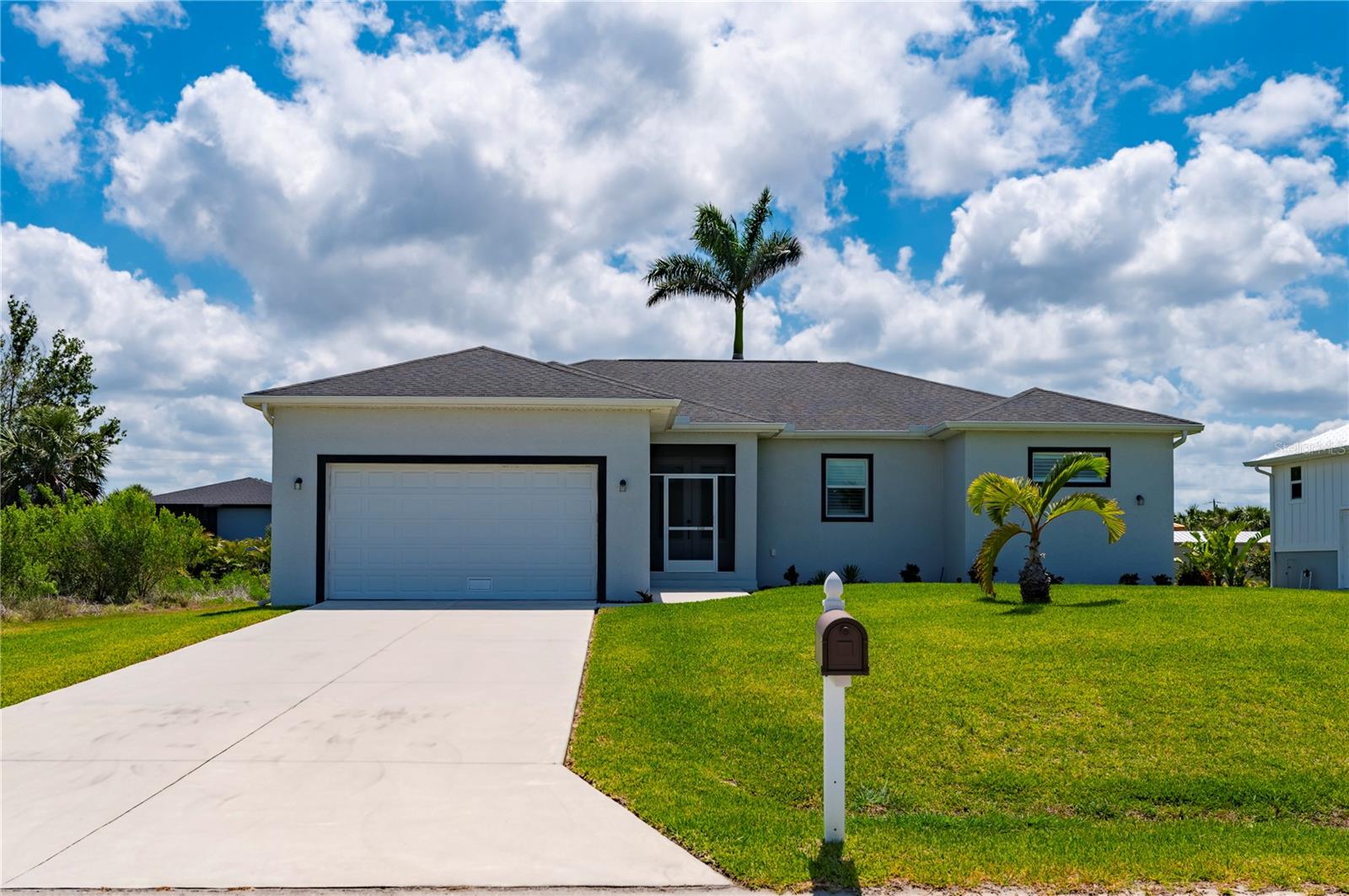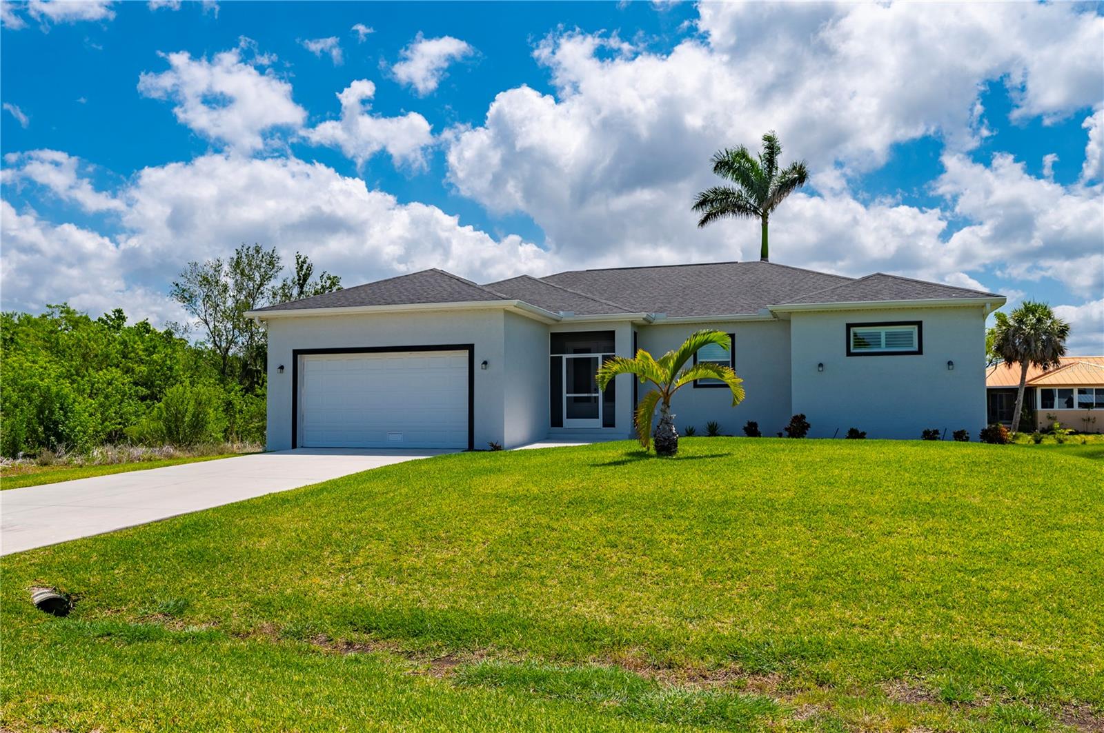 Welcome to your slice of coastal comfort-a meticulously maintained, 3 bedroom, 2 bathroom home built in 2019 by the respected Florida Coastline Construction. Designed with both style and function in mind, this residence is the perfect blend of quality craftsmanship and easy Florida living. Inside, generous 9’4” ceilings and oversized 20"x20" tile set the tone for open, airy spaces. Upgraded baseboards and refined trim moldings add just the right touch of detail, while impact-resistant low-E windows and sliders fill the home with natural light and peace of mind. At the heart of it all is a well-appointed kitchen with rich wood cabinetry, soft-close drawers, granite countertops, and a central island that invites gathering and connection. Whether you're hosting or unwinding, the layout is built to support your lifestyle. The master suite opens directly to the lanai and is paired with a luxurious bath featuring a soaking tub and walk-in shower for that everyday spa feel. Climate control is handled by a high-efficiency SEER-16 HVAC system, and the epoxy-finished, air-conditioned two-car garage provides year-round utility. Step outside and enjoy the oversized lanai with view of lush tropical landscaping- your own quiet escape with room to add a pool if desired. Best of all, this property offers flexibility with NO HOA or Deed Restrictions, and is ideally located just minutes from Punta Gorda’s historic downtown, Ponce de Leon Park, Laishley Marina, and more. Whether you're looking for a full-time residence or the perfect winter retreat, this move-in-ready home captures everything there is to love about Southwest Florida living.