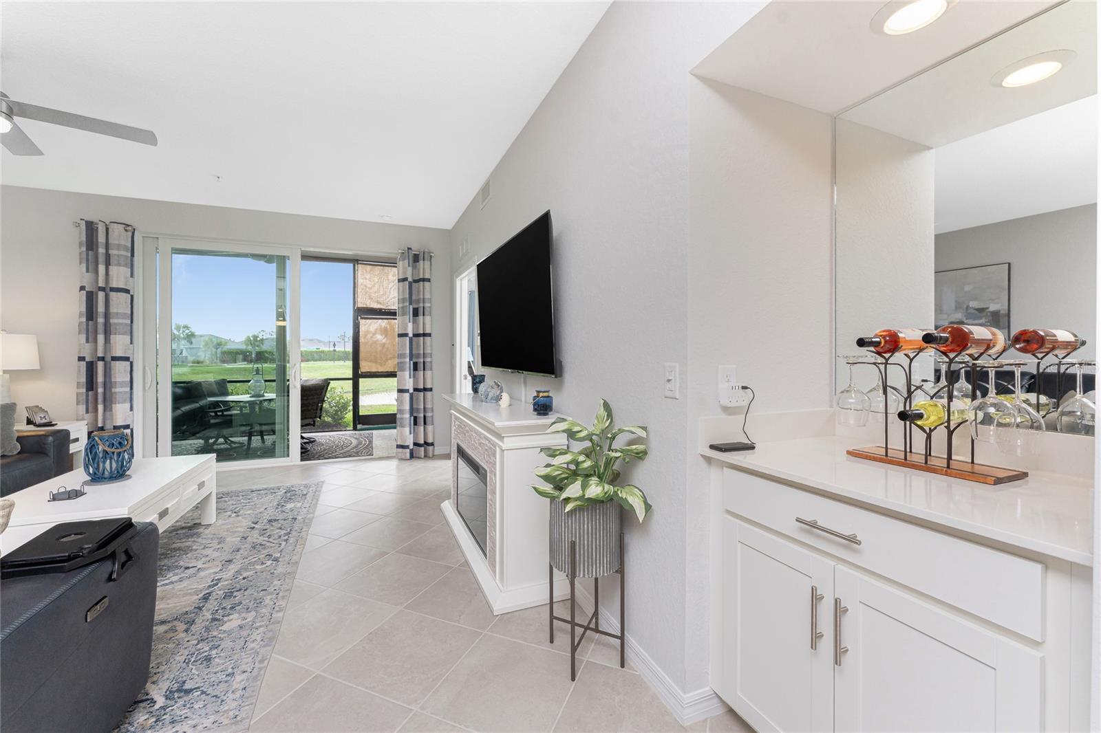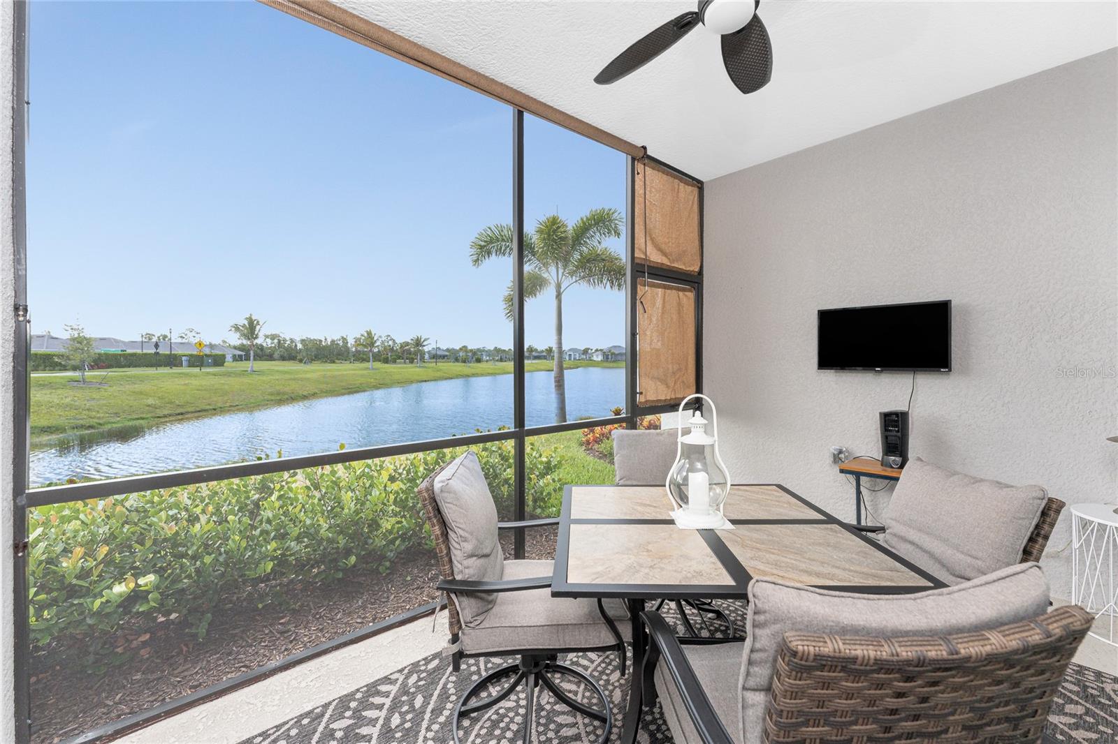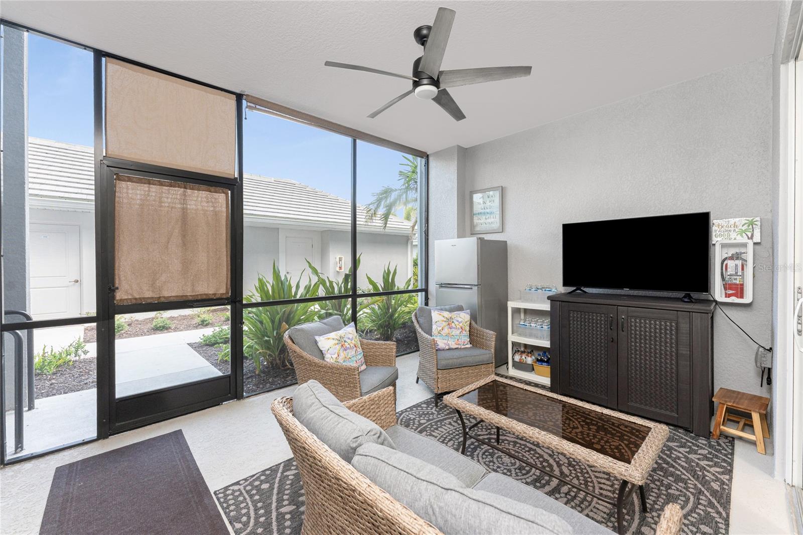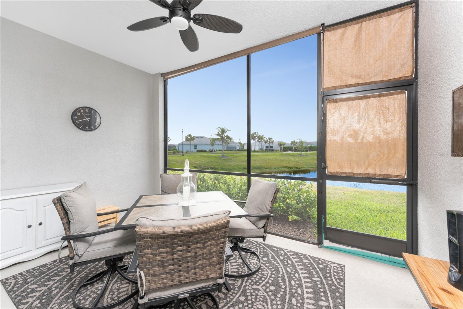 Experience the pinnacle of resort-style living in this impeccably maintained first-floor unit, nestled within the exclusive Heritage Landing Golf & Country Club. This beautifully designed 2-bedroom, 2-bath + den, Bromelia floor plan offers the perfect blend of luxury and comfort. Step inside through the screened front lanai to find an open concept design showcasing diagonally laid tile throughout. The kitchen features quartz countertops, custom tile backsplash, shaker style cabinetry and stainless steel appliances as well as an eat-in dining area, and breakfast bar. The spacious primary suite is complemented by a tray ceiling, two walk-in closets, dual vanities, and a large tiled shower. Custom paint throughout the home enhances its charm. The outdoor space is impressive with an additional screened lanai in the rear with picturesque views of the large pond abundant with wildlife. Both lanais are outfitted with custom sunscreens for both sun protection as well as privacy. Impact windows and a detached 1-car garage provide added convenience. Heritage Landing offers an unparalleled array of amenities including a Championship golf course, resort-style pool with lap lanes and spa, two on-site restaurants offering formal and informal dining options, a state-of-the-art fitness center and beauty spa, sauna, tennis courts, pickle ball courts and more. Located in Punta Gorda with easy access to the local airport and wonderful downtown restaurant options. This property offers a luxurious, maintenance-free lifestyle perfect for year-round living or a seasonal retreat.
