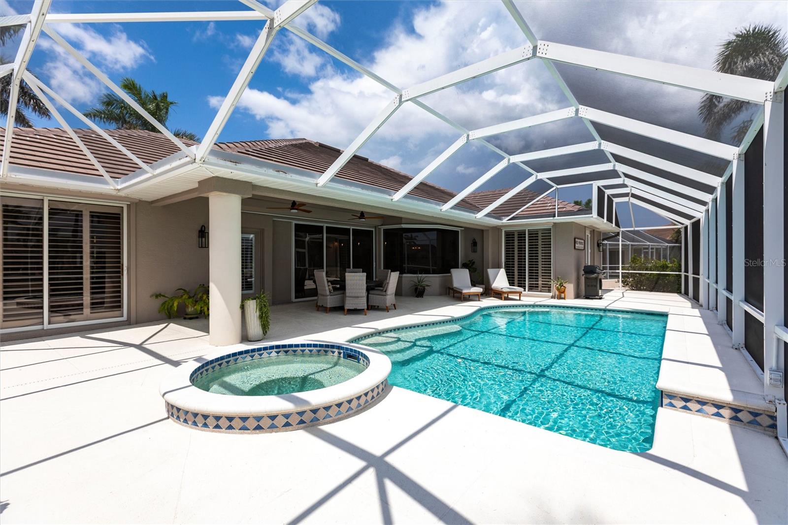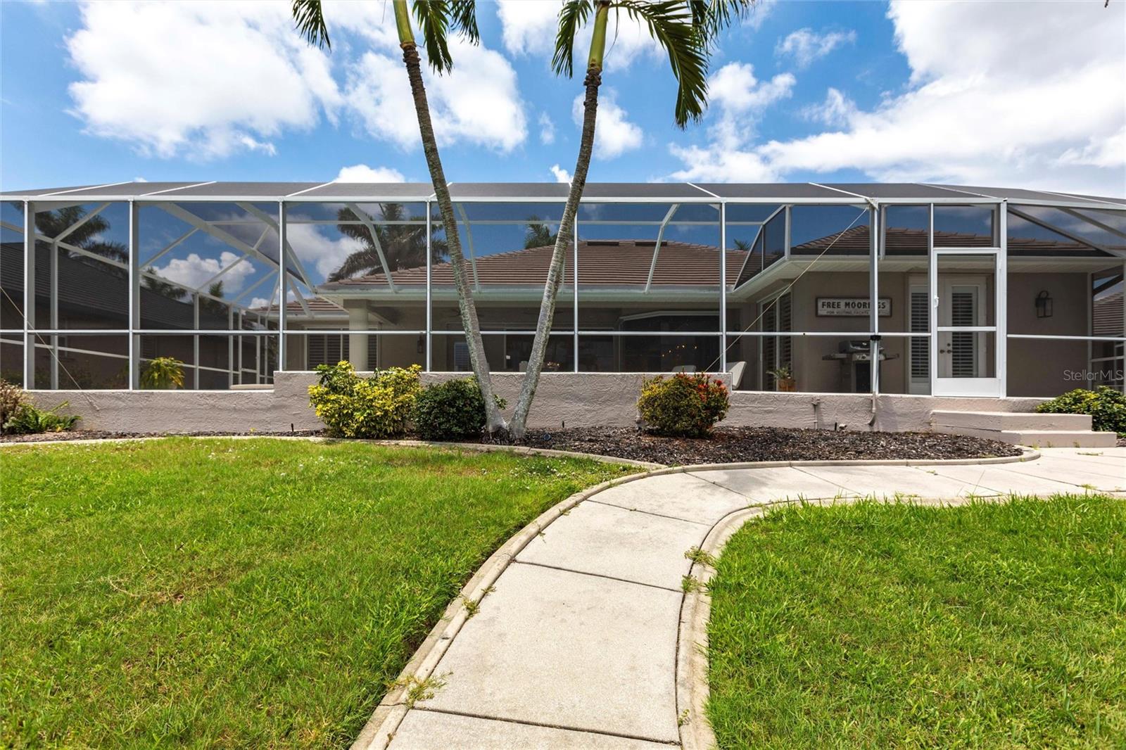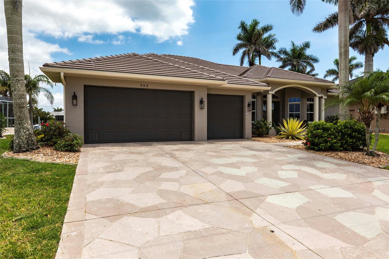Waterfront luxury with sought after southern exposure awaits! Welcome to this exquisite custom-built pool home in the prestigious golf and waterfront community of Burnt Store Isles. This sailboat- access retreat offers an unparalleled Florida lifestyle with direct access to Charlotte Harbor and the Gulf. Perfect for boaters and water enthusiasts. From the moment you arrive, the stunning curb appeal sets the tone with soaring palm trees, and a grand entrance with columns and arches.Step inside to an expansive great room with volume ceilings, and sliders that seamlessly blend indoor and outdoor living. The chef-inspired remodeled kitchen is the heart of the home, featuring soft-close cabinetry, generous remodeled counter space, breakfast bar, built-in desk, and a charming breakfast nook with pool views. The lavish master suite boasts private pool access, a huge walk-in closet, and a spa-like bath with a classic jetted soaker tub, walk-in shower, and his and her vanities. Guests will appreciate the well-appointed guest suite, complete with private pool access, and an upgraded bathroom with a walk-in shower. Outside, the covered lanai offers a heated pool and spa, ideal for entertaining or relaxing with waterfront views and southern exposure. Boaters will love the 80 ft. concrete seawall with a dock, water/electric connections, and a 10k lb boat lift, ready for your next adventure. Additional features include motorized hurricane shutters on all doors, complete interior /exterior paint, new epoxy garage floor, new pool resurface, new pool pumps and heater, plantation shutters, and new lighting throughout the house. Burnt Store Isles is a highly sought-after community with Twin Isles Country Club at its center, offering golf, tennis, and social activities. Conveniently located near I-75, Fishermen’s Village, and downtown Punta Gorda, this home is spotless, move-in ready, and waiting for you!
