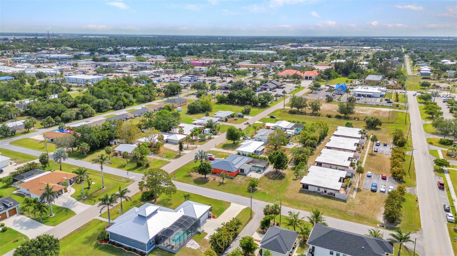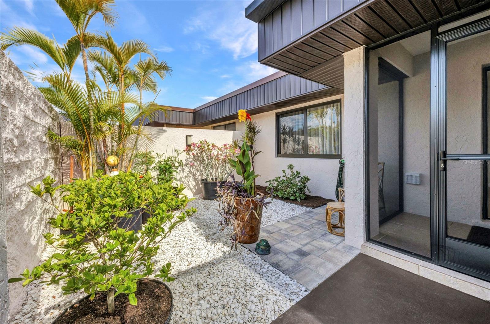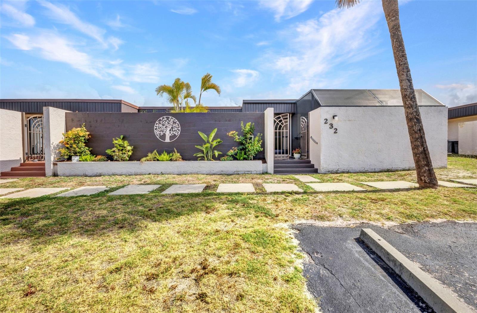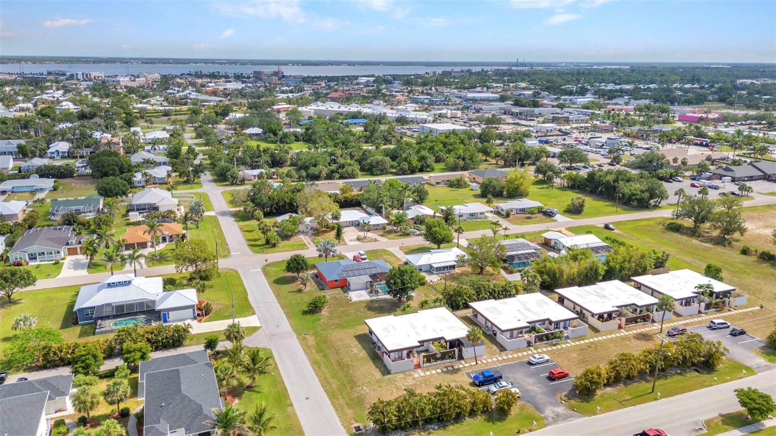 Tucked behind your very own double gate entrance, surrounded by tall concrete walls presents a HIGH ELEVATION 2 bedroom 1 bath, over 1,000 square foot residence, a secluded oasis, unscathed by recent storms. Enjoy your 2 private courtyards; a custom screened enclosed courtyard invites the outdoors protected from pesky pests while lounging, grilling, entertaining and keeping the children & pets safe, while your other courtyard offers infinite opportunities for your pets & children playing, gardening, spa placement, fire pit or nature inspired activities. Nestled in the serene and distinguished historic district of Punta Gorda, this home combines tranquility with convenience. Enjoy a vibrant lifestyle just steps away from scenic trails, farmers markets, local attractions, restaurants, charming shops, and the public library within walking distance. Enter through the new custom enclosed porch, into the home where natural light and LVP flooring flows from room to room. New sleek recessed lighting options illuminate throughout. Tailored cabinetry and granite sink in the kitchen compliments the white Quartz countertops. Full view glass panel door serves as easy access to side of home and an added perk of natural light. Ample Cafe area for extra dining options or extra seating as to be near the enclosed courtyard activities. Renovated bathroom, ergonomically friendly height Quartz vanity, tall custom deep-set wall cabinet, new toilet and a floor to ceiling tiled shower grants pleasure to use. Spacious bedrooms boast serene views from each new oversized high impact window. Living room is graced with floor to ceiling windows and sliders. Spacious secluded lanai with privacy/pet friendly screens features a double door storage option and access to the yard. Assigned close proximity parking to private entrance. Some of the many NEW improvements 2023~present...roof, high impact windows, HVAC system, water heater system for efficiency, interior and exterior electric panel upgrade, courtyard pavers, custom enclosed courtyard and front porch, dryer vent, gutters, hose bibs and landscaping. Enjoy the best of both worlds —the ease and security of condo living combined with the rare freedom of expansive, privately owned outdoor space. This well-appointed, beautifully updated home offers a non-intrusive HOA that maintains shared areas for carefree living while allowing you the creative freedom to personalize your property, all securely tucked behind your own double gates. A truly affordable opportunity for homeowners and investors alike to be part of a friendly, well-kept community.
