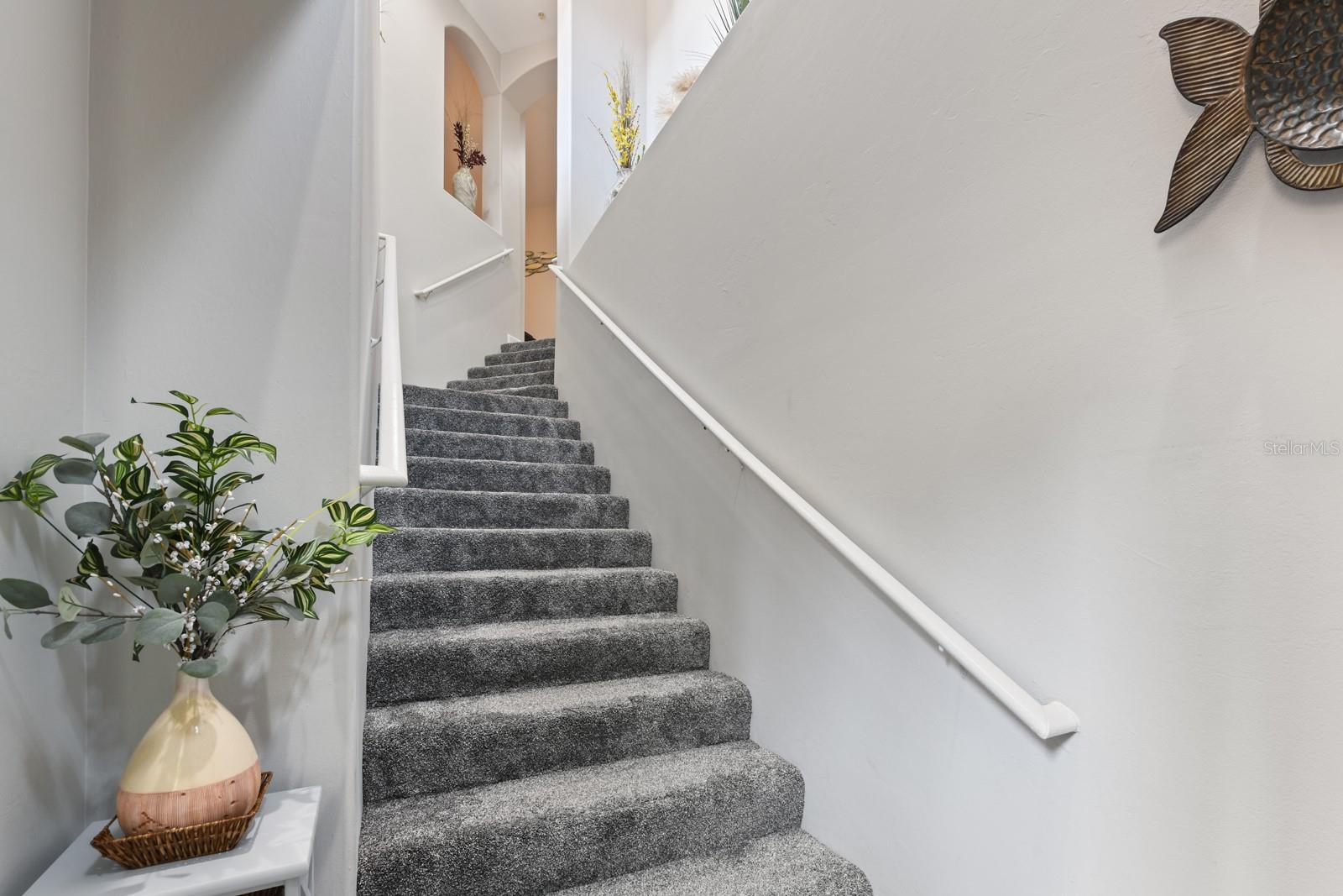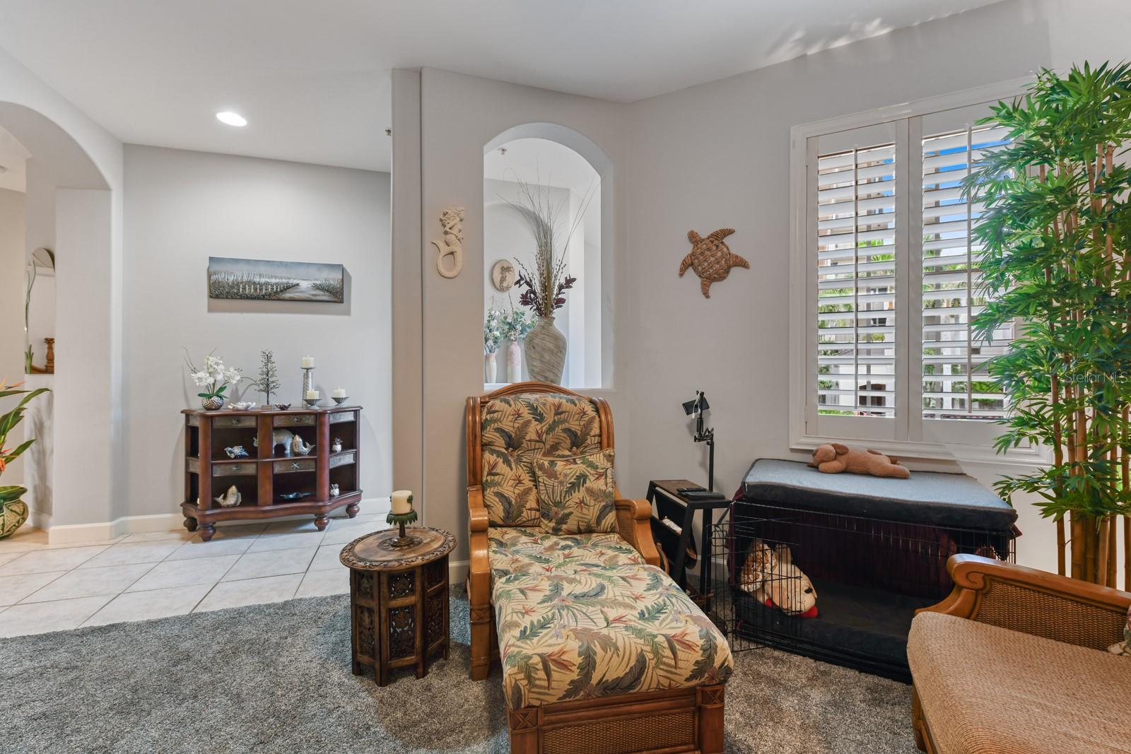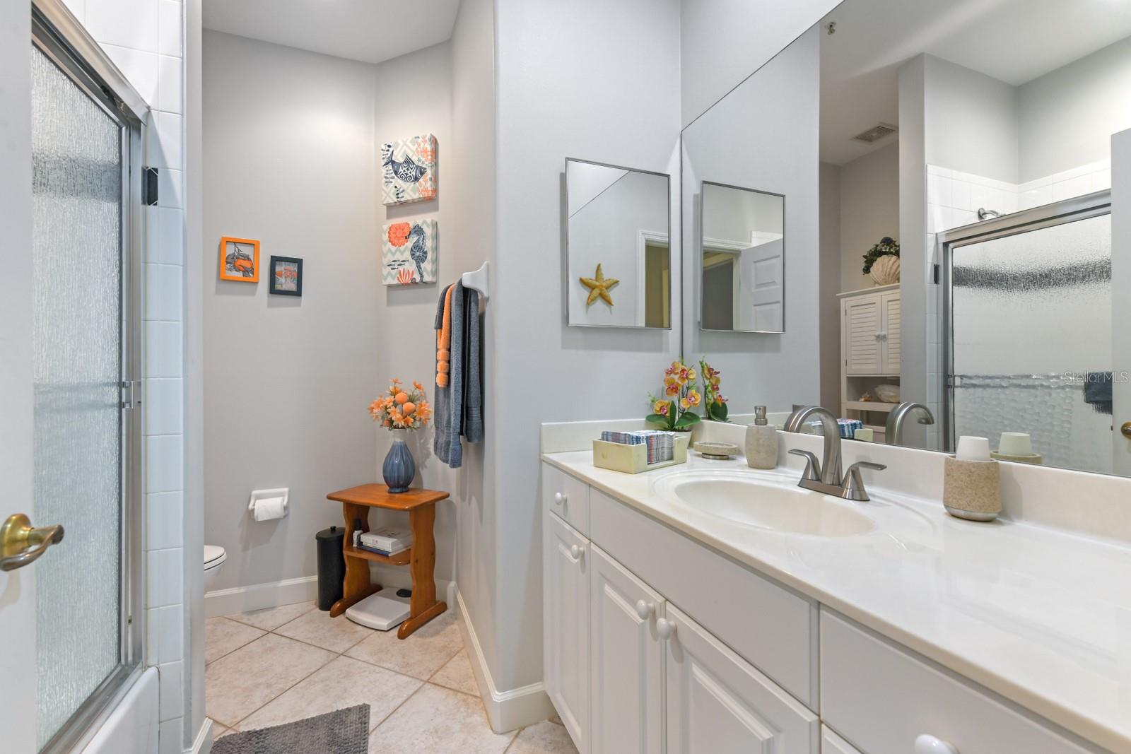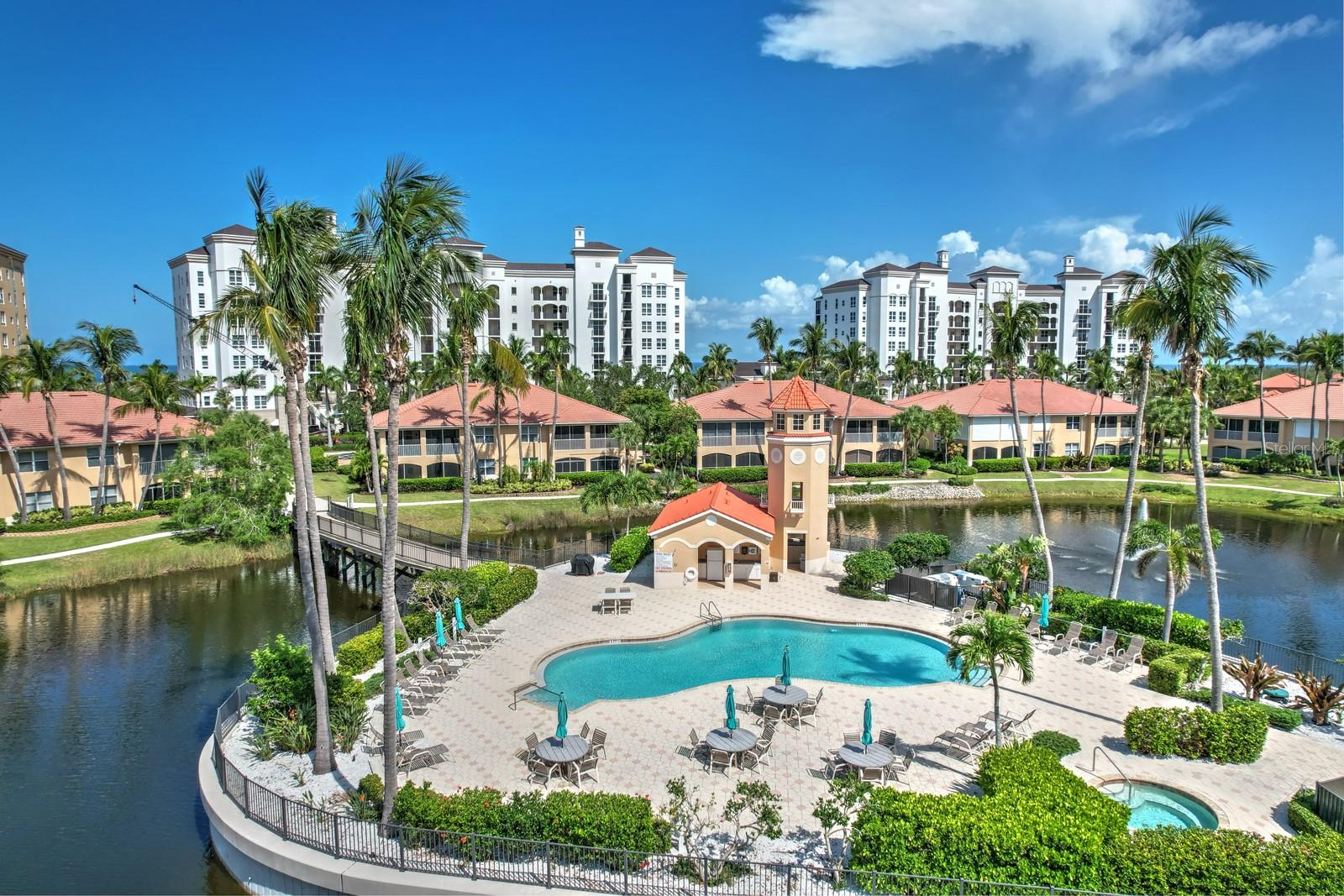 Experience refined coastal living in the exclusive, tropical enclave of Topaz Cove. This beautifully turnkey furnished residence features classic finishes within 2,277sf living space and 3 bedrooms 2 bathrooms + versatile den and a private 2 car garage. You’ll have the breathing space of a home without the maintenance! And with expanded room between the adjacent building and southern exposure on that side, natural light infuses this condo throughout the day. Soaring ceilings add to the spacious, airy ambiance. Enjoy tranquil mornings and gentle breezes from the extensive screened lanai overlooking a serene pond and the resort-style pool just steps away. The open-concept kitchen in the heart of the home is an entertainer’s dream - featuring a center island, stainless appliances, solid-surface counters, 42” hardwood cabinetry and deep pantry. Invite a couple or a crowd and everyone can join in the conversation over the wide breakfast bar. The generously designed owner’s suite boasts large windows, direct access to the lanai, and a beautifully remodeled ensuite bath highlighting a wide two-sink granite vanity and large walk-in shower. Across the home, a private guest wing with oversized bedrooms provides comfortable accommodations for family and friends. The main guest bedroom is large enough for a king-size bed below delightful transom windows! And since windows are on all four sides of this condo, there’s loads of light in each room. The 3rd bedroom features attractive French doors with privacy blinds and the carpet was recently updated in all bedrooms. The guest bath is conveniently located along the same hall and a laundry room is just around the corner. The cozy den is perfect as a home office, reading nook, second TV room or additional guest space. With an attached 2 car garage you’ll have plenty of additional storage space and room for your car, golf cart and outdoor toys. Other highlights include classic plantation shutters throughout, tile flooring in the main living area, attractive paint selections and the security of the second floor. Nestled in the desirable Prosperity Point community with its own secure gate you’ll enjoy two heated community pools, each located on a tropical island oasis surrounded by a pond and accessed by charming wooden bridges. Stroll the peaceful walking paths around both Marina basins, enjoy the lush landscaping and waterfront views - this is coastal luxury at its finest. The larger Marina community features quick open water access from wet or dry boat slips, two onsite restaurants for dining, music and fun, a challenging 27 hole executive golf course and a very popular fitness center with active pickleball and tennis leagues. All amenities have optional memberships so you only pay for the lifestyle you want - and golf is open to the public! Move-in ready this condo is effortlessly elegant and just waiting for you.