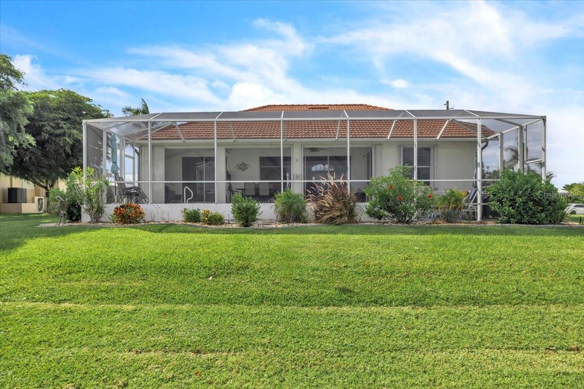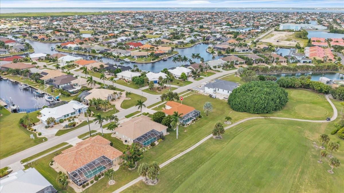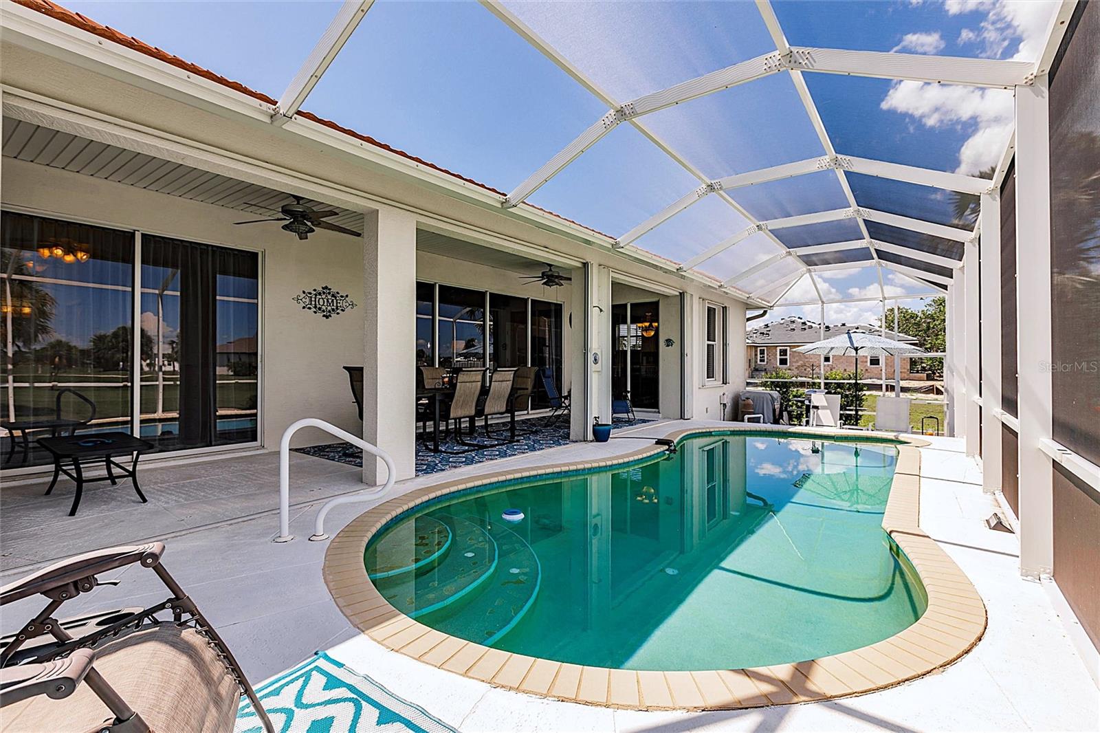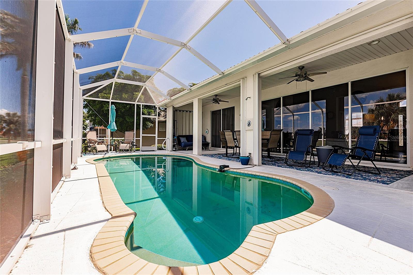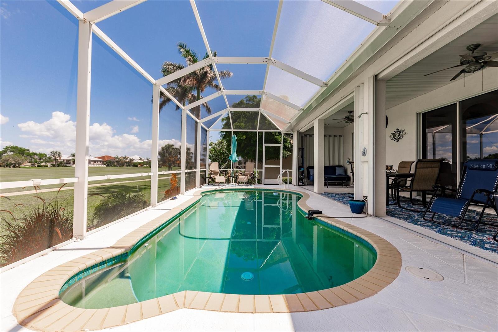 Stunning Pool Home on the 10th Fairway – Punta Gorda Isles! Experience Florida living at its finest in this meticulously maintained 2002-built pool home, perfectly positioned on the 10th fairway of the prestigious St. Andrews Golf Course in Punta Gorda Isles. With 1,624 square feet of living space, this home offers 3 bedrooms (or 2 bedrooms plus a den), 2 full bathrooms, and an attached 2-car garage. From the moment you arrive, you'll be captivated by the home’s exceptional curb appeal, featuring a durable metal roof, nicely landscaped with outdoor lighting, full window storm protection, and a curved driveway leading to a welcoming screened-in front porch. Step inside to a bright and airy open-concept living area highlighted by soaring ceilings, tile flooring throughout, and tall 8-foot sliding doors that fill the space with natural light and offer seamless access to the lanai. A built-in entertainment center anchors the spacious living room, perfect for relaxed Florida living. The eat-in kitchen serves as the heart of the home, complete with new stainless-steel appliances, a center island with seating, sleek white cabinetry, a pantry closet, and direct access to the outdoor living area—ideal for entertaining. The expansive primary suite is a true retreat, featuring private pool access, dual closets (including one walk-in), and a luxurious en-suite bath with a soaking tub, walk-in shower, dual vanities, private water closet, and generous storage. Guests will appreciate two well-appointed secondary bedrooms—each with built-in closets—and a shared guest bath offering an extended vanity and walk-in tiled shower. The third bedroom, with French doors, also functions perfectly as a home office or den. Step outside to your easterly-facing lanai, designed for comfort and relaxation. Lounge in the shade or take a dip in the large, heated pool, complete with a new variable-speed pool pump and heater. Best of all, the screened lanai overlooks the scenic 10th fairway, offering tranquil golf course views that enhance the outdoor living experience. Additional features include an interior laundry room, Central Vac, outdoor pool shower, a new hot water heater (2024), A/C (2014), and a RainBird irrigation system with updated sprinkler heads. The roof and driveway were recently professionally power washed, enhancing the home’s overall curb appeal. Conveniently located near I-75 and US-41, this home is just minutes from Fishermen’s Village, historic downtown Punta Gorda, waterfront dining, boutique shopping, and some of Southwest Florida’s best boating and fishing. This spotless, move-in-ready home is your gateway to the Florida lifestyle