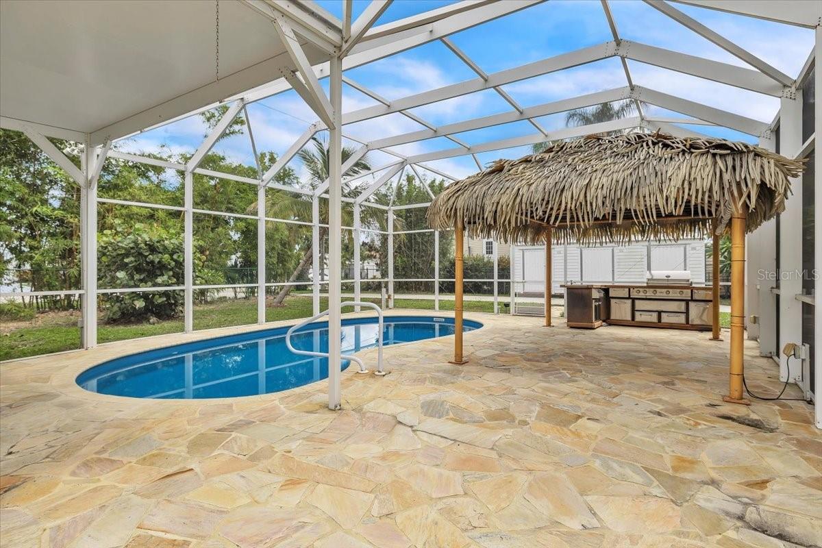 OWNER MOTIVATED - Beautiful 2005 Palm Harbor Pool Home on Saltwater Canal – 150 Ft. of Frontage! Welcome to this 3-bedroom, 2-bath, 1,800 sq. ft. pool home perfectly positioned on a wide saltwater canal with direct access to Charlotte Harbor and the Gulf of Mexico. Nestled off Aqui Esta among other beautiful homes, this property combines charm, function, and Florida lifestyle living. No flooding in the home from recent hurricanes! Built with quality in mind, the home features 3/4-inch plywood wrap on the roof, walls, and floor, a durable metal roof, and hurricane shutters for added strength, protection, and peace of mind. Set on two lots totaling 0.59 acres, this residence offers both space and versatility. Boating enthusiasts will appreciate the private wood dock and boat ramp, making this a true fisherman’s dream. Additional exterior highlights include a circular driveway, covered carport and a large storage shed. Step inside to a warm and inviting open floor plan, enhanced by luxury vinyl plank flooring, neutral tones, and tasteful accents. The cozy electric fireplace with a custom mantle creates a welcoming focal point, while the ceiling fan and breakfast bar with seating add comfort and convenience. An adjacent dining area with pendant lighting provides the perfect setting for family gatherings or entertaining. The bright, functional kitchen is designed with wood cabinetry, ample counter space, a center island with seating, and a suite of stainless-steel appliances. A large window above the sink brings in natural light, while the open layout flows seamlessly to the living and dining areas. Just off the kitchen, the laundry room offers extra storage and everyday practicality. The spacious primary suite features a large walk-in closet and a well-appointed en-suite bath with dual vanities, soaking tub, and separate shower. Two additional guest bedrooms—one with sliding doors to the lanai—also feature walk-in closets and share a full bathroom. Outdoor living shines in this tropical retreat, complete with a sparkling pool with new pool pump, flagstone decking, screened lanai, and a sturdy Bamboo Tiki Hut with summer kitchen—ideal for entertaining or simply relaxing. Whether you’re fishing from your dock, swimming in the pool, or enjoying the Florida sunshine, this home truly has it all. Close to I-75/US41 and nearby to Fishermen's Village, downtown Punta Gorda shops & restaurants, airports, great boating, fishing, sailing, and more. Home is completely spotless and waiting for you. Come enjoy the Florida lifestyle in this impressive home! **PLEASE ENJOY THE 3D INTERACTIVE VIRTUAL TOUR ASSOCIATED WITH THIS LISTING**