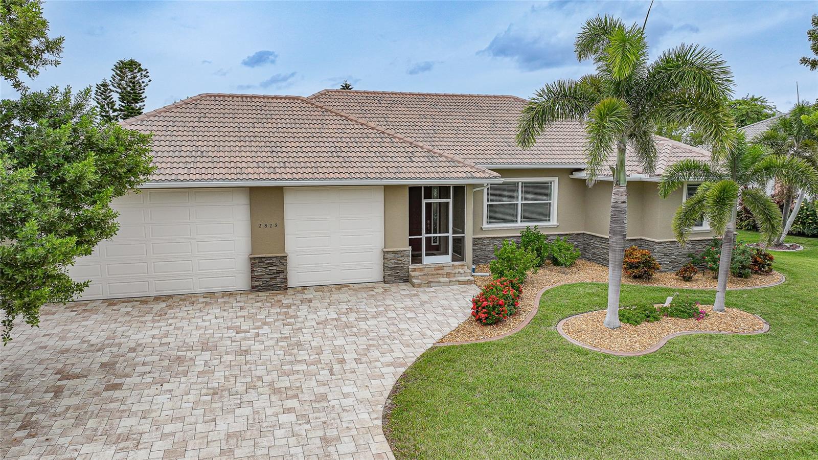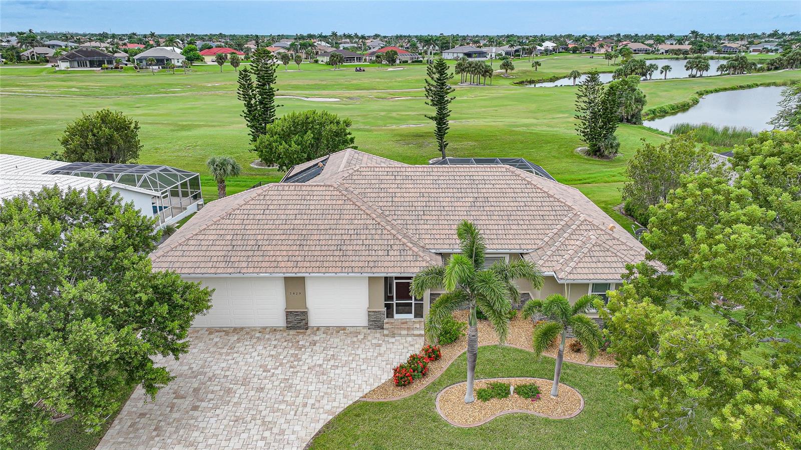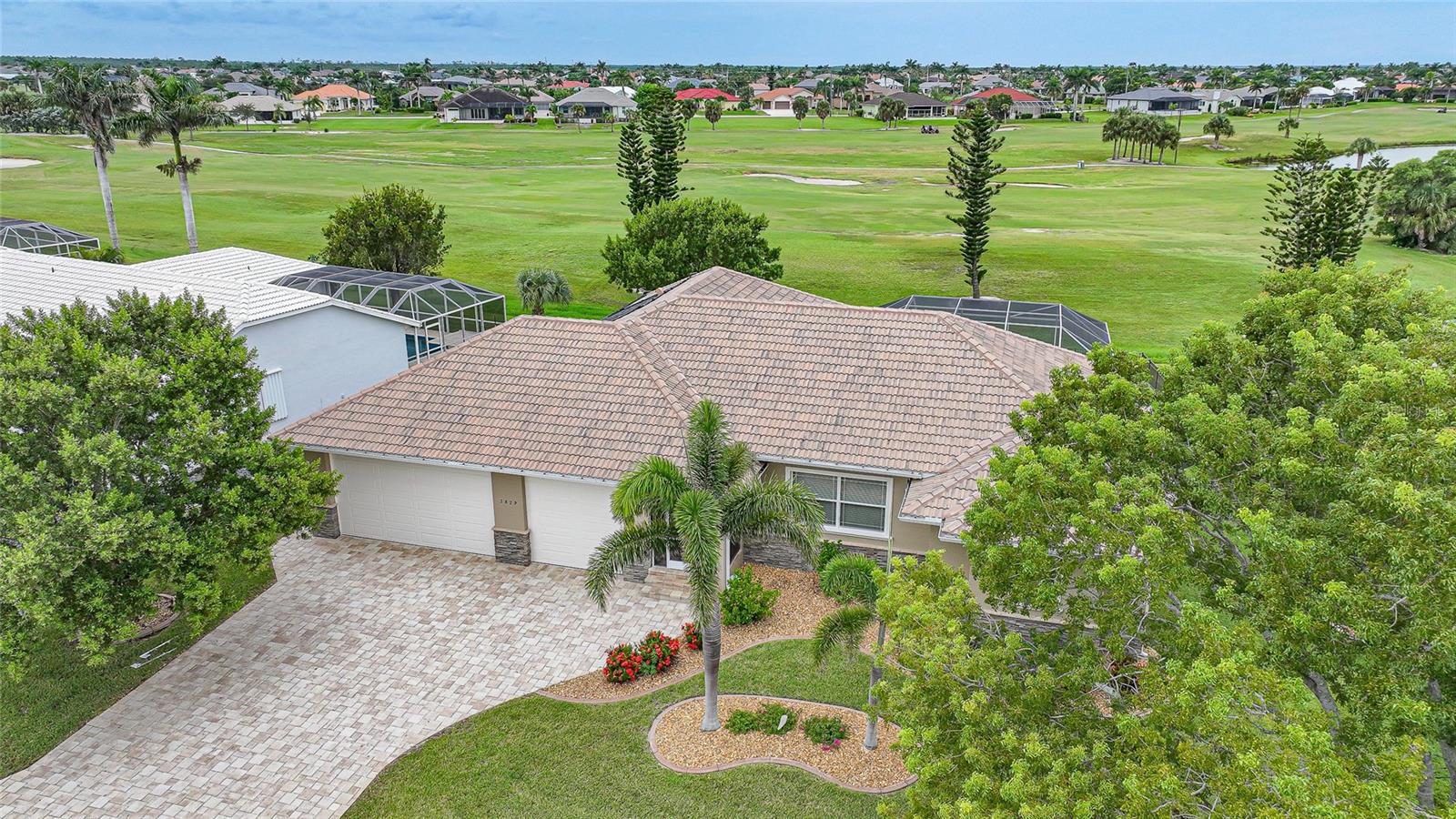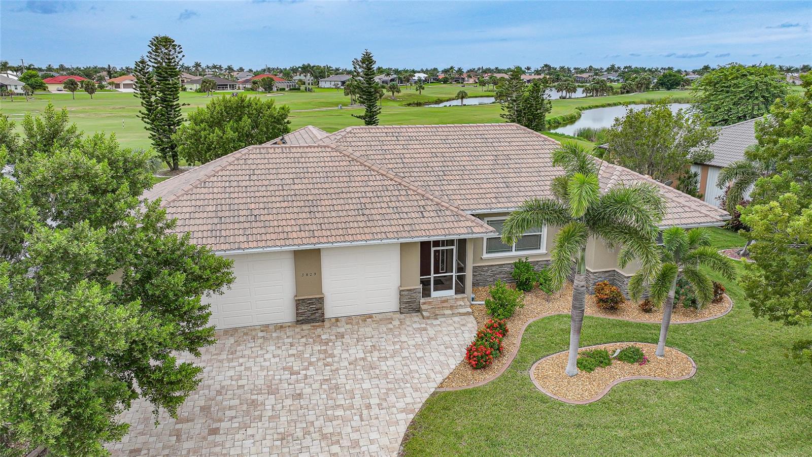 Welcome to 3829 Bordeaux Drive, perfectly situated on an oversized lot along the Twin Isles Golf Course in the sought-after community of Burnt Store Isles. Tucked away on a quiet street, this beautifully maintained home offers 3 bedrooms, 2 baths, and an oversized 3-car garage with 10 foot high doors and one of the bays is 30ft deep. It also features epoxy flooring and attic access. From the moment you step inside, the views will take your breath away. The expansive great room features backlit double tray ceilings with crown molding. The adjacent dining area as well as the great room boasts 8-foot hurricane-rated sliders that open fully to reveal the sparkling gas and/or solar-heated pool and spa overlooking the golf course and pond. The screened lanai is designed for relaxation and entertaining with paver flooring, wood ceilings, and a fully fenced backyard for added privacy. The chef’s kitchen showcases rich wood cabinetry with pull-out drawers, a tiled backsplash, stainless steel appliances, granite countertops, a GAS cooktop and oven, and a large 8-foot center island with seating. Just off the kitchen, a spacious utility room provides additional cabinetry, washer/dryer, utility tub, broom closet, and an extended home office area. The luxurious primary suite also opens to the lanai and features backlit tray ceilings, dual walk-in closets, a spa-like bathroom with Jacuzzi tub, walk-in shower, dual sinks, two linen closets, and a private water closet. A split floor plan ensures privacy, with two generously sized guest bedrooms on the opposite side of the home. They share a beautifully appointed full bath with dual sinks, granite counters, a linen closet, walk-in shower, and convenient pool access. Additional highlights include: tile flooring throughout (no carpet), reverse osmosis system, gas water heater, new HVAC (2023), and fresh exterior paint (2025). New Sprinkler Control Box (2025). Full Hurricane Protection. Homeowners Association is voluntary, and membership to Twin Isles Golf and Country Club is optional. This home is also conveniently located within close proximity to famous Fishermen’s Village, shopping, major highways and airports, and just a few minutes to downtown Punta Gorda, where you can enjoy its unique restaurants, pickle ball, biking, and waterfront activities.
