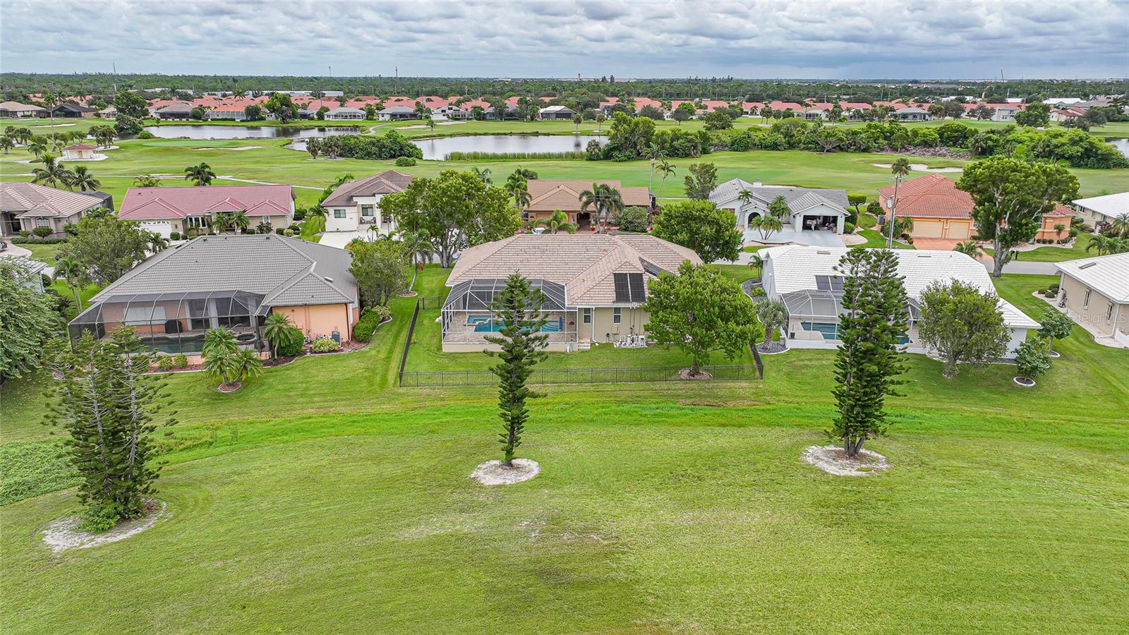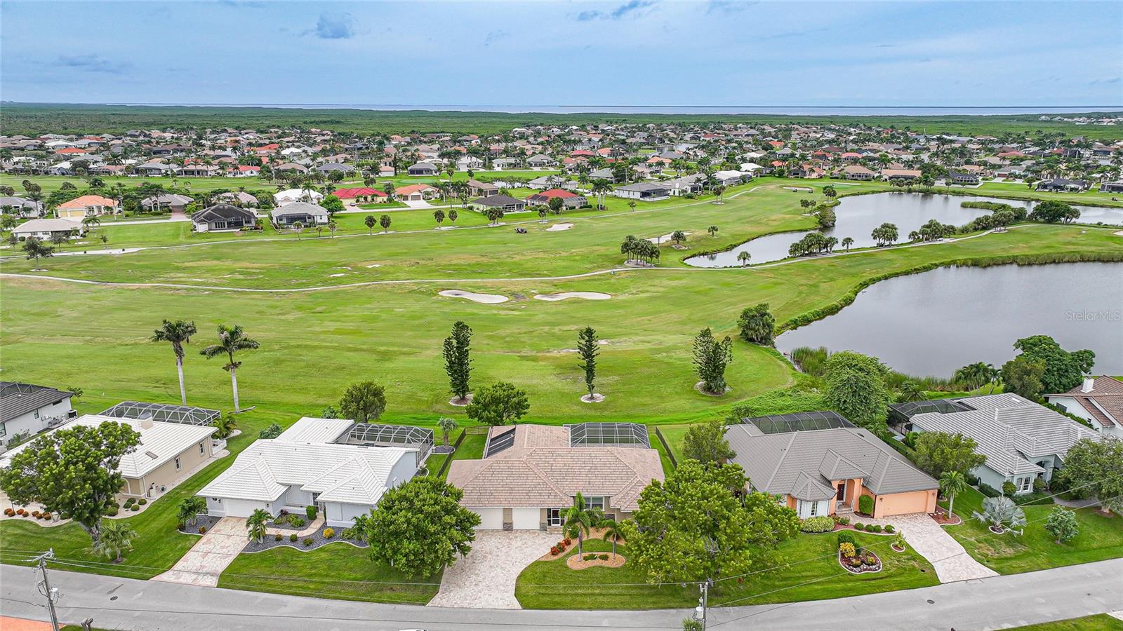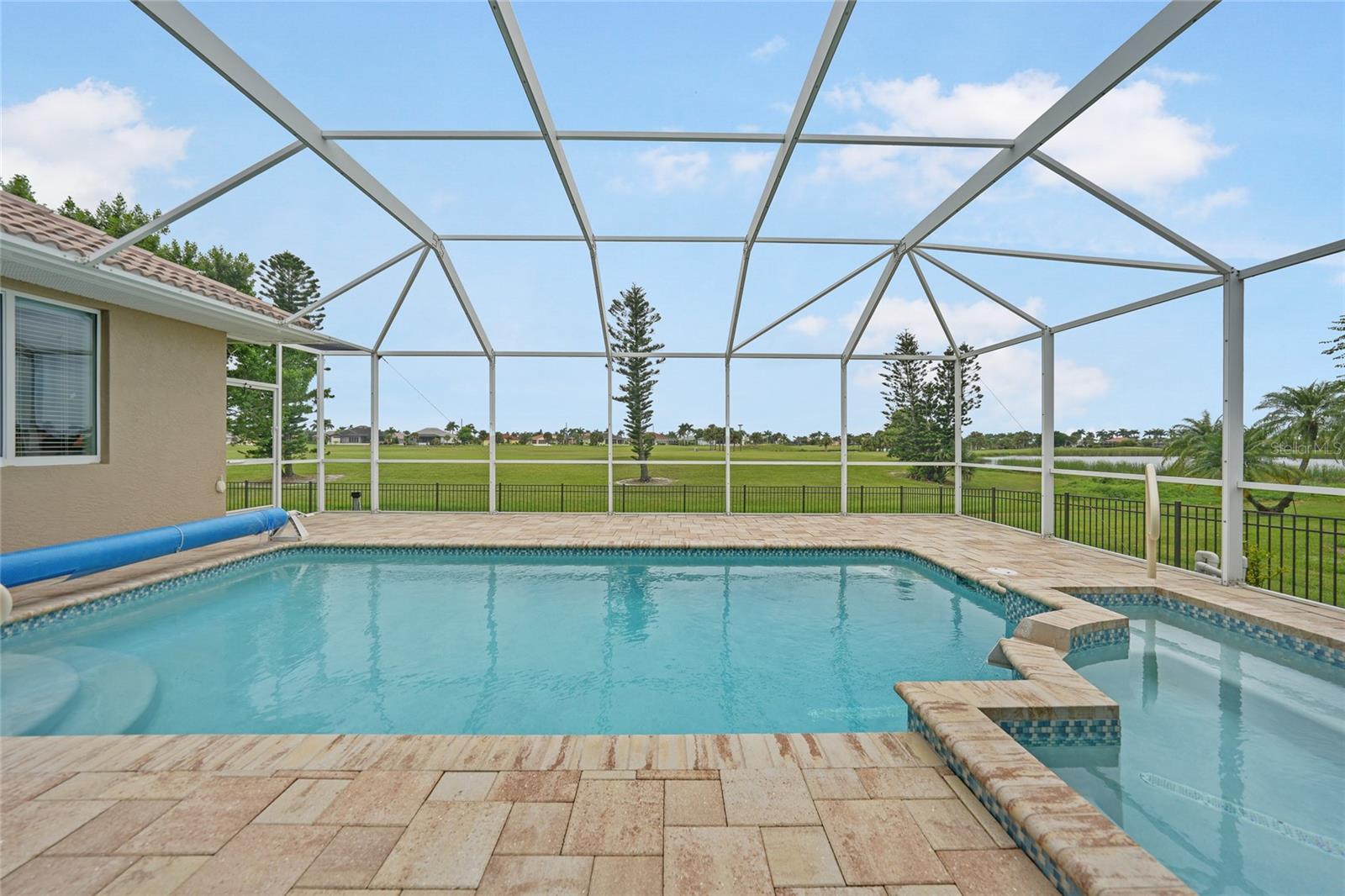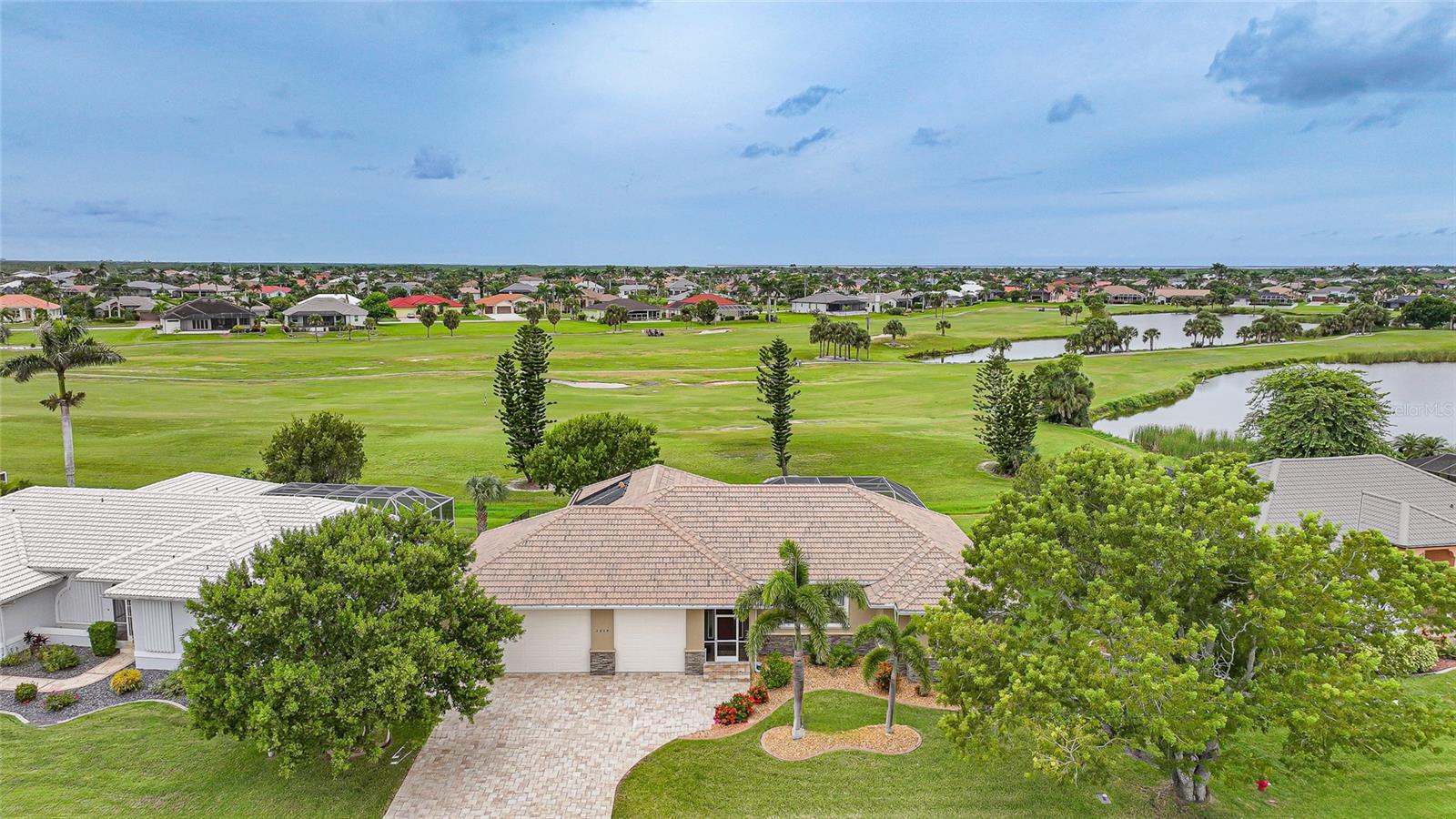 Welcome to 3829 Bordeaux Drive, perfectly situated on an oversized lot along the Twin Isles Golf Course in the sought-after community of Burnt Store Isles. Tucked away on a quiet street, this beautifully maintained home offers 3 bedrooms, 2 baths, and an oversized 3-car garage with 10 foot high doors and one of the bays is 30ft deep. It also features epoxy flooring and attic access. From the moment you step inside, the views will take your breath away. The expansive great room features backlit double tray ceilings with crown molding. The adjacent dining area as well as the great room boasts 8-foot hurricane-rated sliders that open fully to reveal the sparkling gas and/or solar-heated pool and spa overlooking the golf course and pond. The screened lanai is designed for relaxation and entertaining with paver flooring, wood ceilings, and a fully fenced backyard for added privacy. The chef’s kitchen showcases rich wood cabinetry with pull-out drawers, a tiled backsplash, stainless steel appliances, granite countertops, a GAS cooktop and oven, and a large 8-foot center island with seating. Just off the kitchen, a spacious utility room provides additional cabinetry, washer/dryer, utility tub, broom closet, and an extended home office area. The luxurious primary suite also opens to the lanai and features backlit tray ceilings, dual walk-in closets, a spa-like bathroom with Jacuzzi tub, walk-in shower, dual sinks, two linen closets, and a private water closet. A split floor plan ensures privacy, with two generously sized guest bedrooms on the opposite side of the home. They share a beautifully appointed full bath with dual sinks, granite counters, a linen closet, walk-in shower, and convenient pool access. Additional highlights include: tile flooring throughout (no carpet), reverse osmosis system, gas water heater, new HVAC (2023), and fresh exterior paint (2025). New Sprinkler Control Box (2025). Full Hurricane Protection. Homeowners Association is voluntary, and membership to Twin Isles Golf and Country Club is optional. This home is also conveniently located within close proximity to famous Fishermen’s Village, shopping, major highways and airports, and just a few minutes to downtown Punta Gorda, where you can enjoy its unique restaurants, pickle ball, biking, and waterfront activities.