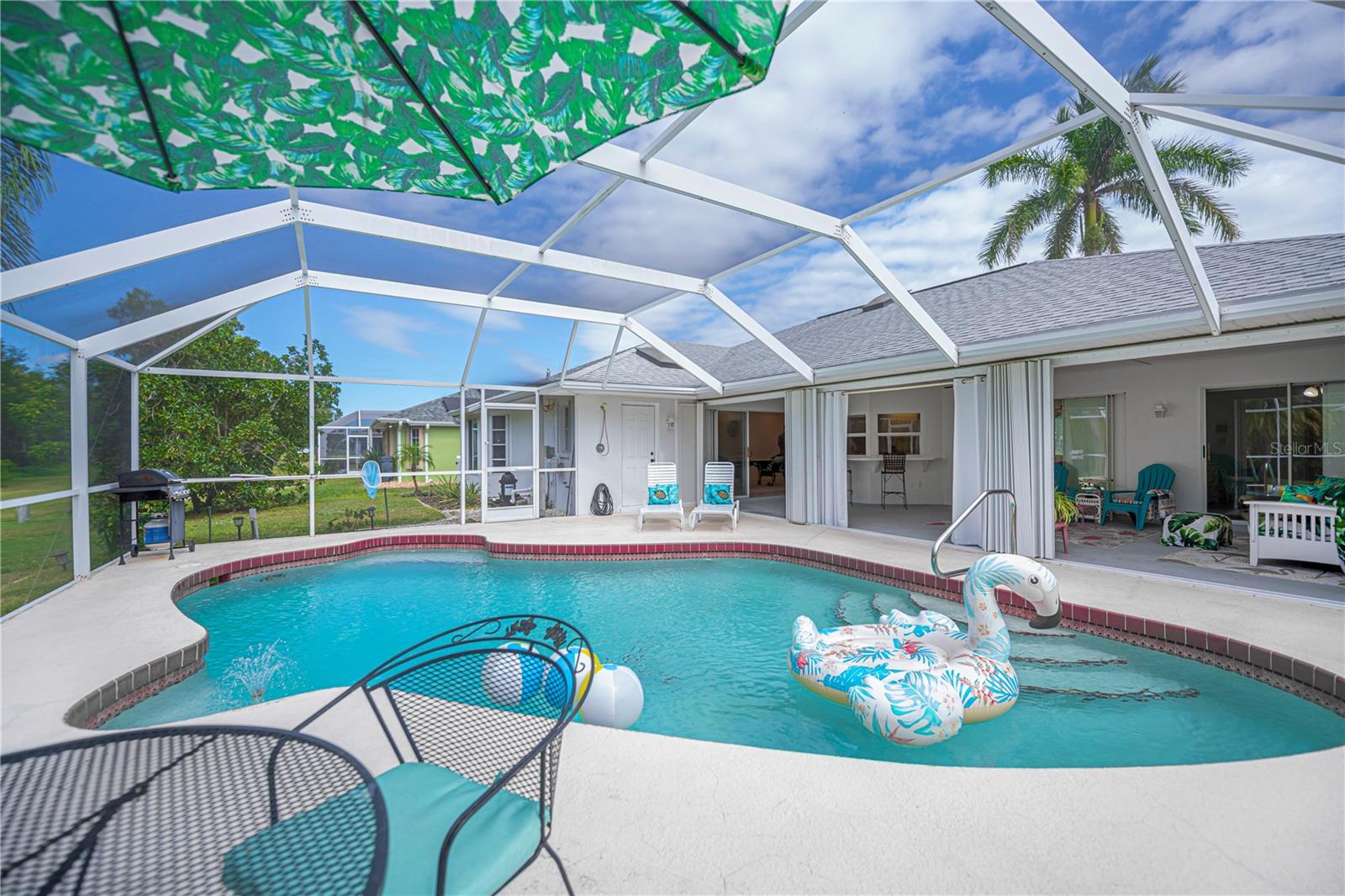 Privacy and Serenity Await You in This Stunning 3-Bedroom, 2-Bathroom, 2-Car Garage Home with Pool in the Desirable Deep Creek Community! Nestled against a uniquely deep, wooded greenbelt, this beautiful home offers an oasis of tranquility and privacy. The inviting curb appeal features rich stone accents, concrete curbing, a manicured yard, and mature landscaping. Relax on the screened front patio where gentle cross breezes enhance the peaceful atmosphere. Step inside to impressive vaulted ceilings, elegant decorator plant ledges, and abundant natural light. Multiple pocketing sliders seamlessly connect the indoor living spaces to the screened lanai and sparkling pool, creating the perfect environment for both everyday living and entertaining. The spacious floor plan includes a generous living room plus a combined dining and living area, all opening directly to the lanai and pool. The kitchen is a chef’s dream—ample cabinetry with convenient pullouts, a full pantry, breakfast bar, new appliances, tile backsplash, skylight and a built-in service cabinetry with triple window pass-through to the pool area for effortless serving of meals and beverages. Relax in the zen-like master suite overlooking the serene wooded backyard with private patio/pool access. The master retreat features dual walk-in closets and an elegant ensuite bathroom with dual sinks and a spacious shower. Guests will appreciate either of the large, comfortable secondary bedrooms that share a convenient poolside bathroom. Enjoy year-round vacations at home with the screened, sparkly pool surrounded by lush greenery, a covered lanai, and an outdoor shower. Three sets of pocketing sliders blur the line between indoor and outdoor living, creating a memorable setting for family and friends. GARDENER ALERT...extra space here you will undoubtedly fall in love with this backyard canvas, already having fresh produce in the making! Enjoy your own tropical backyard paradise with thriving banana, pineapple, and avocado trees, bringing a true taste of Florida living to your doorstep. Recent updates add tremendous value and peace of mind, including a new roof, new AC with ductwork, new water heater, survey, 2020 pool pump, whole-home Generac generator, and easy-care accordion shutters. The fenced side yard provides a perfect dog run for your furry friends. Ideally located with the utmost privacy, this extra special home offers public water and sewer services and is NOT in a flood zone. This is the Florida lifestyle you have been dreaming of year round or a wonderful winter escape ready for you to start enjoying now. Close to dining, entertainment, beaches, Sunseeker resort, downtown historic Punta Gorda, I-75, PG Airport and in a nice deed restricted community with low yearly hoa. Don’t miss your opportunity to own this gorgeous retreat and enjoy the best of Deep Creek living, this home is priced to move quickly, schedule your showing TODAY!