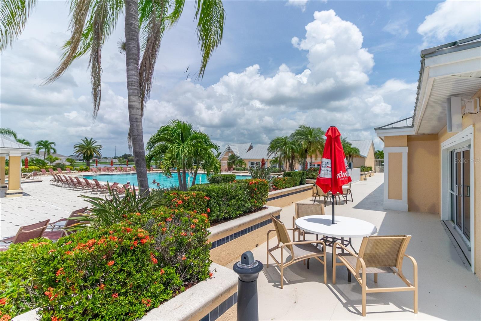 PRICE IMPROVEMENT....Fantastic water and golf course view from the lanai or patio of this gorgeous Bristol model. This home features 2 large bedrooms and a Den/Study/Office (optional 3rd. bedroom), tile and wood floors (no carpet) in the gated golf course/resort community of Kings Gate. The kitchen offers plenty of cabinet space, a built-in wine rack and wine cooler and newer stainless steel appliances. The attached laundry area has lots of shelving and new (2024) stacked washer and dryer. The large master bedroom and attached bathroom offers his-and-hers closets, walk-in shower, and spacious vanity. The lanai is fully enclosed with vinyl windows and offers a great place to have your morning coffee or tea while watching the birds in the Purple Martin birdhouse in the back yard. Out back you have a brick paver patio to enjoy the afternoon sun and watch the golfers on the 2nd hole of the golf course. The 2 1/2 car garage is a "mans dream", oversized with large workshop and room for your tools and the golf cart. Kings Gate offers plenty of options for activity--Olympic sized pool with cabanas and hot tub, tennis courts, pickle-ball courts, lawn bowling, shuffle board, boccie, horseshoes, a gym/fitness center, billiard room, and a library. A full-time Lifestyle Director coordinates many clubs, euchre, bingo, bridge, poker and Texas Hold-em, mahjong and many other activities. The newly remodeled Lions Den restaurant is a full service dining facility and holds Karaoke and trivia nights. The golf course is a challenging 18-hole executive with daily greens fees and optional annual memberships. Kings Gate is conveniently located near I-75 and close to shopping and all the amenities the Charlotte Harbor area has available including the Gulf of Mexico and the Punta Gorda Fishermans Village. OH, and let's not forget the Newly Opened Aldi's grocery store in the adjacent plaza which is just a golf cart drive away. Call today and come take a look, you'll fall in love.
