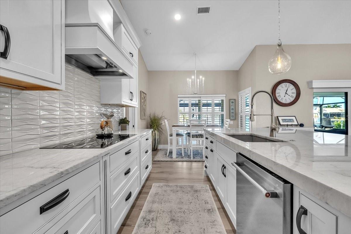 Welcome to this beautifully updated waterfront pool home in the highly sought-after Punta Gorda Isles (PGI) community. Nestled along a tranquil waterway on a quiet cul-de-sac, this single-story residence offers 2,439 sq ft of thoughtfully designed living space with 3 bedrooms and 2 bathrooms. The light, neutral exterior is complemented by a classic tile roof, paver driveway, and two-car garage, while new landscaping with fresh curbing and lush tropical plants enhances the serene coastal appeal. Boating enthusiasts will love the 81' of waterfront, complete with a city-maintained concrete seawall, concrete dock with new pilings, water and electric hook-ups, and an updated 10,000-lb remote boat lift. Quick access to open water—just 15 minutes—to Charlotte Harbor and the Gulf of Mexico makes this property a true waterfront gem. Step through double etched-glass front doors into a welcoming foyer leading to the bright great room with soaring vaulted ceilings, recessed lighting, and wide-plank flooring. The open layout connects the dining area and beautifully updated kitchen, creating ideal flow for living and entertaining. Eight-foot disappearing sliders frame peaceful water views and open directly to the pool area. The kitchen combines elegance and functionality with crisp white shaker cabinetry, top-of-the-line KitchenAid appliances including beverage refrigerator, a Jenn-Air cooktop, and Quartzite countertops. A center island with casual seating, pendant lighting, textured tile backsplash, and custom range hood provide striking details. A cozy dinette opens to the pool, ideal for indoor-outdoor living. The spacious primary suite offers plush carpeting, two custom walk-in closets, and direct lanai access with serene pool and canal views. The spa-inspired primary bathroom features a large walk-in shower with floor-to-ceiling marble-style tile and frameless glass, a dual-sink Quartz vanity with ample storage, and a freestanding soaking tub beside bright plantation-shuttered windows—creating a peaceful retreat. A split-bedroom floor plan ensures guest privacy, with two generously sized bedrooms featuring built-in closets; one offers direct pool access. The updated guest bathroom includes a walk-in shower with floor-to-ceiling tile, modern frameless glass enclosure, and stylish vanity with marble-style countertop and upgraded lighting. Plantation shutters and warm wood-look flooring create a bright, inviting space. Step outside to your private oasis, where a covered lanai with ceiling fans provides year-round comfort. In 2020, the pool was resurfaced and the brick paver decking extended, creating a seamless flow throughout the outdoor space. Enjoy a sparkling saltwater heated pool enclosed by a new panoramic pool cage, with ample deck space for sunbathing and entertaining—perfectly capturing the essence of Florida outdoor living. Additional highlights include an inside laundry room with extra storage and laundry sink, washer and dryer, water heater & tankless hot water heater supplies primary bath (2020), water softener (2020), pool heat pump (2019), plantation shutters, cement tile roof, irrigation, all new hurricane impact windows and doors, and wood-look tile throughout the main living spaces. Ideally located near I-75/US41, Fishermen's Village, downtown Punta Gorda, Saint Andrews Golf Course, and world-class boating, fishing, and sailing. **PLEASE ENJOY THE 3D INTERACTIVE VIRTUAL TOUR ASSOCIATED WITH THIS LISTING**