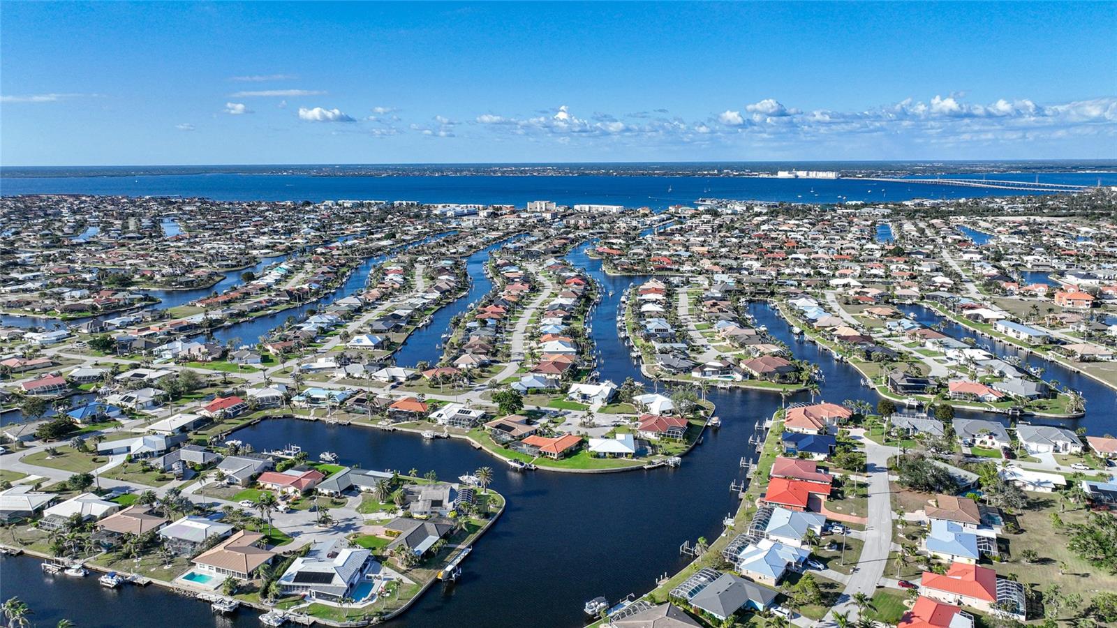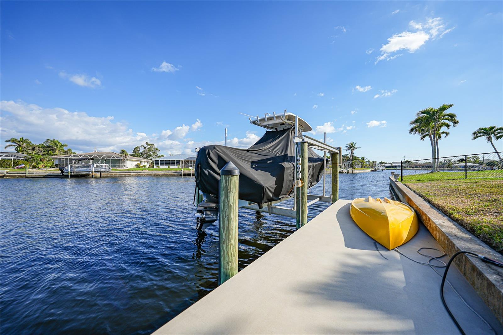 Exceptional, well-maintained PGI home offers all the features of true Florida living— experience, the sun and moon rise over the canal from the entire back of the house and the sunset from the pool lanai. In addition to the many amenities that follow, this home is 12 minutes to open water at Fisherman’s Village. The open concept floorplan includes a bright updated kitchen, with granite counters, stainless appliances, large pantry, and breakfast nook, Dining room/Great room with vaulted ceiling and 15’ of glass sliders flowing to the 36’ lanai with wide canal views. 140 feet of waterfront includes 59’ concrete dock and 10K boat lift for all your water toys. Inside, the split bedroom floorplan is perfect for hosting guests. Primary suite includes a slider to the lanai and canal views, ensuite with double sink, long vanity, tile shower, and walk-in closet with modular shelving. At the other end of the home are two bedrooms that share a full bath with access to the private pool area. One bedroom is currently being used as an office, the other has a queen-size Murphy bed with bookcase and new closet system. A laundry/storage room connects the kitchen to the two-car garage. New; powered hurricane shades on lanai, water heater, metal roof in 2023 with 40-year transferable warranty, A/C 2025. Bring your bathing suit and fishing rod, it’s time to enjoy all that Southwest Florida has to offer. Some furnishings are available under separate contract. Be sure to click on the video and virtual tour attached. Make an appointment to view today!