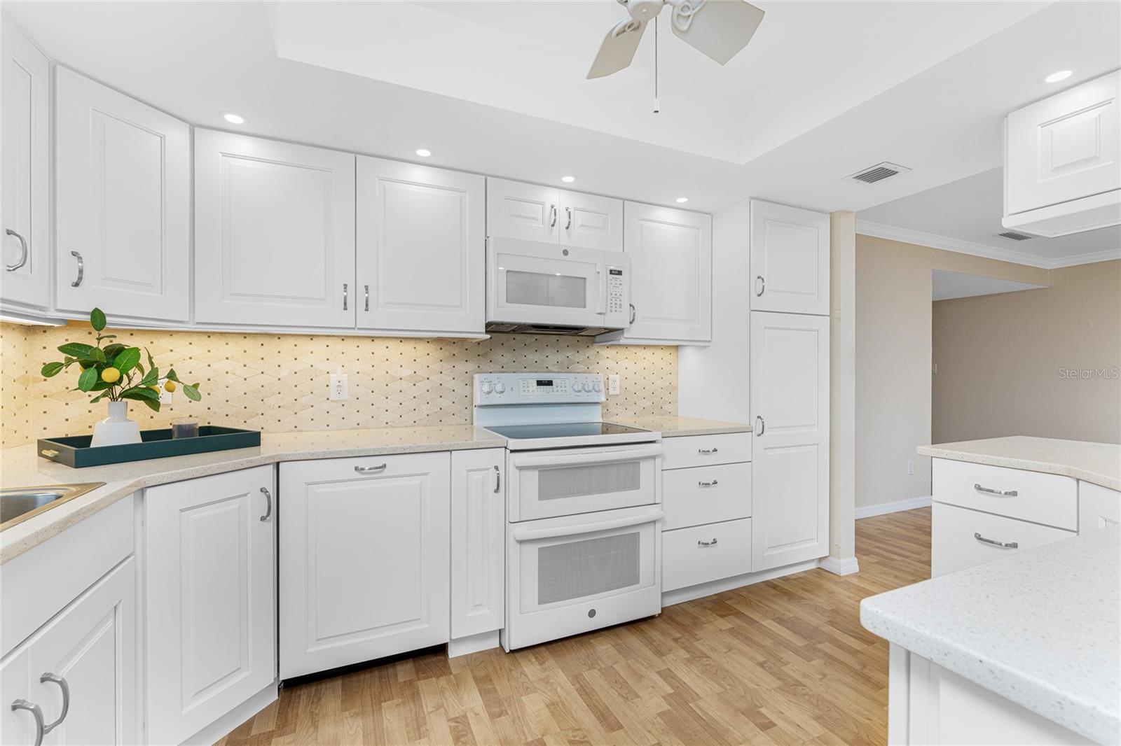 One or more photo(s) has been virtually staged. This beautifully updated Commodore Club condo in Burnt Store Marina offers a blend of thoughtful upgrades, flexible living space, and a peaceful, park-like setting. As a top floor end unit, the condo enjoys extra natural light, including a window in the kitchen, and open views from the lanai where you can take in the expansive green space while still enjoying the gentle rhythm of neighborhood activity. The enclosed lanai features triple-pane impact sliding doors, creating a comfortable year-round space to relax, entertain, or simply enjoy the scenery. The kitchen and bathrooms were remodeled in 2019 by Sandstar Remodeling, with a design that prioritizes both style and function. The kitchen showcases updated light cabinetry with pull out drawers, lazy Susans, a spice cabinet, pantry with pull out drawers, stone countertops, and a large open breakfast bar—perfect for casual meals or entertaining. Updated appliances, including a double convection oven, making this kitchen as practical as it is inviting. Laminate flooring runs throughout the main living areas, with tile in the bathrooms for easy care. The primary bedroom features a door to the lanai, open views, and dual closets, while the remodeled bathroom boasts an updated double vanity and a spacious, beautifully tiled walk-in shower.The guest bedroom is equally versatile, featuring custom Murphy beds with a fold-down table/desk, ideal for hosting guests while maintaining flexible workspace or hobby room options. Additional upgrades include impact windows throughout, AC replaced in 2019, washer replaced in 2024, dryer in 2023, and a water purification, softener with reverse osmosis in 2024. The condo is offered partially furnished, making it easy to settle in and start enjoying the Burnt Store Marina lifestyle right away. A convenient storage closet off the screened in entry lanai and covered carport provide conveniences that you are sure to appreciate. The Commodore Club complex offers residents an inviting heated community pool and a spacious clubhouse with an entertaining kitchen. Located in a vibrant, amenity-rich community, residents of Burnt Store Marina enjoy world-class boating and fishing from SW Florida’s largest deep water marina, a 27 hole golf course, two restaurants, tennis, fitness and pickleball.