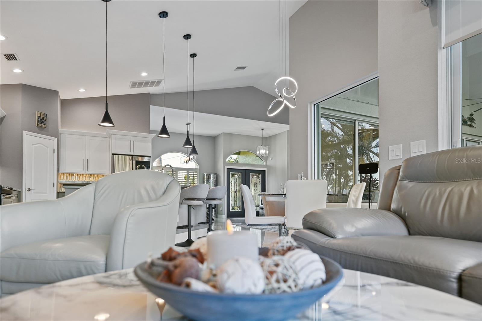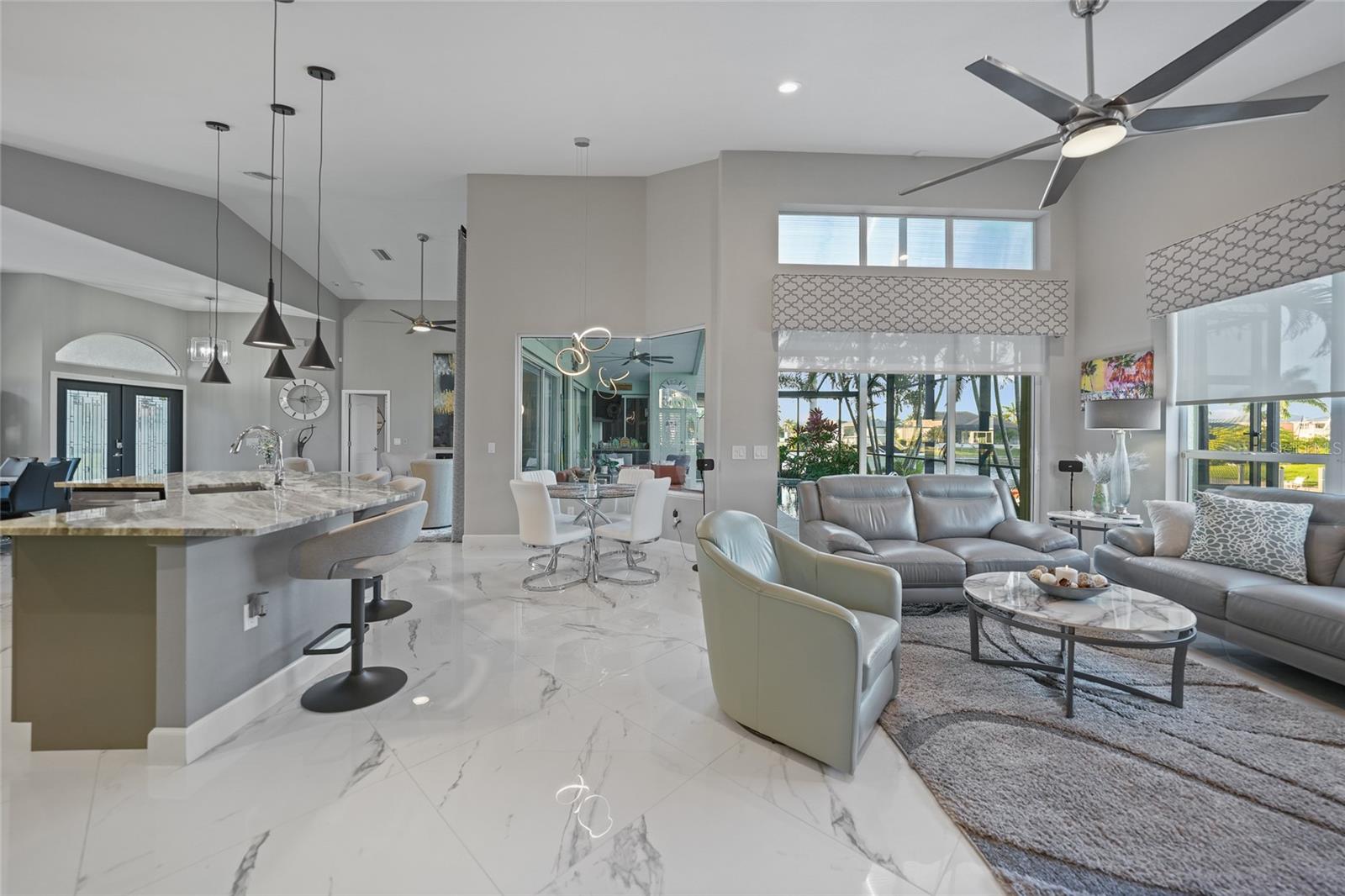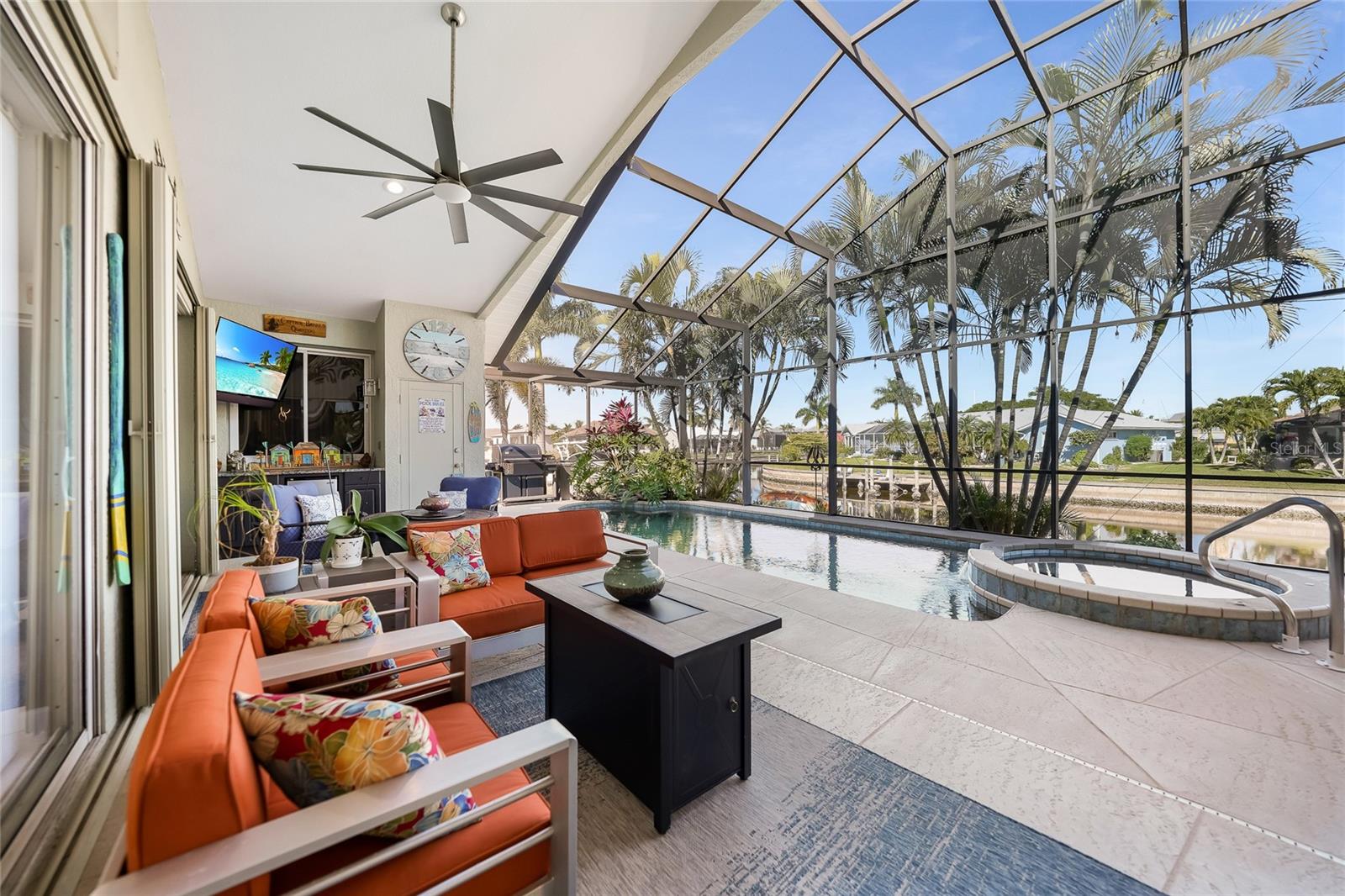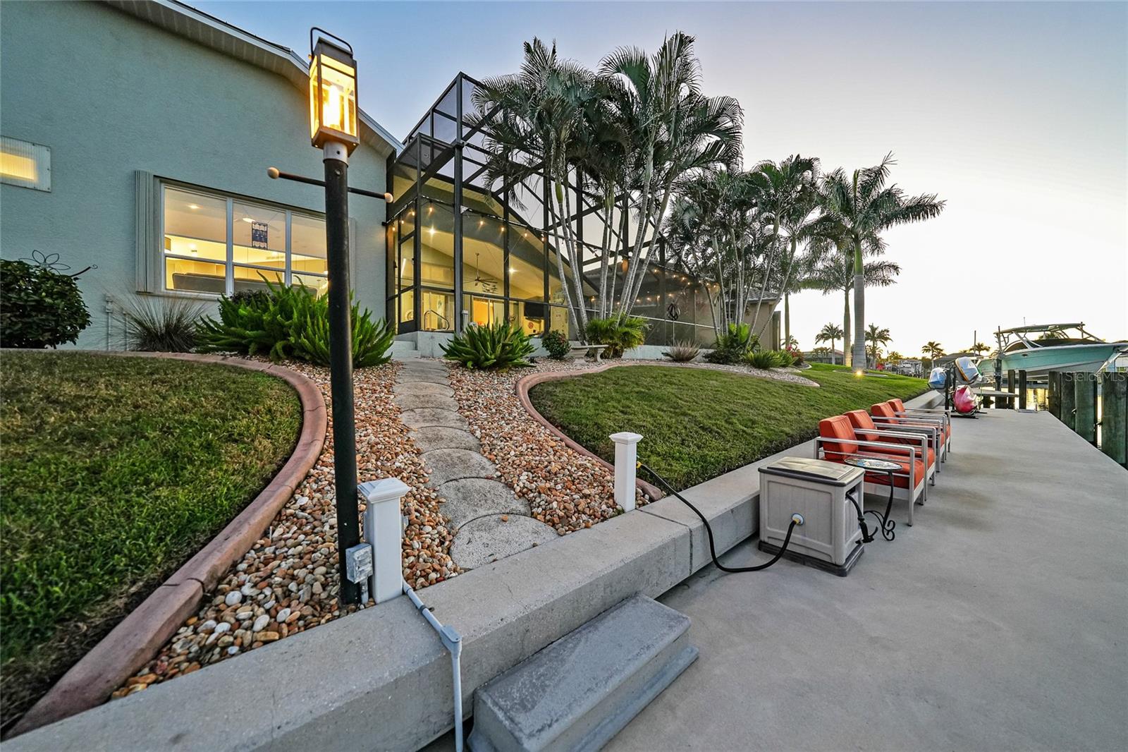 Welcome to 3400 Nighthawk Court, a refined waterfront retreat where modern luxury meets true Florida boating lifestyle. Perfectly positioned on intersecting canals with sailboat access and no bridges, this completely updated 3-bedroom plus den/bonus room, 2-bath home offers exceptional water views, thoughtful upgrades throughout, and effortless indoor–outdoor living. From the moment you arrive, the home’s fresh exterior paint, new metal roof, and oversized two-car garage set the tone for quality and durability. Inside, the open-concept layout is filled with natural light, enhanced by high ceilings, beautiful continuous flooring, and plantation shutters on almost every window. Modern light fixtures and a cohesive design create a clean, sophisticated atmosphere that feels both inviting and elevated. The heart of the home kitchen has been designed for entertaining, featuring granite countertops, generous prep space, and seamless flow into the living and dining areas—all overlooking the water. Sliding doors open to the lanai, where the outdoor living experience truly shines. Step outside to your private waterfront oasis complete with a saltwater pool and spa, featuring a new pool and spa heater, and tranquil canal views from nearly every angle. Boaters will appreciate the 140 feet of seawall, 80-foot newer dock with electric and water, and a newer 35,000-lb boat lift, making this a rare find for serious yachting enthusiasts. The oversized garage is finished with an epoxy floor and equipped for versatility, offering a generator connection, RV power hookup, and ample space for storage or projects. Additional premium features include hurricane shutters on all windows, a whole-house water treatment system, and an under-counter reverse osmosis system for drinking water. Perfect for ease of mind, and quality living. Thoughtfully updated, impeccably maintained, and ideally located on the water, this home delivers the best of Punta Gorda living—where luxury, comfort, and boating come together in perfect balance.