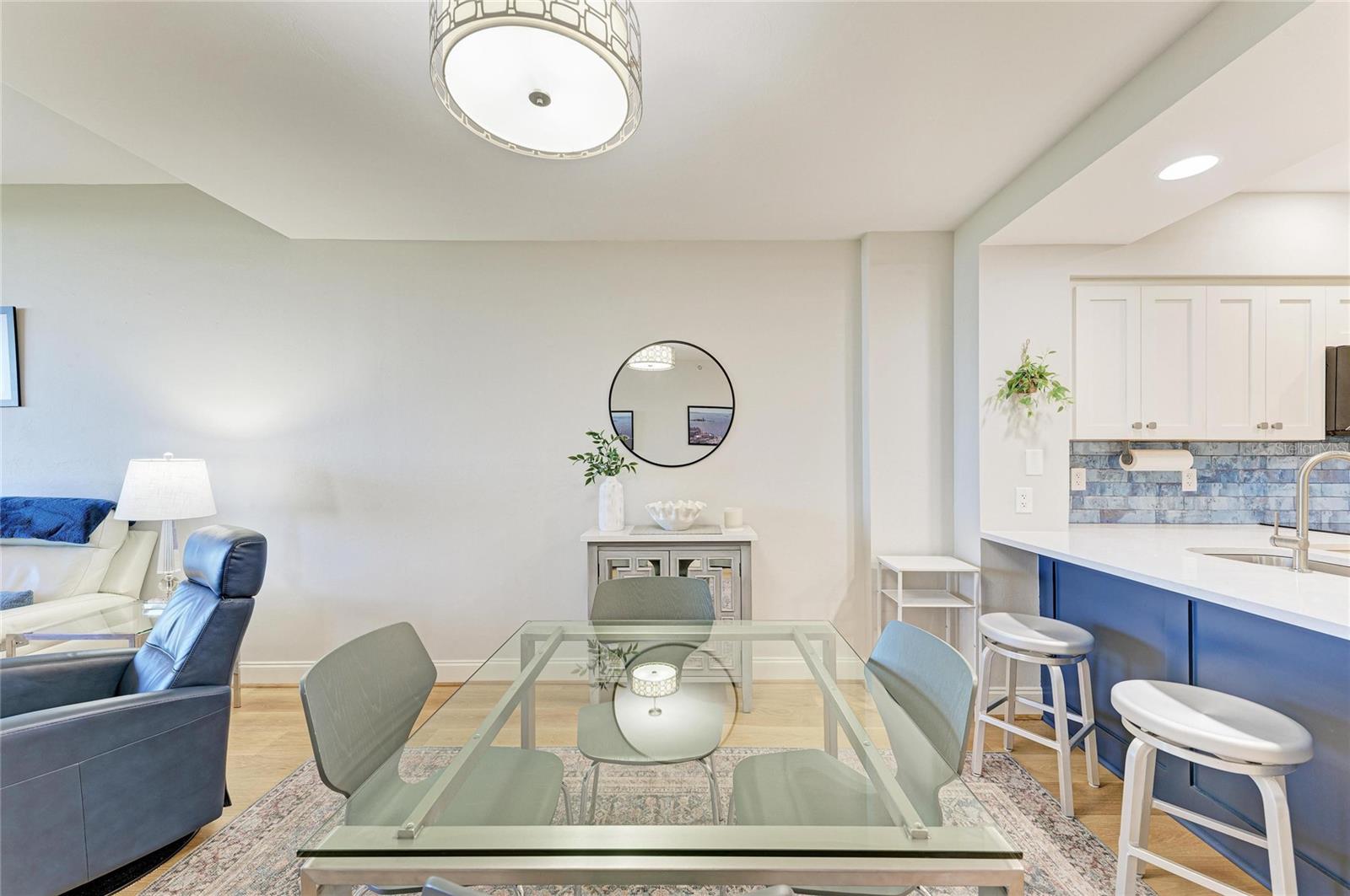 Experience the Burnt Store Marina lifestyle, where Charlotte Harbor views, glowing sunsets, and the gentle rhythm of marina life set the tone for every day. This completely re-imagined, beachy-contemporary residence welcomes you with volume ceilings, an open great room design, and a dramatic wall of sliding glass doors that draw sunlight, water views, and coastal breezes straight into the heart of the home. Wood and tile flooring paired with soft coastal tones create a light, airy backdrop that feels relaxed, refined, and perfectly in tune with the waterfront setting. Just beyond the sliders, the screened lanai becomes an everyday retreat — a place for slow mornings with coffee, afternoons watching boats glide through the channel, and evenings painted in sunset color. With front-row harbor views and gentle coastal breezes, this is where indoor comfort gives way to the rhythm of waterfront living. Located on the 4th level, this 2-bedroom, 2-bath residence captures the panoramic water views buyers dream about — sparkling harbor waters by day and breathtaking Punta Gorda sunsets in the evening. The kitchen feels welcoming and easy, showcasing a fresh two-tone palette of white upper cabinets and rich dark-blue lowers, eye-catching quartzite countertops, a bold backsplash, and newer stainless appliances. The breakfast bar is made for quick bites, morning coffee, and easy conversation, while the open layout keeps everything connected — so whoever’s cooking never misses the views or the fun. The primary suite opens directly to the lanai, allowing you to wake to soft morning light and coastal breezes. The ensuite bath includes a walk-in shower, dual vanities, and excellent storage with both a walk-in and linen closet. Bedroom two serves as a comfortable guest retreat, conveniently located near the full guest bath. Additional highlights include a stackable laundry closet tucked behind a stylish barn door and easy access private climate-controlled storage room. Vista Del Sol residents enjoy a private upscale amenity package with a resort-style pool and spa, grilling areas, outdoor dining, and sunning decks. Beyond your building, Burnt Store Marina & Country Club offers the Platinum Point Yacht Club, executive golf, tennis and pickleball, Freedom Boat Club access, and waterfront dining at Cass Cay or casual clubhouse fare. Evenings on the Ship’s Store deck often include harbor breezes — and visits from dolphins and manatees. **Waterfront days, sunset evenings, and the easy rhythm of marina life — this is coastal living done right.**