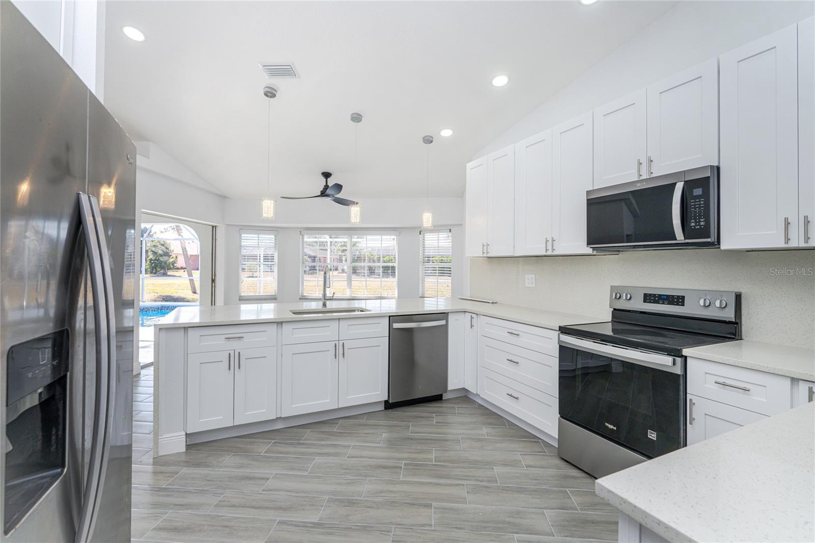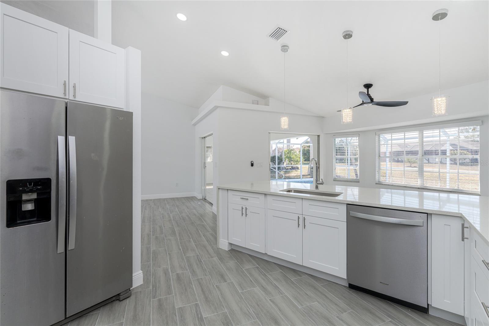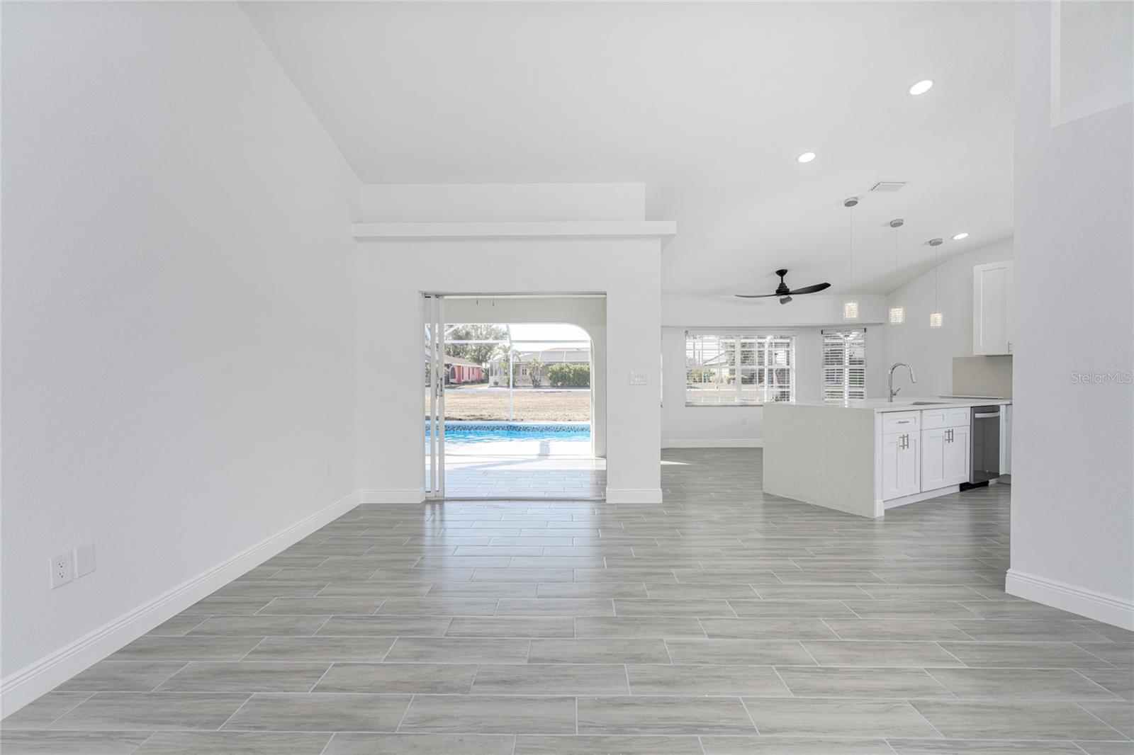 Located in DEEP CREEK, this 3 bedroom, 2 bath POOL HOME offers extensive upgrades, energy efficiency, and exceptional outdoor living. The interior features SOARING CEILINGS THROUGHOUT, creating an open and spacious feel, along with TILE FLOORING THROUGHOUT and a FULLY REMODELED finish. The kitchen is beautifully updated with QUARTZ COUNTERTOPS and ample workspace, ideal for everyday living and entertaining. The home also offers TONS OF LOFT SPACE FOR STORAGE, adding valuable functionality rarely found in homes of this style. Major improvements include a NEWER ROOF INSTALLED IN 2021, IMPACT WINDOWS INSTALLED IN 2019 with additional storm protection including ACCORDION SHUTTERS ON THE REAR LANAI and PAID OFF SOLAR PANELS INSTALLED IN 2023, providing long term durability and energy efficiency. Outdoor living is a standout feature with an OVERSIZED POOL MEASURING 14 X 27, surrounded by an expansive POOL DECK MEASURING 52 X 21 with plenty of space for a garden, sunbathing area, or outdoor grilling and entertaining. An OVERSIZED GARAGE offers excellent storage and flexibility. This home is NOT IN A FLOOD ZONE and is located in a deed restricted community with a VERY LOW HOA FEE. Conveniently close to shopping, dining, golfing, I-75, and SWFL's Gulf beaches, this move in ready home delivers comfort, quality, and value in one of the area’s most desirable communities.