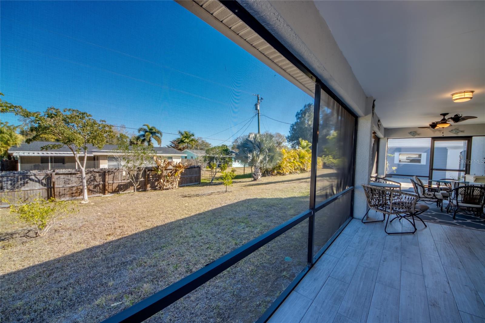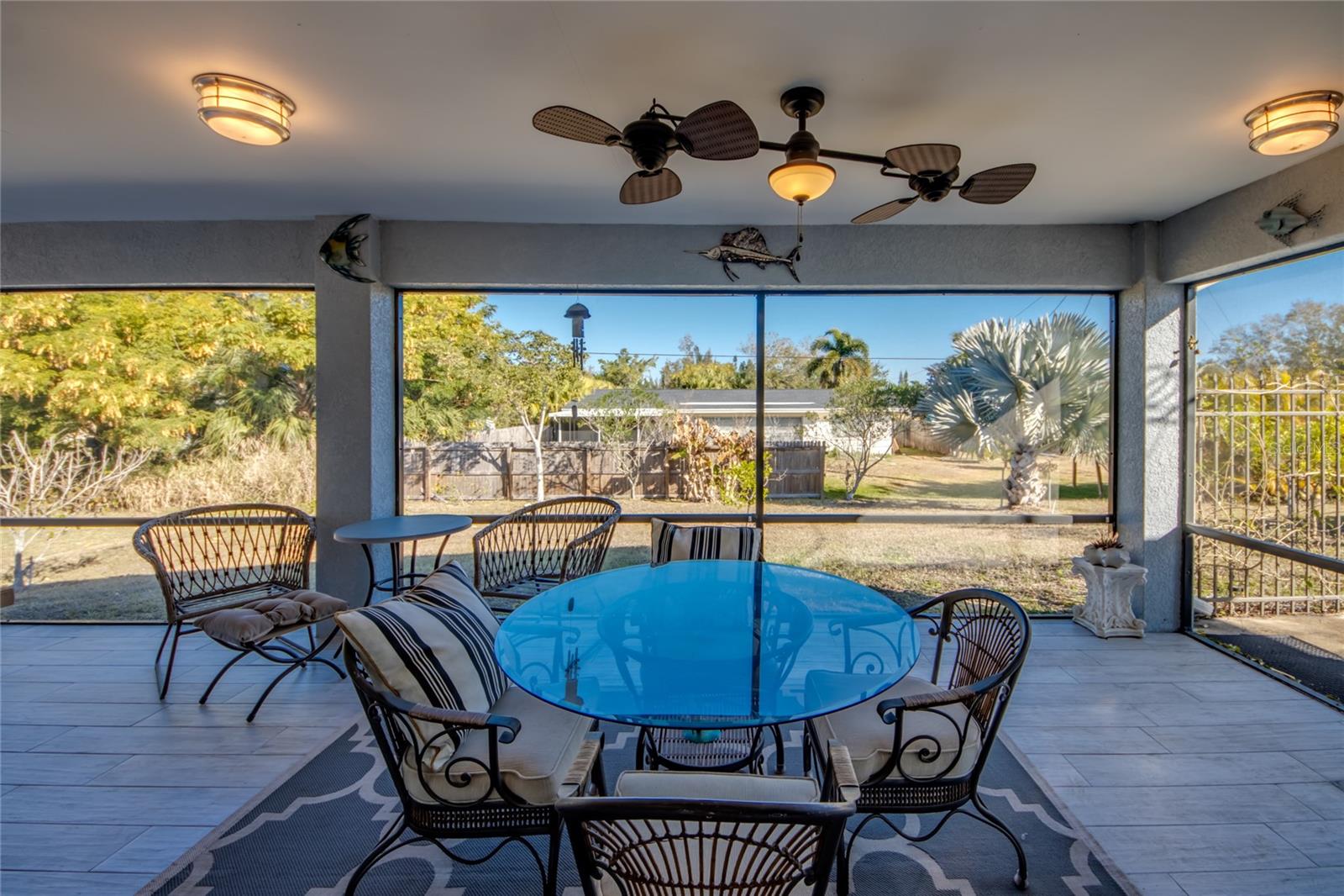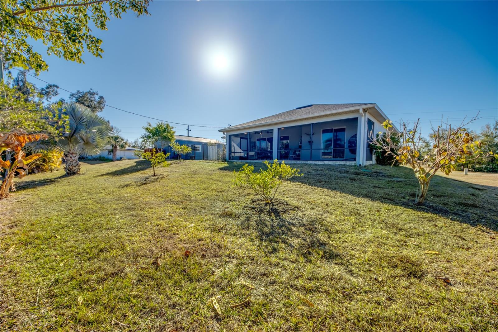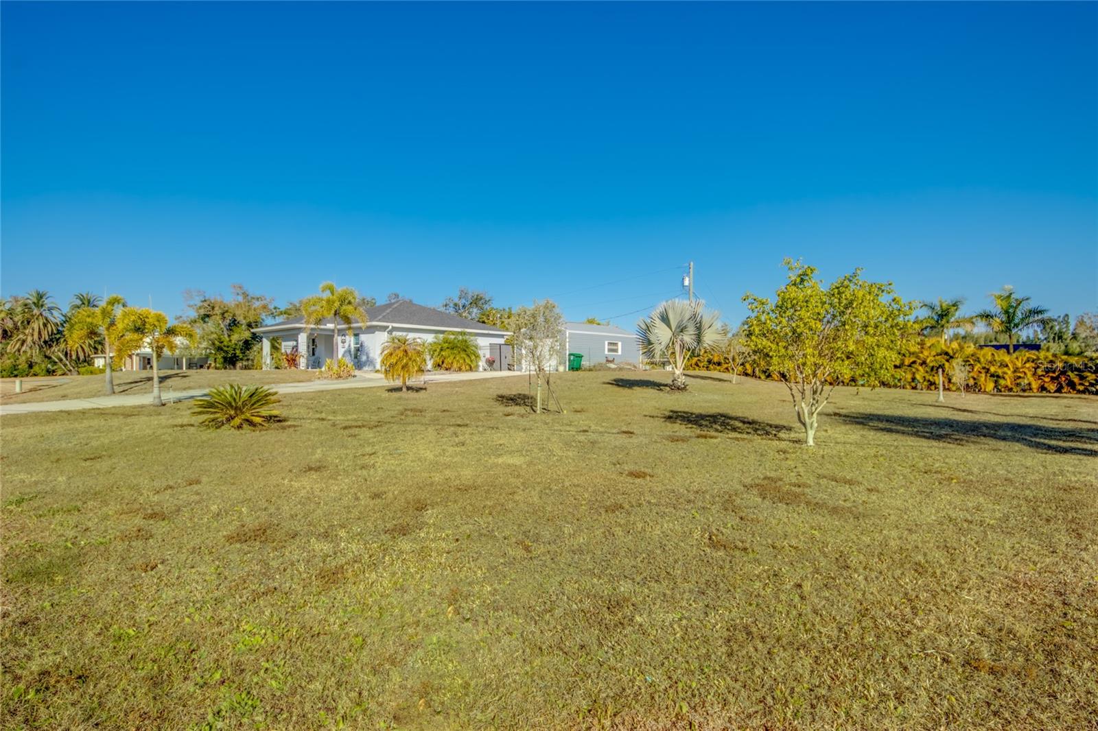 Here is your opportunity to own a beautifully designed custom-built 2-bedroom, 2-bath home with the perfect blend of comfort and style. All the while being situated on a HUGE built up housed on an oversized triple lot. Already setup with tropical lush palms, plants and trees scattered throughout the property. With the Standalone Shed large enough for a car, you will not lack curb appeal or storage space. A lovely walkway guides you to the home’s covered front porch, the ideal spot to start your morning or unwind in the evening while enjoying the peaceful neighborhood atmosphere. The elegant French doors lead you into a bright, open-concept living area filled with natural light that highlights the luxury plank tile flooring stretching seamlessly throughout the home. The kitchen is both beautiful and functional, featuring Level 2 granite countertops, ( also in all the bathrooms ), stainless steel appliances, and elegant pendant lighting that gives the space a refined, upscale touch. The split-bedroom layout ensures privacy for homeowners and guests. The guest suite, conveniently located on one side of the home, features a walk-in closet and direct access to the guest bath. On the opposite side, the oversized owner’s suite is a true sanctuary with a large walk-in closet, dual vanities, and a walk-through shower complete with a built-in bench and dual shower heads for a spa-like experience every day. There are large sliding glass doors from either the living area or owner’s suite that lead the expansive screened-in back lanai that stretches across the entire back of the home. This outdoor living area is perfectly designed for enjoying the crisp breeze and snow free Florida retreat. With its prime location close to I-75 and downtown Punta Gorda, you’ll have effortless access to some of the area’s best dining, entertainment, and nightlife, all while enjoying the tranquility of your spacious, beautifully crafted home.