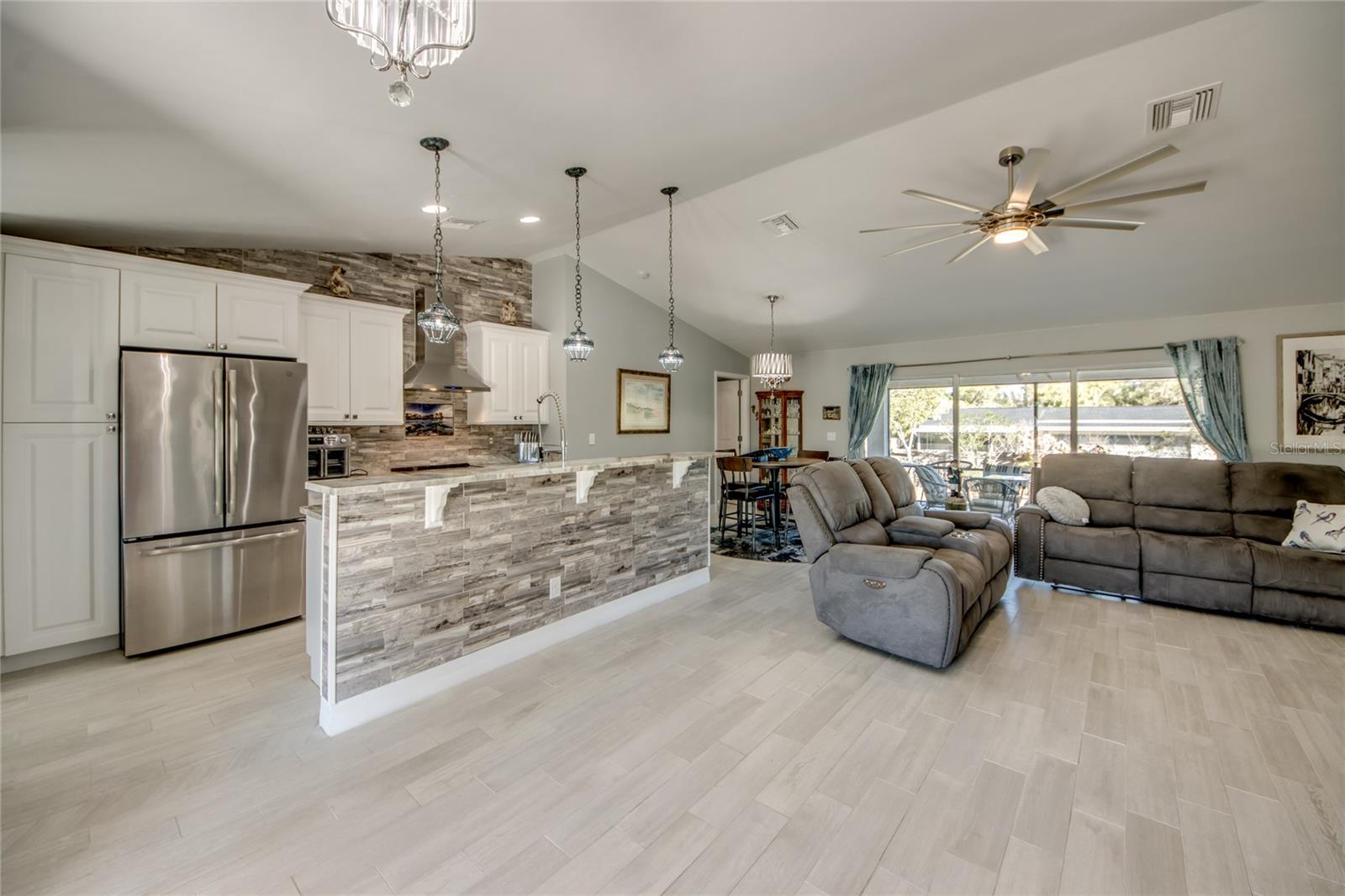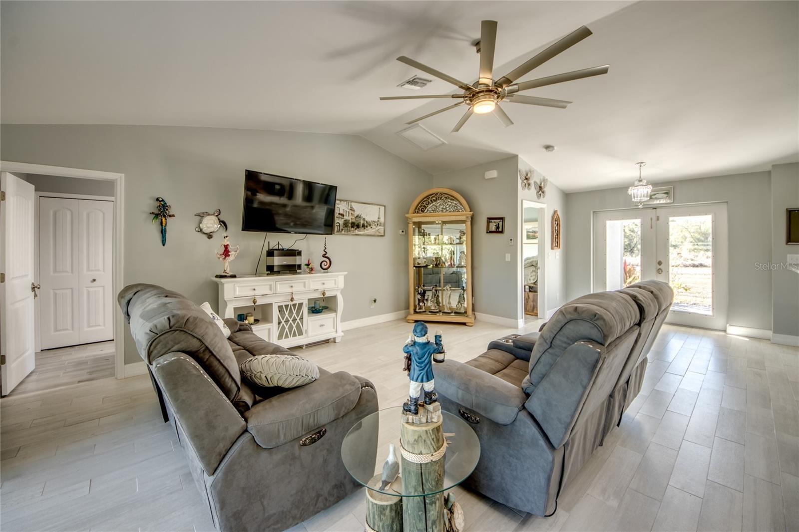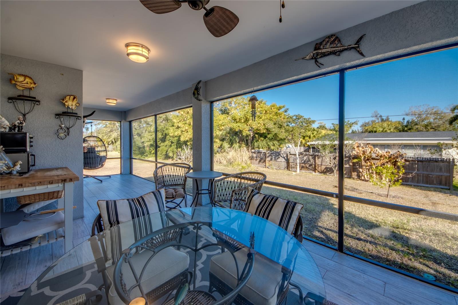 Here is your opportunity to own a beautifully designed custom-built 2-bedroom, 2-bath home with the perfect blend of comfort and style. All the while being situated on a HUGE built up housed on an oversized triple lot. Already setup with tropical lush palms, plants and trees scattered throughout the property. With the Standalone Shed large enough for a car, you will not lack curb appeal or storage space. A lovely walkway guides you to the home’s covered front porch, the ideal spot to start your morning or unwind in the evening while enjoying the peaceful neighborhood atmosphere. The elegant French doors lead you into a bright, open-concept living area filled with natural light that highlights the luxury plank tile flooring stretching seamlessly throughout the home. The kitchen is both beautiful and functional, featuring Level 2 granite countertops, ( also in all the bathrooms ), stainless steel appliances, and elegant pendant lighting that gives the space a refined, upscale touch. The split-bedroom layout ensures privacy for homeowners and guests. The guest suite, conveniently located on one side of the home, features a walk-in closet and direct access to the guest bath. On the opposite side, the oversized owner’s suite is a true sanctuary with a large walk-in closet, dual vanities, and a walk-through shower complete with a built-in bench and dual shower heads for a spa-like experience every day. There are large sliding glass doors from either the living area or owner’s suite that lead the expansive screened-in back lanai that stretches across the entire back of the home. This outdoor living area is perfectly designed for enjoying the crisp breeze and snow free Florida retreat. With its prime location close to I-75 and downtown Punta Gorda, you’ll have effortless access to some of the area’s best dining, entertainment, and nightlife, all while enjoying the tranquility of your spacious, beautifully crafted home.
