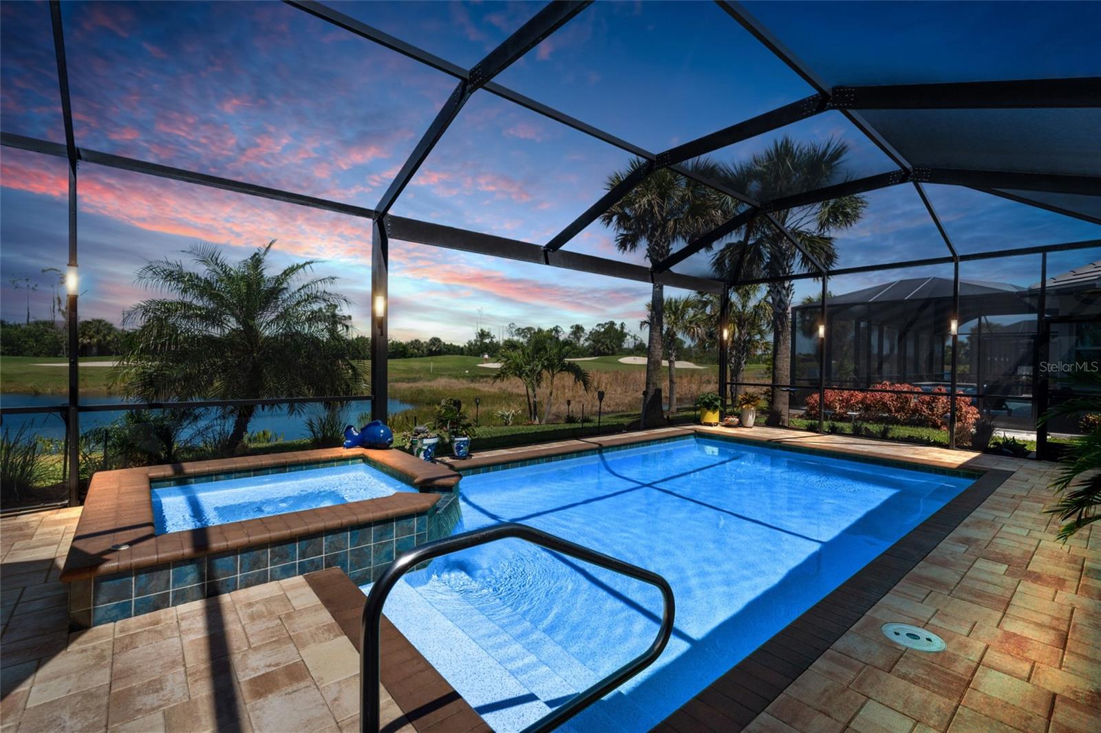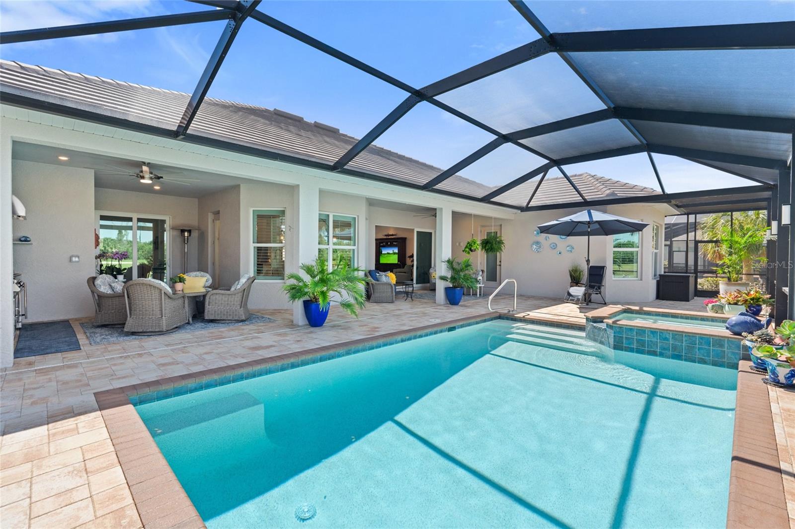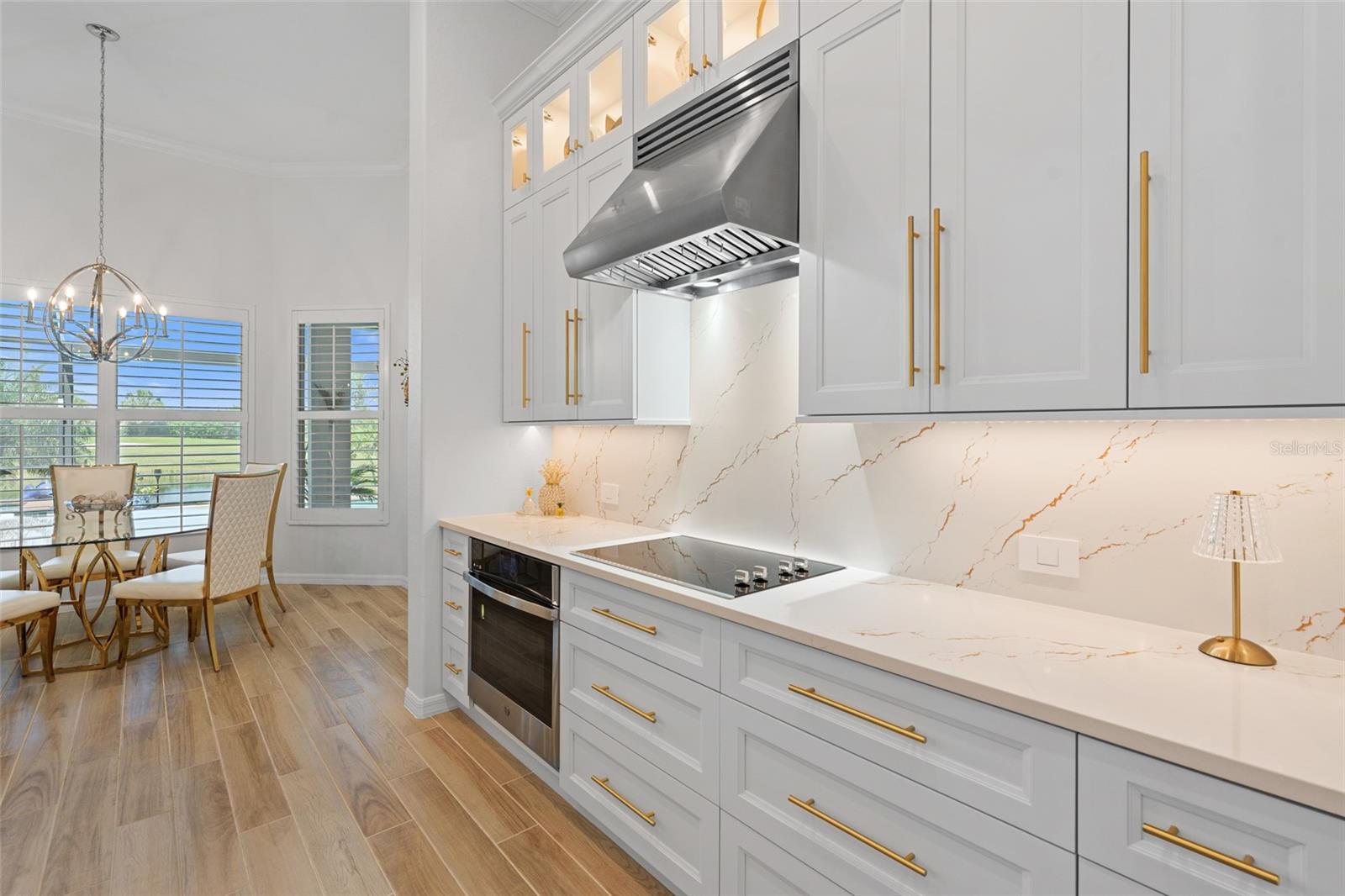 Experience elevated modern living in this impeccably upgraded Bougainvillea Estate home, complete with a GOLF MEMBERSHIP in Heritage Landing—one of Southwest Florida’s most sought-after golf communities. Designed for effortless living and entertaining, this residence showcases high-end finishes paired with smart, functional design throughout. The open-concept KITCHEN serves as a STRIKING FOCAL POINT, featuring custom maple cabinetry with illuminated glass-front displays, a redesigned layout with expanded island storage, and a dramatic single-slab quartz island. Quartz extends seamlessly up the backsplash, enhanced by under-cabinet lighting, designer pendant fixtures, and sleek pop-up outlets. New stainless steel appliances and modern plumbing fixtures complete a space that balances style and performance. Dining and breakfast areas connect naturally to the kitchen and are accented by statement chandeliers, plantation shutters, and a custom dry bar with quartz surfaces and integrated lighting—ideal for hosting or everyday enjoyment. The living area feels bright and architectural, highlighted by crown molding, subtle recessed lighting, and a custom TV wall feature. The primary suite offers a calm, private escape with upgraded carpeting, plantation shutters, crown molding, and a ceiling fan. The ensuite bath features a clean, modern look with updated lighting, upgraded finishes, and carefully selected details. Guest suites are equally inviting, offering en-suite or adjacent baths with quartz countertops, glass shower enclosures, upgraded hardware, and contemporary lighting. One guest bedroom opens directly to the lanai, strengthening the home’s indoor-outdoor connection. A flexible office or fourth bedroom is enhanced with coffered ceilings and additional lighting, creating a versatile space for remote work or guests. Step outside to a private resort-style lanai with new pavers, designed for sunset enjoyment. This expansive outdoor space includes a sparkling pool, outdoor kitchen, and PICTURE-FRAME SCREEN enclosure capturing wide WESTERN VIEWS. Seal-coated pavers, integrated frame lighting, no-see-um screens, all-weather ceiling fans, and TV-ready wiring create an ideal setting for relaxing or entertaining. Surrounding landscaping is enhanced with irrigation and lighting, while pool automation allows easy control from anywhere. The garage is thoughtfully equipped with added cabinetry, shelving, upgraded lighting, a ceiling fan, and a secondary refrigerator. A widened, extended paver driveway adds both curb appeal and everyday convenience. With clean lines, modern upgrades, and inviting outdoor living, this home offers a refined Florida lifestyle within one of the area’s premier golf communities.