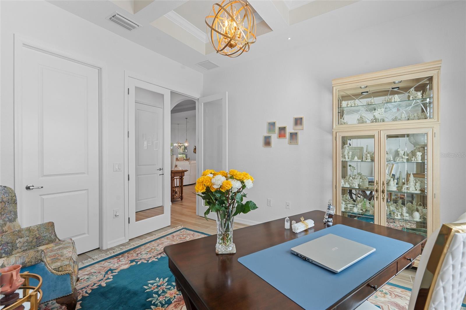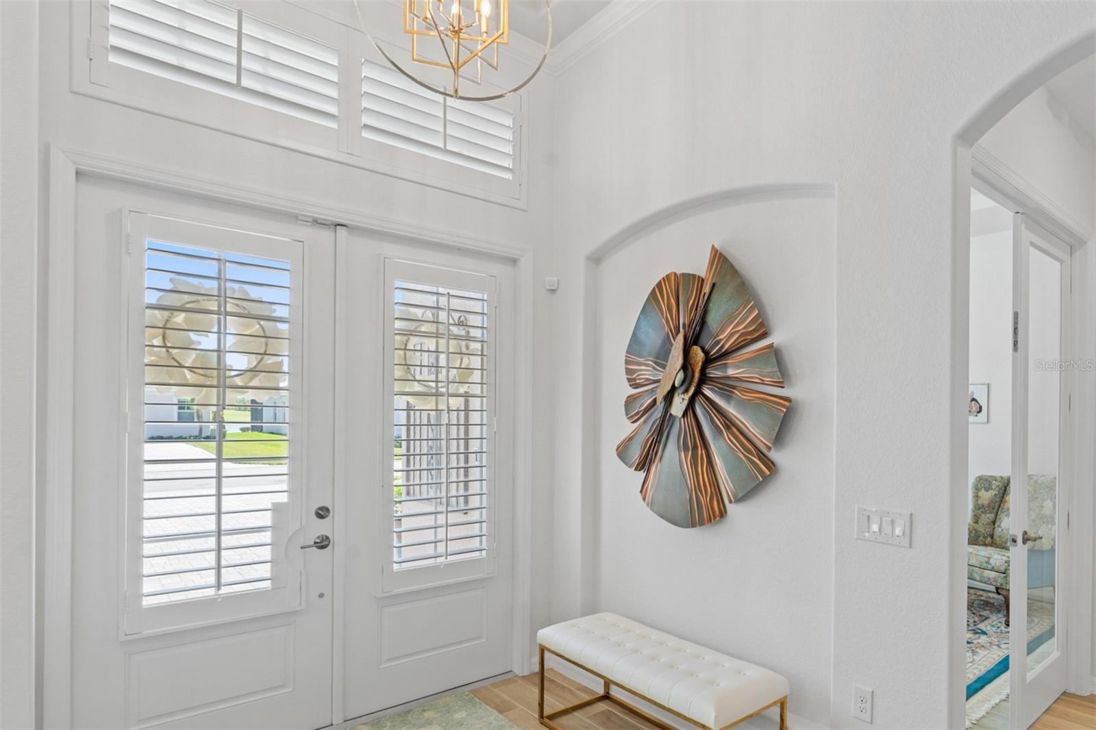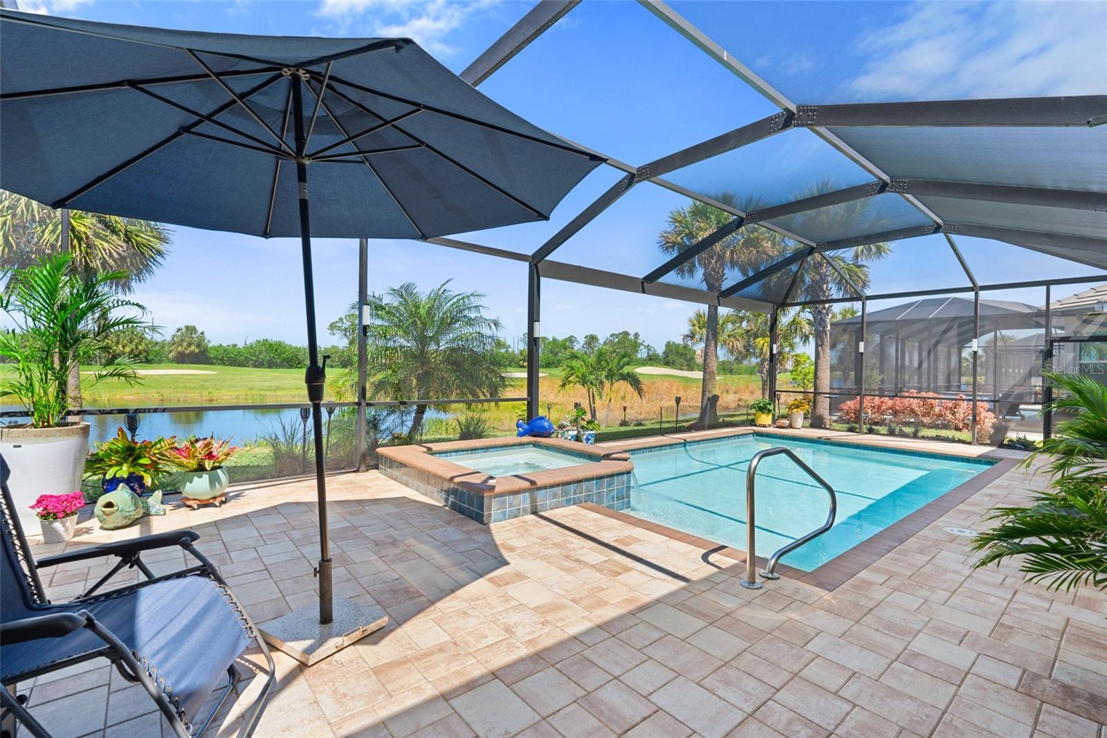 Experience elevated modern living in this impeccably upgraded Bougainvillea Estate home, complete with a GOLF MEMBERSHIP in Heritage Landing—one of Southwest Florida’s most sought-after golf communities. Designed for effortless living and entertaining, this residence showcases high-end finishes paired with smart, functional design throughout. The open-concept KITCHEN serves as a STRIKING FOCAL POINT, featuring custom maple cabinetry with illuminated glass-front displays, a redesigned layout with expanded island storage, and a dramatic single-slab quartz island. Quartz extends seamlessly up the backsplash, enhanced by under-cabinet lighting, designer pendant fixtures, and sleek pop-up outlets. New stainless steel appliances and modern plumbing fixtures complete a space that balances style and performance. Dining and breakfast areas connect naturally to the kitchen and are accented by statement chandeliers, plantation shutters, and a custom dry bar with quartz surfaces and integrated lighting—ideal for hosting or everyday enjoyment. The living area feels bright and architectural, highlighted by crown molding, subtle recessed lighting, and a custom TV wall feature. The primary suite offers a calm, private escape with upgraded carpeting, plantation shutters, crown molding, and a ceiling fan. The ensuite bath features a clean, modern look with updated lighting, upgraded finishes, and carefully selected details. Guest suites are equally inviting, offering en-suite or adjacent baths with quartz countertops, glass shower enclosures, upgraded hardware, and contemporary lighting. One guest bedroom opens directly to the lanai, strengthening the home’s indoor-outdoor connection. A flexible office or fourth bedroom is enhanced with coffered ceilings and additional lighting, creating a versatile space for remote work or guests. Step outside to a private resort-style lanai with new pavers, designed for sunset enjoyment. This expansive outdoor space includes a sparkling pool, outdoor kitchen, and PICTURE-FRAME SCREEN enclosure capturing wide WESTERN VIEWS. Seal-coated pavers, integrated frame lighting, no-see-um screens, all-weather ceiling fans, and TV-ready wiring create an ideal setting for relaxing or entertaining. Surrounding landscaping is enhanced with irrigation and lighting, while pool automation allows easy control from anywhere. The garage is thoughtfully equipped with added cabinetry, shelving, upgraded lighting, a ceiling fan, and a secondary refrigerator. A widened, extended paver driveway adds both curb appeal and everyday convenience. With clean lines, modern upgrades, and inviting outdoor living, this home offers a refined Florida lifestyle within one of the area’s premier golf communities.