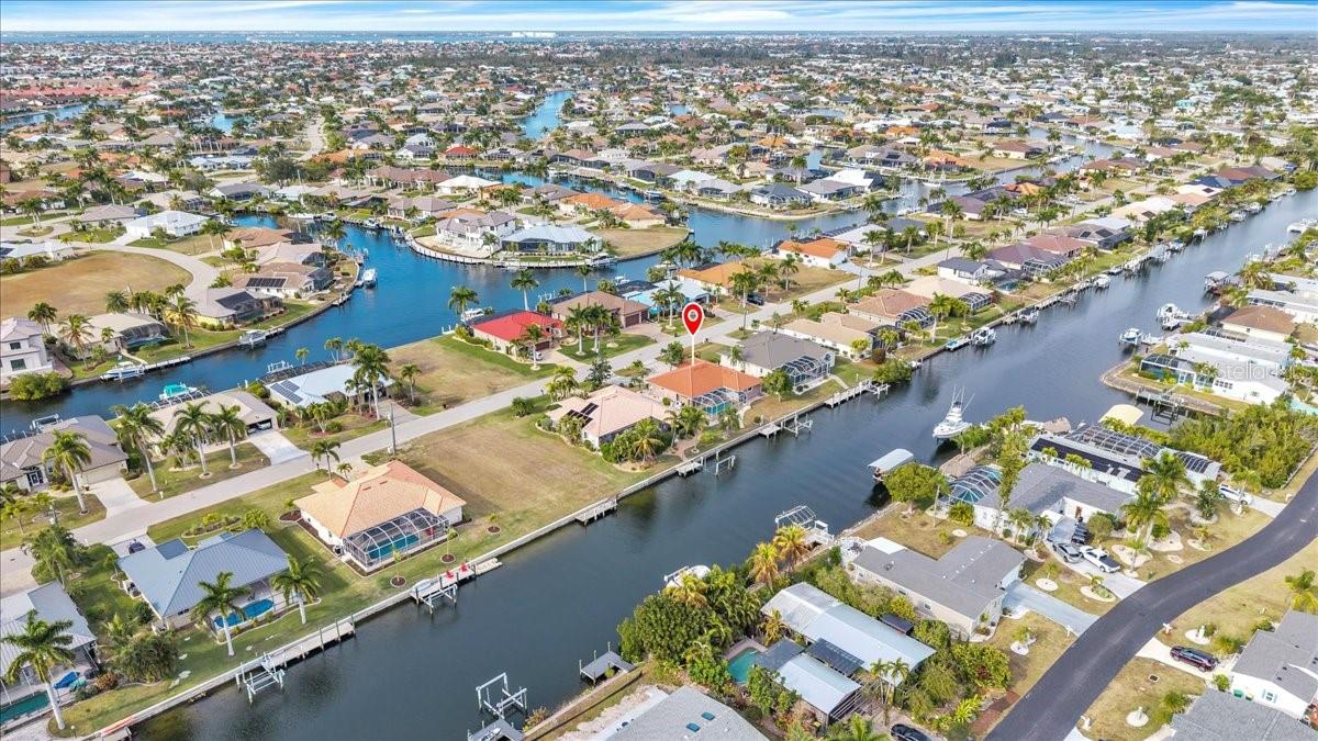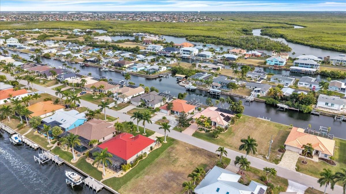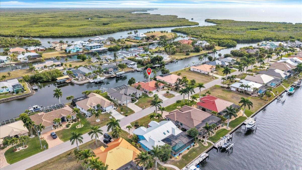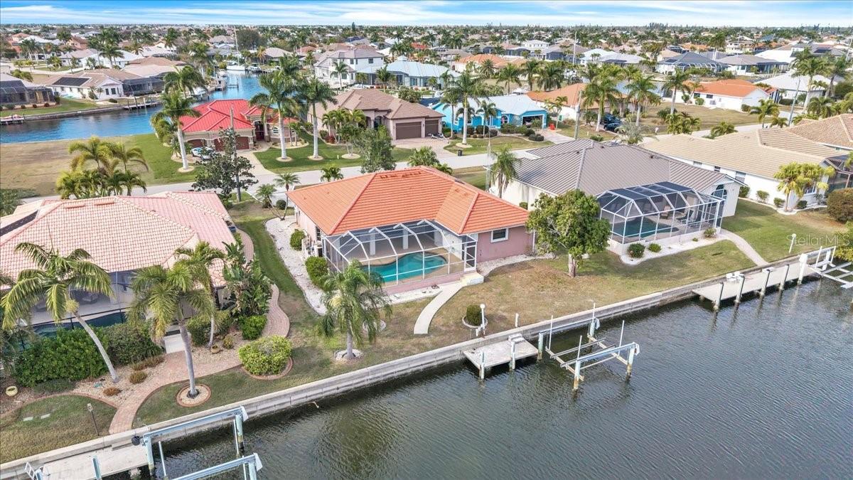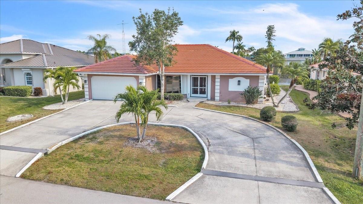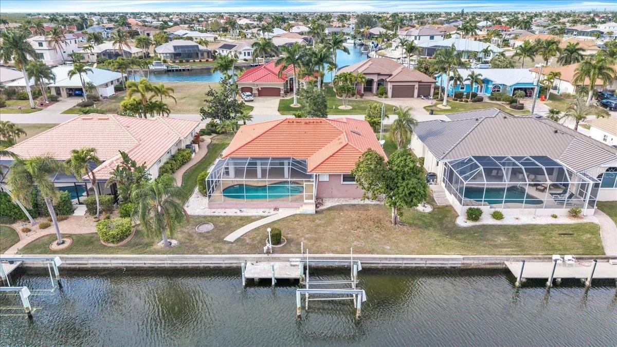 Waterfront Living in Punta Gorda Isles! Located in the highly desirable Punta Gorda Isles, this inviting 3-bedroom, 2-bathroom waterfront pool home offers lovely curb appeal with a spacious circular driveway, a 2-car garage, and mature tropical landscaping that complements its classic tile roof. Featuring 2,040 square feet of living space—including a welcoming family room - this home is designed for relaxed Florida living from the outside in. The property boasts 80 feet of waterfront with a city-maintained seawall for added peace of mind, along with a concrete dock equipped with a boat lift, water, and electric. Enjoy quick boating access to Charlotte Harbor and the Gulf of Mexico—making this a true haven for water enthusiasts. A sparkling pool and generous outdoor space complete the serene backyard setting, surrounded by well-kept neighboring homes in one of Punta Gorda’s most desirable waterfront areas. Upon entering the home you are greeted by soaring ceilings and a formal living and dining room. Sliders in the living room open the space up to the lanai pool area while the bright and welcoming dining room features a beautiful bay-style window that fills the space with natural light and offers a lovely view of the front landscape. Elegant chair-rail molding and decorative wall paneling add a touch of classic charm, while the neutral color palette makes it easy to complement any décor style. This spacious kitchen is perfectly designed for everyday living and entertaining, offering a seamless open view into the family room. Featuring sleek stainless-steel appliances, granite countertops, and an abundance of classic raised-panel cabinetry, the space feels bright, clean, and inviting. A convenient breakfast peninsula provides extra seating and prep space, while the adjacent dinette area is surrounded by natural light and offers direct access to the pool and lanai. Whether cooking, gathering, or enjoying casual meals, this kitchen serves as the central hub of the home with an effortless flow to the main living areas. The spacious primary suite offers private access to the pool area, a huge walk-in closet and features plush carpeting for added comfort. The attached bathroom offers a bright, modern feel with its crisp white cabinetry and dual sink expansive countertop. The highlight of the space is the large, beautifully tiled walk-in shower featuring a frameless glass enclosure with sleek fixtures. Two additional guest bedrooms are located on the opposite side of the home, providing privacy and comfort for family or visitors, and share a full guest bath. Step outside to your own private oasis featuring a covered lanai with ceiling fans for year-round comfort, overlooking a screened-in, sparkling heated swimming pool. An outdoor shower enhances the space, making it perfect for relaxing, entertaining, and fully embracing the Florida lifestyle. Additional highlights include an interior laundry room with utility sink and extra storage, plus a new A/C installed in 2025. Close to I-75/US41 and nearby to Fishermen's Village, downtown Punta Gorda shops & restaurants, great boating, fishing, sailing, and more. Come enjoy the Florida lifestyle in this PGI home. **PLEASE ENJOY THE 3D INTERACTIVE VIRTUAL TOUR ASSOCIATED WITH THIS LISTING**